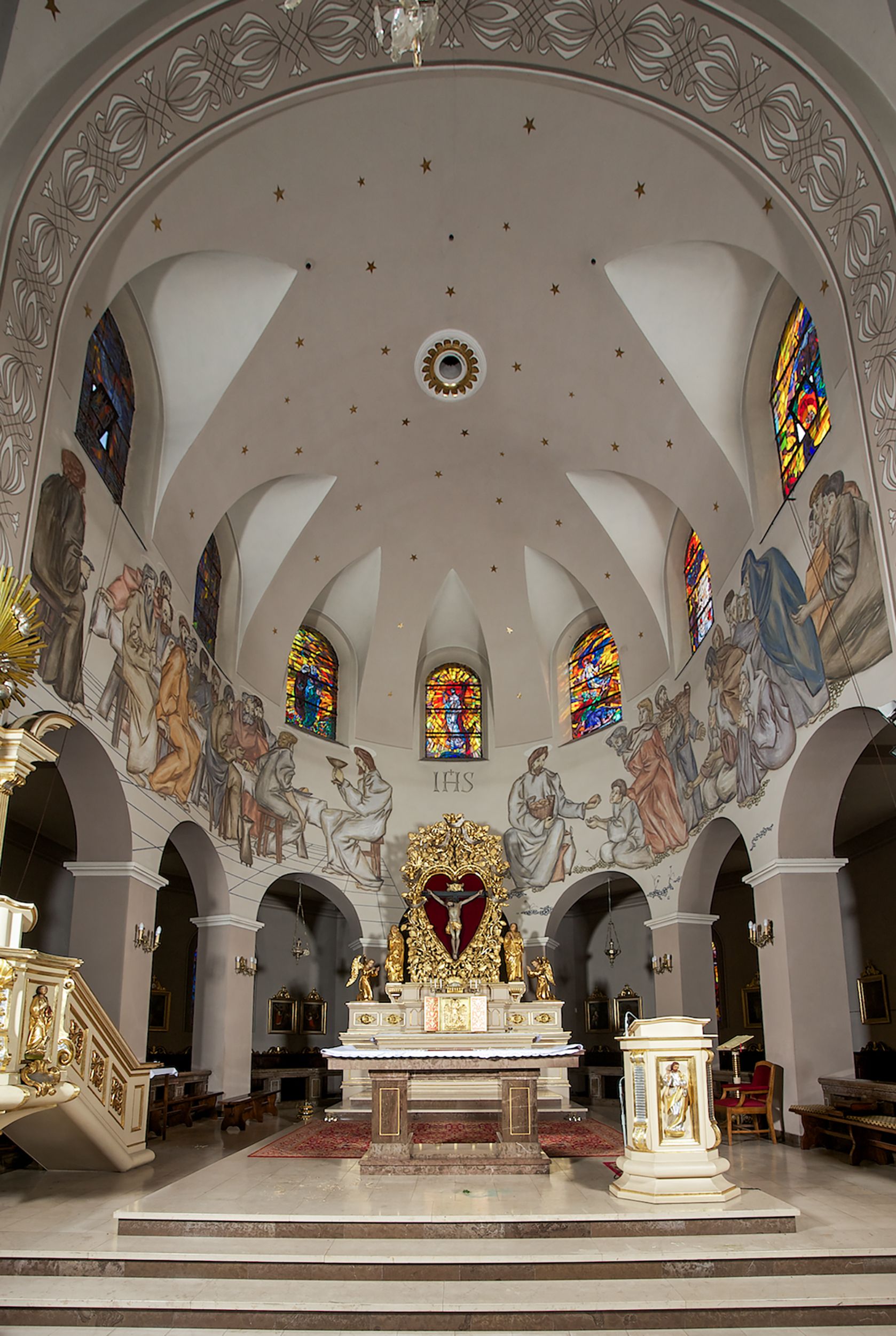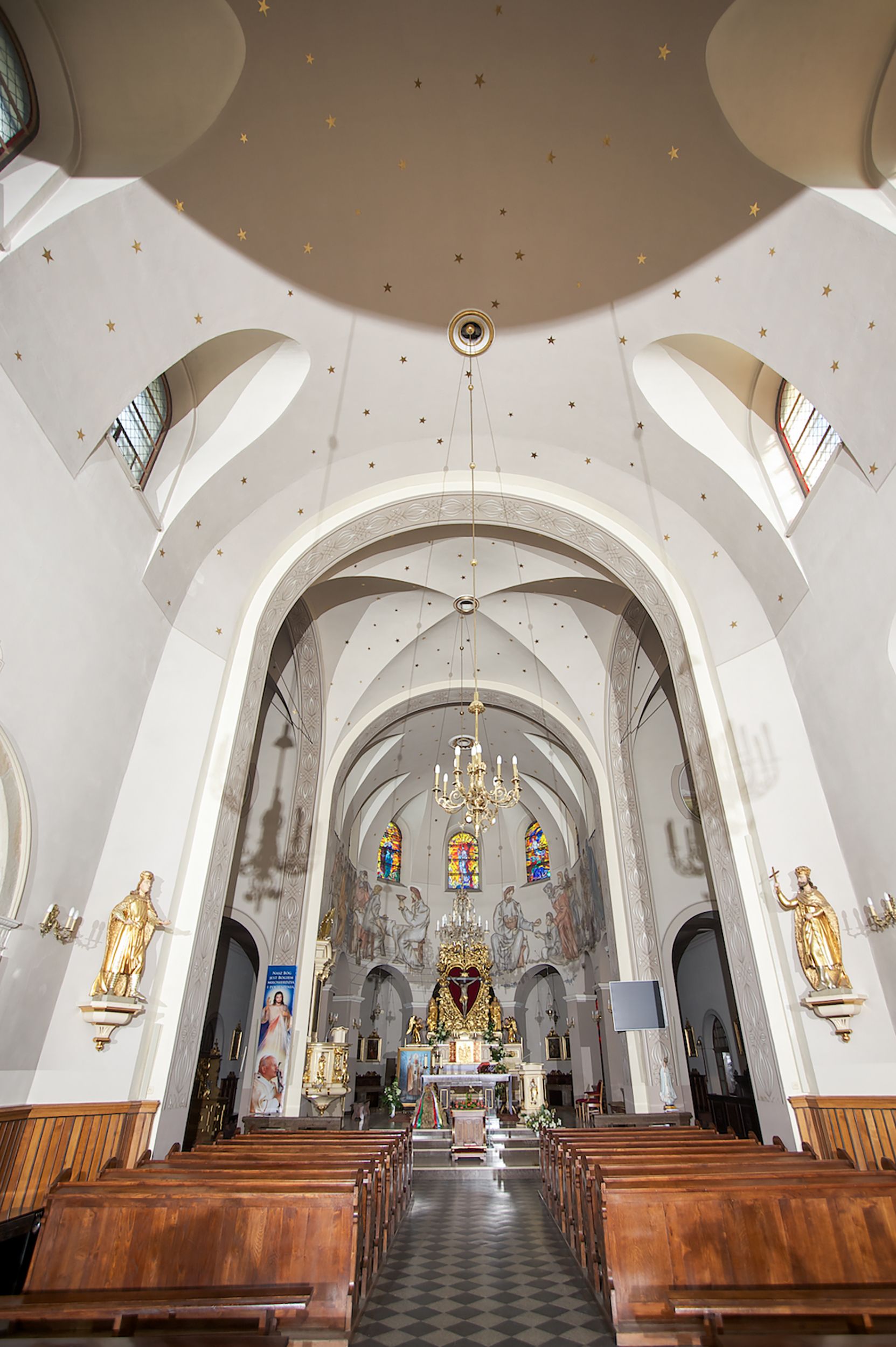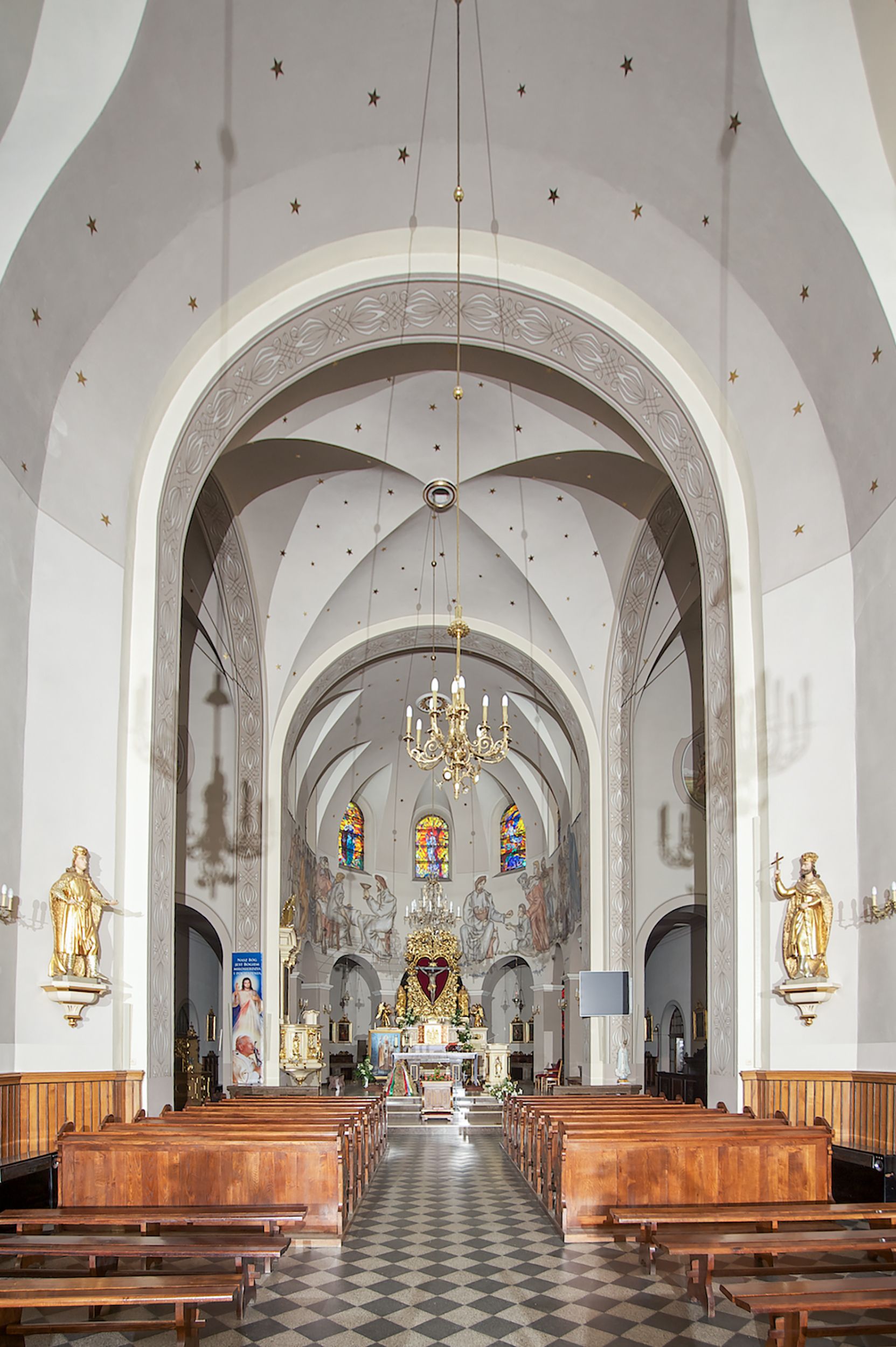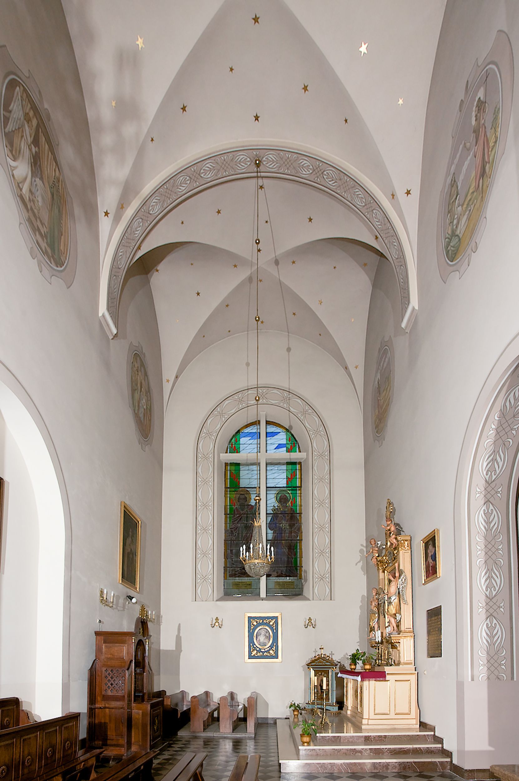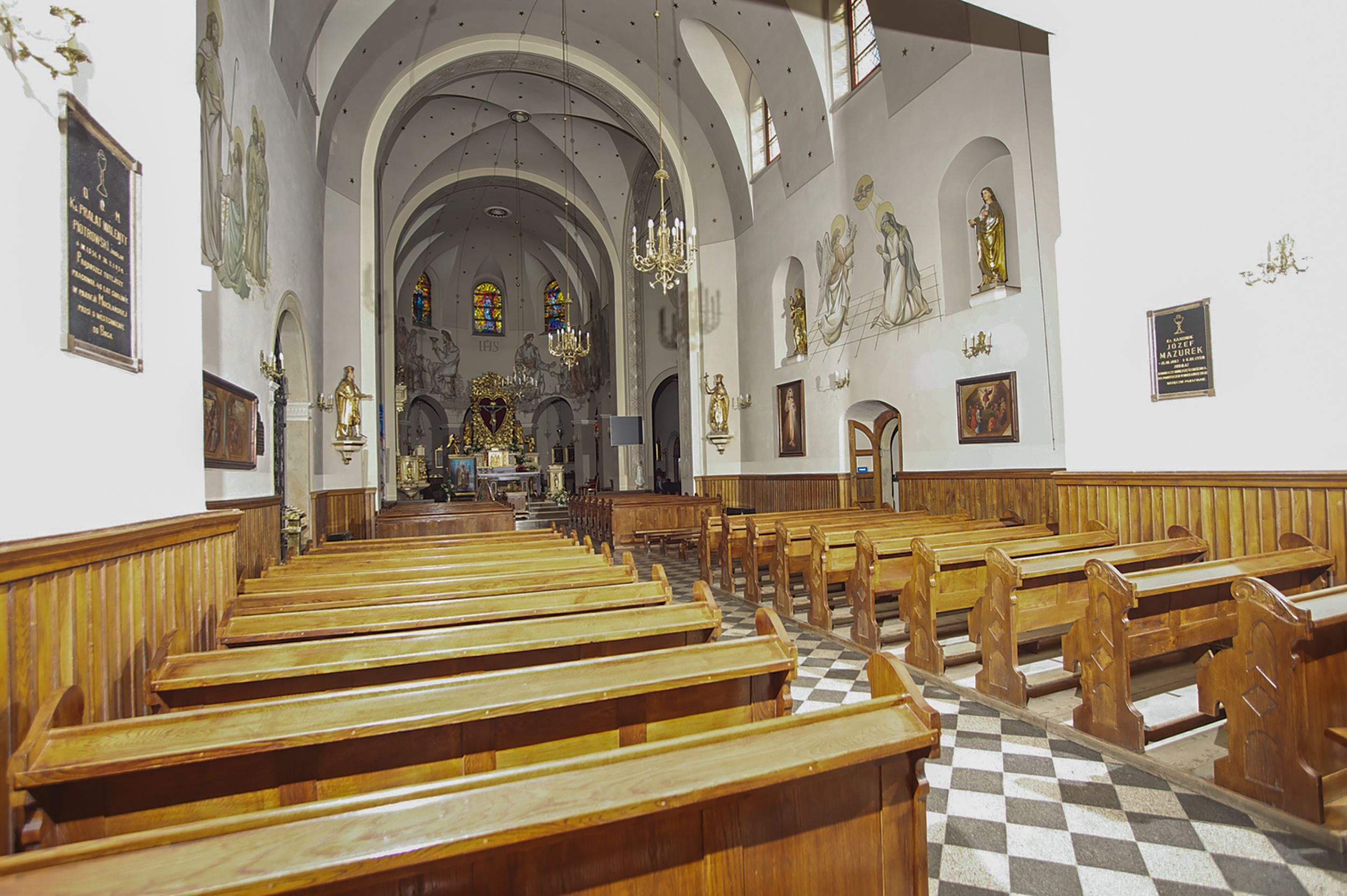 Prezbiterium zamknięte półokrągło, z obejściem przeprutym do niego arkadami wspartymi na filarach. Ściany nawy i prezbiterium gładkie, przekryte sklepieniem kolebkowym z lunetami, w których mieszczą się okna. Transept i przecięcie naw sklepione krzyżowo. Na ścianach polichromia figuralna ze scenami z Nowego Testamentu, w partii sklepienia drobne, złote gwiazdki. Od zachodu chór zatopiony w występującym asymetrycznie murze, z tralkową balustradą. W prezbiterium siedem okien w kształcie stojącego prostokąta zamkniętego łukiem pełnym wypełnionych witrażami, w nawie sześć okien, w ramionach transeptu po jednym, czterodzielnym, wypełnionym witrażem, na wysokości chóru po dwa z każdej strony. Główne wejście od zachodu przez kruchtę. Fasada poprzedzona przedsionkiem o podziałach ramowych, z prostokątnym wejściem na osi, flankowanym parą pilastrów i prostokątnymi płycinami. Kondygnację wieńczy pełne belkowanie z wysuniętym gzymsem podtrzymującym daszek i trójkątny, schodkowy szczyt zakończony postumentami. Na centralnym krzyż, na sąsiadujących figury dzieci z rogami obfitości, a na zewnętrznych wazony płomieniste; szczyt ujmują postumenty z kulami. Fasada dwukondygnacyjna ze szczytem. Kondygnacja trójosiowa, rozdzielona pilastrami, o polach wypełnionych blendami w kształcie stojących prostokątów zamkniętych łukiem pełnym; szczyt trójkątny, z tarczą zegarową pośrodku. Budynek kościoła o wyraźnych podziałach na bryły składowe, ściany gładkie, przeprute oknami, z gzymsami pod krawędziami dachu.