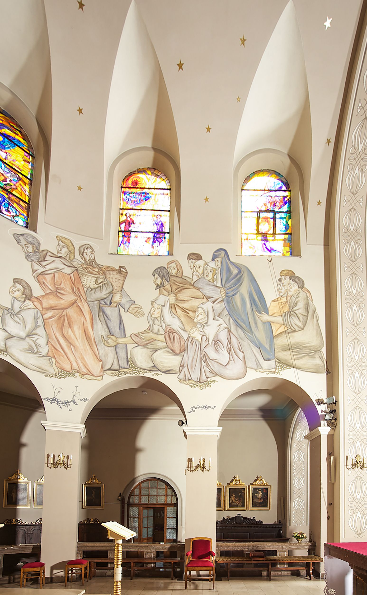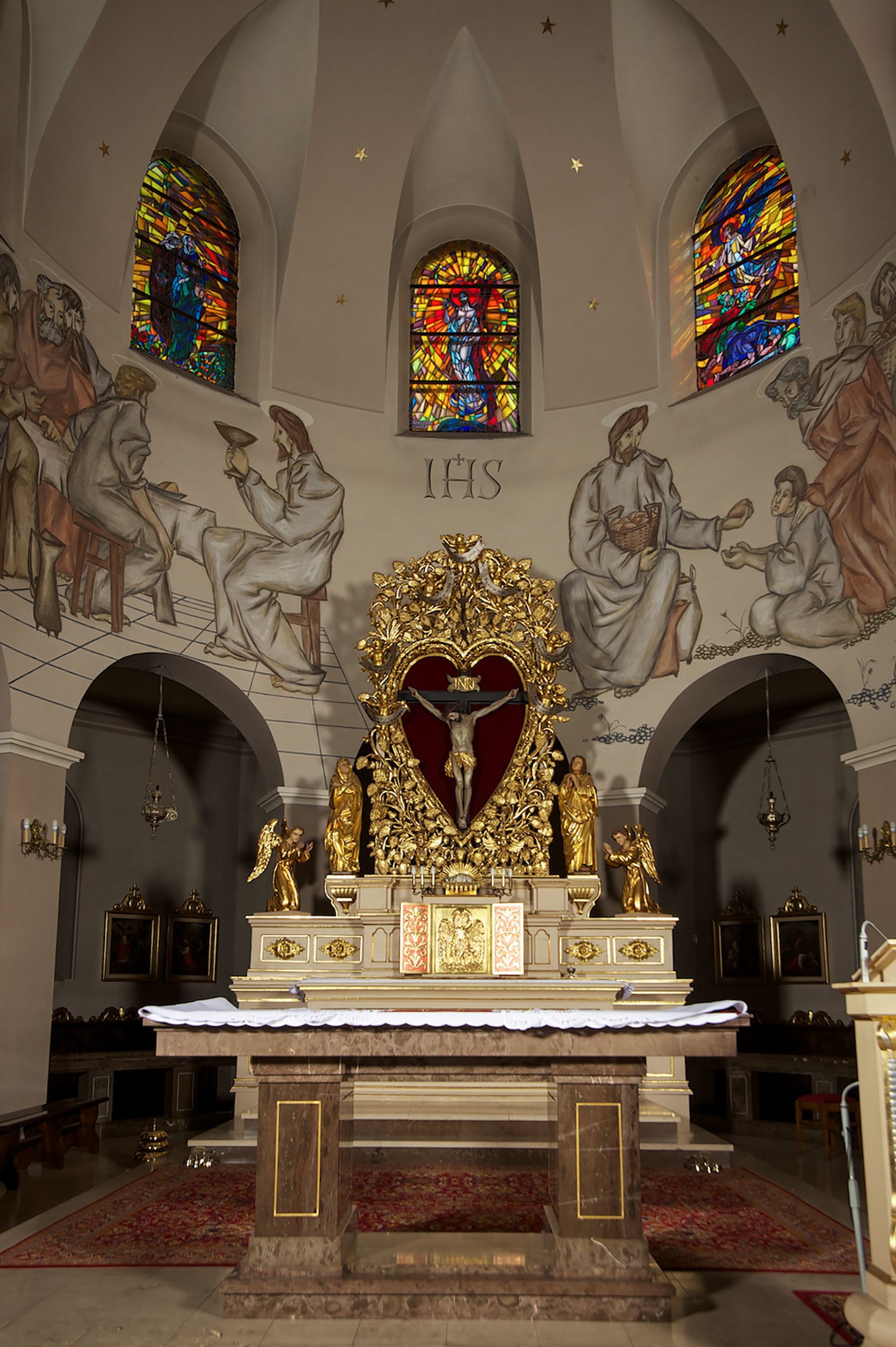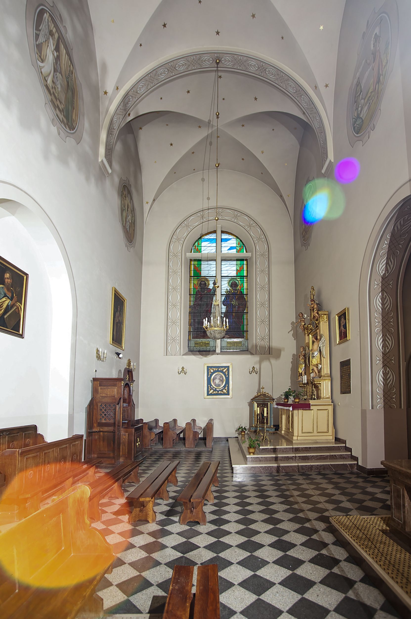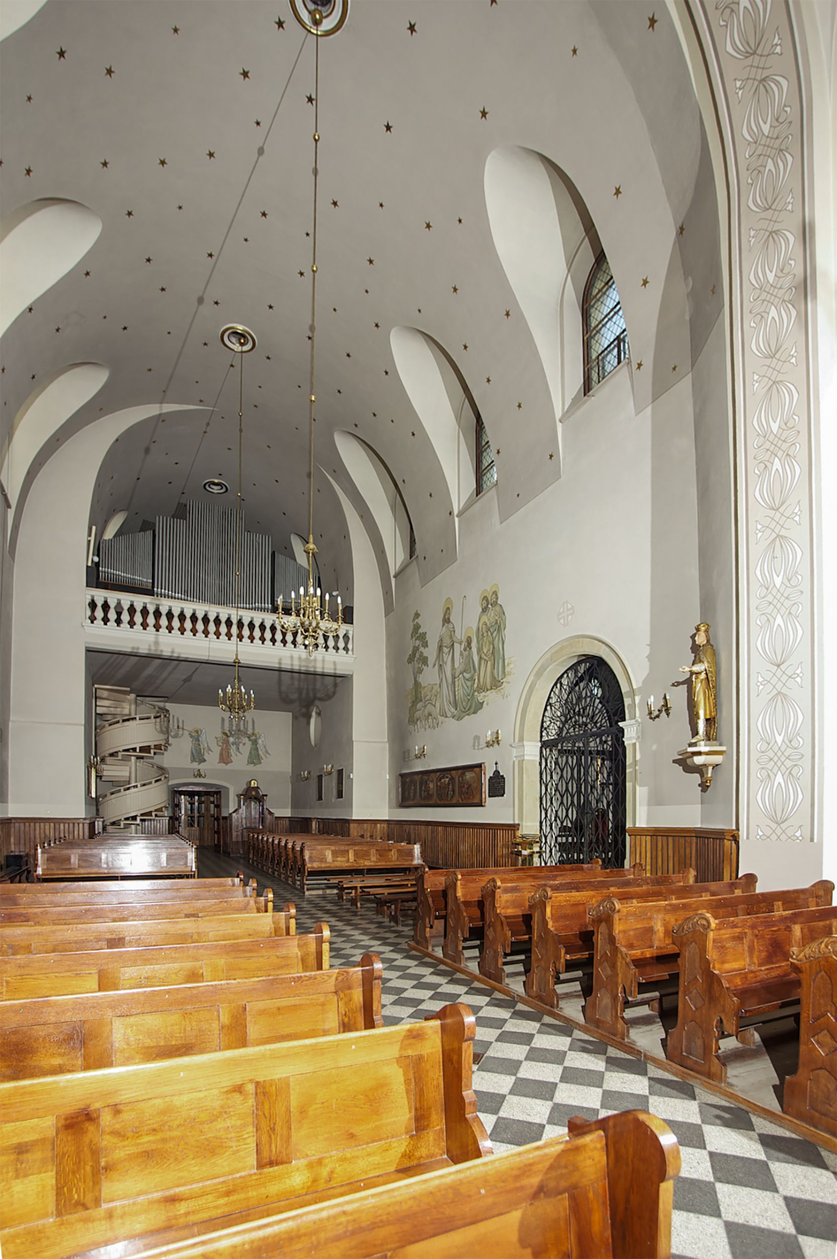 Prezbiterium zamknięte półokrągło, z obejściem przeprutym do niego arkadami wspartymi na filarach. Ściany nawy i prezbiterium gładkie, przekryte sklepieniem kolebkowym z lunetami, w których mieszczą się okna. Transept i przecięcie naw sklepione krzyżowo. Na ścianach polichromia figuralna ze scenami z Nowego Testamentu, w partii sklepienia drobne, złote gwiazdki. Od zachodu chór zatopiony w występującym asymetrycznie murze, z tralkową balustradą. W prezbiterium siedem okien w kształcie stojącego prostokąta zamkniętego łukiem pełnym wypełnionych witrażami, w nawie sześć okien, w ramionach transeptu po jednym, czterodzielnym, wypełnionym witrażem, na wysokości chóru po dwa z każdej strony. Główne wejście od zachodu przez kruchtę. Fasada poprzedzona przedsionkiem o podziałach ramowych, z prostokątnym wejściem na osi, flankowanym parą pilastrów i prostokątnymi płycinami. Kondygnację wieńczy pełne belkowanie z wysuniętym gzymsem podtrzymującym daszek i trójkątny, schodkowy szczyt zakończony postumentami. Na centralnym krzyż, na sąsiadujących figury dzieci z rogami obfitości, a na zewnętrznych wazony płomieniste; szczyt ujmują postumenty z kulami. Fasada dwukondygnacyjna ze szczytem. Kondygnacja trójosiowa, rozdzielona pilastrami, o polach wypełnionych blendami w kształcie stojących prostokątów zamkniętych łukiem pełnym; szczyt trójkątny, z tarczą zegarową pośrodku. Budynek kościoła o wyraźnych podziałach na bryły składowe, ściany gładkie, przeprute oknami, z gzymsami pod krawędziami dachu.