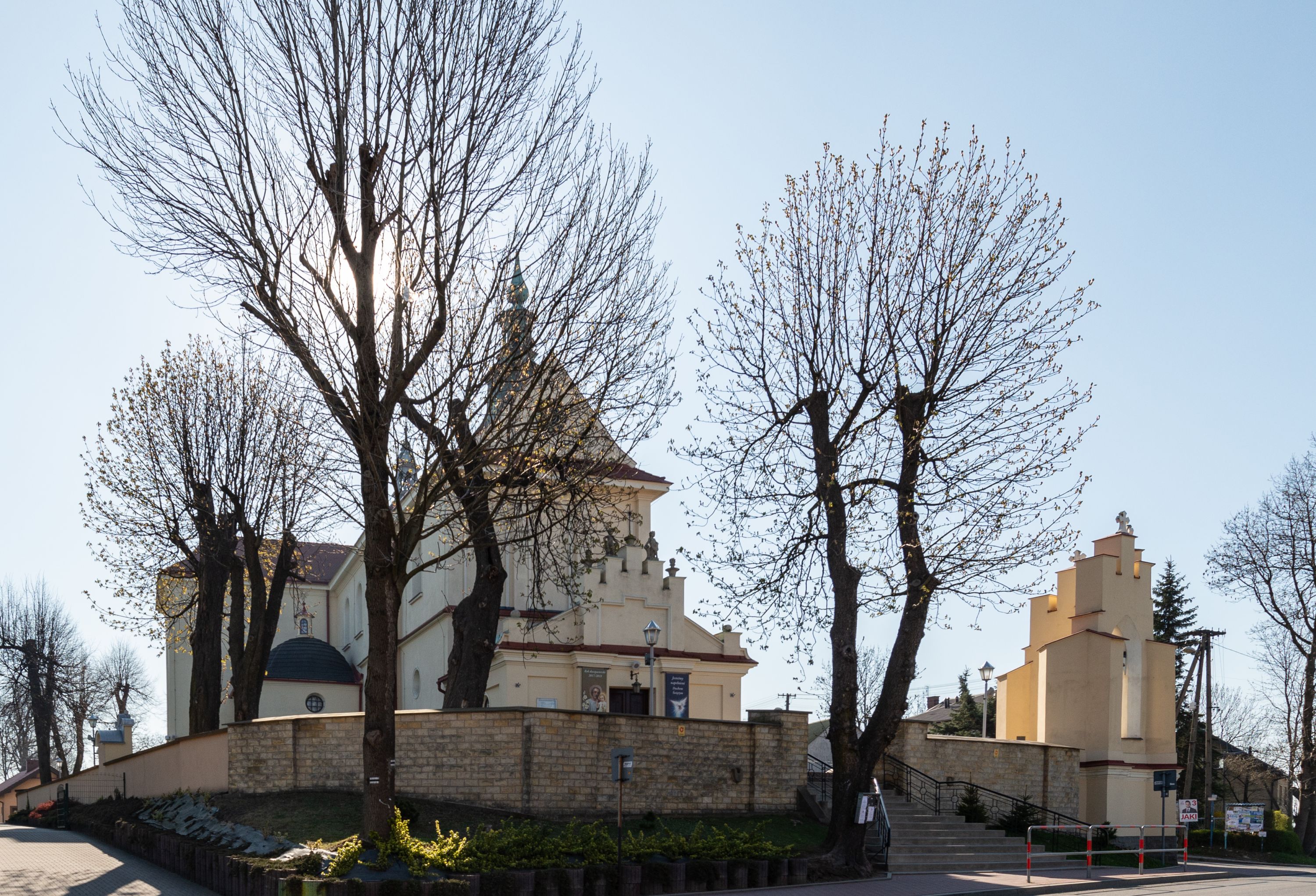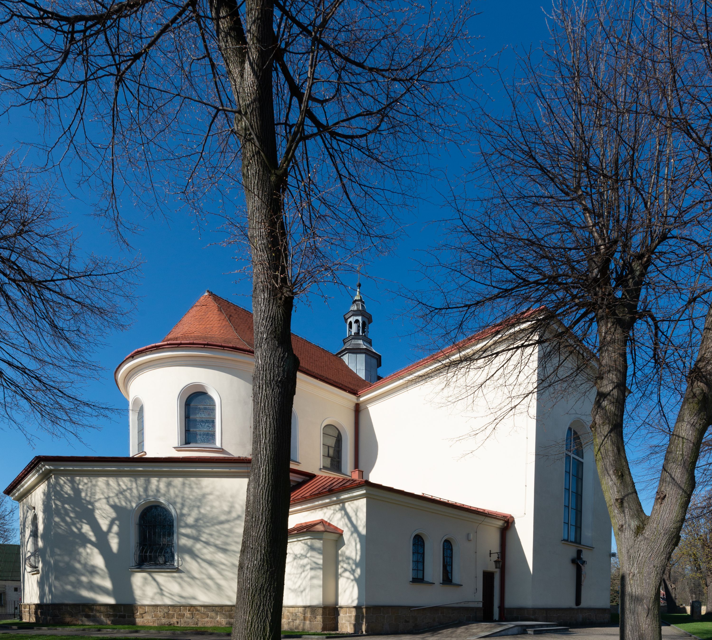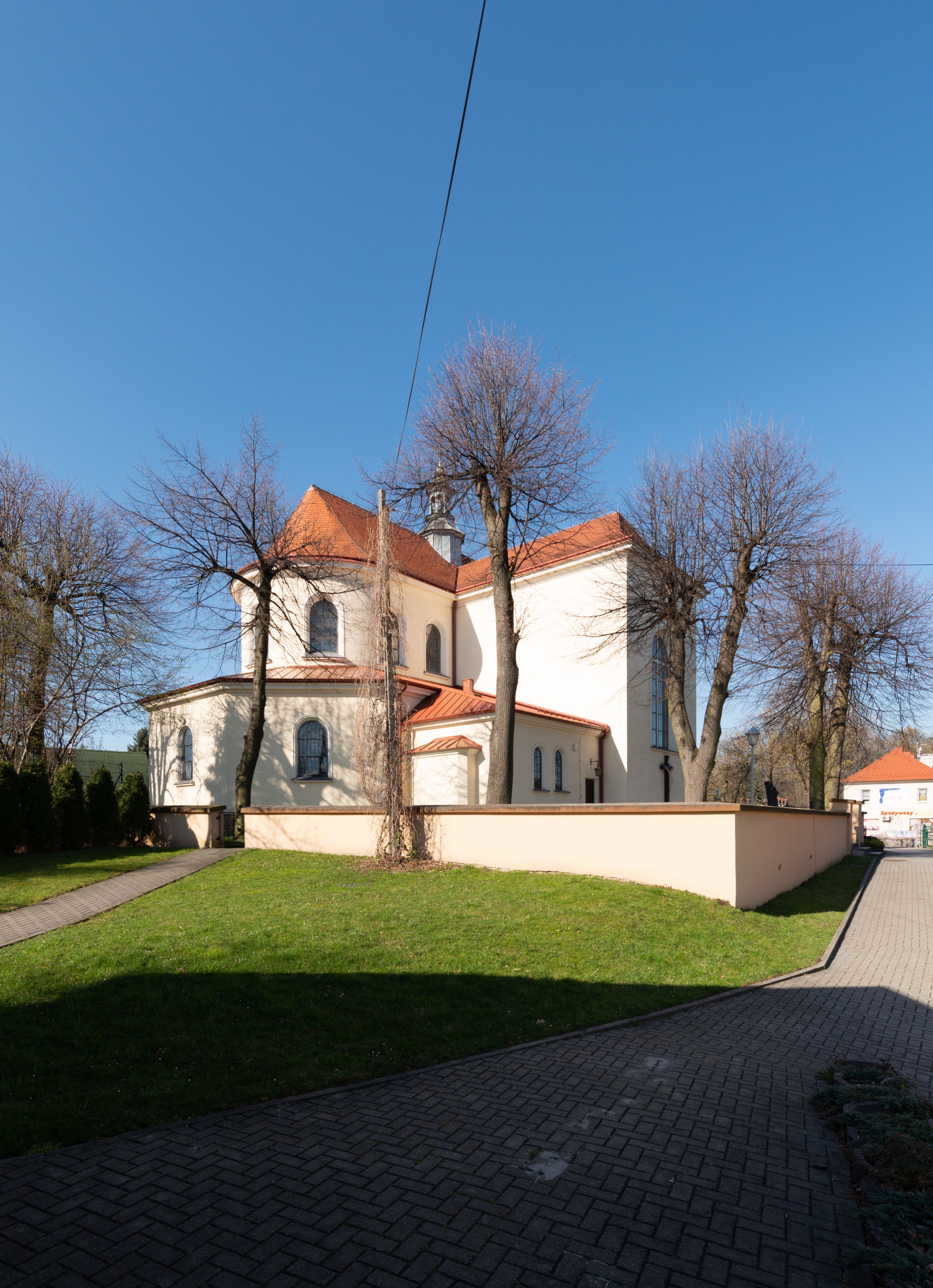 Kościół murowany, orientowany, jednonawowy, z transeptem, prezbiterium z obejściem i przybudówkami. Od zachodu kruchta, od północy kwadratowa kaplica, od południa kolejna przybudówka.