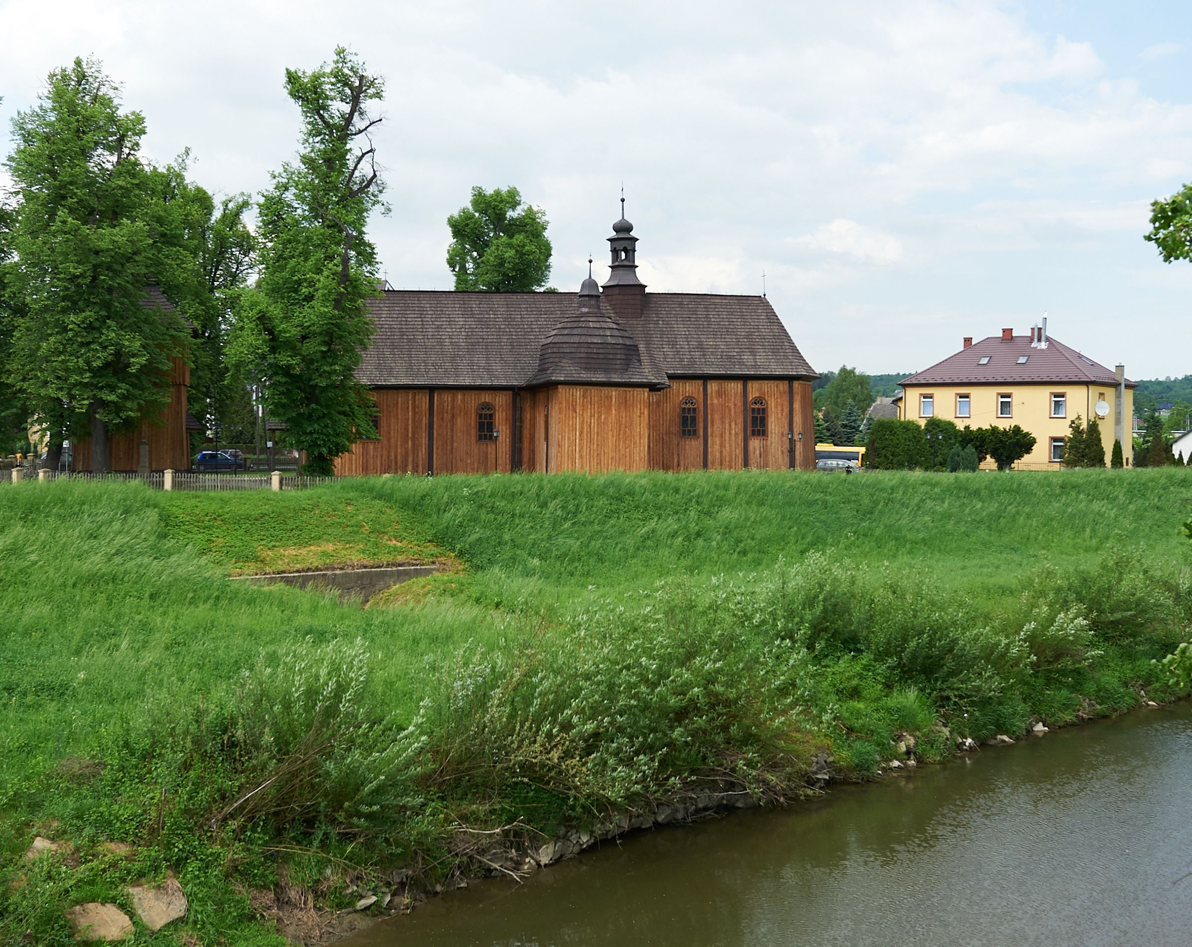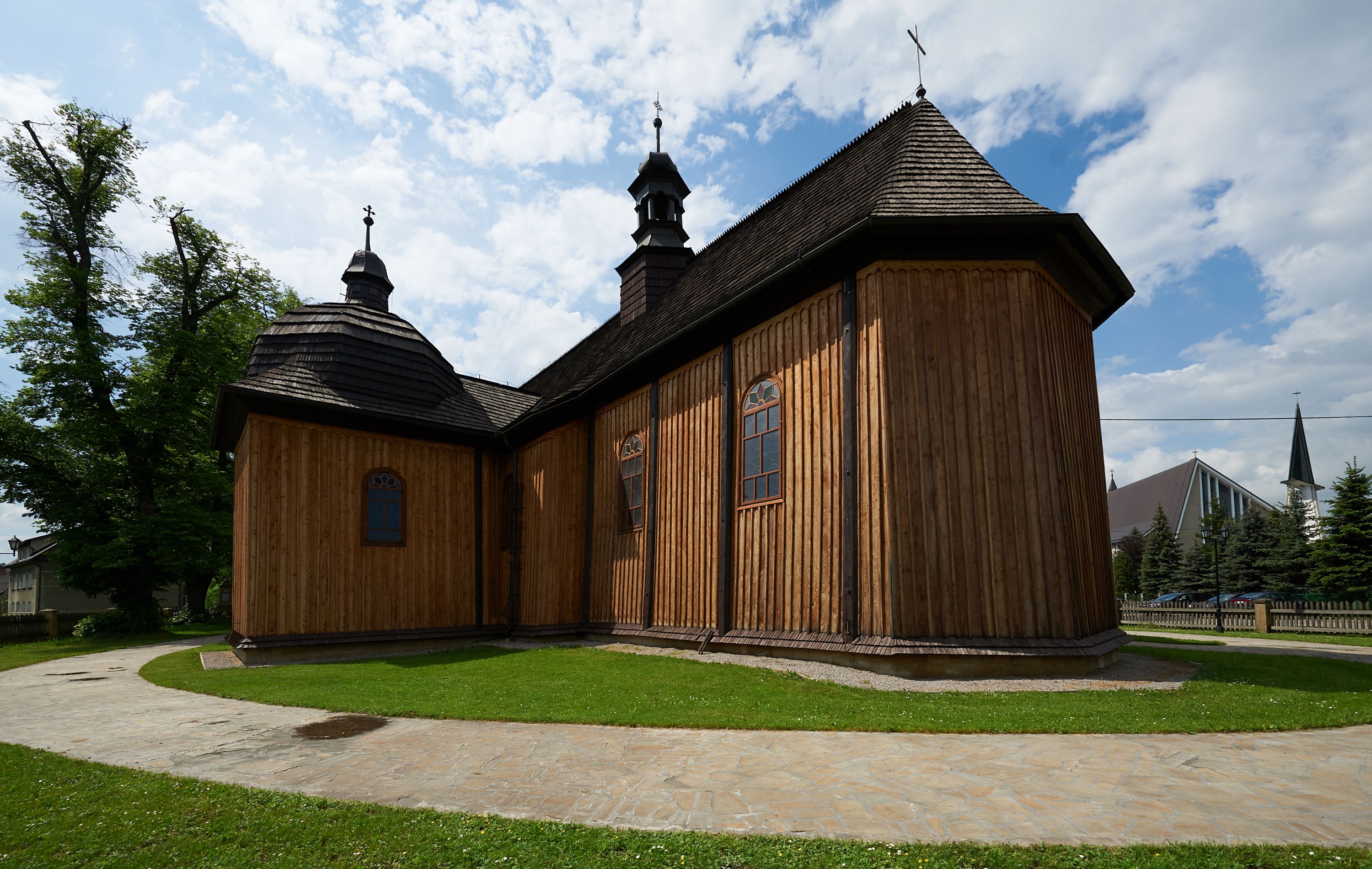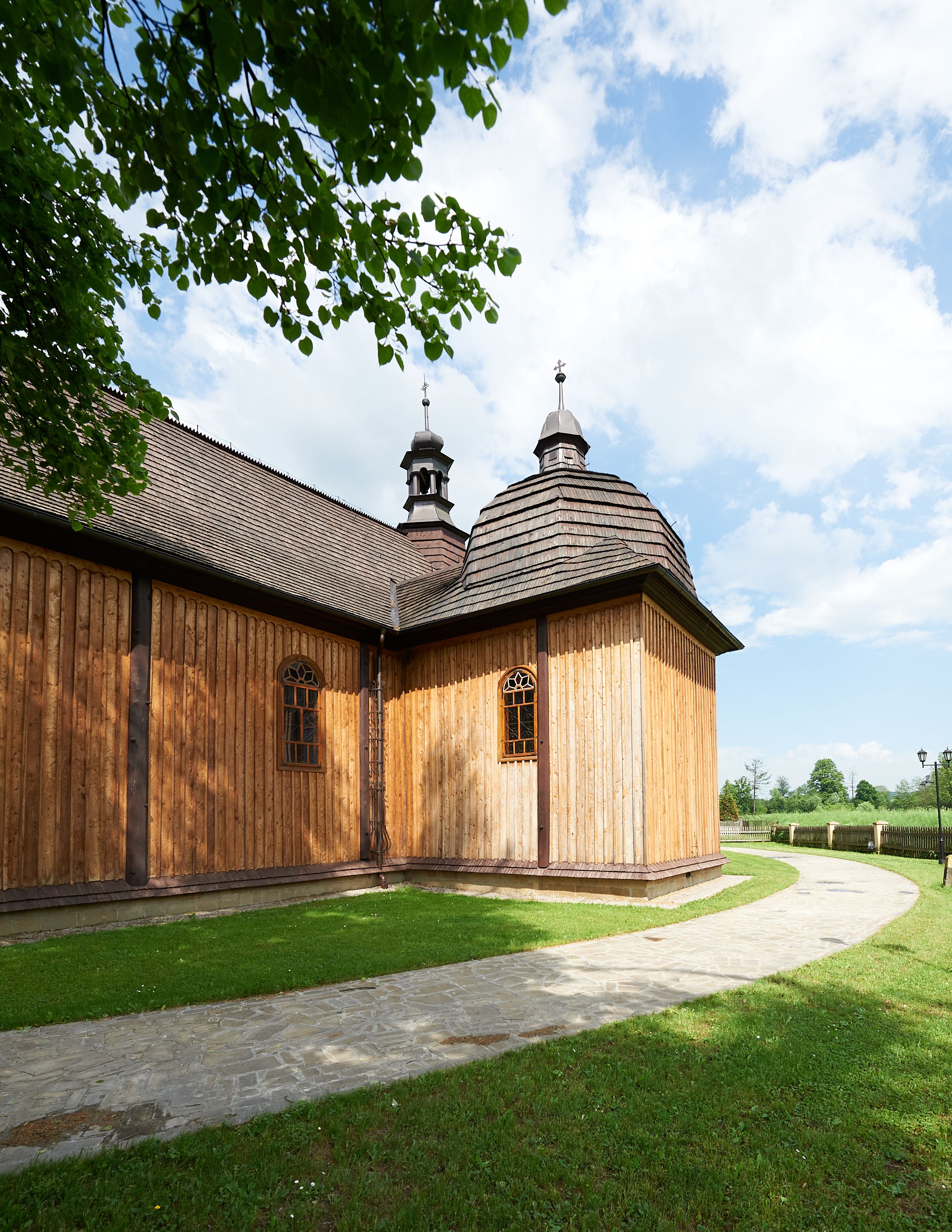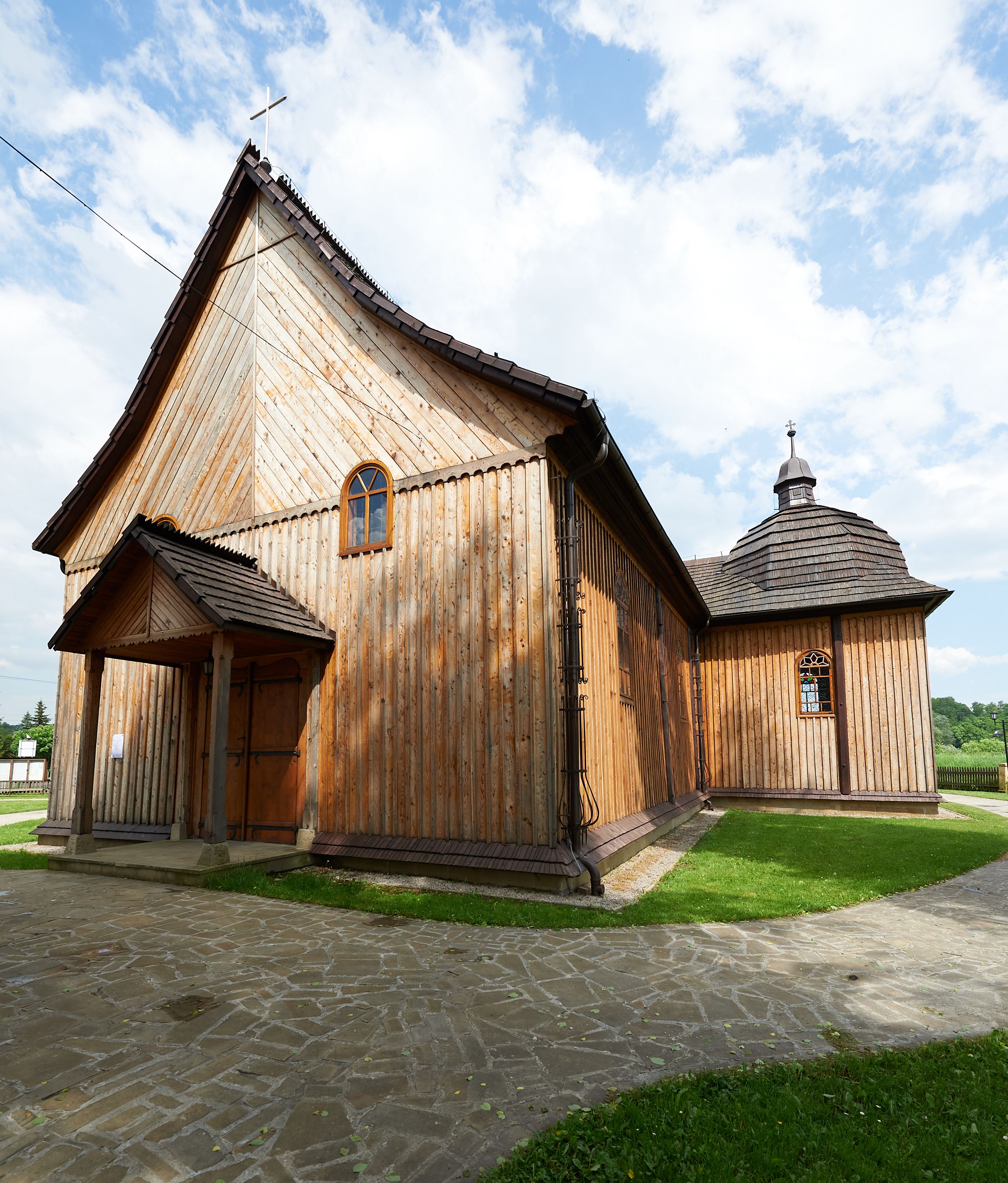 Elewacja frontowa jednoosiowa, zamknięta trójkątnym szczytem rozszerzającym się ku dołowi. Na osi ganek oparty na czterech słupach, nakryty dwuspadowym daszkiem gontowym, wejście do kościoła z dwuskrzydłowymi drzwiami. W partii szczytu dwa okna w formie stojącego prostokąta zamkniętego łukiem półkolistym. W elewacji południowej cztery otwory okienne w formie stojącego prostokąta zamkniętego łukiem półkolistym, dwa w nawie i dwa w prezbiterium oraz dwa analogiczne okna na zachodniej i wschodniej ścianie kaplicy. Elewacja północna z dwoma otworami okiennymi w formie stojącego prostokąta zamkniętego łukiem półkolistym, trzema oknami i wejściem do zakrystii i aneksu. Kościół nakryty wspólnym dachem o jednej kalenicy nad prezbiterium i nawą, gontowym, dwuspadowym, z przedłużoną połacią przekrywającą zaskrzynienia. W jednej trzeciej długości dachu nad nawą od strony prezbiterium wznosi się ponad kalenicą wieżyczka na sygnaturkę, na ośmiobocznym obitym blachą trzonie, z latarnią zwieńczoną niewielkim cebulastym hełmem. Kaplica boczna nakryta kopułą krytą gontem, z latarnią. Nad zakrystią i aneksem dach jednospadowy.