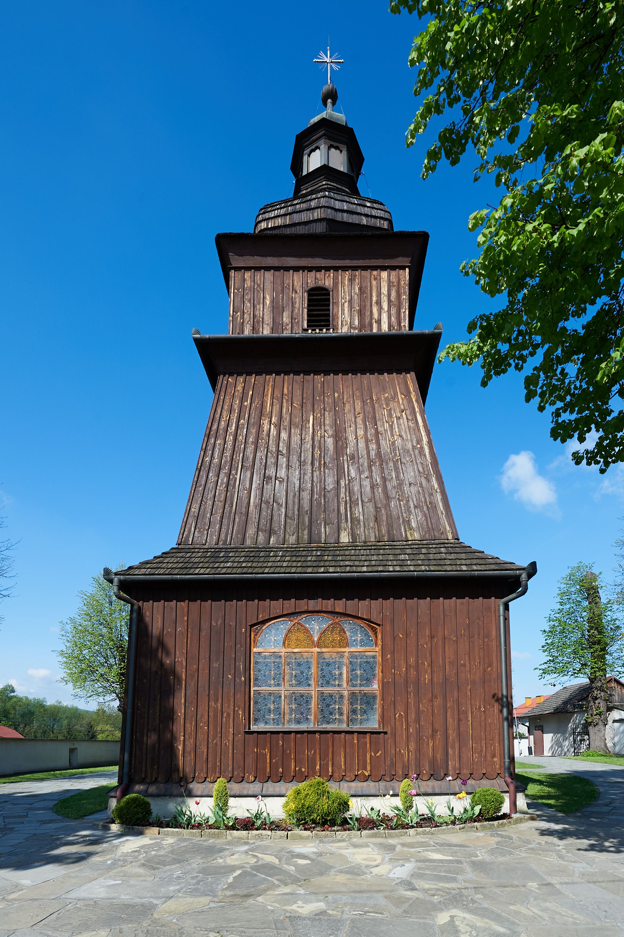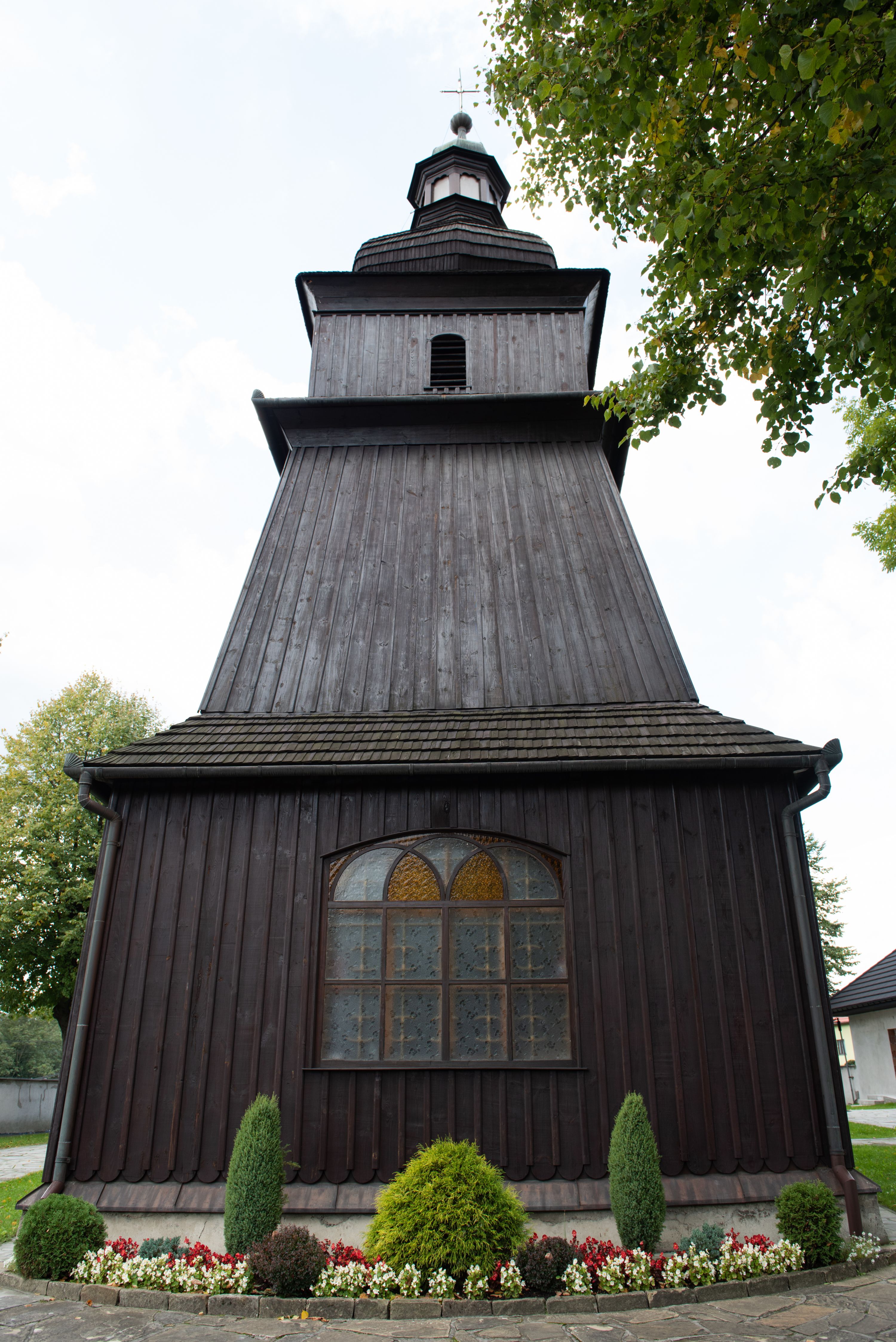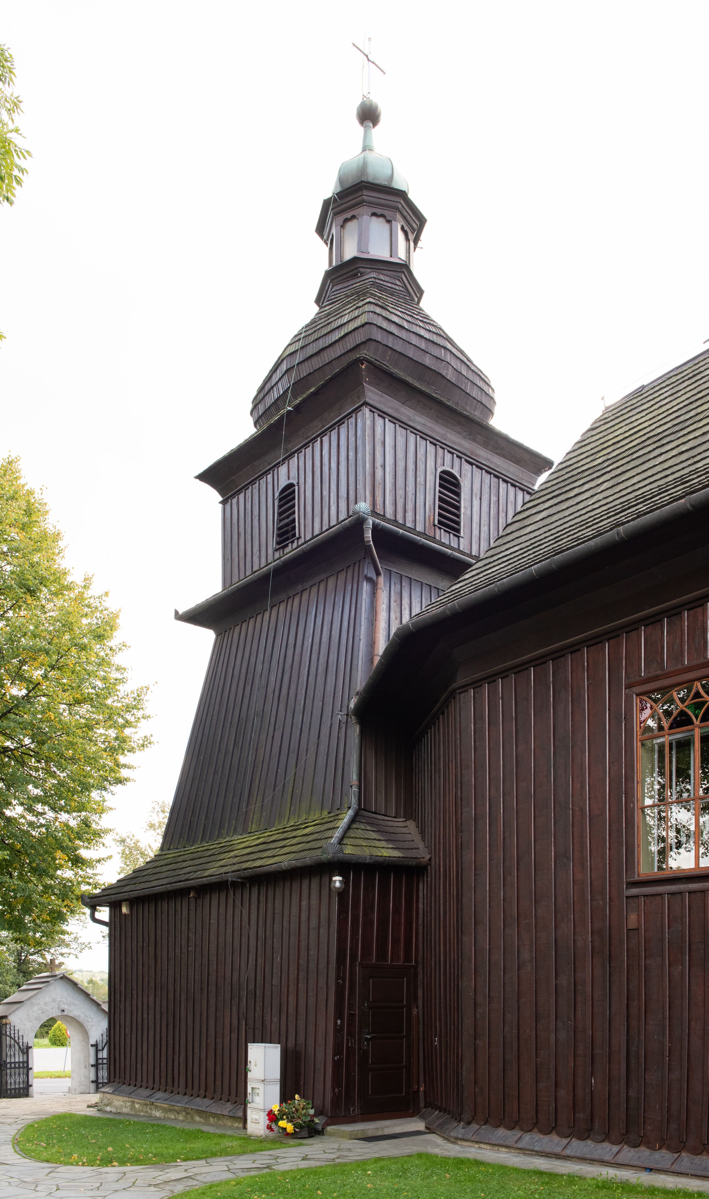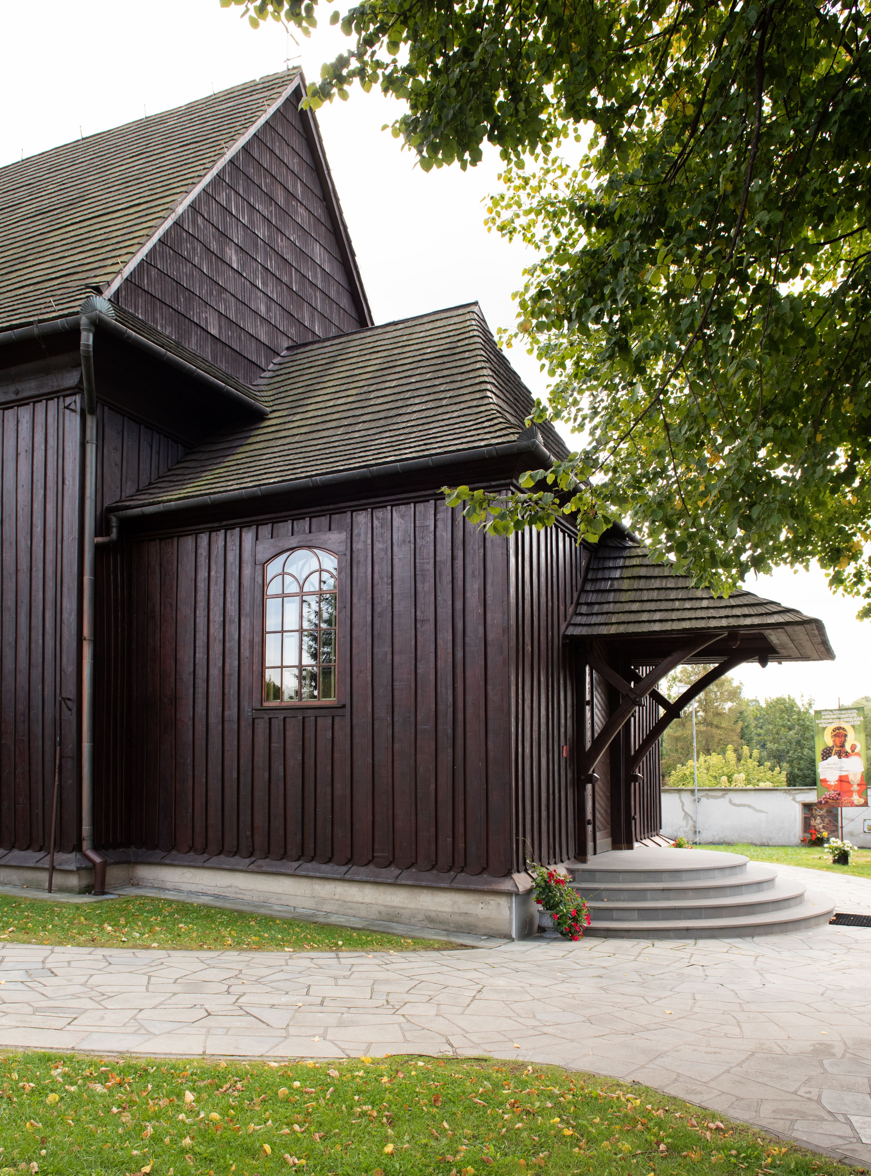 Kościół orientowany, drewniany, na podmurówce z kamienia łupanego, konstrukcji zrębowej, jednonawowy, szalowany, z wieżą konstrukcji słupowej usytuowaną od strony prezbiterium, z zakrystią w przyziemiu. Nawa prostokątna, szersza od prezbiterium, z kruchtami od zachodu, południa i północy. Prezbiterium zamknięte trójbocznie. Wieża od wschodu, na planie kwadratu, o konstrukcji ze słupów pochyłych, na zewnątrz trzy kondygnacje przedzielone obiegającymi daszkami. Dolna i górna izbica o ścianach pionowych, środkowa o ścianach pochyłych; wieża zwieńczona hełmem baniastym z latarnią. Kościół przykrywa dach siodłowy, na kruchtach trójspadowy, kryty cementówką. Pod wydatnymi okapami dachów biegnie gzyms o profilu ćwierćkoliście wklęsłym z wałkiem. Więźba dachowa nad prezbiterium jest krokwiowa, a nad nawą płatwiowa. Wewnątrz znajdują się stropy z fasetami, pod którymi umieszczony jest profilowany gzyms. Arkada tęczowa o łuku spłaszczonym. Chór muzyczny wsparty jest na dwóch filarach z wybrzuszoną balustradą. Wnętrze polichromowane, ściany w kruchtach oszalowane. Do kościoła prowadzą cztery wejścia: główne od zachodu, dwa boczne od południa i północy oraz przez zakrystię od wieży, od strony północno-zachodniej. W prezbiterium znajdują się dwa okna: po stronie południowej i północnej; a w nawie dwa po stronie południowej i północnej, natomiast w wieży cztery okna prostokątne, w latarni osiem okien zamkniętych dwoma nałęczami. Kościół otoczony jest murkiem ze stacjami drogi krzyżowej i dwiema bramkami z lat 1863 i 1864.