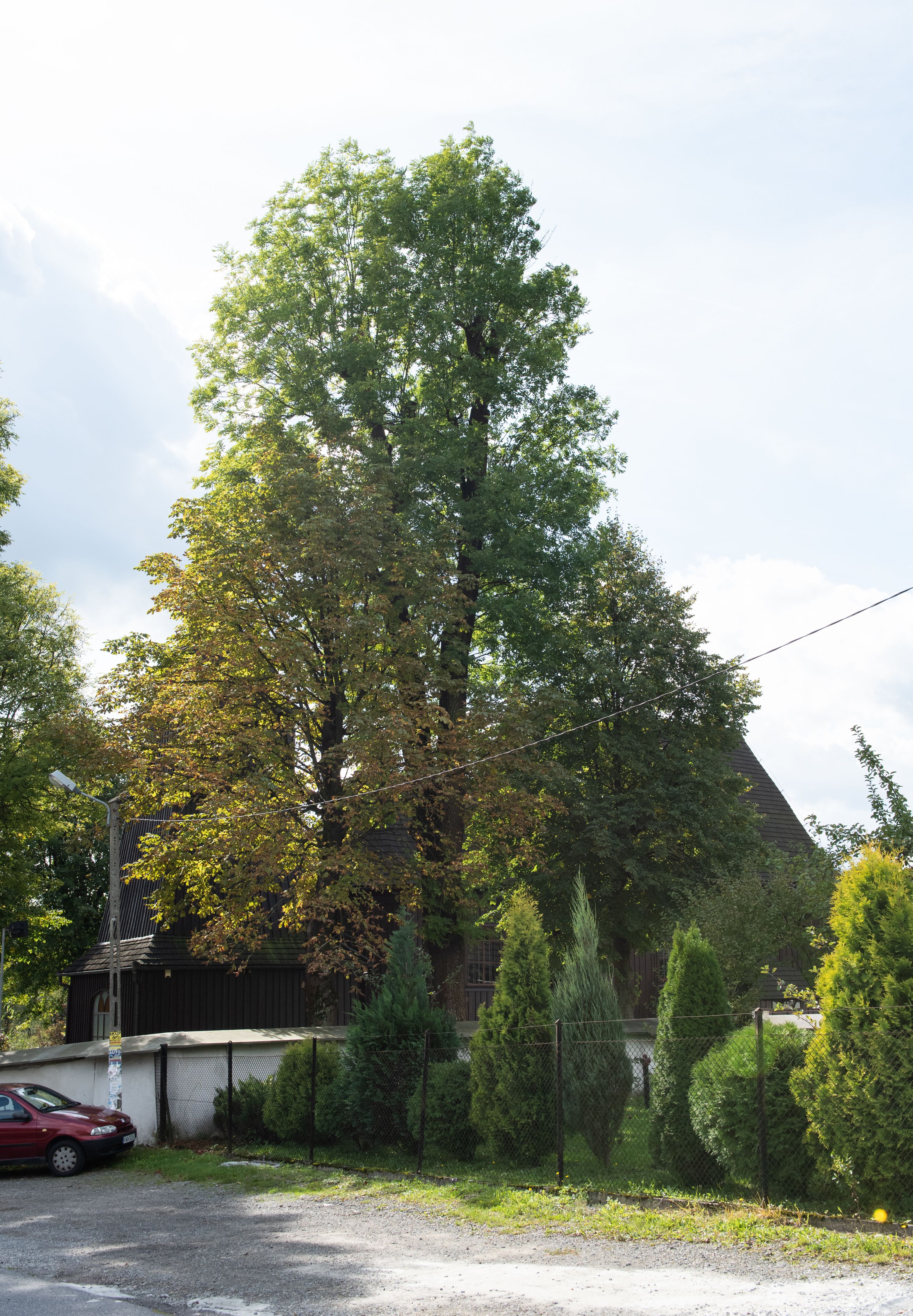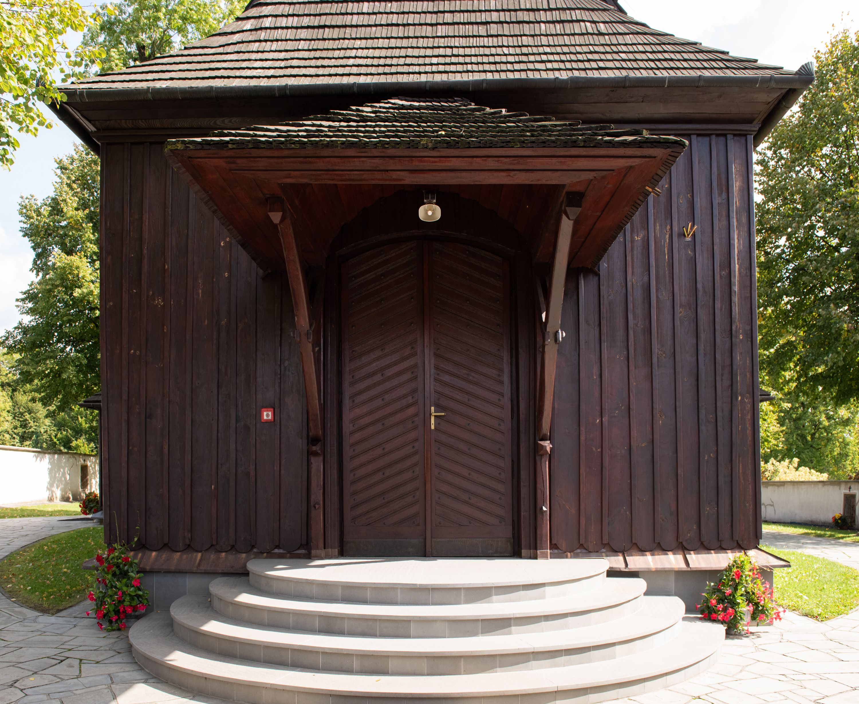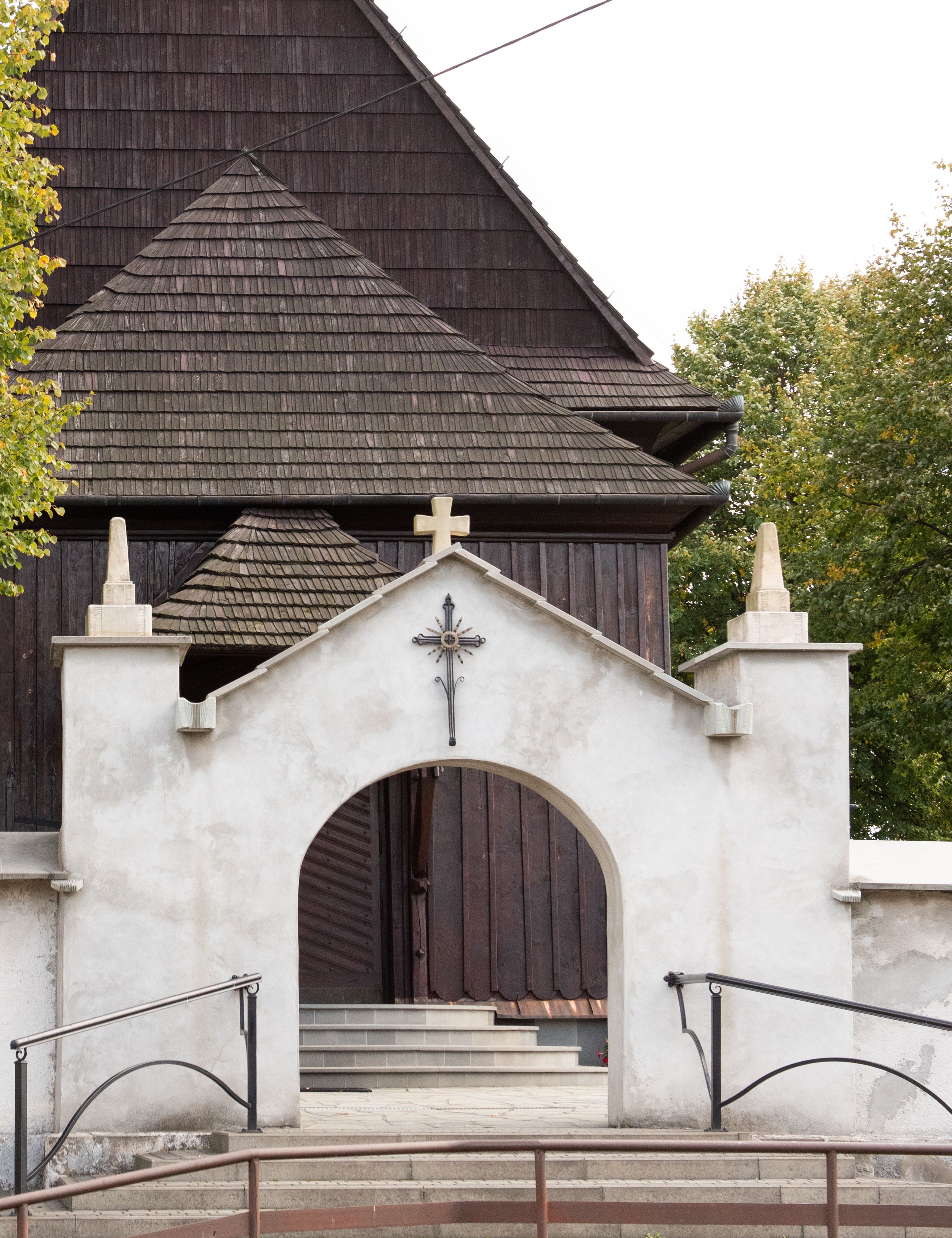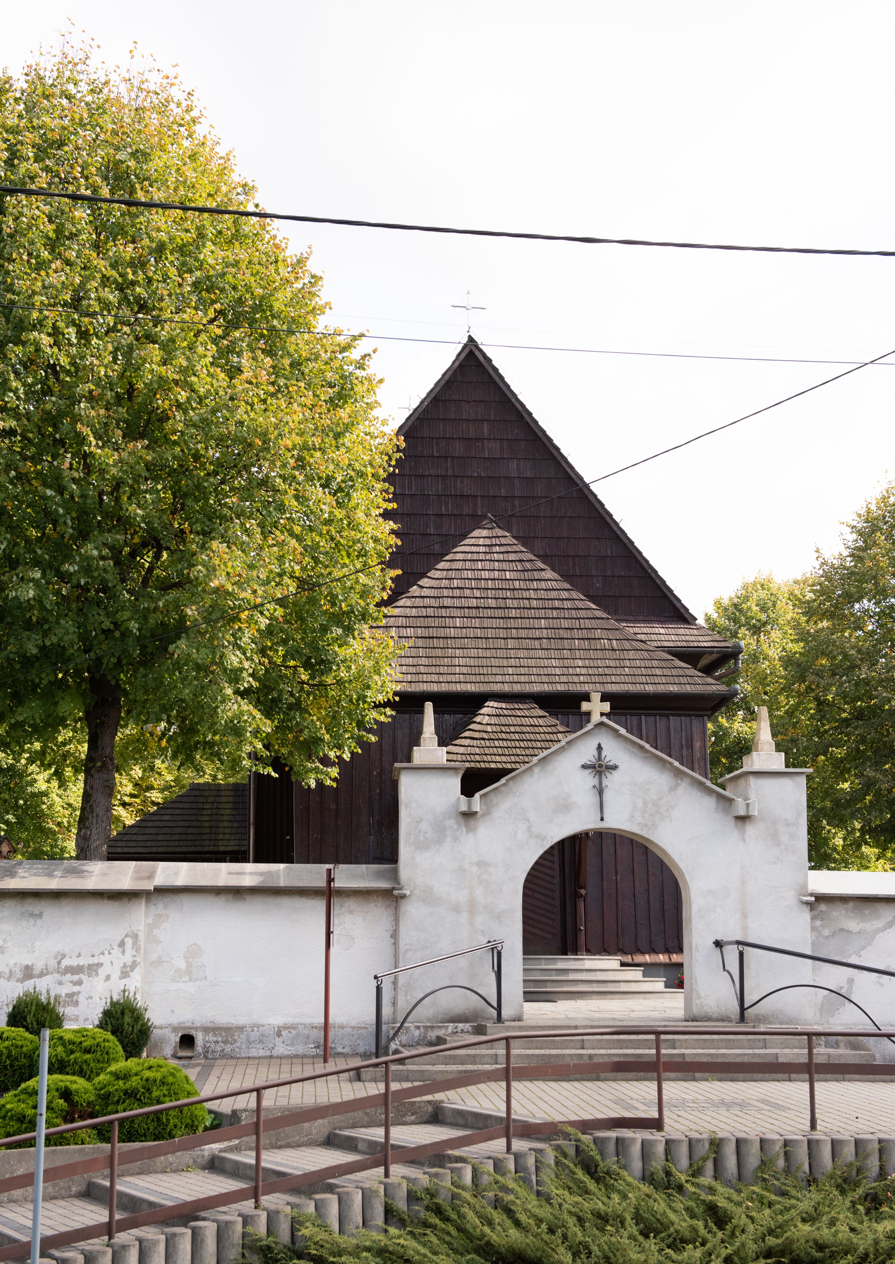 Kościół orientowany, drewniany, na podmurówce z kamienia łupanego, konstrukcji zrębowej, jednonawowy, szalowany, z wieżą konstrukcji słupowej usytuowaną od strony prezbiterium, z zakrystią w przyziemiu. Nawa prostokątna, szersza od prezbiterium, z kruchtami od zachodu, południa i północy. Prezbiterium zamknięte trójbocznie. Wieża od wschodu, na planie kwadratu, o konstrukcji ze słupów pochyłych, na zewnątrz trzy kondygnacje przedzielone obiegającymi daszkami. Dolna i górna izbica o ścianach pionowych, środkowa o ścianach pochyłych; wieża zwieńczona hełmem baniastym z latarnią. Kościół przykrywa dach siodłowy, na kruchtach trójspadowy, kryty cementówką. Pod wydatnymi okapami dachów biegnie gzyms o profilu ćwierćkoliście wklęsłym z wałkiem. Więźba dachowa nad prezbiterium jest krokwiowa, a nad nawą płatwiowa. Wewnątrz znajdują się stropy z fasetami, pod którymi umieszczony jest profilowany gzyms. Arkada tęczowa o łuku spłaszczonym. Chór muzyczny wsparty jest na dwóch filarach z wybrzuszoną balustradą. Wnętrze polichromowane, ściany w kruchtach oszalowane. Do kościoła prowadzą cztery wejścia: główne od zachodu, dwa boczne od południa i północy oraz przez zakrystię od wieży, od strony północno-zachodniej. W prezbiterium znajdują się dwa okna: po stronie południowej i północnej; a w nawie dwa po stronie południowej i północnej, natomiast w wieży cztery okna prostokątne, w latarni osiem okien zamkniętych dwoma nałęczami. Kościół otoczony jest murkiem ze stacjami drogi krzyżowej i dwiema bramkami z lat 1863 i 1864.