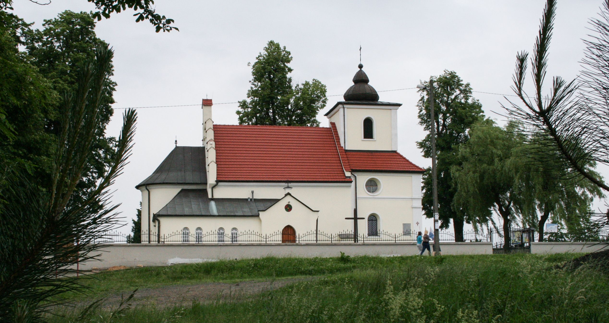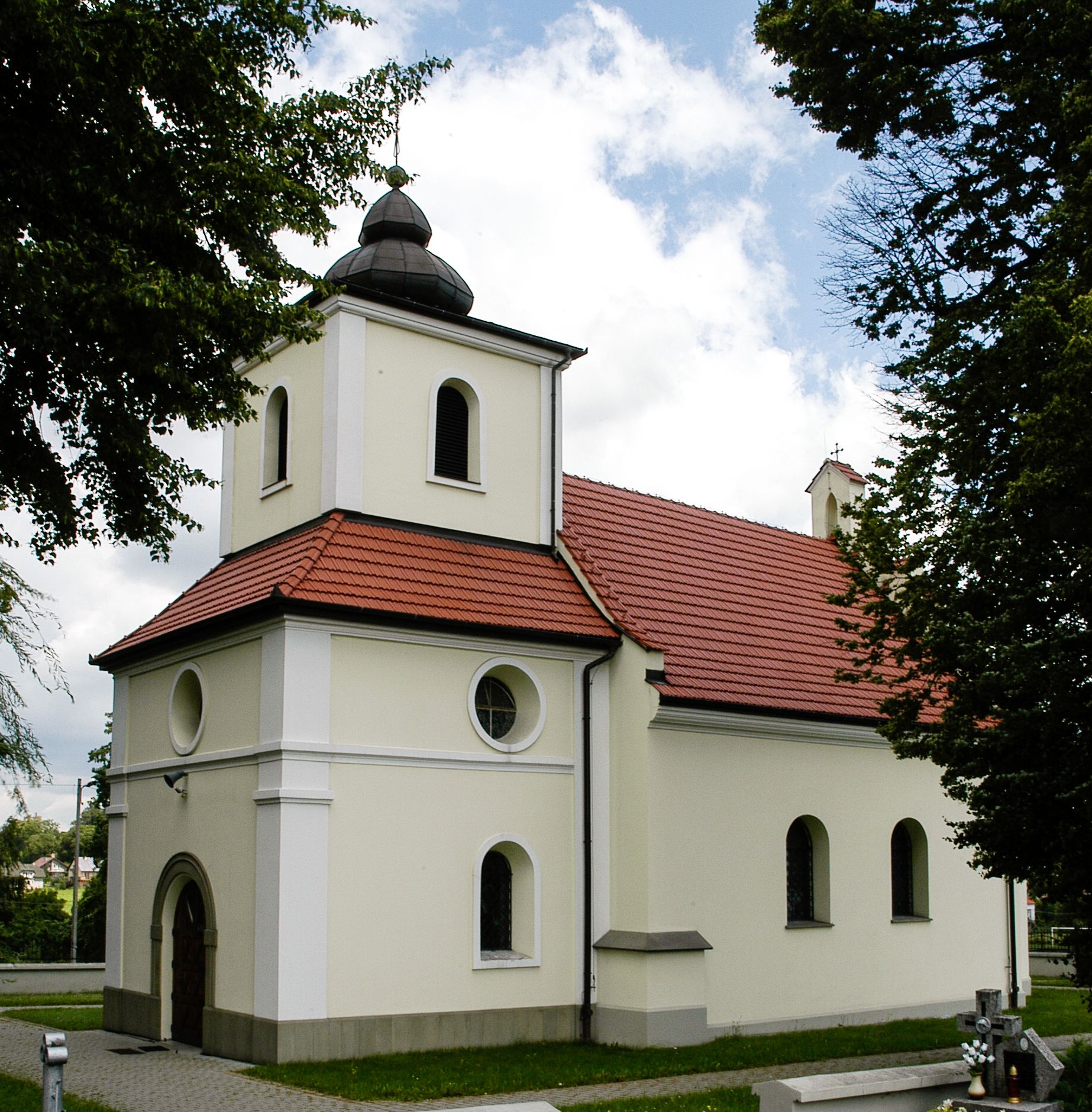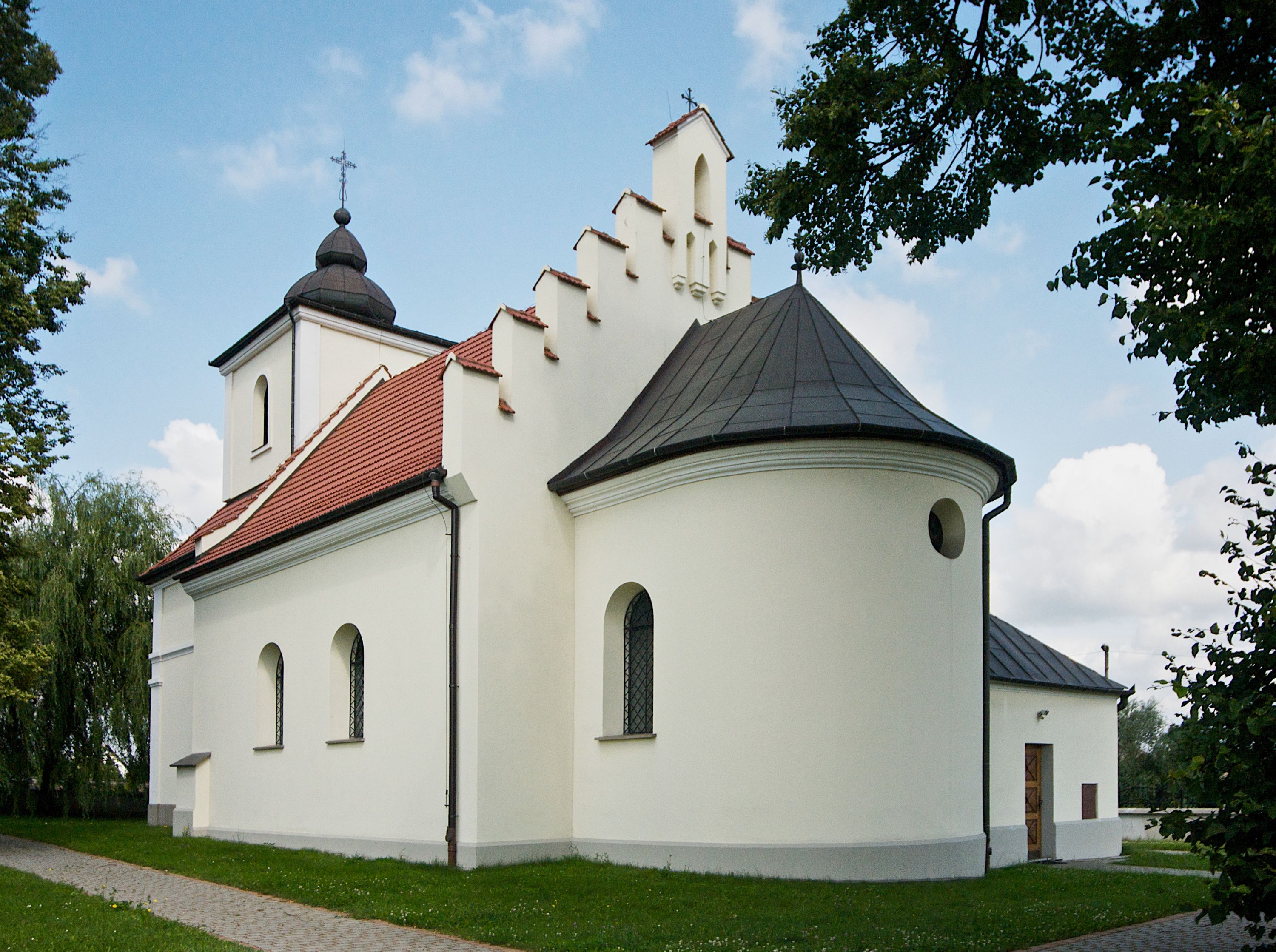 W zewnętrznej elewacji kościoła widoczny jest niewysoki, kamienny cokół wyłożony płytami z piaskowca, powyżej kościół otynkowany. Świątynię obiega podokapowy gzyms. Prezbiterium, niższe od nawy. Nawa nakryta dachem dwuspadowym z trójkątnym szczytem schodkowym na wschodnim zakończeniu. Do zachodniej fasady kościoła dostawiona jest wysoka i masywna wieża, założona na planie kwadratu. W dolnej kondygnacji na osi kościoła prostokątne, zamknięte półkoliście wejście do kruchty. Narożniki pierwszej kondygnacji flankowane lizenami, ściany w dwóch trzecich wysokości przedzielone gzymsem, powyżej na każdej ściance okrągłe okna. Kondygnacje rozdzielone daszkiem. W drugiej kondygnacji narożniki ujęte lizenami, w polach prostokątne, półkoliście zamknięte wnęki okienne z żaluzjami. Wieża zwieńczona baniastym hełmem. Nawa nakryta dachem dwuspadowym, pokrytym czerwoną dachówką, prezbiterium dachem wielopołaciowym z blachy miedzianej, która pokrywa również zakrystię. W północną ścianę kruchty pod wieżą wbudowana jest tablica pamiątkowa poświęcona kapitanowi Stanisławowi Kwiatkowskiemu.