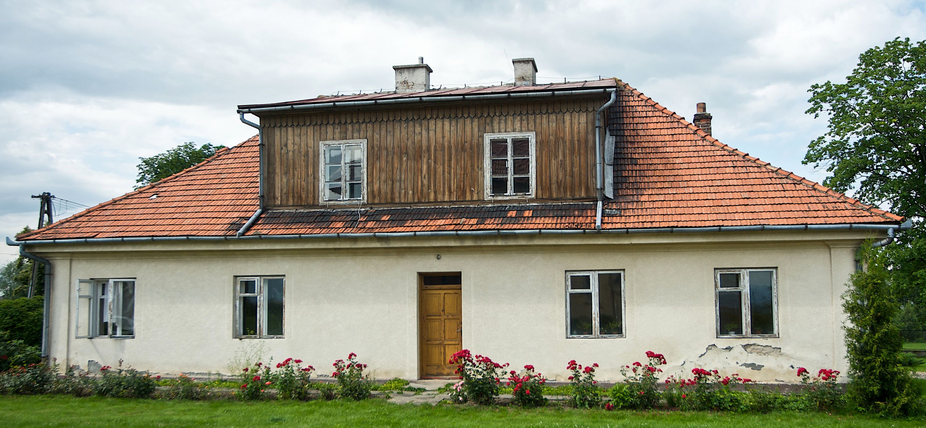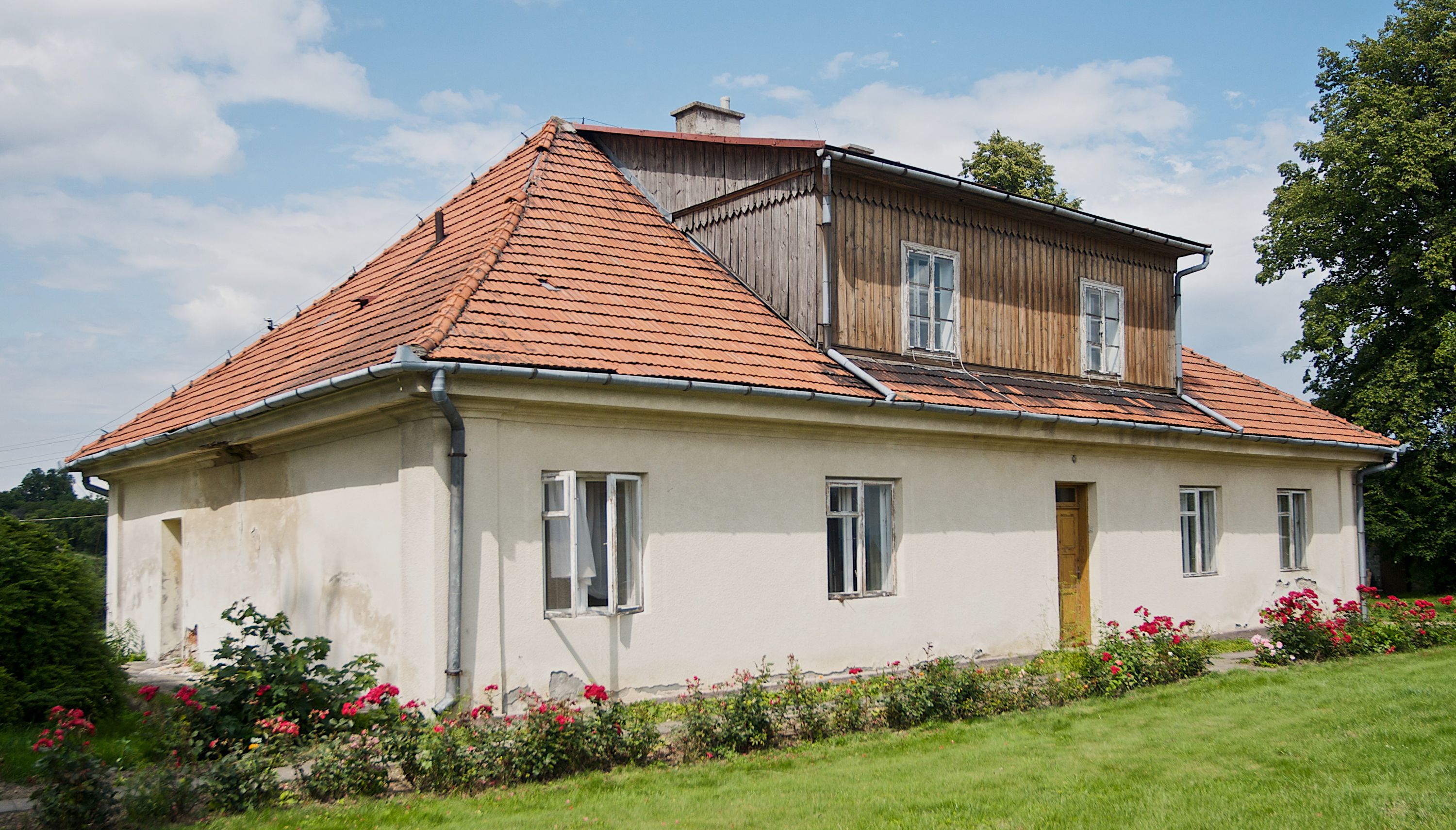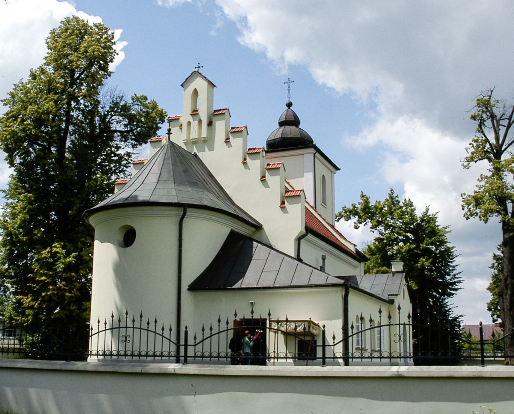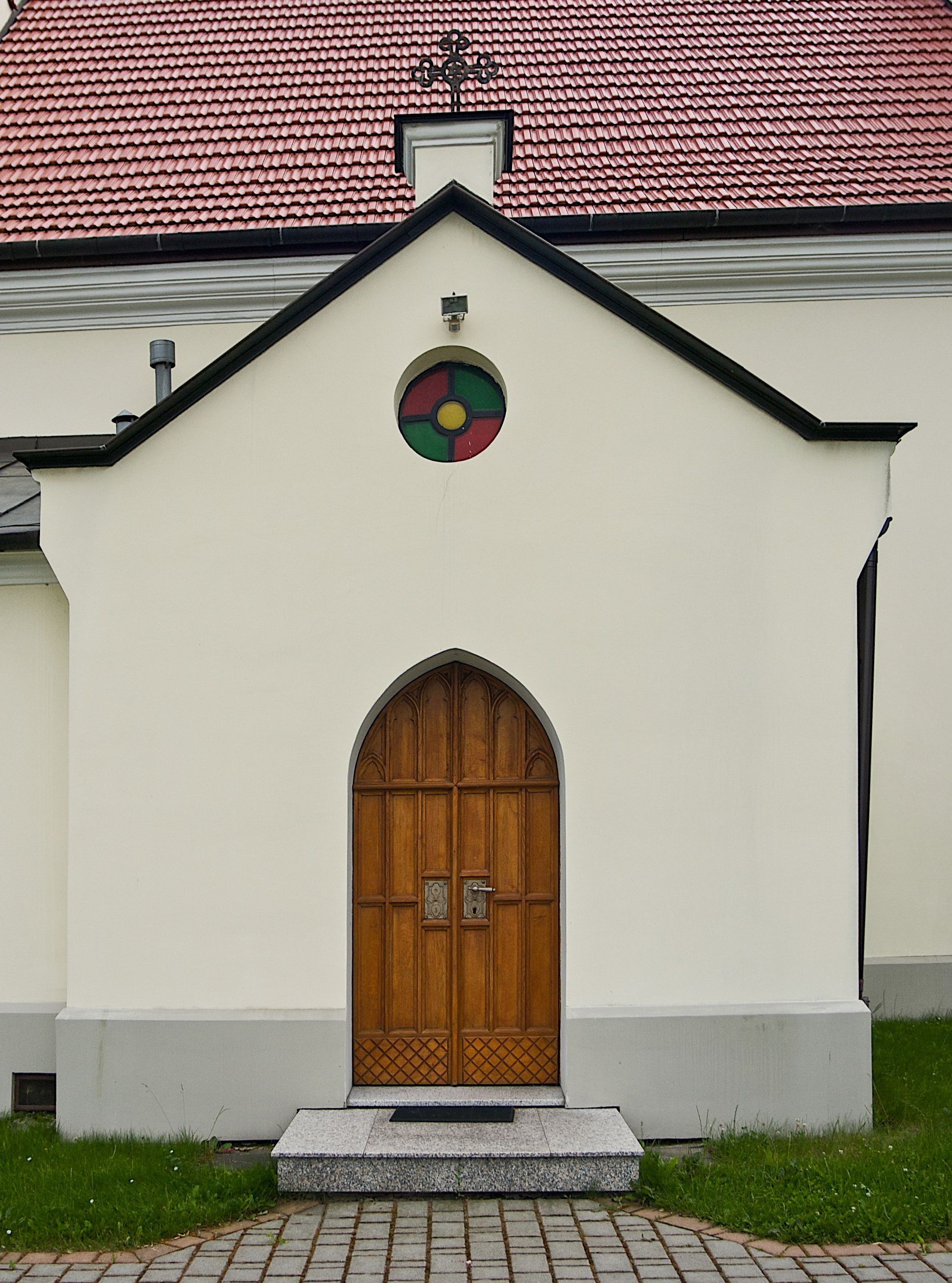 W zewnętrznej elewacji kościoła widoczny jest niewysoki, kamienny cokół wyłożony płytami z piaskowca, powyżej kościół otynkowany. Świątynię obiega podokapowy gzyms. Prezbiterium, niższe od nawy. Nawa nakryta dachem dwuspadowym z trójkątnym szczytem schodkowym na wschodnim zakończeniu. Do zachodniej fasady kościoła dostawiona jest wysoka i masywna wieża, założona na planie kwadratu. W dolnej kondygnacji na osi kościoła prostokątne, zamknięte półkoliście wejście do kruchty. Narożniki pierwszej kondygnacji flankowane lizenami, ściany w dwóch trzecich wysokości przedzielone gzymsem, powyżej na każdej ściance okrągłe okna. Kondygnacje rozdzielone daszkiem. W drugiej kondygnacji narożniki ujęte lizenami, w polach prostokątne, półkoliście zamknięte wnęki okienne z żaluzjami. Wieża zwieńczona baniastym hełmem. Nawa nakryta dachem dwuspadowym, pokrytym czerwoną dachówką, prezbiterium dachem wielopołaciowym z blachy miedzianej, która pokrywa również zakrystię. W północną ścianę kruchty pod wieżą wbudowana jest tablica pamiątkowa poświęcona kapitanowi Stanisławowi Kwiatkowskiemu.