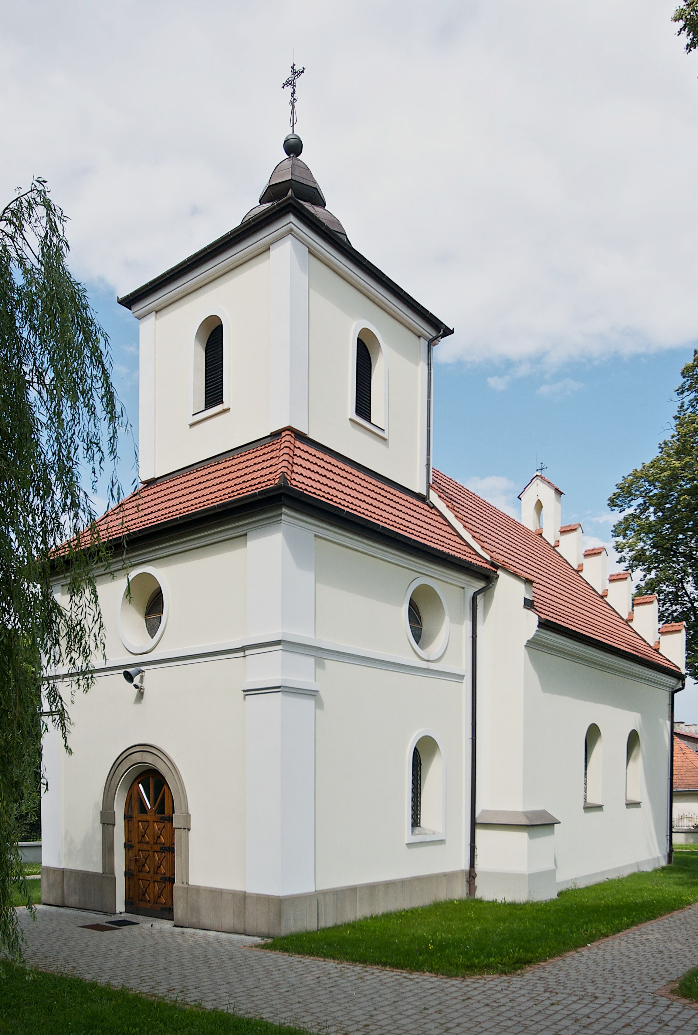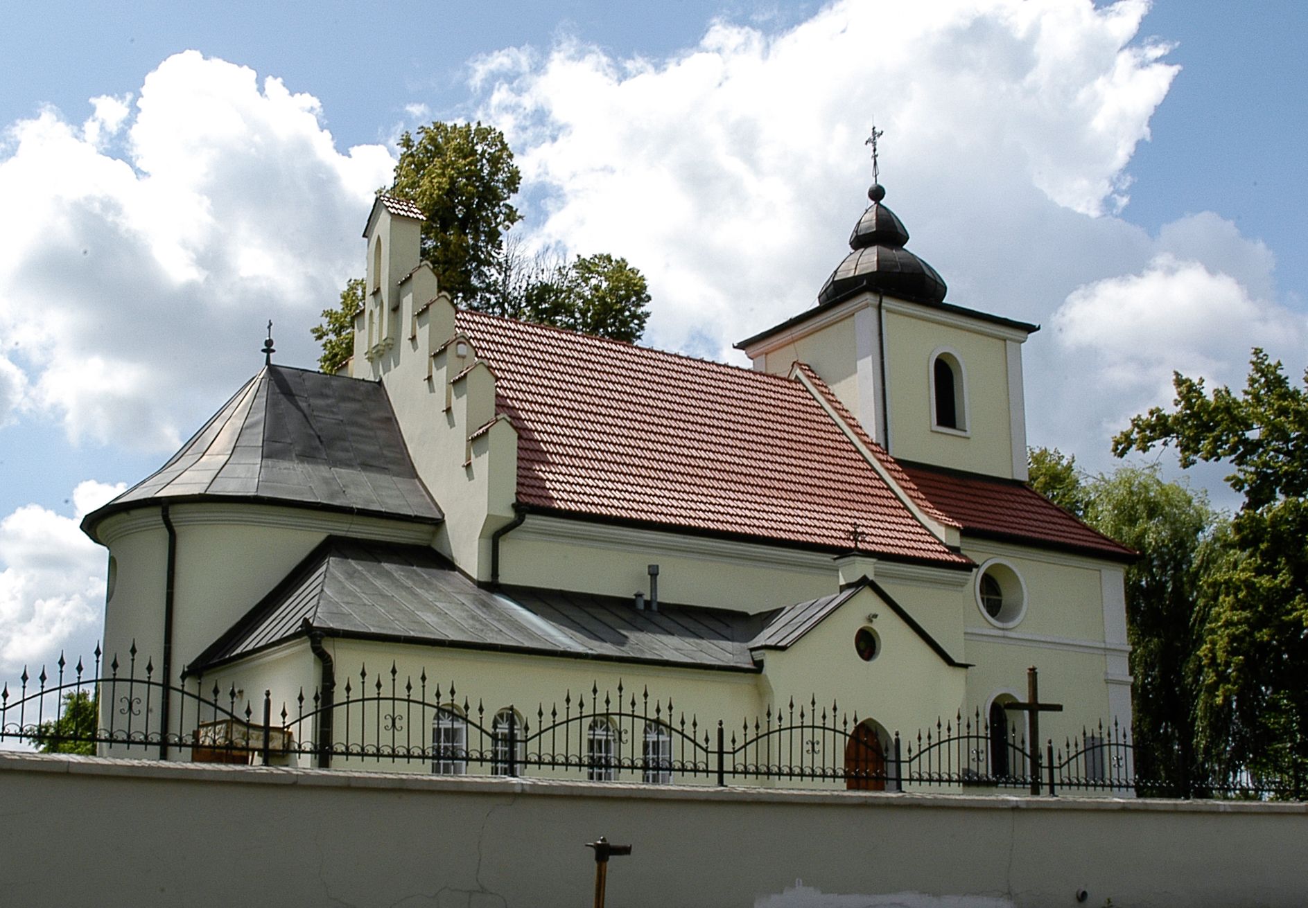 Kościół jest orientowany, murowany, otynkowany, jednonawowy z czworoboczną wieżą w fasadzie i z wąskim prezbiterium, zamkniętym półkoliście. Nawa jest szersza, na planie prostokąta, nakryta sklepieniem kolebkowym. Od zachodu do nawy dostawiona kruchta, a od strony północnej do prezbiterium zakrystia. W zachodniej części świątyni wzniesiony jest murowany chór muzyczny. Wnętrze bez zaznaczonych większych podziałów architektonicznych, jedynie w prezbiterium gzyms podokapowy, wychodzący na ścianę arkady tęczowej. Wnętrze oświetlają umieszczone w południowych ścianach nawy prostokątne, zamknięte półkoliście dwa okna oraz jedno od strony południowej w prezbiterium; ponadto niewielkie okrągłe okno na ścianie wschodniej prezbiterium. Do kościoła prowadzi główne wejście od strony zachodniej oraz jedno przez kruchtę od północy i dwa przez zakrystię. Zakrystia: wejście w części zachodniej zakończone ostrołukowo, nad nim okrągłe okno; drugie wejście w ścianie wschodniej, proste odrzwia; na ścianie północnej cztery prostokątne okna zakończone półkoliście.