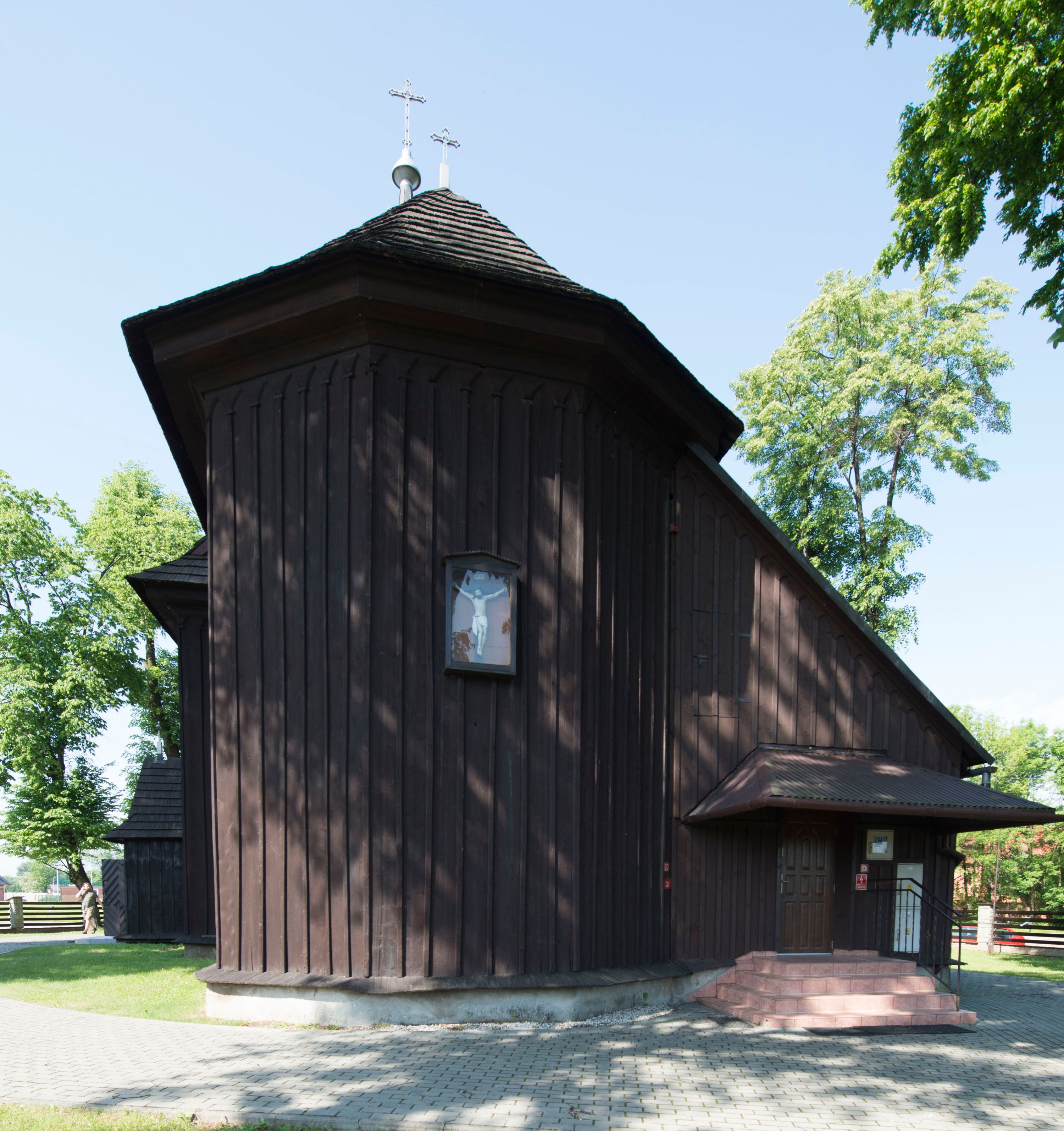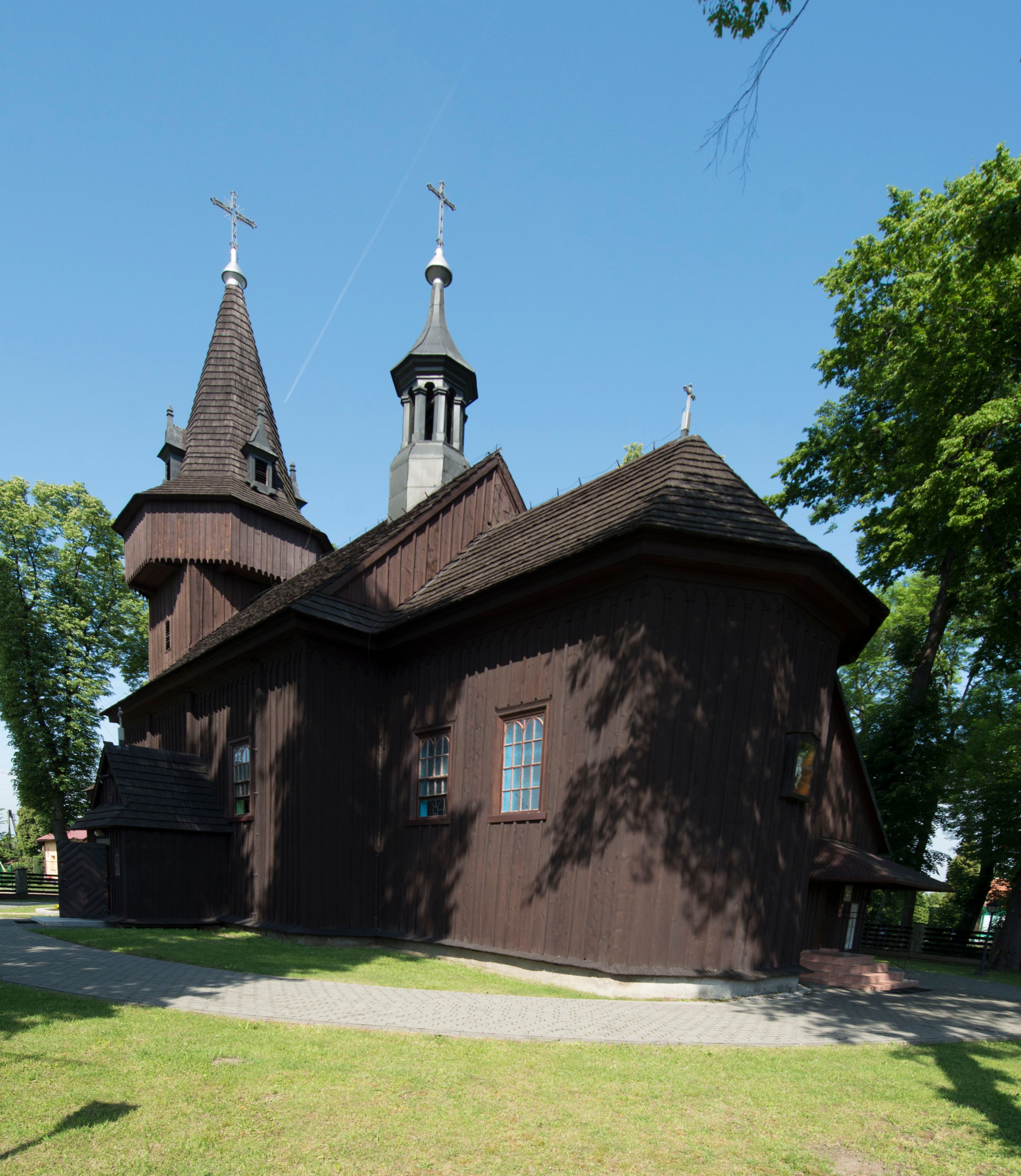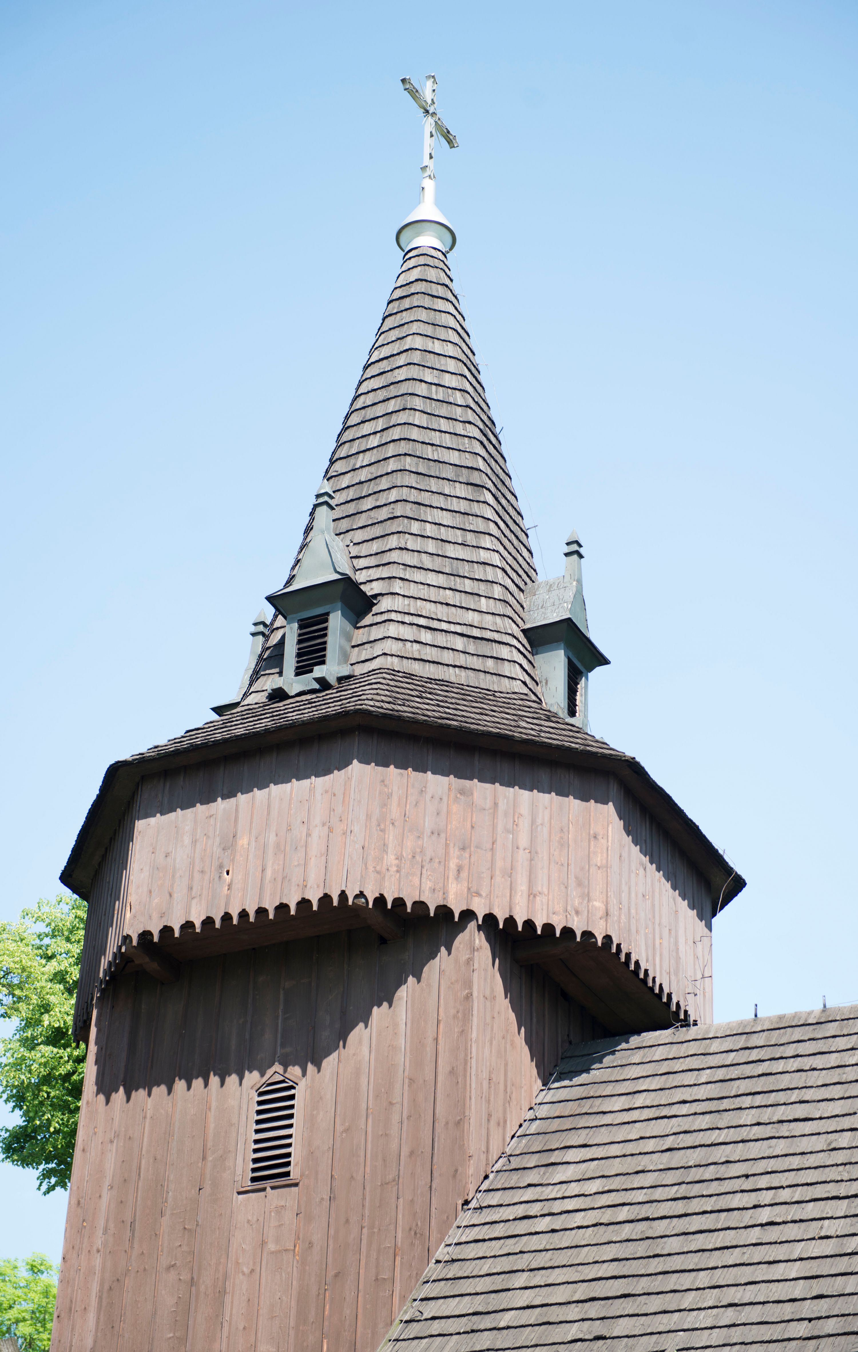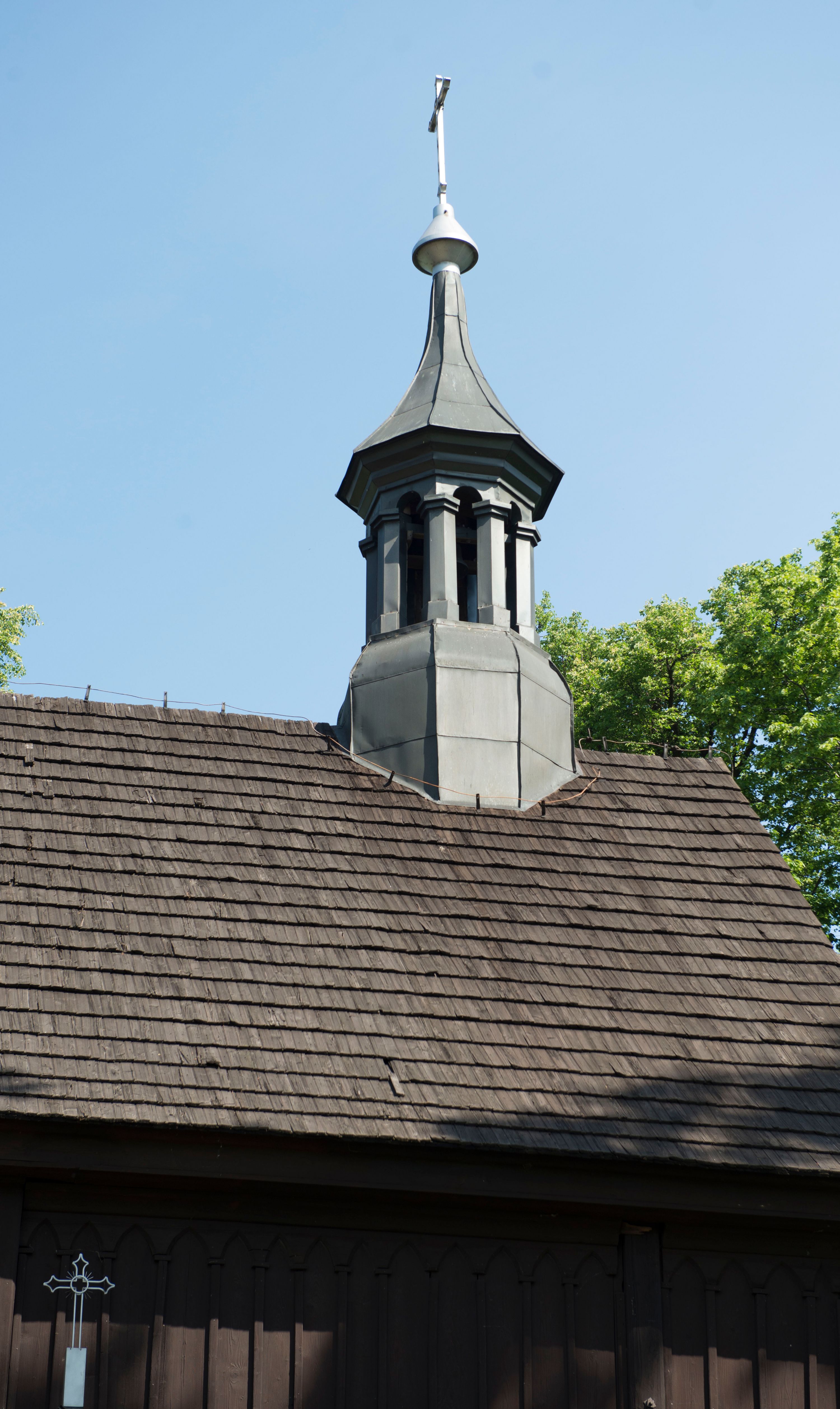 o tym samym stopniu nachylenia, podbite są gontem. Czworoboczny trzon wieży, z nadwieszoną, ośmioboczną izbicą, nakryta jest stromym, ostrosłupowym, gontowym dachem .