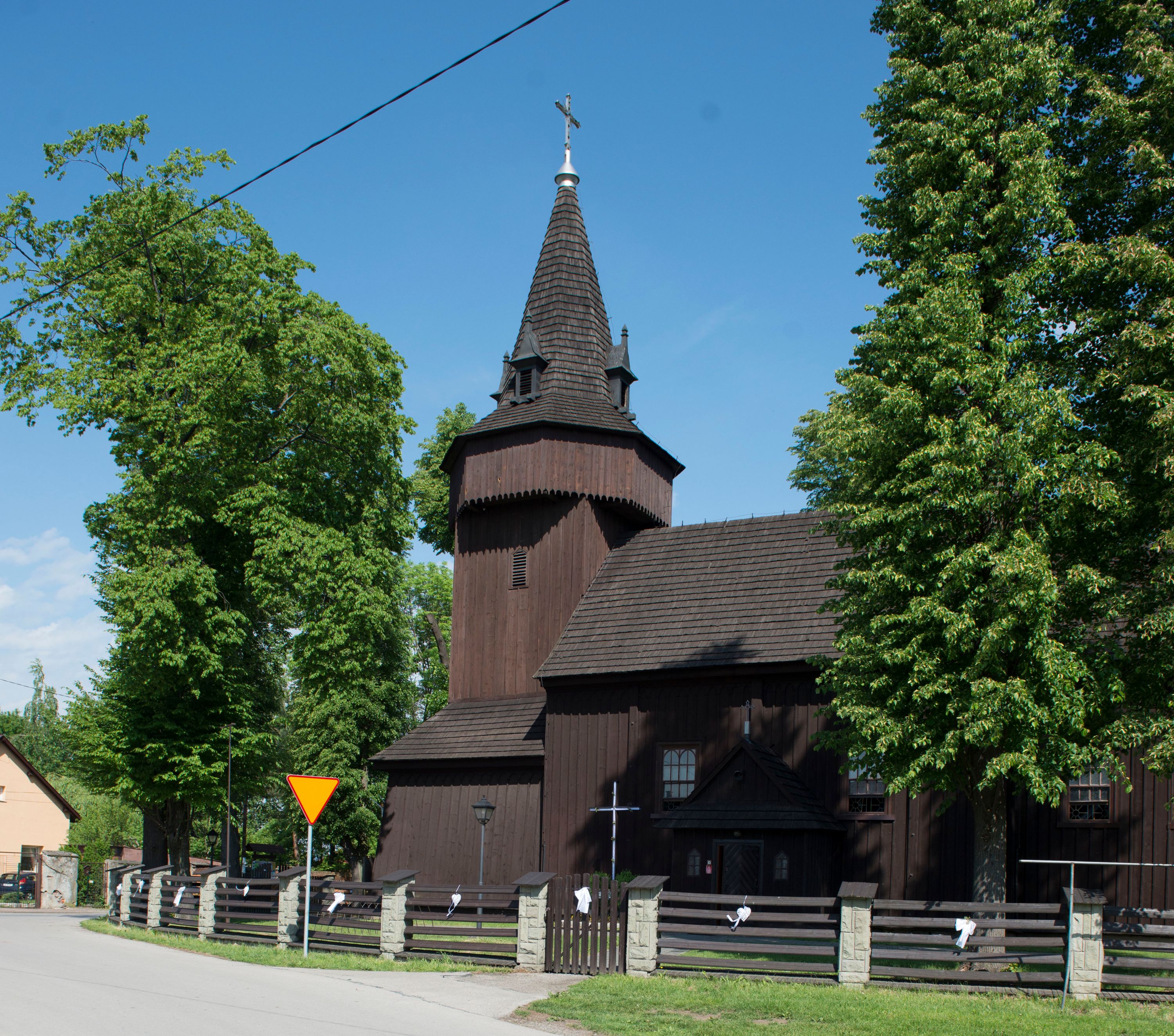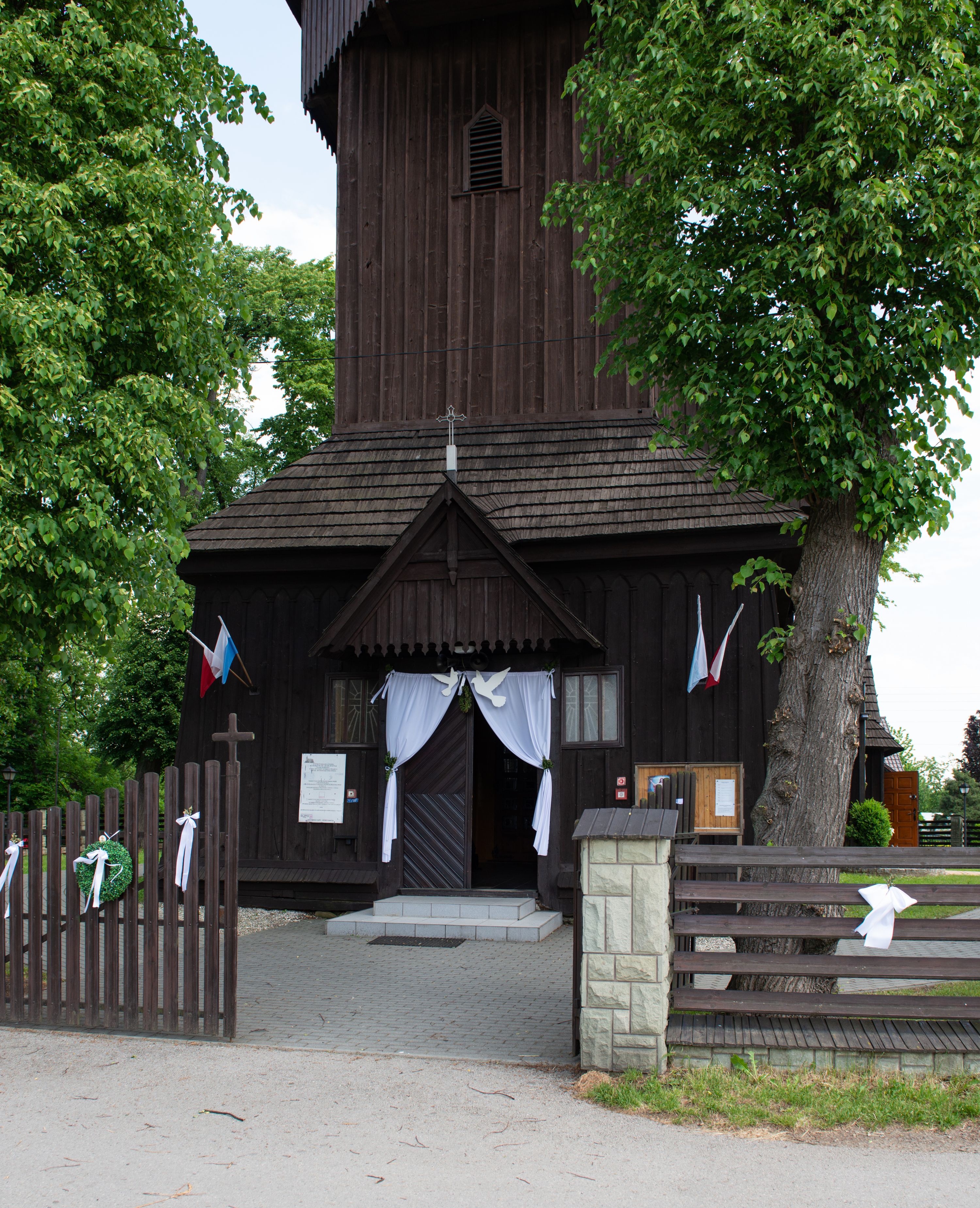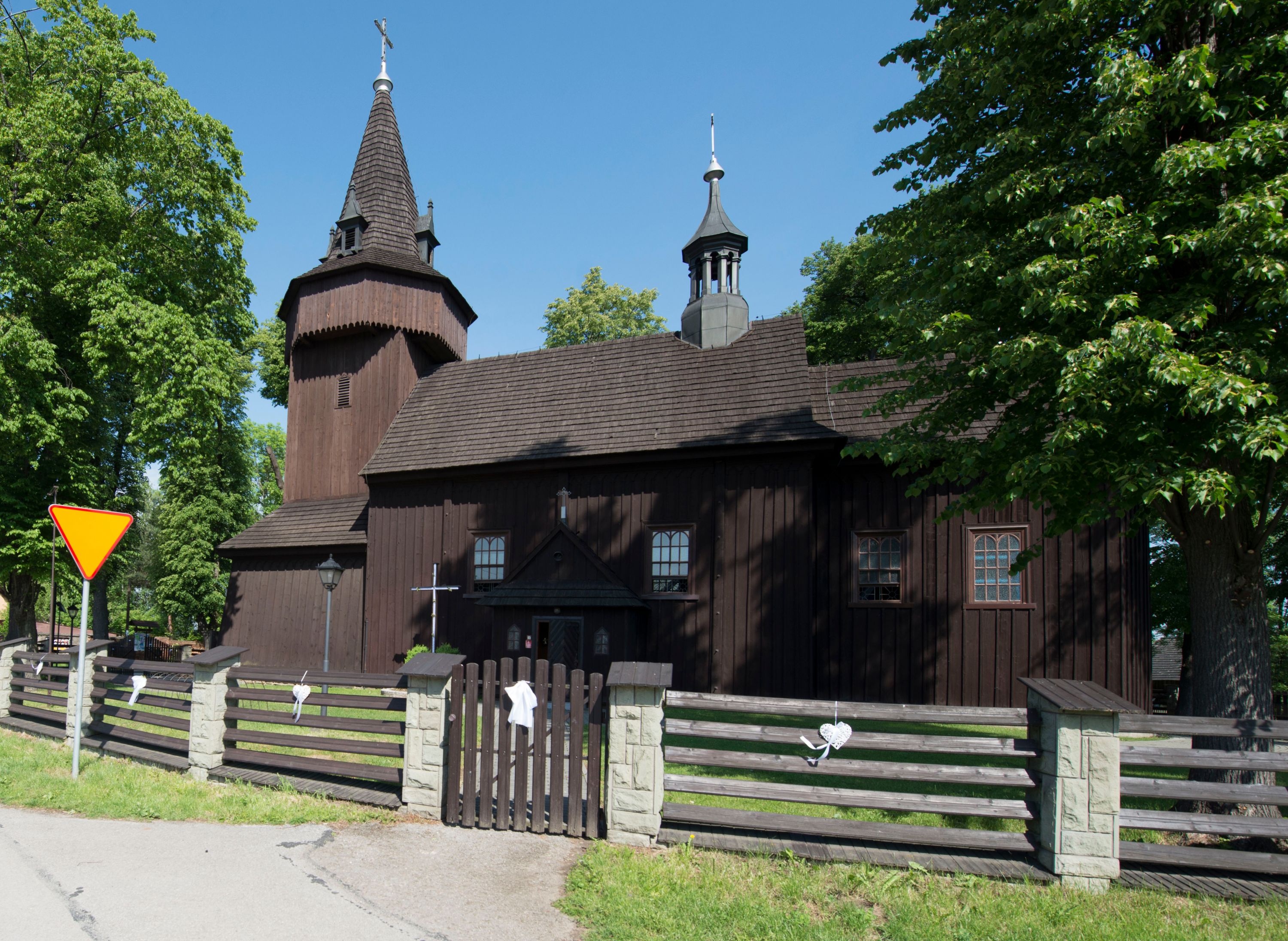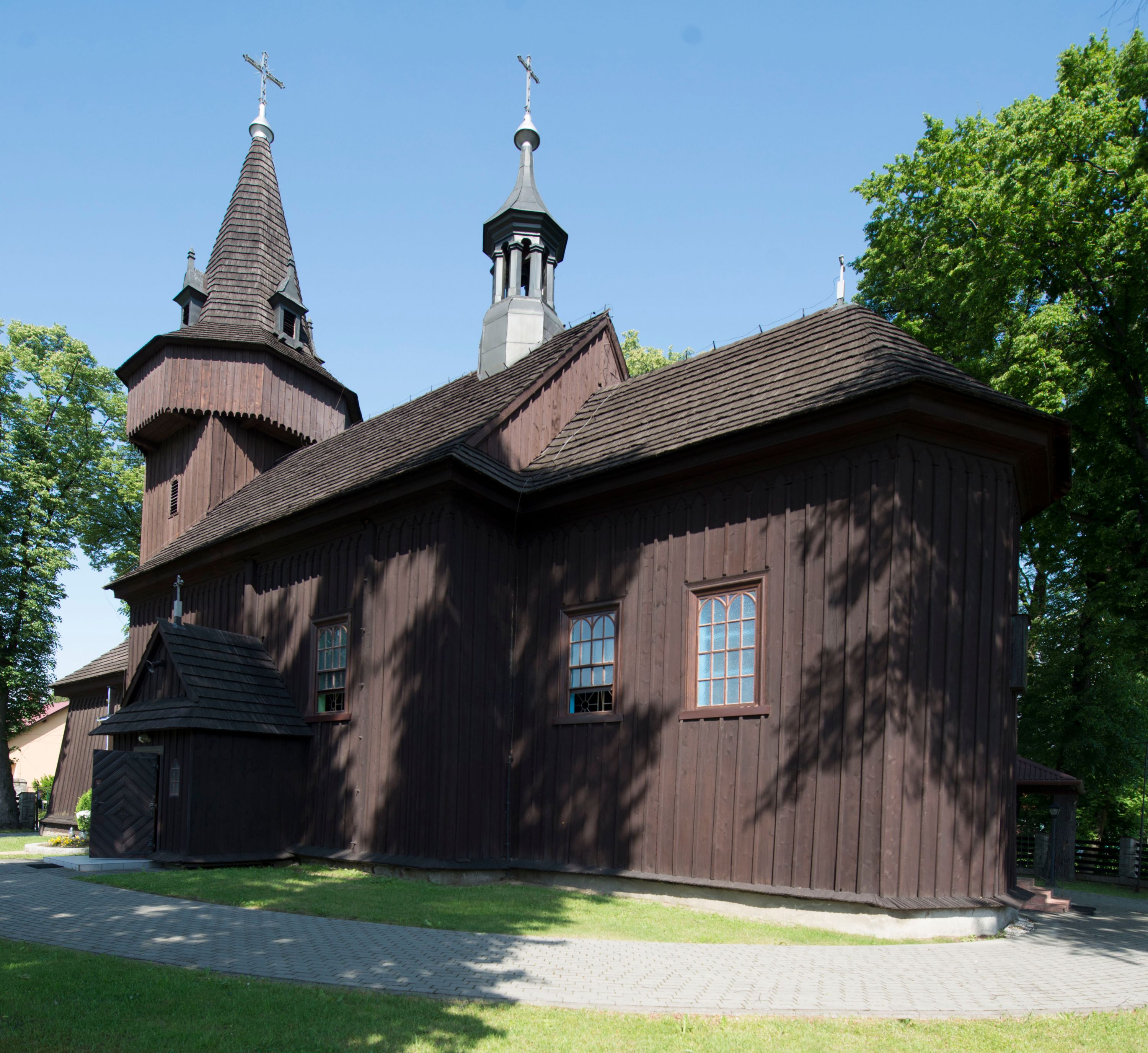 o tym samym stopniu nachylenia, podbite są gontem. Czworoboczny trzon wieży, z nadwieszoną, ośmioboczną izbicą, nakryta jest stromym, ostrosłupowym, gontowym dachem .