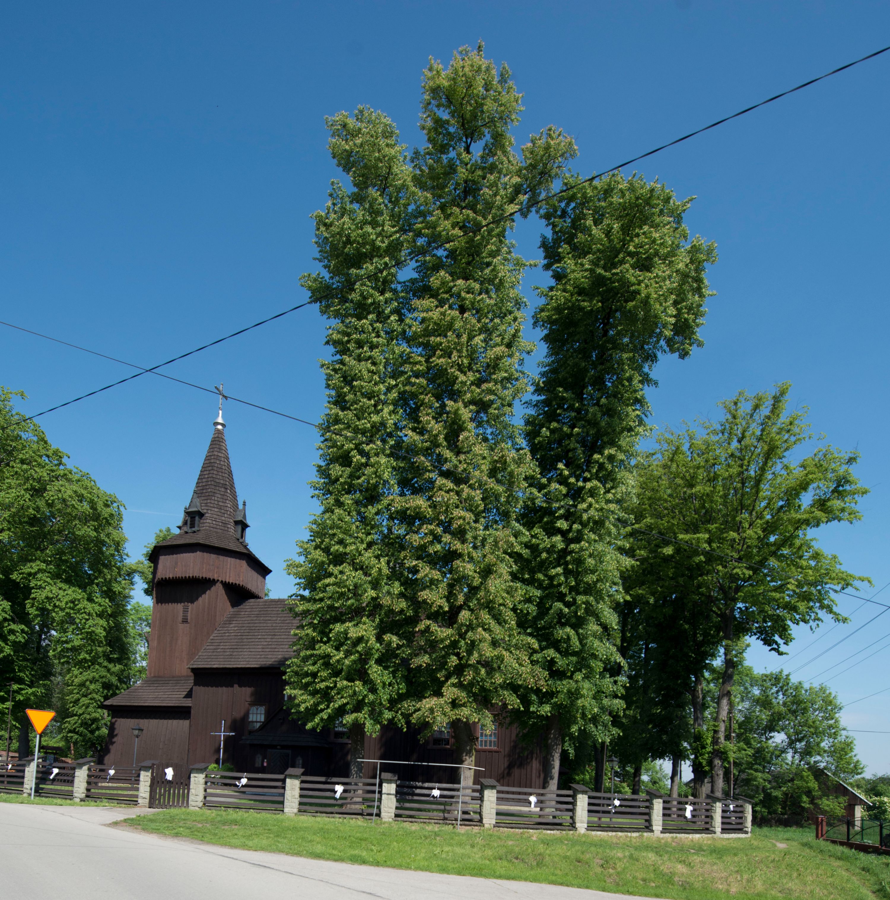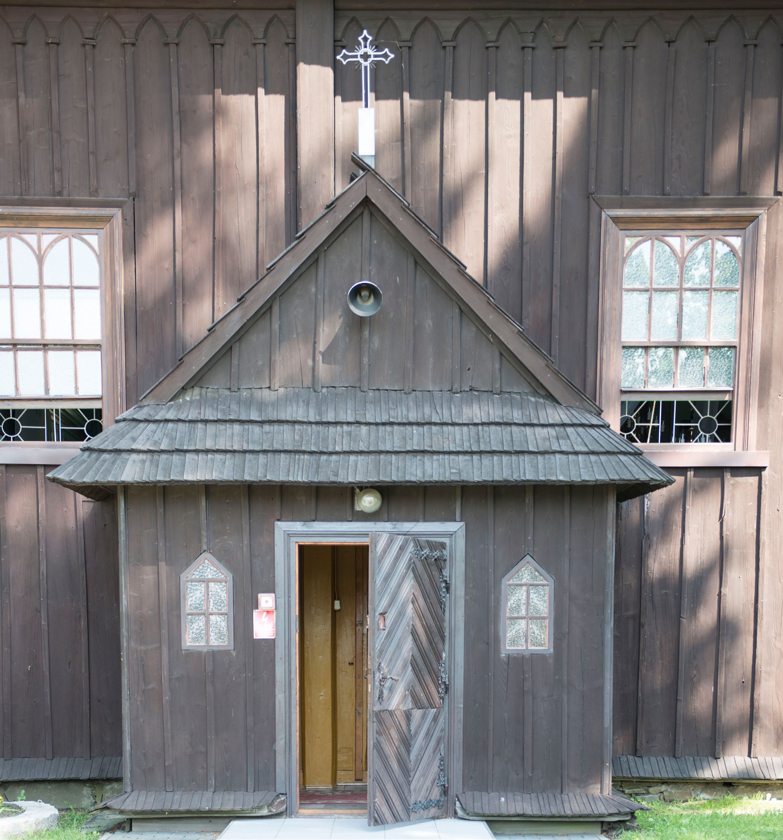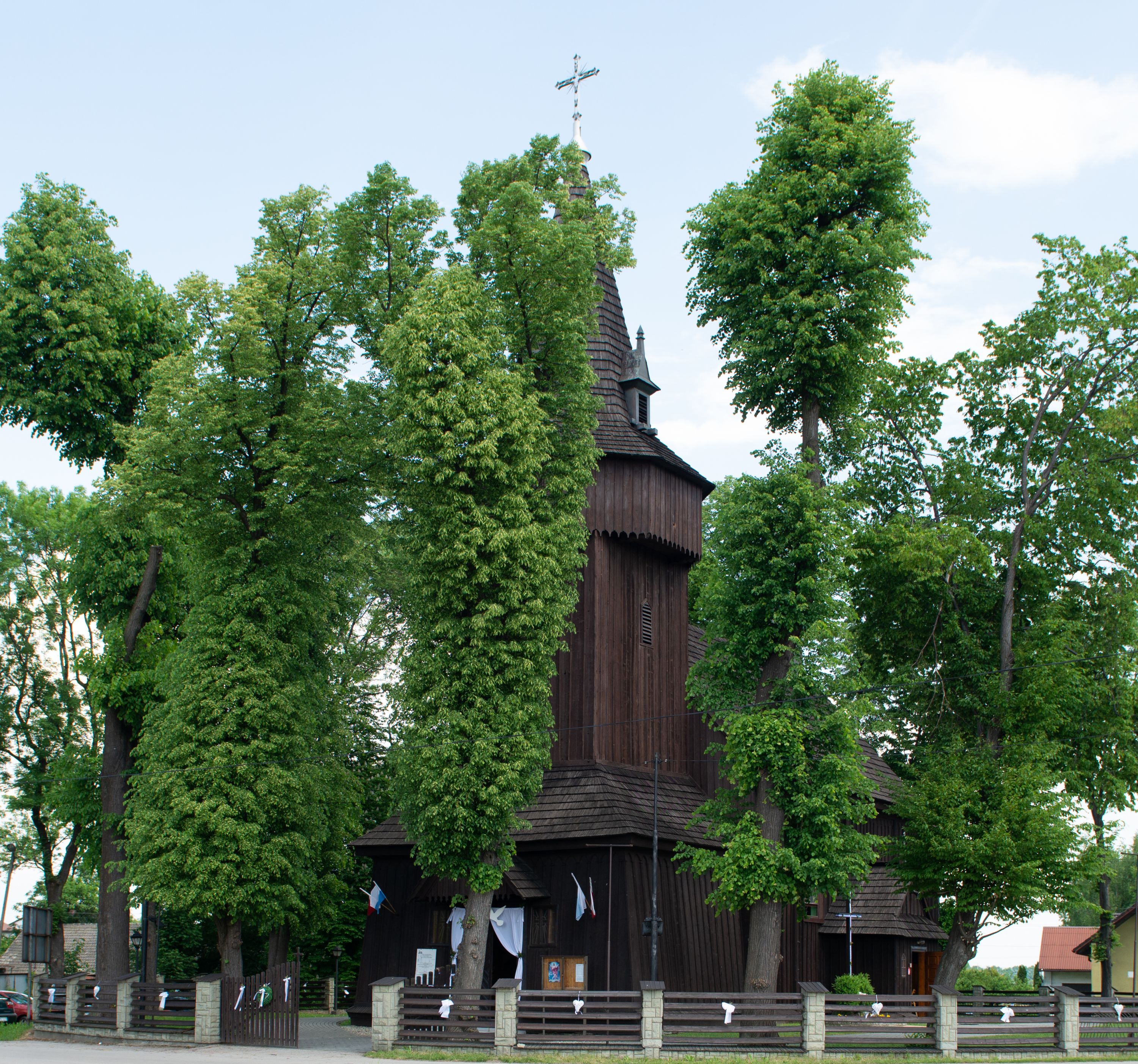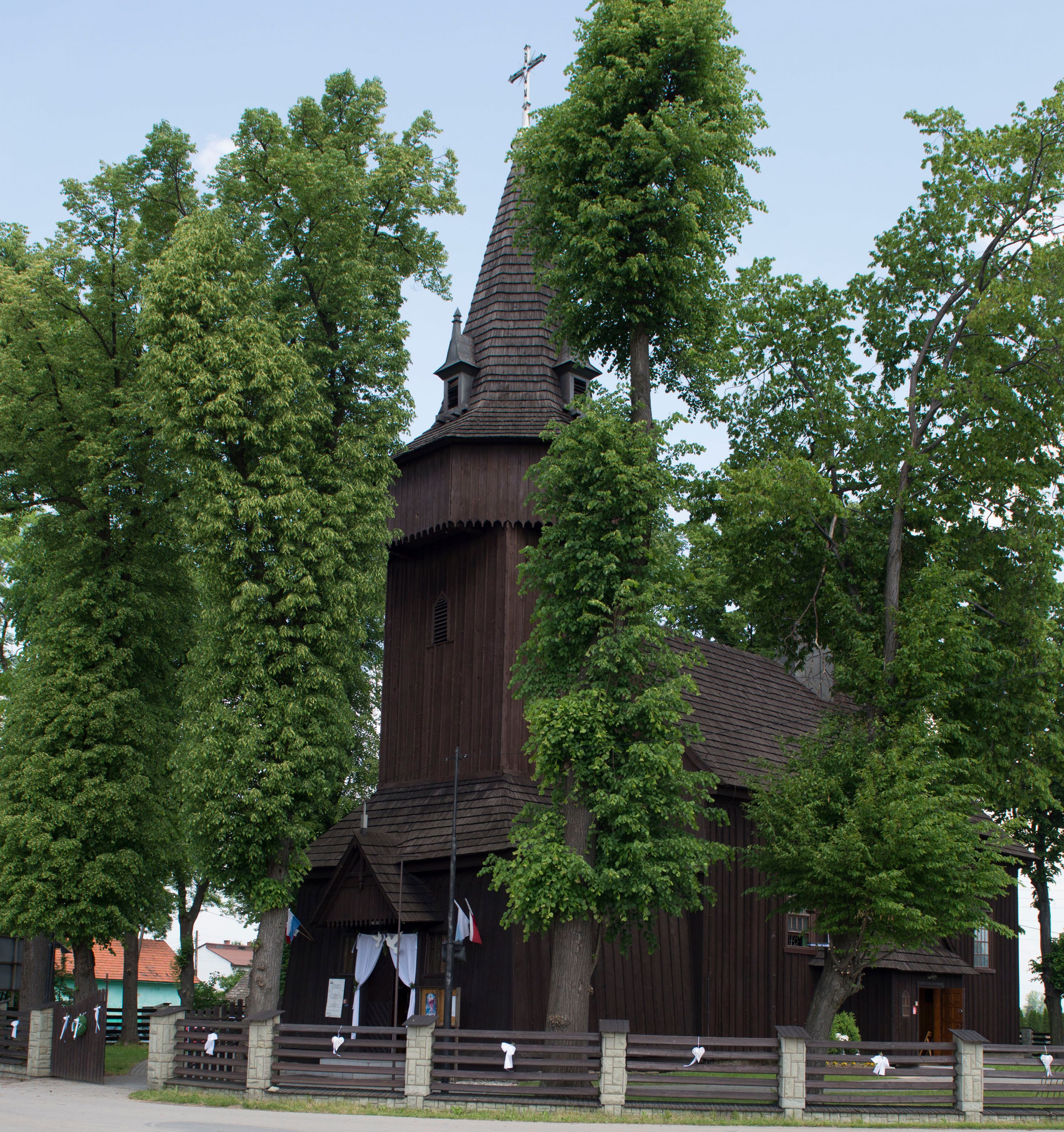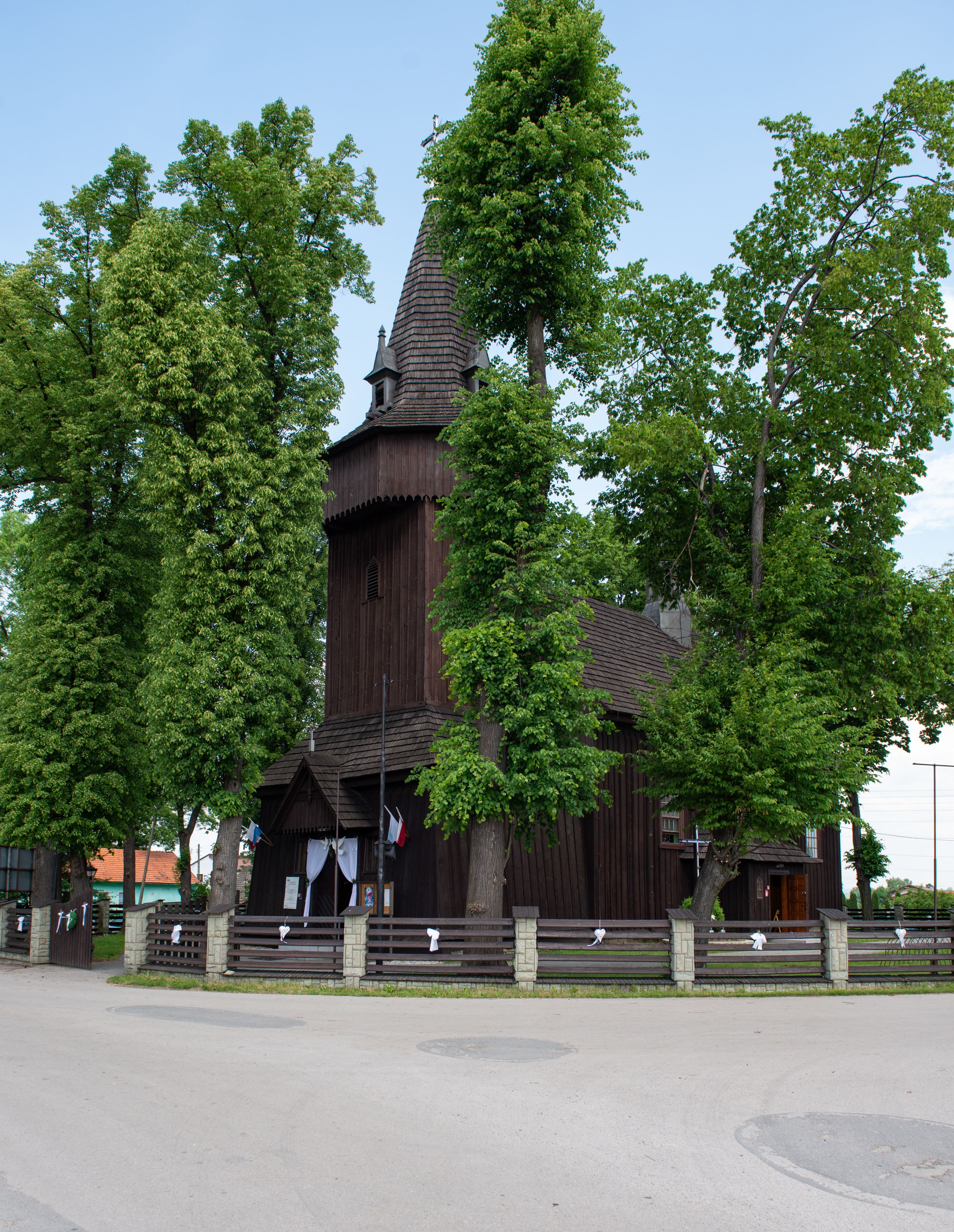 o tym samym stopniu nachylenia, podbite są gontem. Czworoboczny trzon wieży, z nadwieszoną, ośmioboczną izbicą, nakryta jest stromym, ostrosłupowym, gontowym dachem .