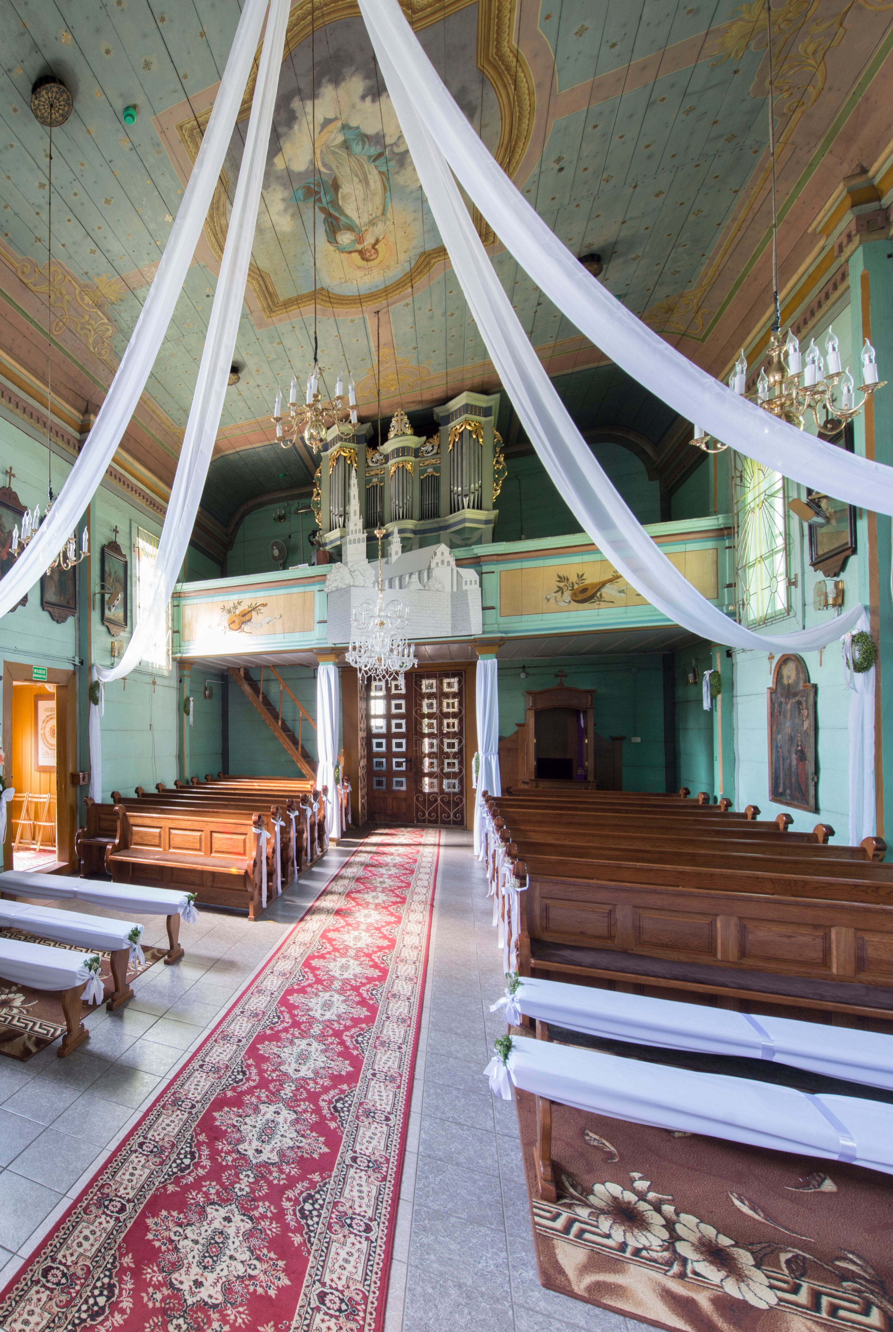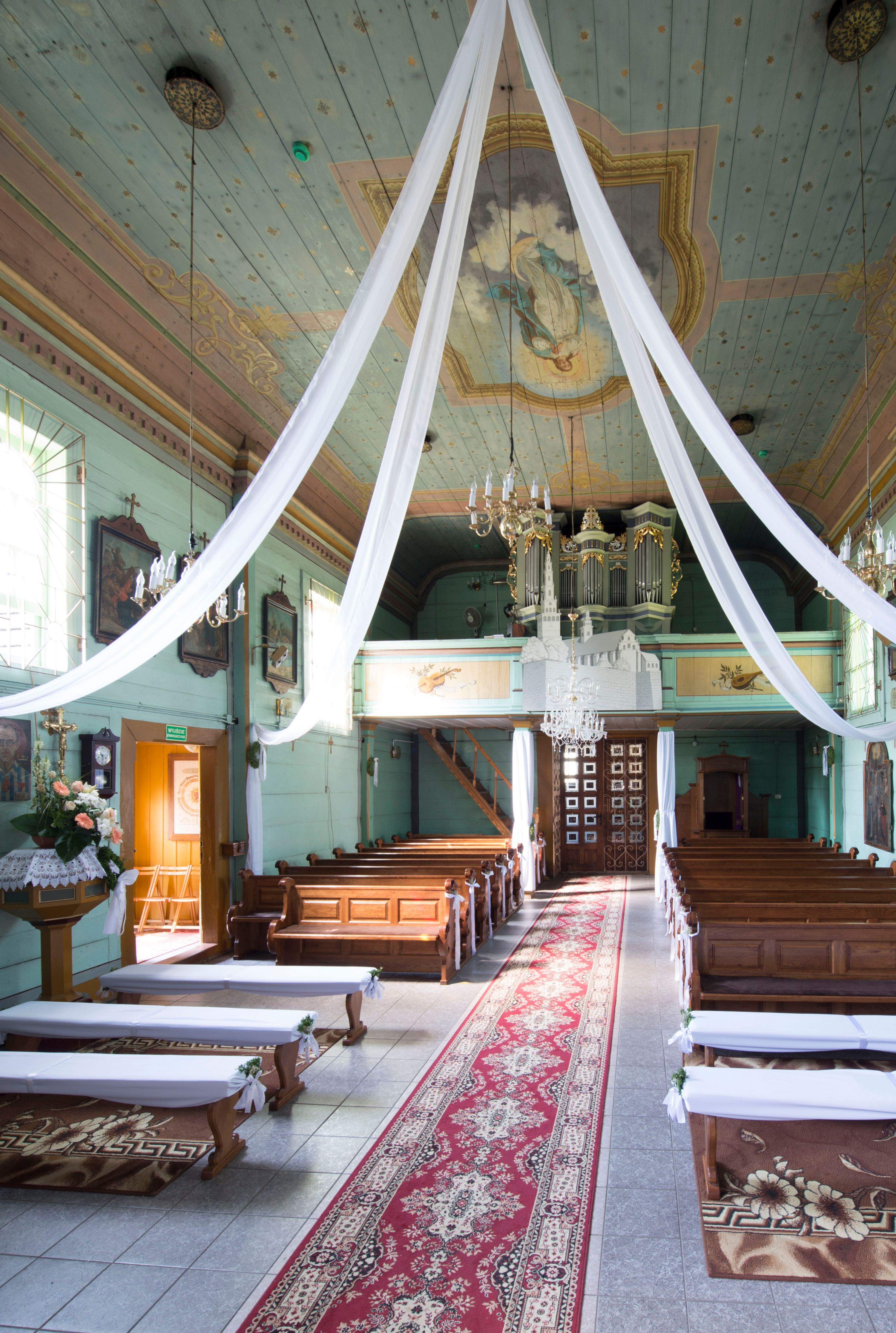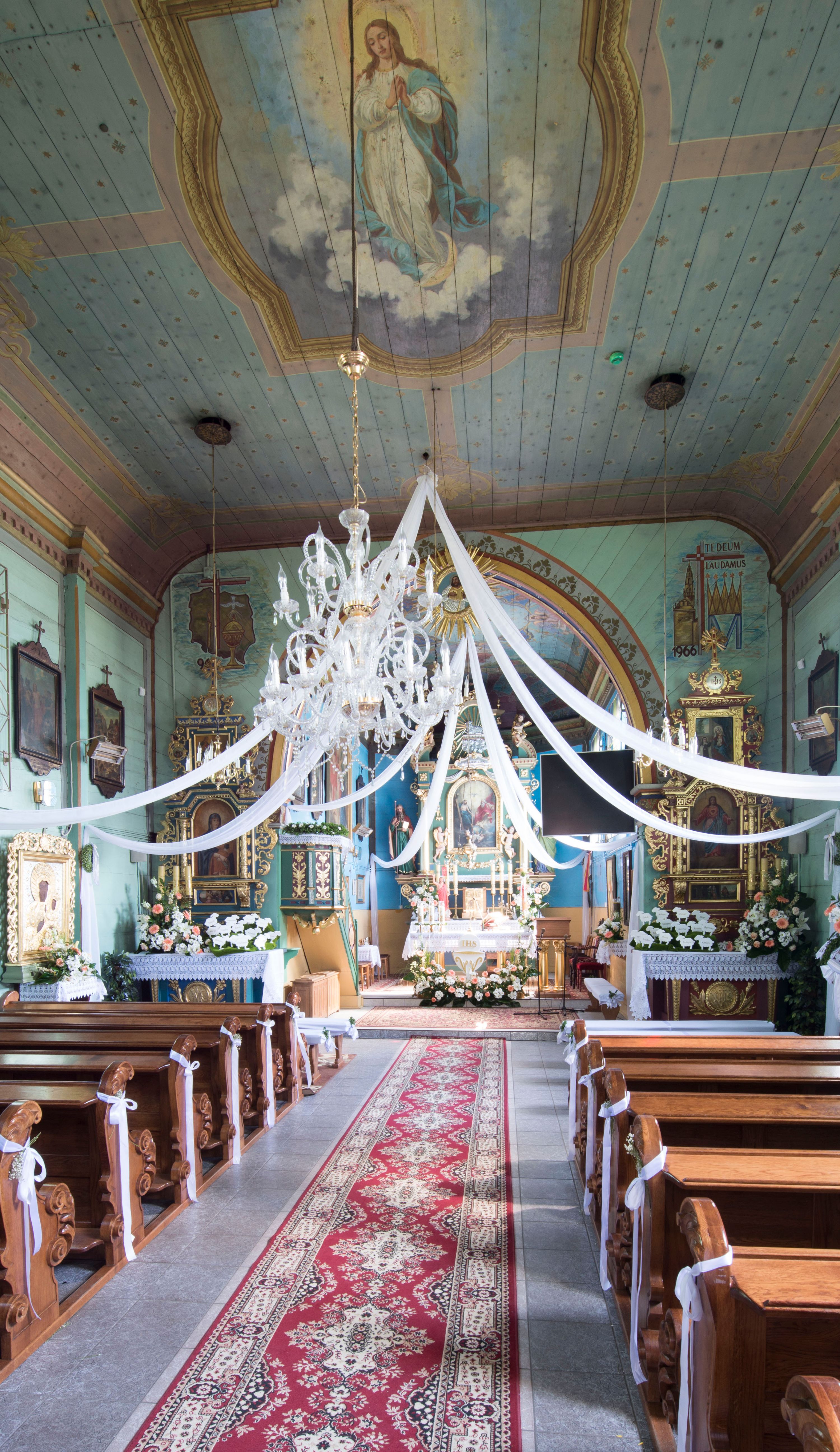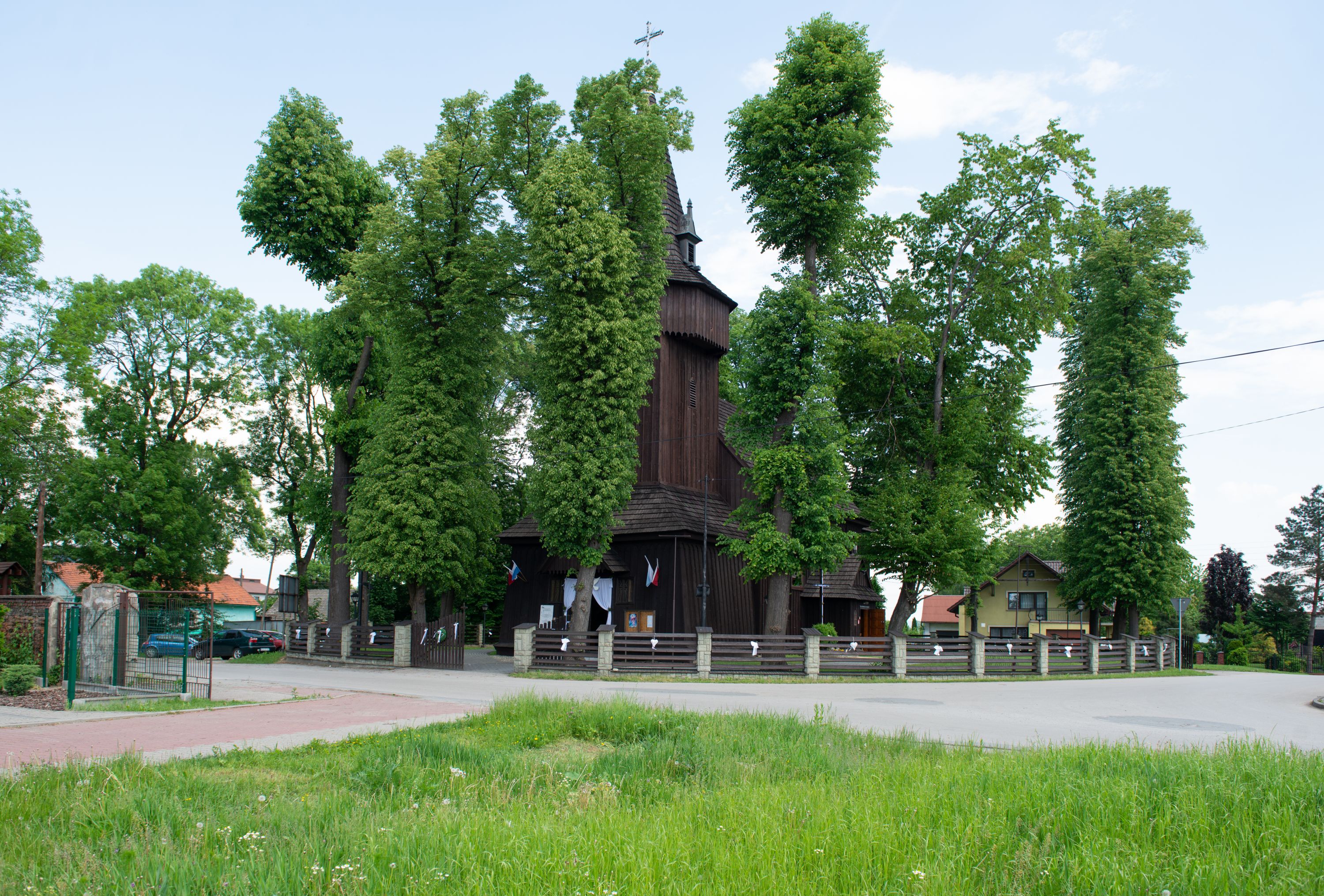 o tym samym stopniu nachylenia, podbite są gontem. Czworoboczny trzon wieży, z nadwieszoną, ośmioboczną izbicą, nakryta jest stromym, ostrosłupowym, gontowym dachem .