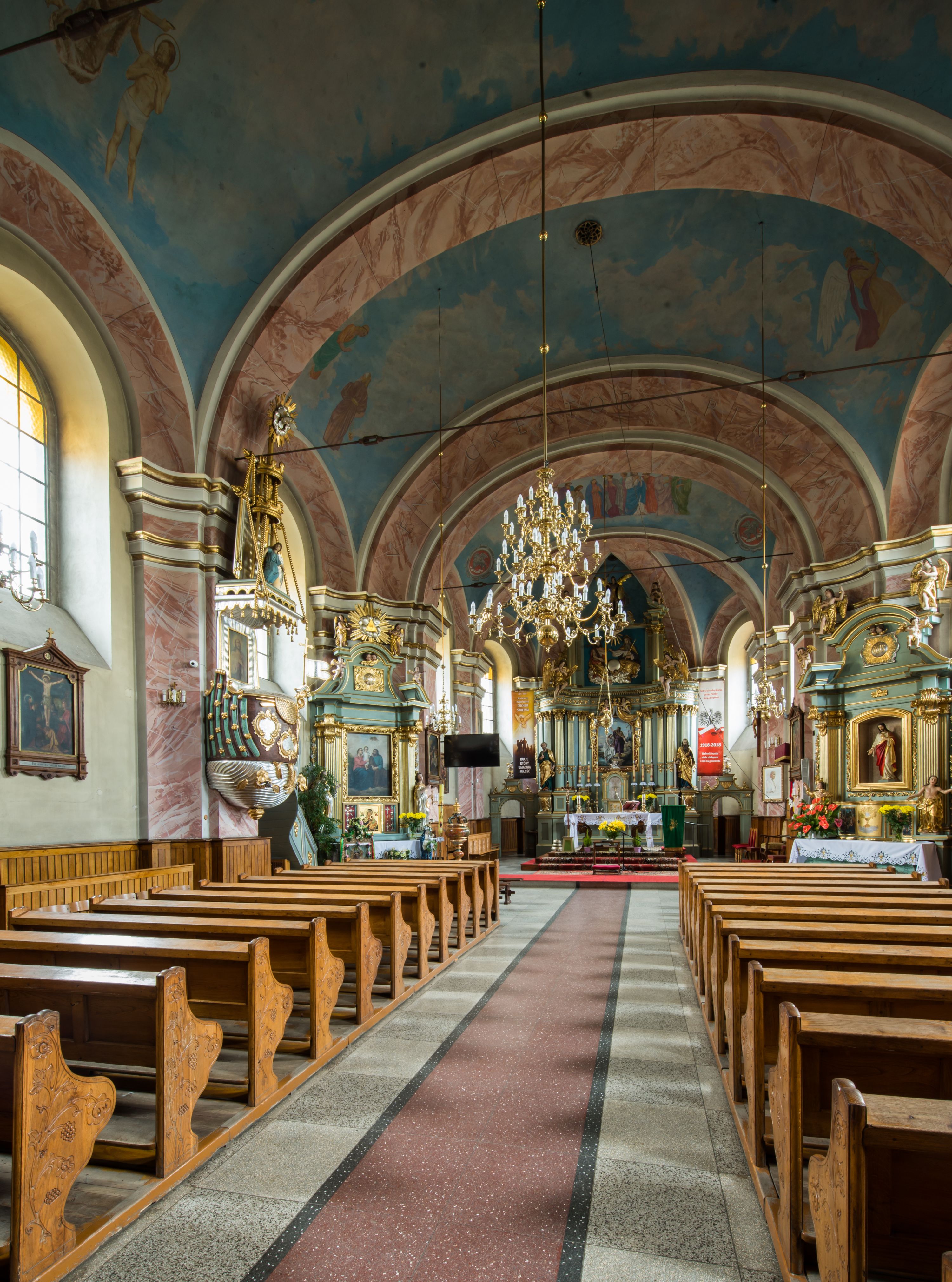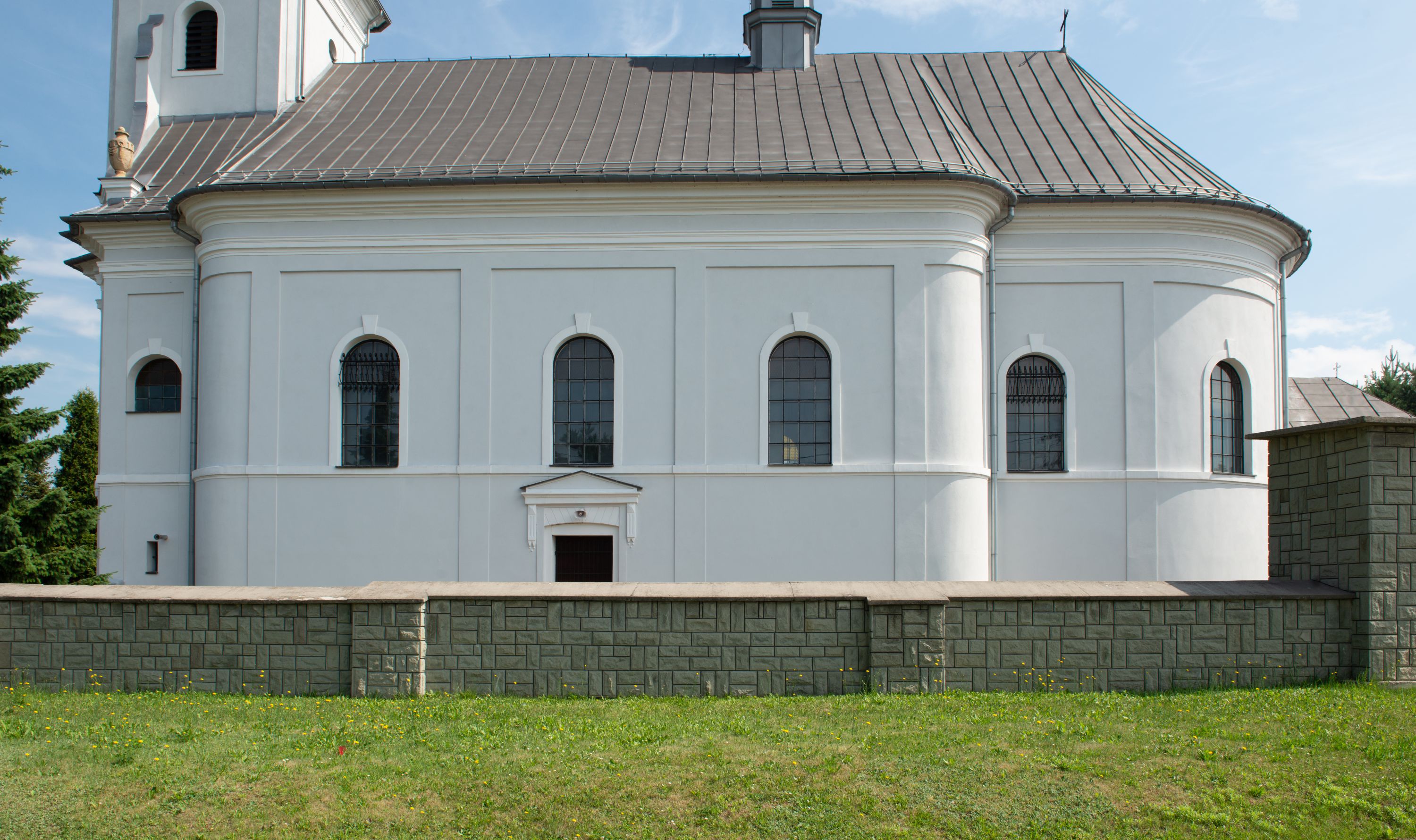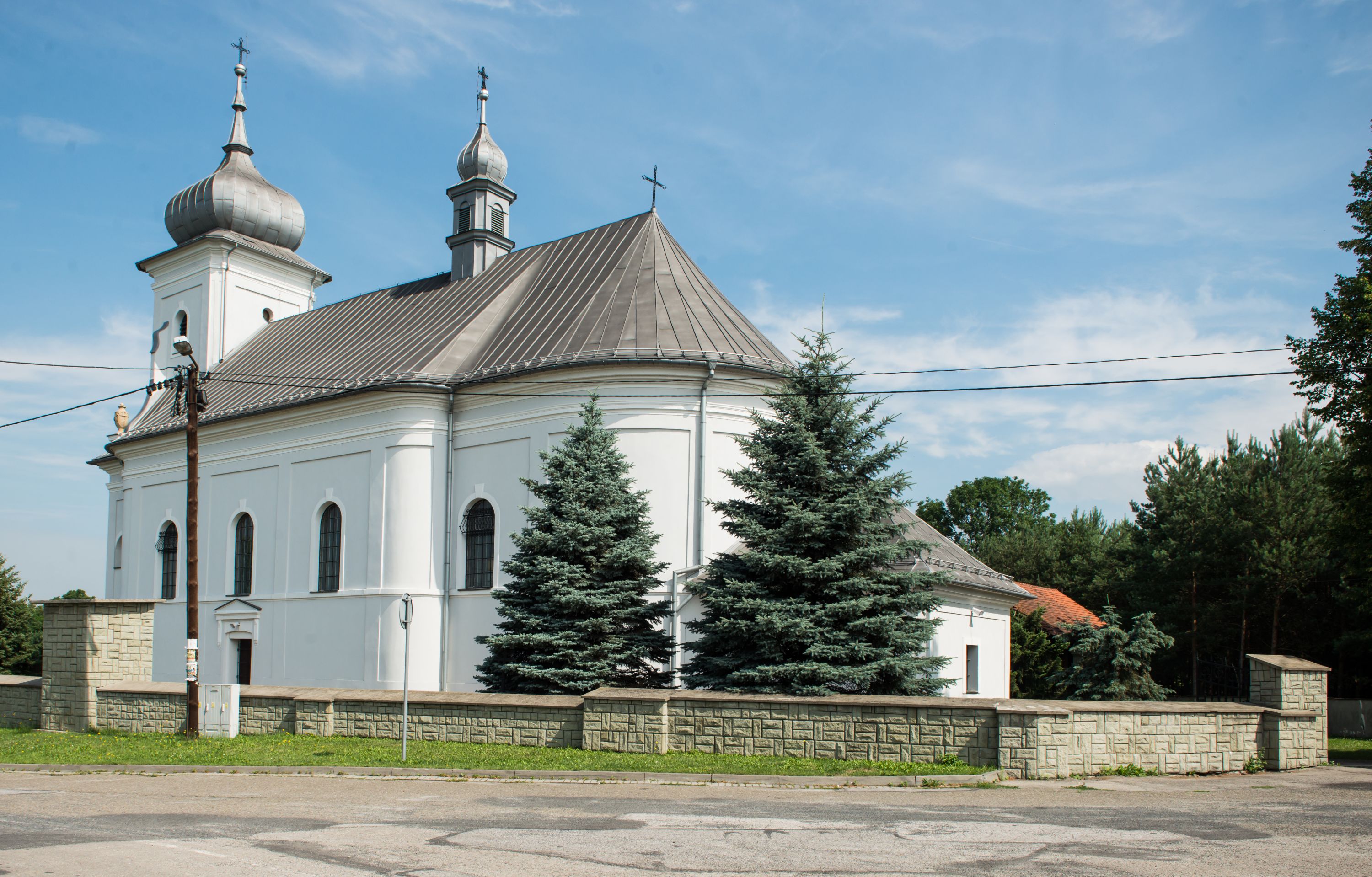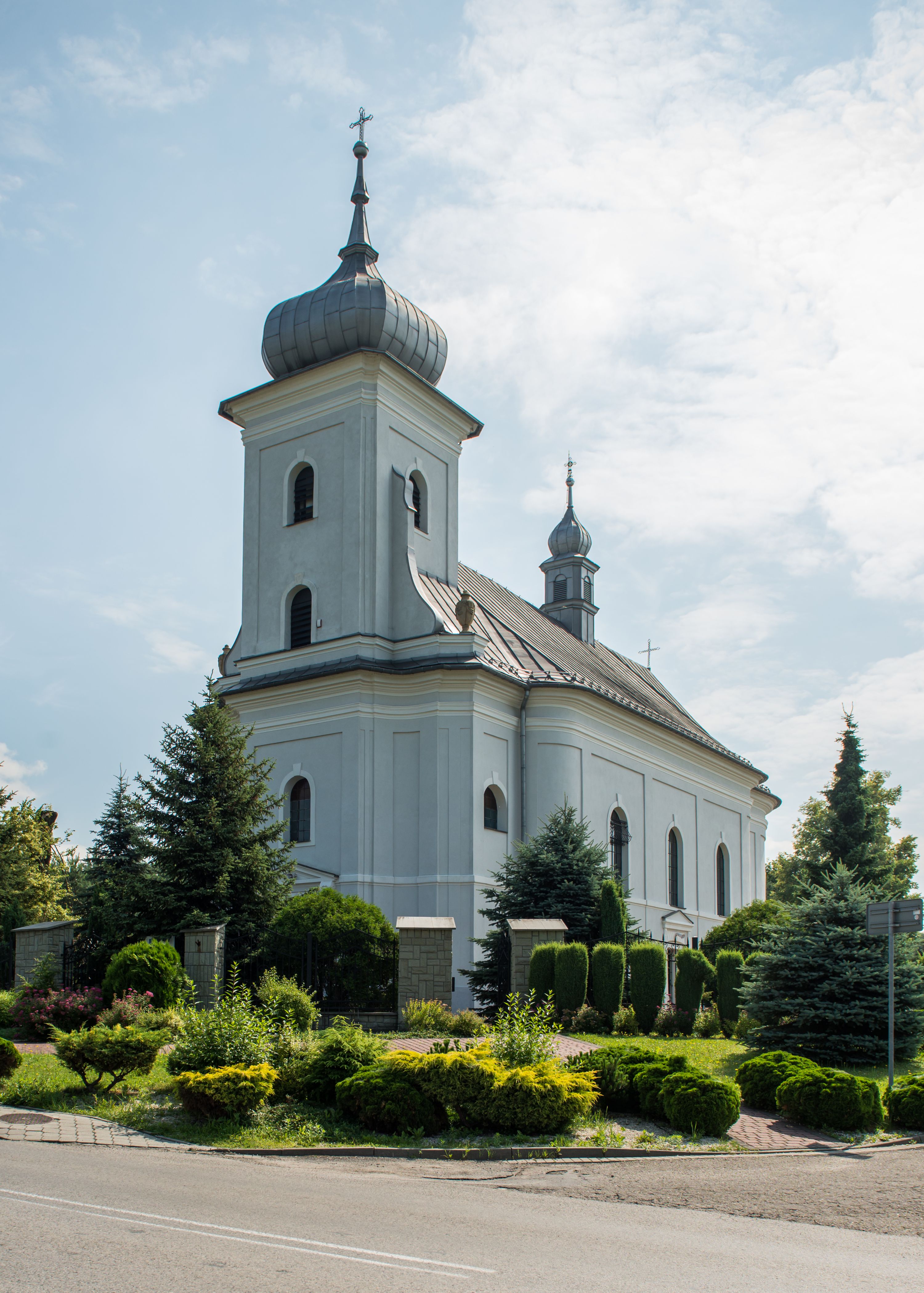 Murowany kościół otrzymał układ jednonawowej świątyni z węższym prezbiterium zwróconym ku północy i wieżą dostawioną do nawy od południa. Prezbiterium jest jednoprzęsłowe zakończone spłaszczoną apsydą. Na jego przedłużeniu usytuowano czworoboczną zakrystię. Prostokątna nawa jest trójprzęsłowa o zaokrąglonych narożnikach. Od frontu wzniesiono czworoboczną wieżę o ściętych narożnikach, flankowaną piętrowymi lokalnościami. Wysunięto ją lekko ku przodowi, gdzie przechodzi wklęsłymi płaszczyznami w boczne części fasady. Jej górne piętro nakryte cebulastym hełmem zostało opięte po bokach wolutami, obok których ustawiono kamienne klasycystyczne wazy. Elewacje zewnętrzne artykułowano podziałami ramowymi, zamykając wysokości ścian gzymsem gurtowy. Na końcu nawy na siodłowym dachu pokrytym blachą umieszczono czworoboczną wieżyczkę na sygnaturkę zwieńczoną cebulastym hełmem z krzyżem. Podobnym dachem nakryto prezbiterium. Wnętrze kościoła zostało rozczłonkowane lizenami z wklęsłymi półlizenami po bokach, ponad którymi rozciągnięto odcinki belkowania. Całość nakryto sklepieniem żaglastym na zdwojonych gurtach. Od południa w nawie urządzono chór muzyczny wsparty na dwóch kolumnach z parapetem wklęsłowypukłym. W prezbiterium usytuowano ołtarz główny, a w nawie dwa ołtarze boczne. Tu także na ścianie zachodniej zawieszono ambonę.