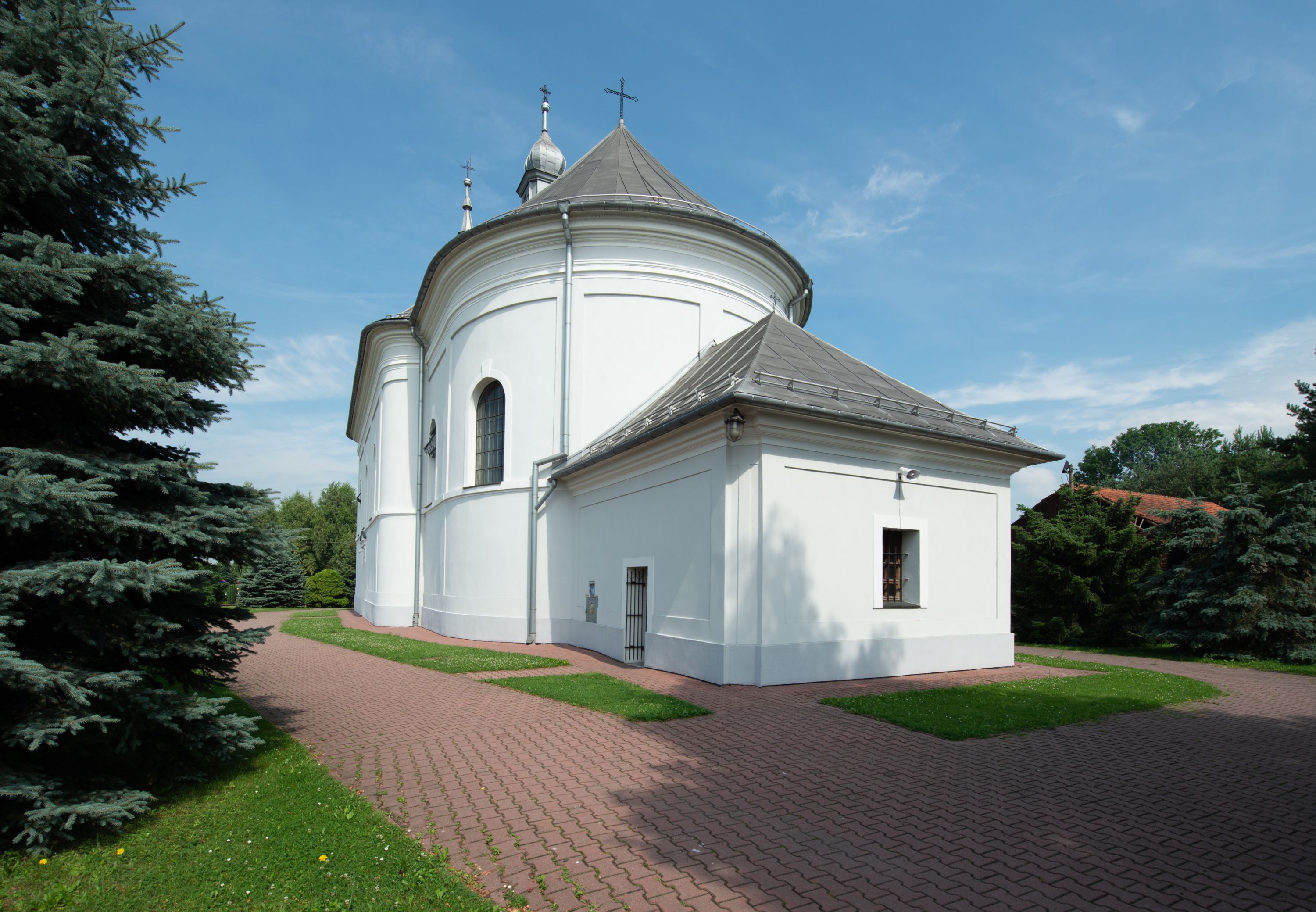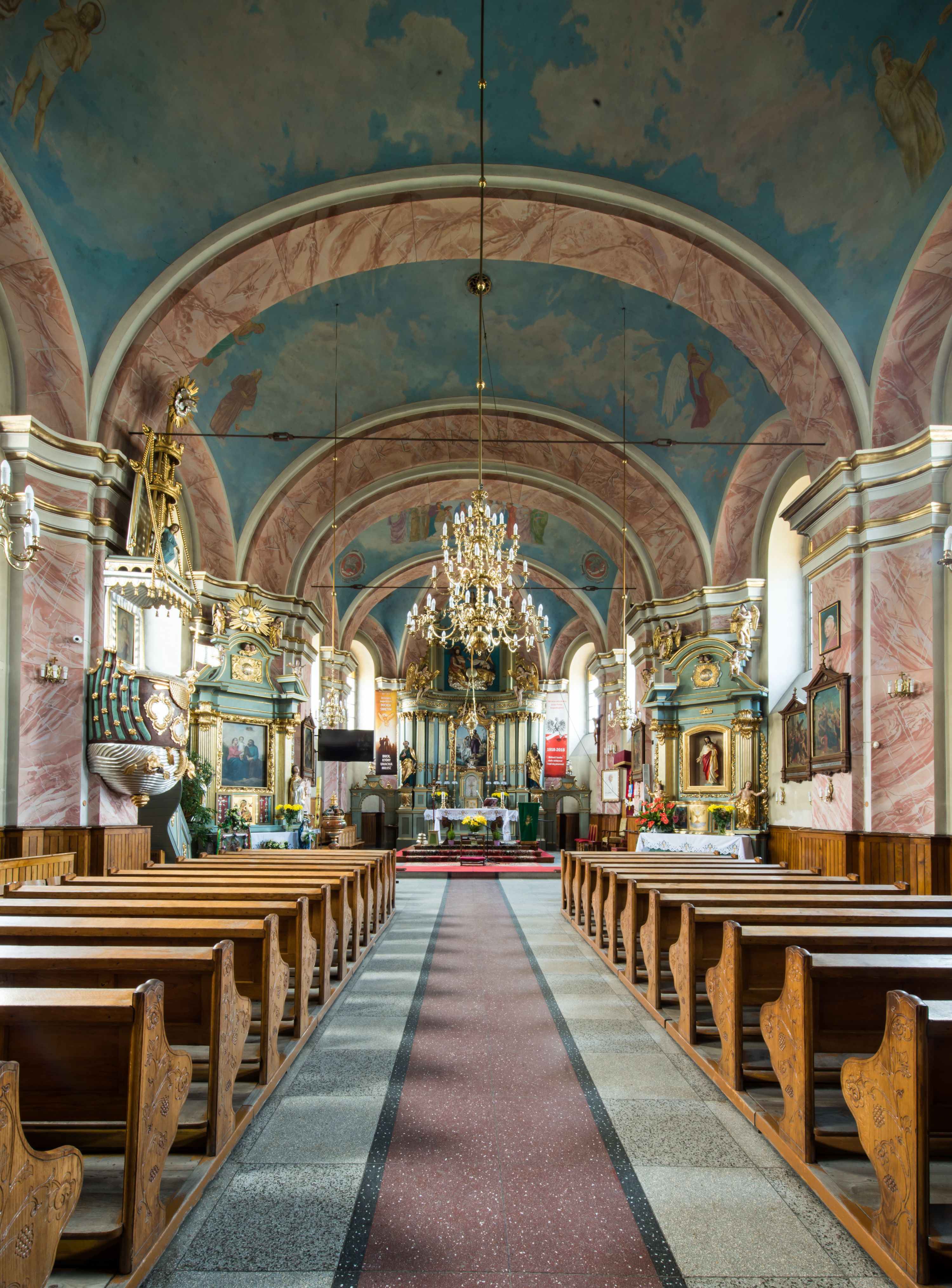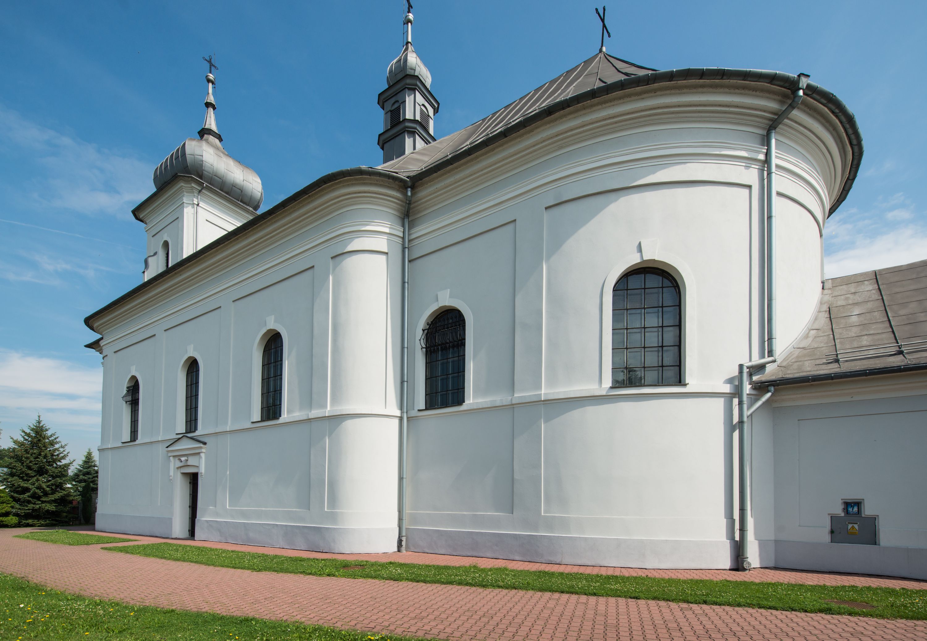 Murowany kościół otrzymał układ jednonawowej świątyni z węższym prezbiterium zwróconym ku północy i wieżą dostawioną do nawy od południa. Prezbiterium jest jednoprzęsłowe zakończone spłaszczoną apsydą. Na jego przedłużeniu usytuowano czworoboczną zakrystię. Prostokątna nawa jest trójprzęsłowa o zaokrąglonych narożnikach. Od frontu wzniesiono czworoboczną wieżę o ściętych narożnikach, flankowaną piętrowymi lokalnościami. Wysunięto ją lekko ku przodowi, gdzie przechodzi wklęsłymi płaszczyznami w boczne części fasady. Jej górne piętro nakryte cebulastym hełmem zostało opięte po bokach wolutami, obok których ustawiono kamienne klasycystyczne wazy. Elewacje zewnętrzne artykułowano podziałami ramowymi, zamykając wysokości ścian gzymsem gurtowy. Na końcu nawy na siodłowym dachu pokrytym blachą umieszczono czworoboczną wieżyczkę na sygnaturkę zwieńczoną cebulastym hełmem z krzyżem. Podobnym dachem nakryto prezbiterium. Wnętrze kościoła zostało rozczłonkowane lizenami z wklęsłymi półlizenami po bokach, ponad którymi rozciągnięto odcinki belkowania. Całość nakryto sklepieniem żaglastym na zdwojonych gurtach. Od południa w nawie urządzono chór muzyczny wsparty na dwóch kolumnach z parapetem wklęsłowypukłym. W prezbiterium usytuowano ołtarz główny, a w nawie dwa ołtarze boczne. Tu także na ścianie zachodniej zawieszono ambonę.
