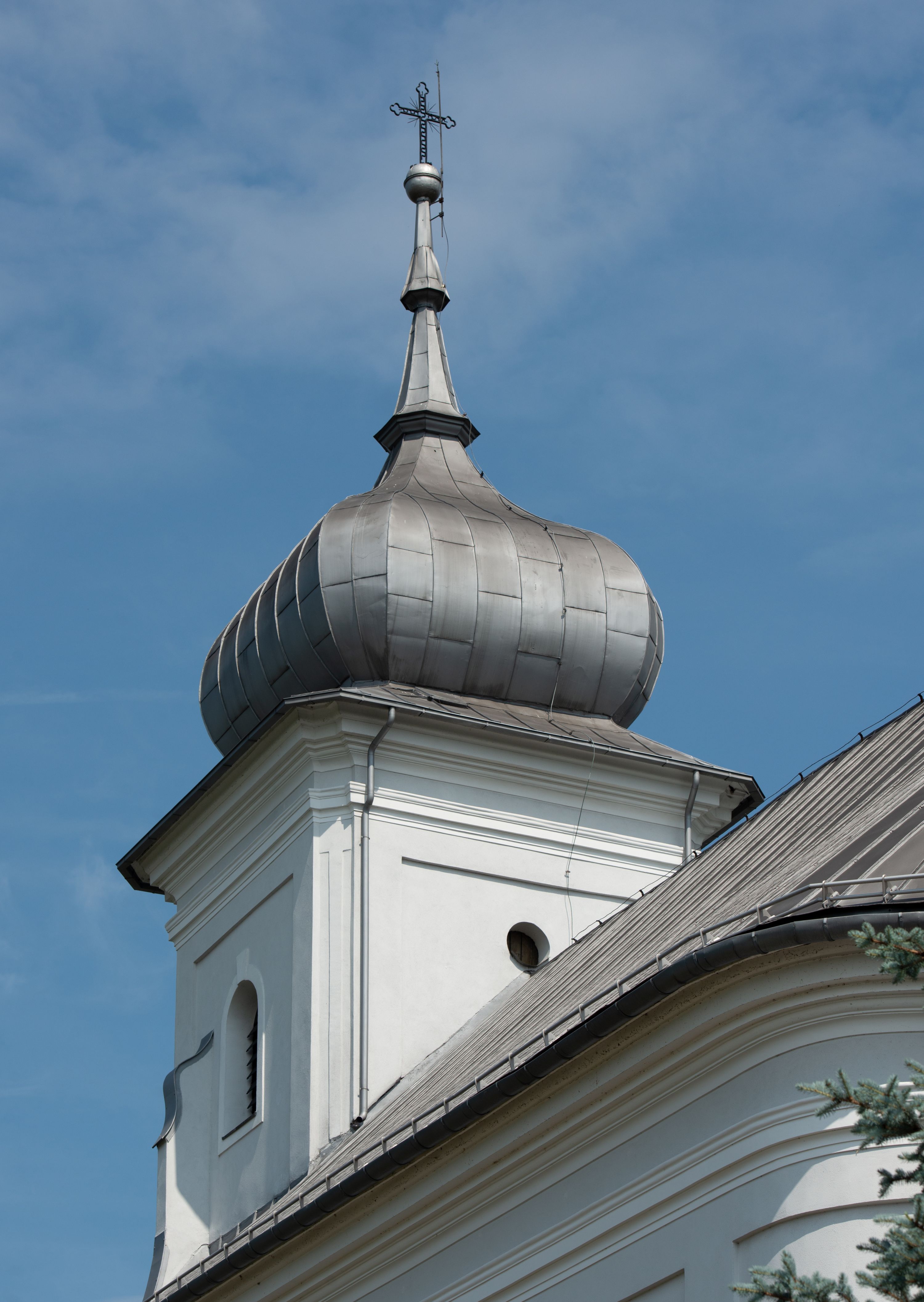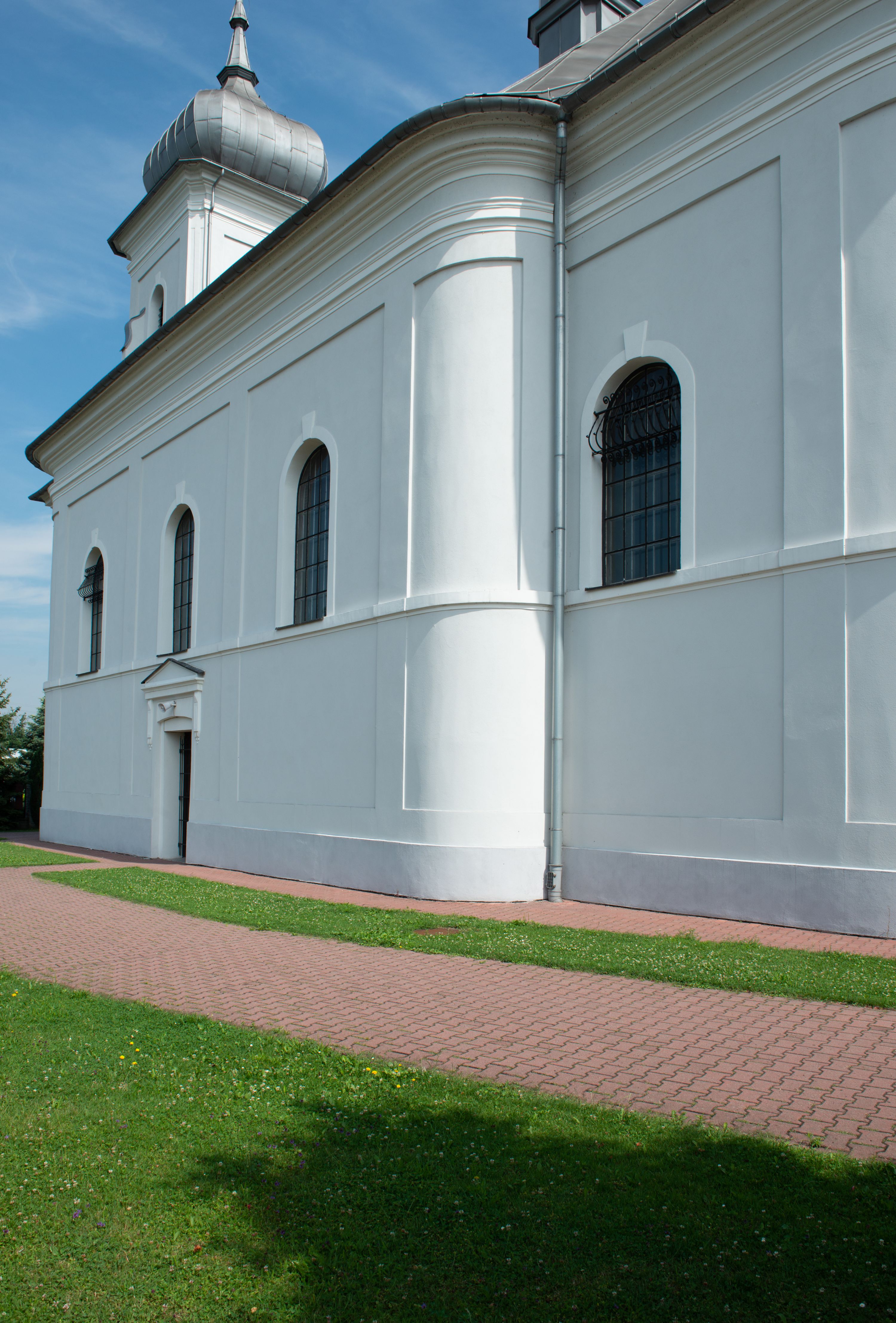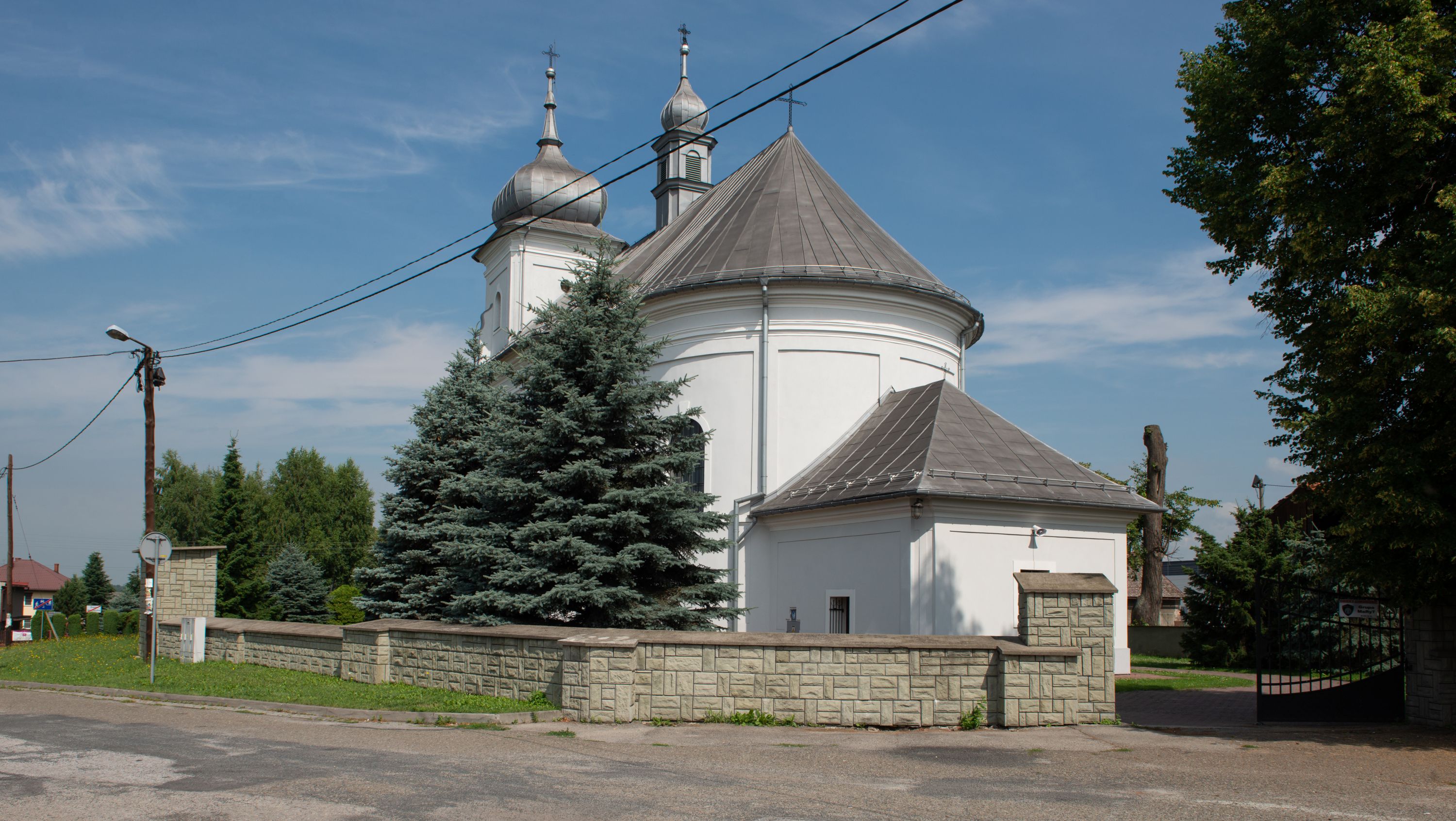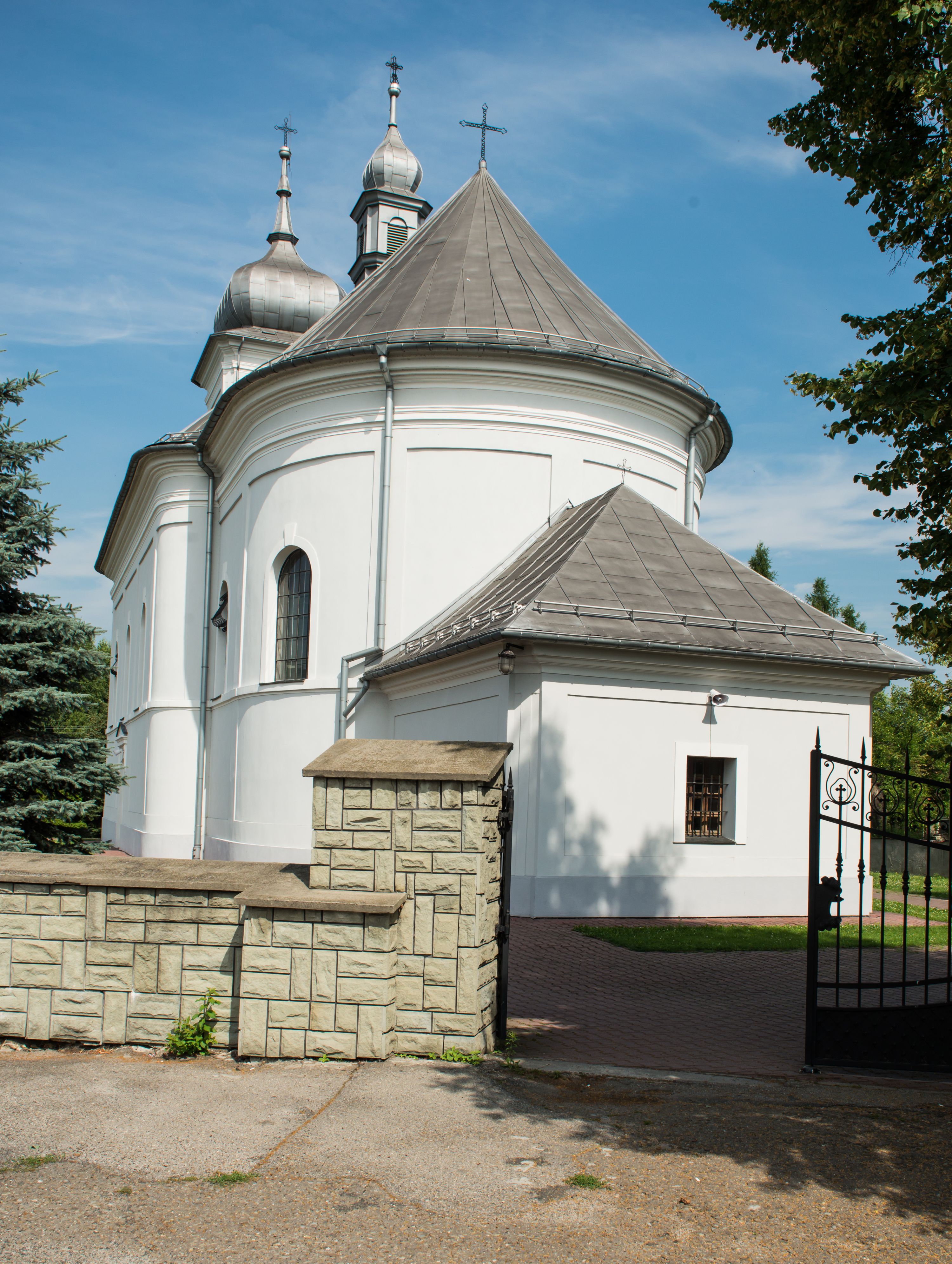 Murowany kościół otrzymał układ jednonawowej świątyni z węższym prezbiterium zwróconym ku północy i wieżą dostawioną do nawy od południa. Prezbiterium jest jednoprzęsłowe zakończone spłaszczoną apsydą. Na jego przedłużeniu usytuowano czworoboczną zakrystię. Prostokątna nawa jest trójprzęsłowa o zaokrąglonych narożnikach. Od frontu wzniesiono czworoboczną wieżę o ściętych narożnikach, flankowaną piętrowymi lokalnościami. Wysunięto ją lekko ku przodowi, gdzie przechodzi wklęsłymi płaszczyznami w boczne części fasady. Jej górne piętro nakryte cebulastym hełmem zostało opięte po bokach wolutami, obok których ustawiono kamienne klasycystyczne wazy. Elewacje zewnętrzne artykułowano podziałami ramowymi, zamykając wysokości ścian gzymsem gurtowy. Na końcu nawy na siodłowym dachu pokrytym blachą umieszczono czworoboczną wieżyczkę na sygnaturkę zwieńczoną cebulastym hełmem z krzyżem. Podobnym dachem nakryto prezbiterium. Wnętrze kościoła zostało rozczłonkowane lizenami z wklęsłymi półlizenami po bokach, ponad którymi rozciągnięto odcinki belkowania. Całość nakryto sklepieniem żaglastym na zdwojonych gurtach. Od południa w nawie urządzono chór muzyczny wsparty na dwóch kolumnach z parapetem wklęsłowypukłym. W prezbiterium usytuowano ołtarz główny, a w nawie dwa ołtarze boczne. Tu także na ścianie zachodniej zawieszono ambonę.