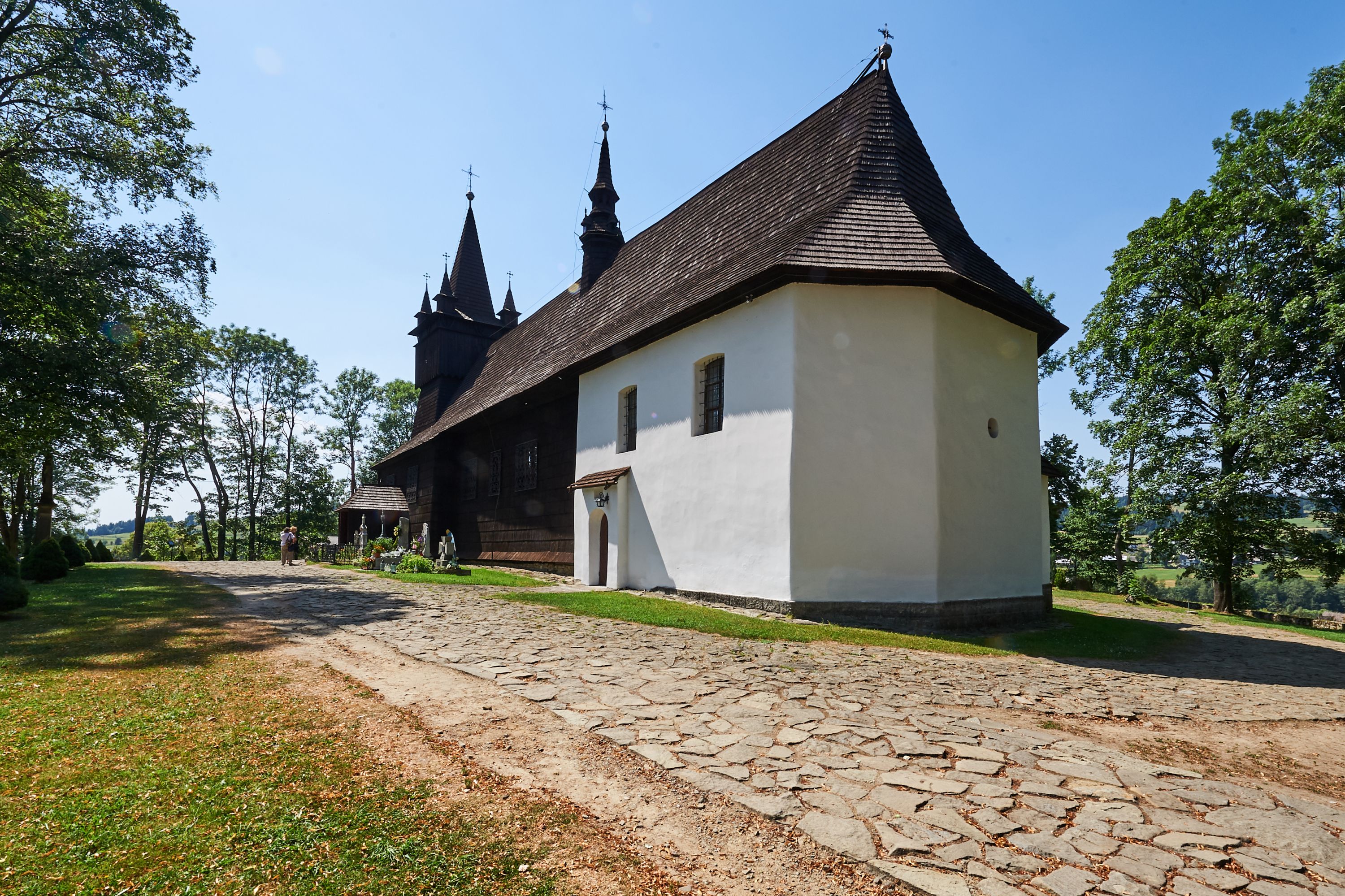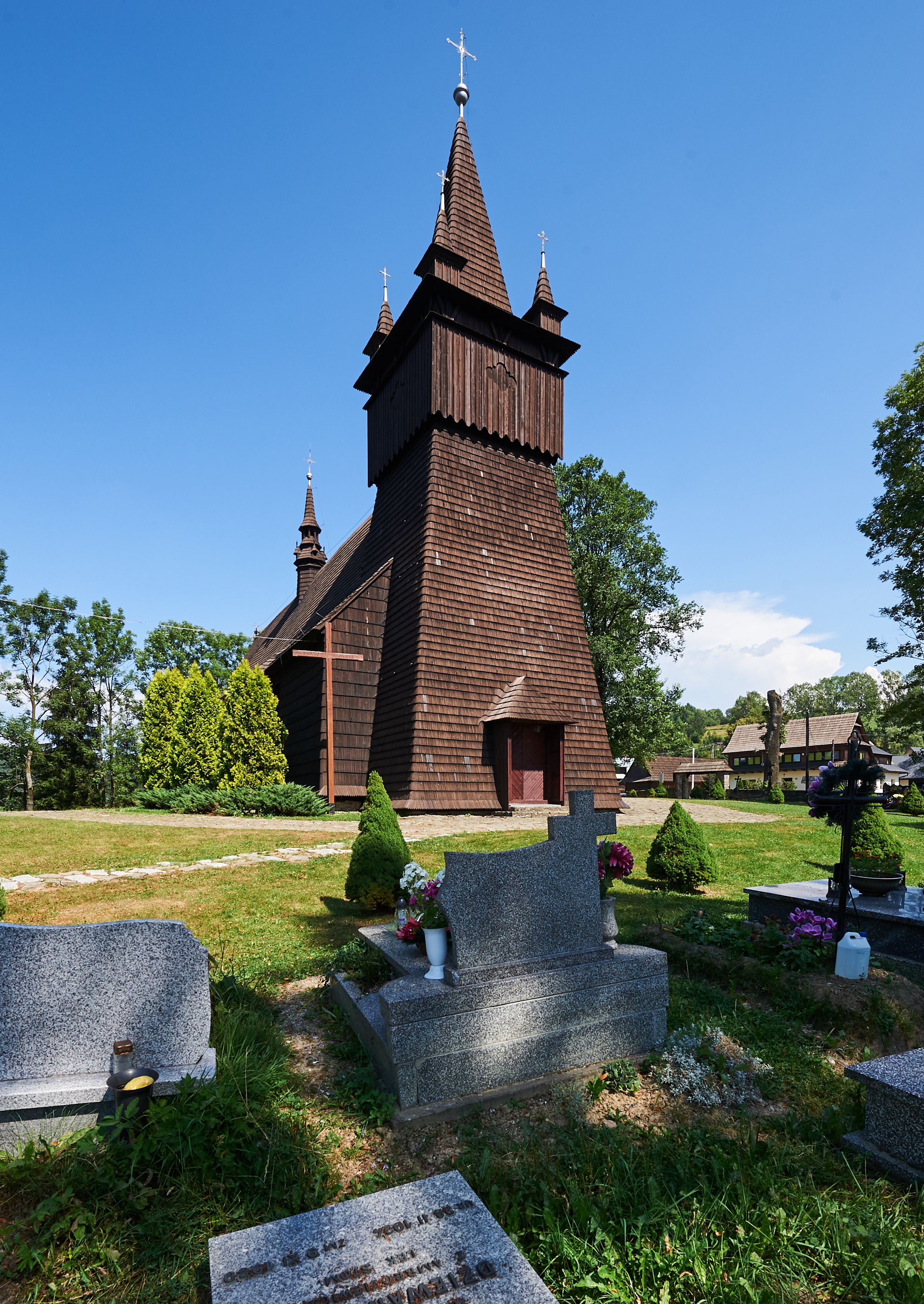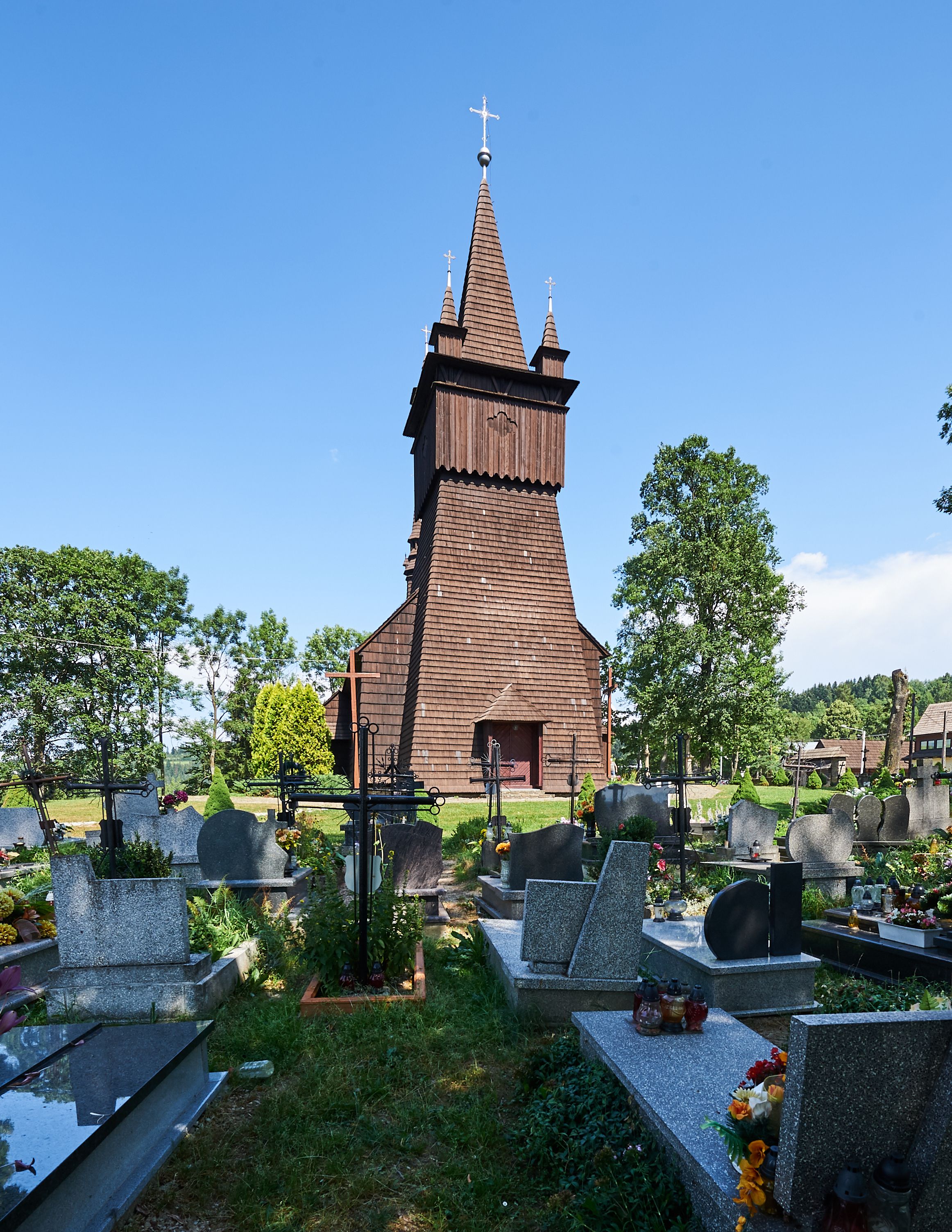 Na zewnątrz ściany świątyni obite gontem z wyjątkiem murowanej kaplicy Matki Boskiej Bolesnej, która została otynkowana. Wieża częściowo wtopiona w korpus, częściowo wysunięta ryzalitycznie; w przyziemiu babiniec. Wieża wzniesiona w konstrukcji słupowo-ramowej, główne narożne słupy nośne pochylone, wzmocnione tzw. krzyżami św. Andrzeja. Wieża zwieńczona jest nadwieszoną izbicą, szalowaną deskami w układzie pionowym z listwowaniem z czterolistnymi okienkami. Wyżej ostrosłupowy hełm z czterema narożnymi wieżyczkami. Kościół nakryty gontem w postaci długiego, kalenicowego dachu o rozległych połaciach, otulonym płaszczem gontowym z szerokim, załamanym okapem. Na wspólnym dachu kościoła i kaplicy nowa wieżyczka na sygnaturkę.