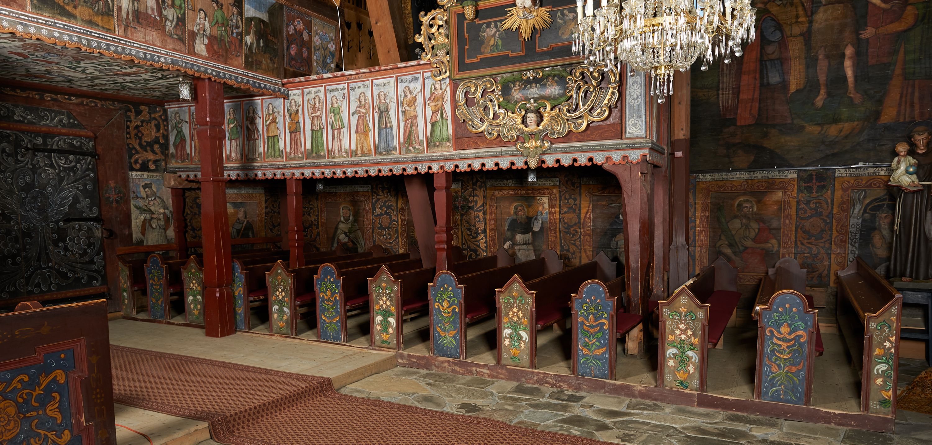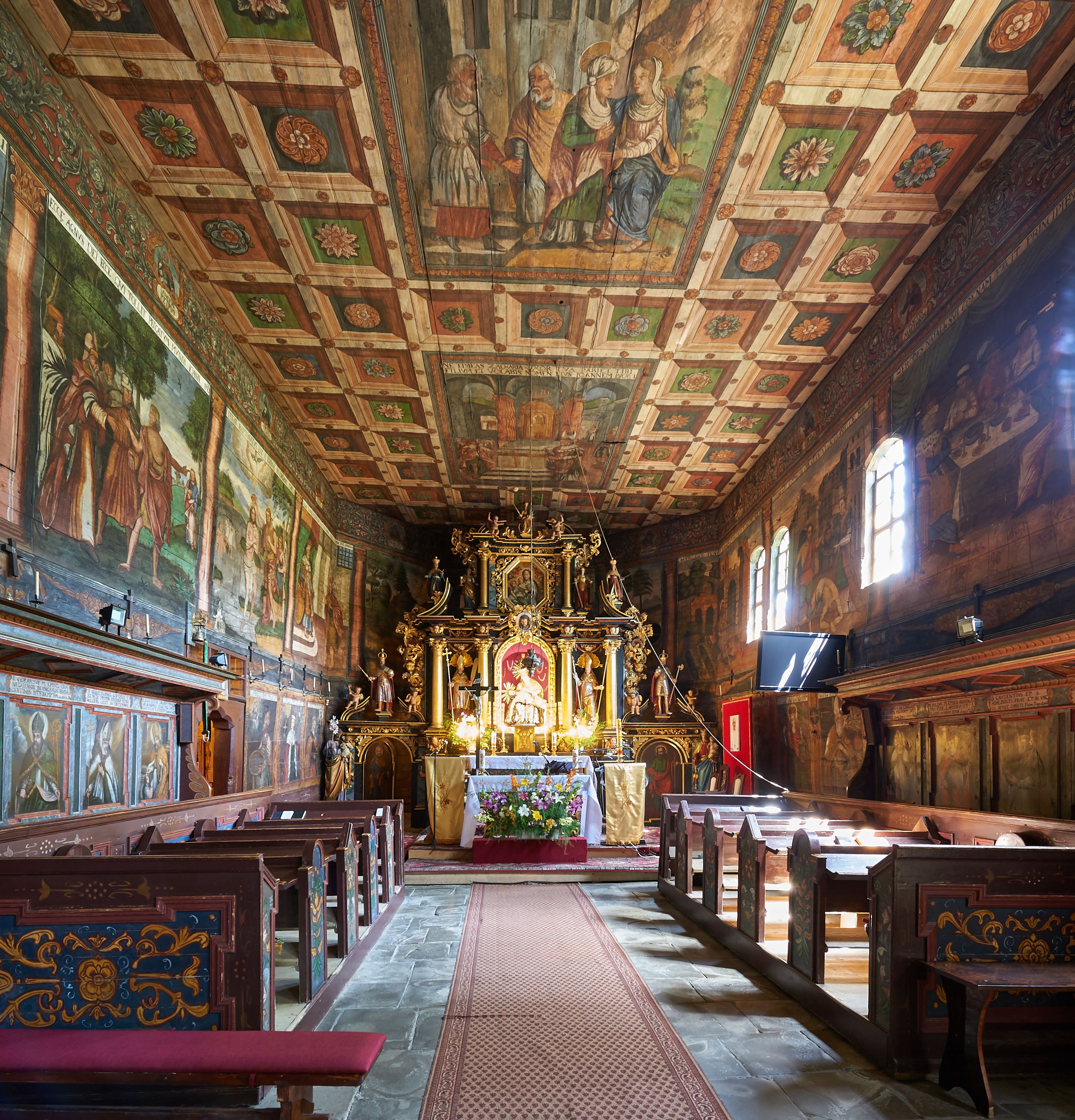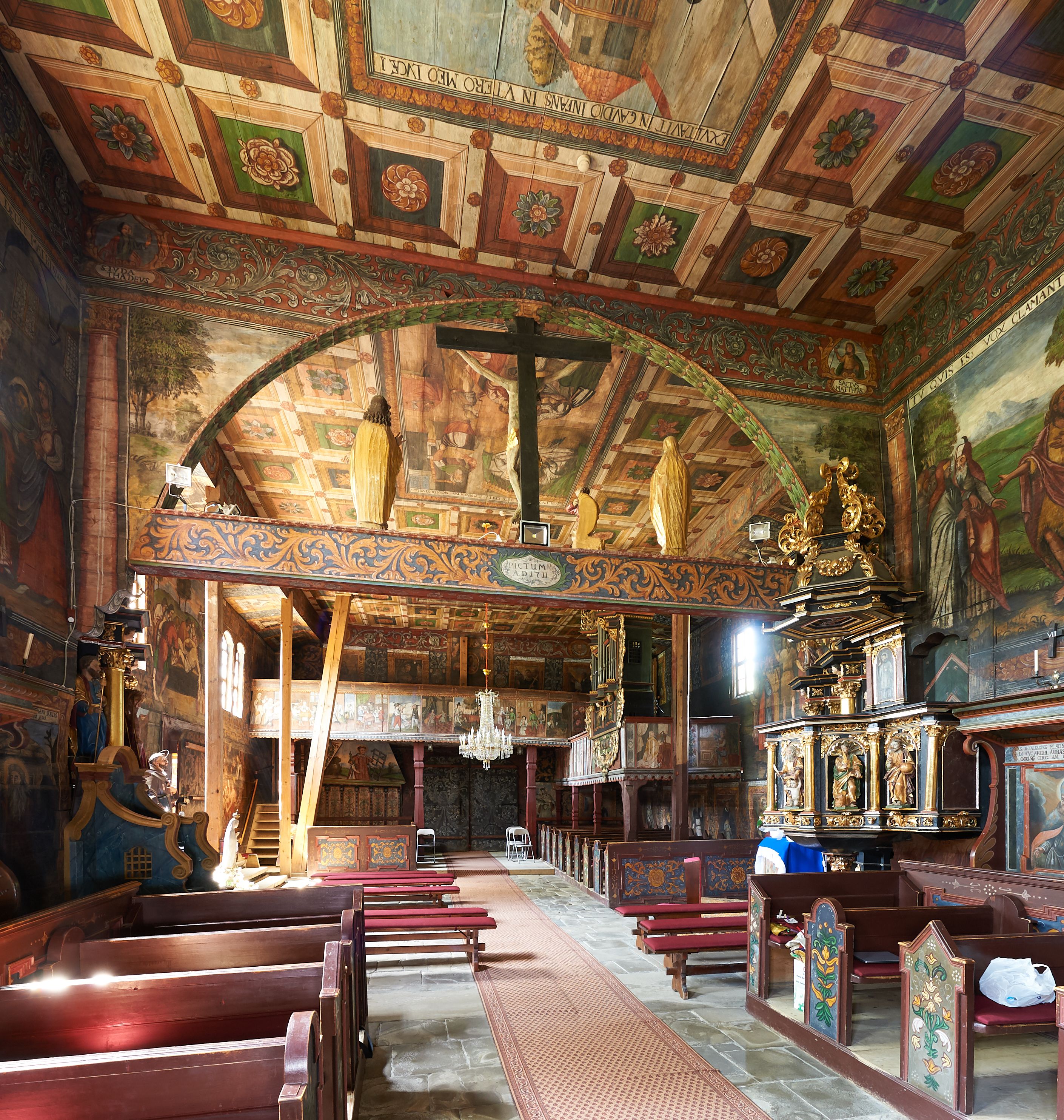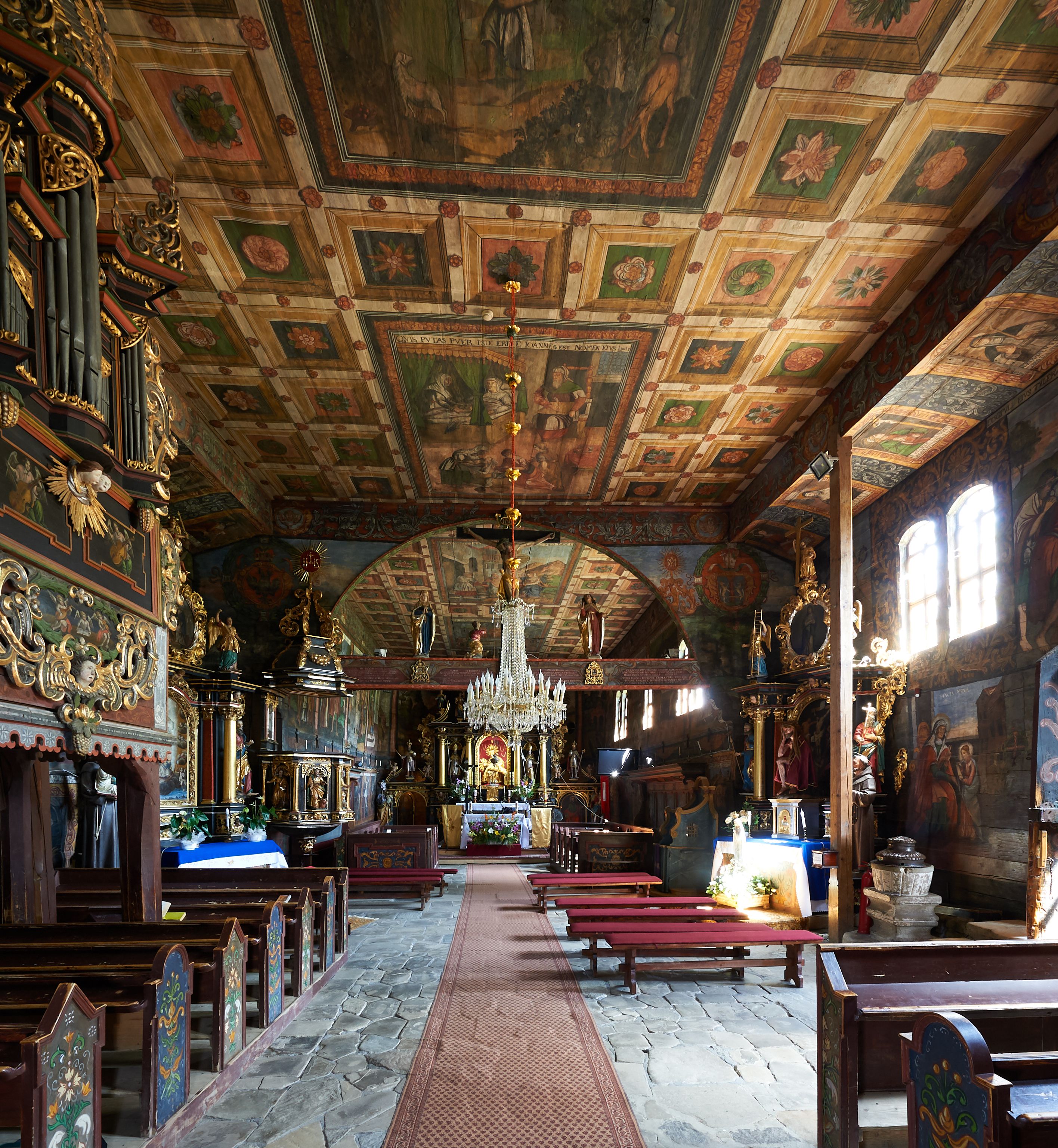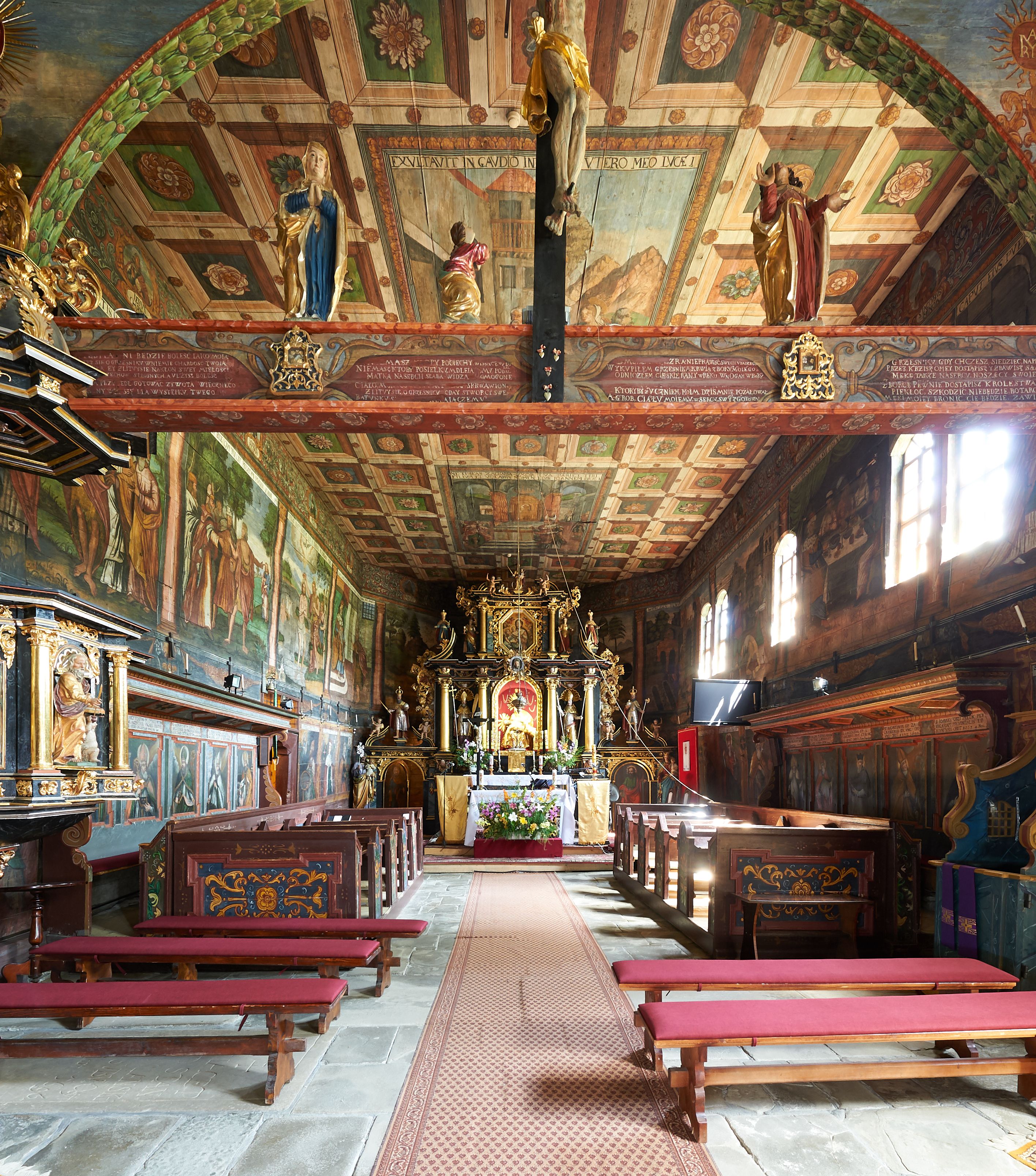 Wnętrze kościoła nakrywają stropy drewniane, płaskie, w nawie z zaskrzynieniami, podpartymi słupami. Zaskrzynienia w nawie obite są deskami dekorowanymi polichromią. W kaplicy Matki Boskiej Bolesnej sklepienie kolebkowe z lunetami. Ściana arkady tęczowej zamknięta jest łukiem półkolistym, na belce tęczowej umieszczona jest Grupa Ukrzyżowania. Przy nawie od południa dobudowana jest nowsza, drewniana kruchta. Chór muzyczny wsparty na dwóch profilowanych słupach z nim złączony chórek boczny przy północnej ścianie nawy. Otwory okienne usytuowane wyłącznie od strony południowej w kształcie stojących prostokątów, zamknięte półkoliście.