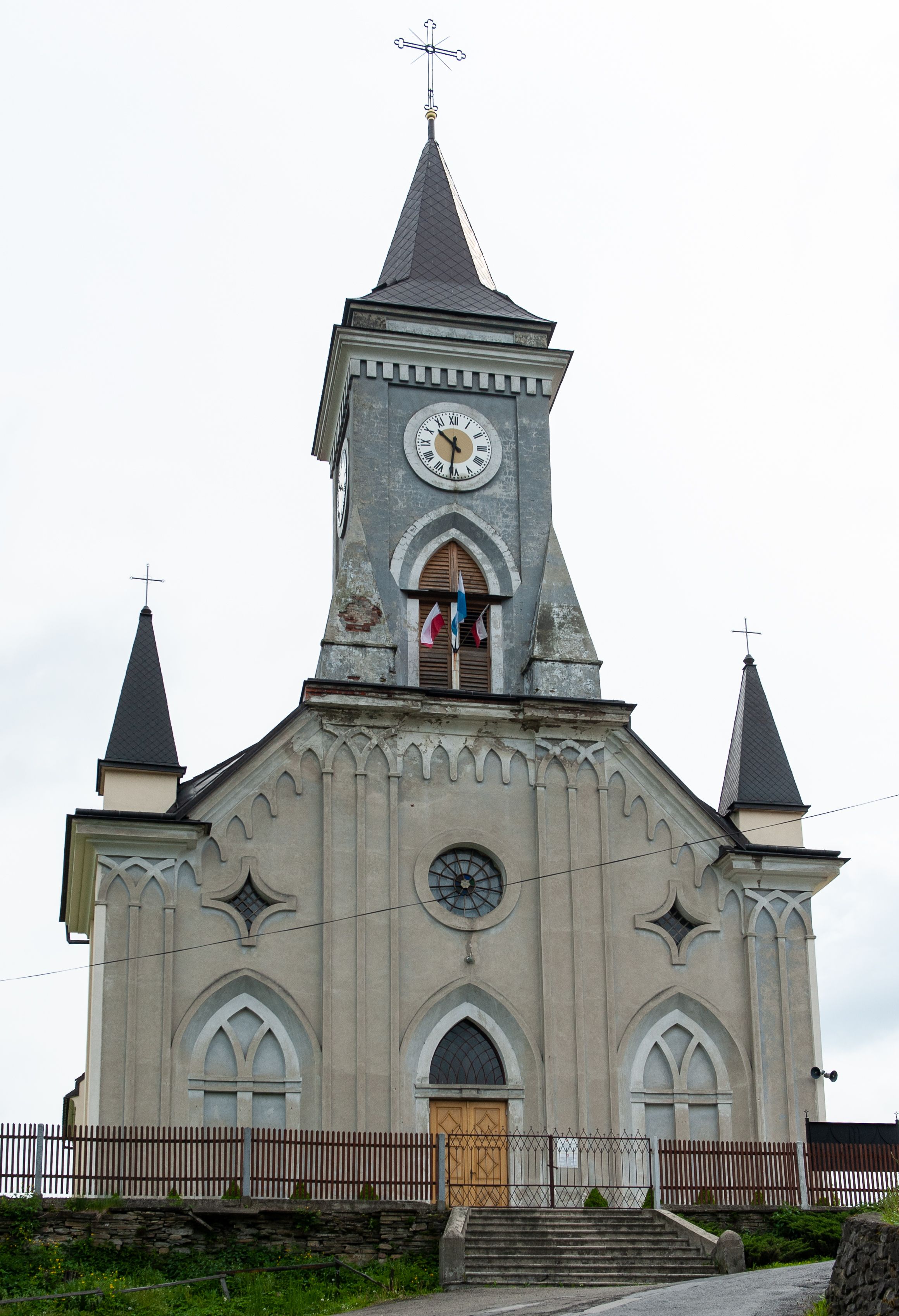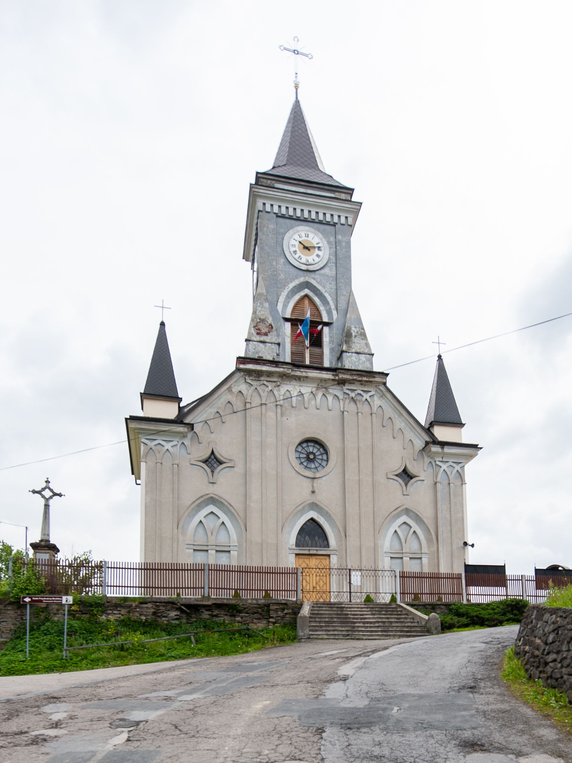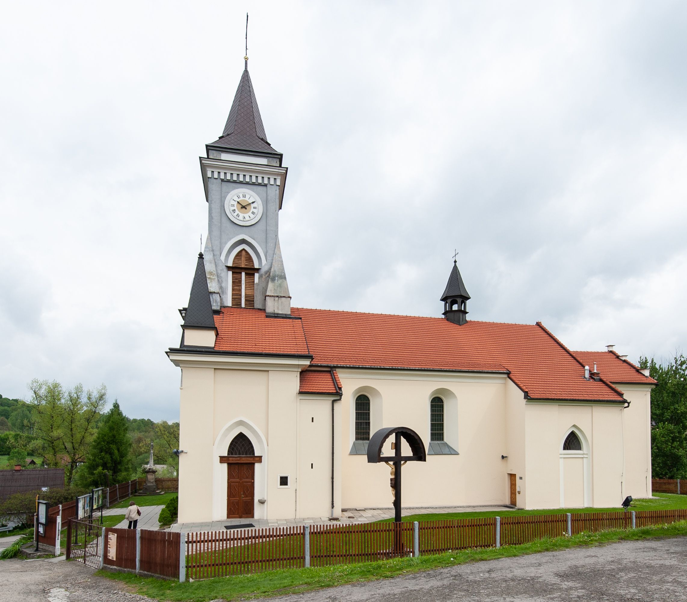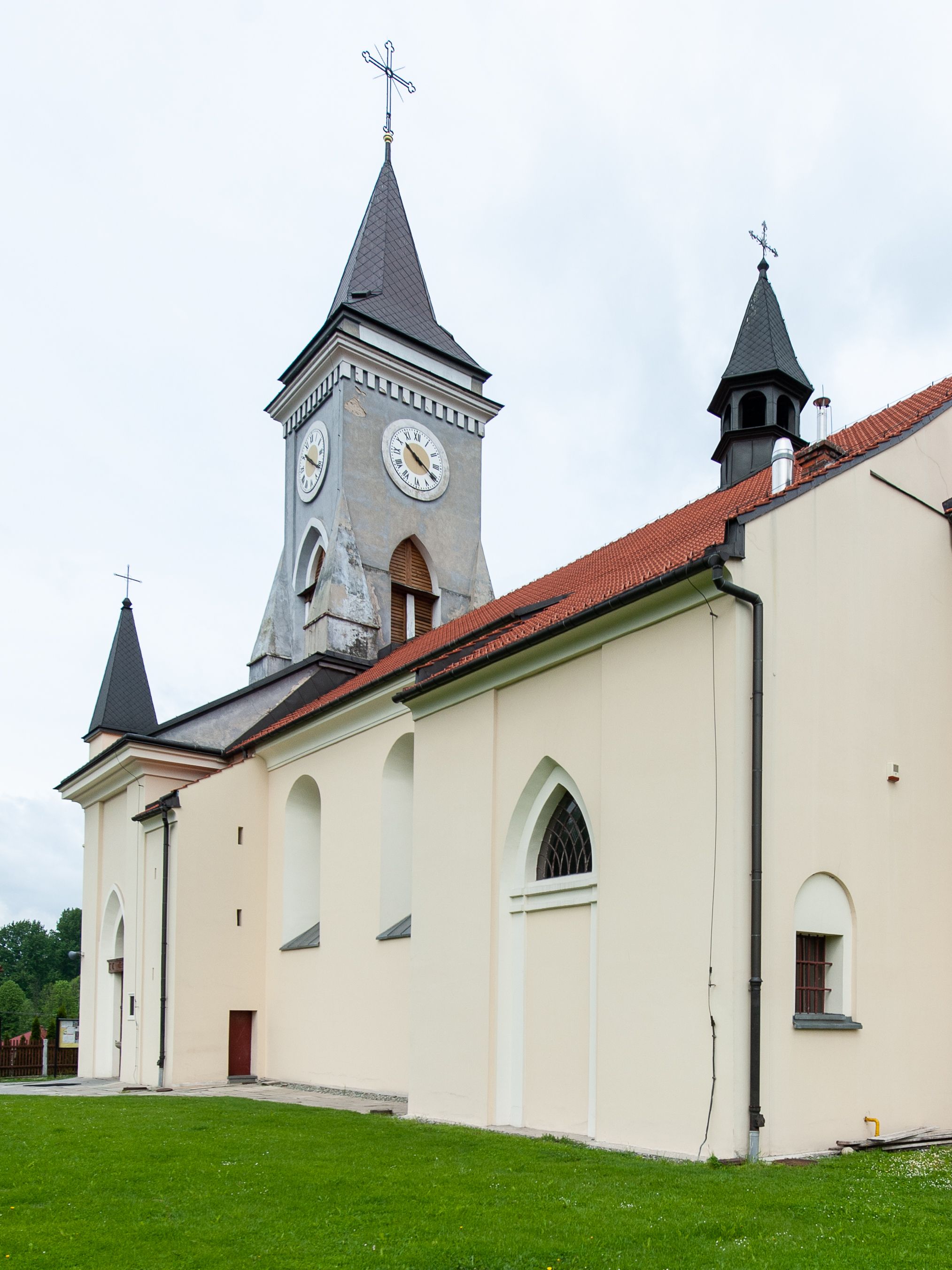 Elewacje gładkie, tynkowane zakończone profilowanym gzymsem. Wyodrębnione aneksy elewacji bocznych ujęte grubymi lizenami, z ostrołukowymi arkadami w polu, ujętymi opaskami tynkowymi. Od strony fasady w partiach aneksów bocznych wejścia do kościoła, od strony prezbiterium ostrołukowe okienka. Na każdej elewacji bocznej po trzy okna w formie stojącego prostokąta zamkniętego łukiem półkolistym, o szerokich rozglifieniach, po dwa w nawie i jednym w prezbiterium. Elewacja zamykająca prezbiterium trójosiowa, wydzielona lizenami, z głębokimi wnękami w formie stojącego prostokąta zamkniętego łukiem półkolistym, z namalowanym wizerunkiem Ukrzyżowanego Chrystusa i dwóch łotrów na krzyżach. Elewacja zakończona profilowanym gzymsem, z daszkiem pulpitowym oraz trójkątnym szczytem z czterema cokołami. Nawa i prezbiterium nakryte osobnymi dachami dwuspadowymi. Na połączeniu nawy i aneksów przy prezbiterium wieżyczka na sygnaturkę z latarnią, nakryta dachem ostrosłupowym.