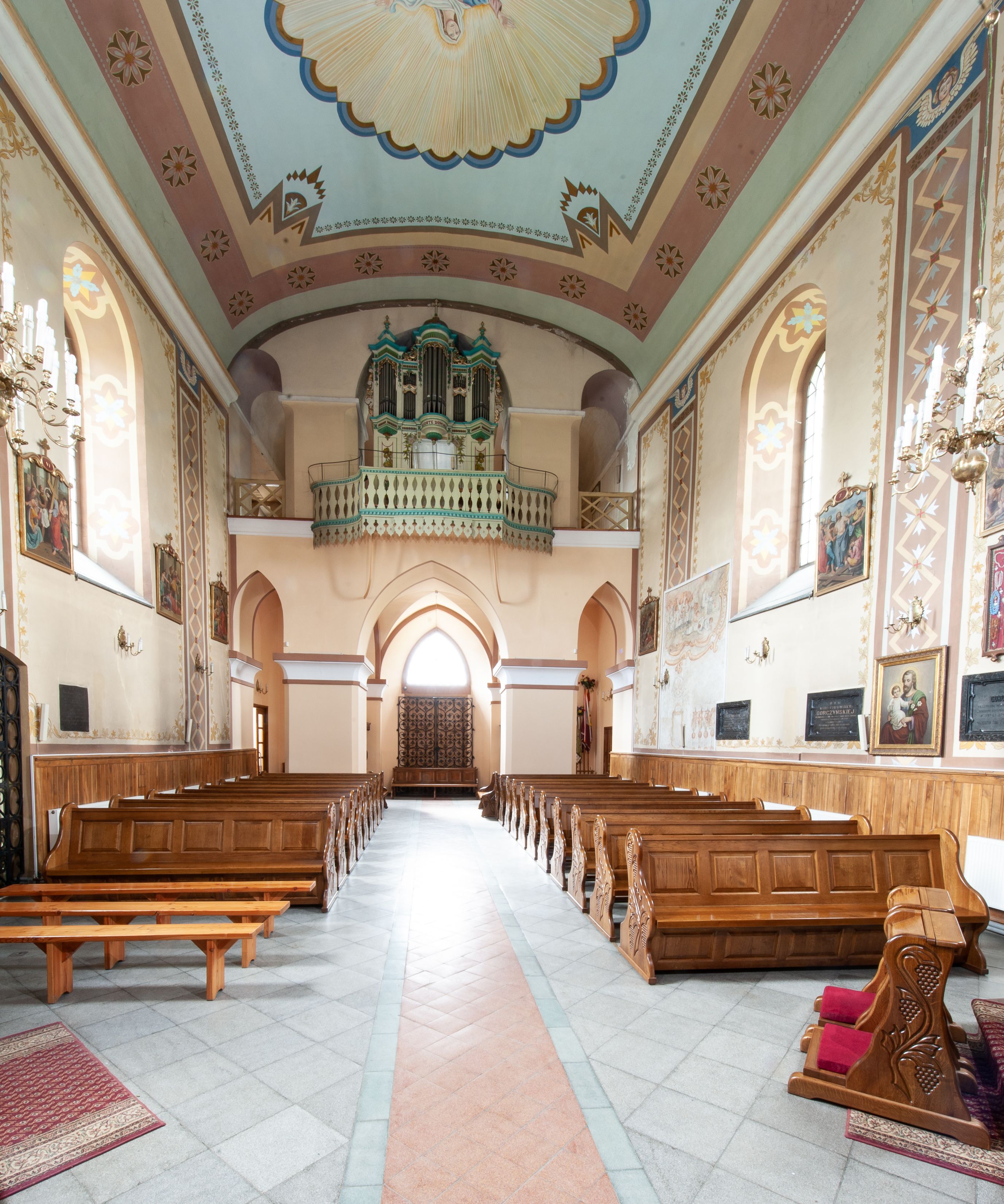 Kościół murowany, tynkowany, jednonawowy. Prezbiterium prostokątne, zamknięte prosto, z obu stron przy nawie prostokątne, piętrowe lokalności (zakrystia i skarbiec, empory). Nawa szersza od prezbiterium, na rzucie prostokąta, od frontu przylega wieża na planie kwadratu z dwoma aneksami po bokach. Prezbiterium dwuprzęsłowe, podzielone wewnątrz pilastrami, sklepione żagielkowo na gurtach. Empory flankowane parami półkolumienek, z oknami w formie leżącego prostokąta zamkniętego łukiem odcinkowym, nad lewą herb Odrowąż z inicjałami „JG”. Nawa nakryta pozornym, spłaszczonym sklepieniem kolebkowym. Otwór tęczowy w formie półkolistej arkady wspartej na pilastrach, z belką o fantazyjnym kształcie. Chór muzyczny dwukondygnacyjny, wsparty na dwóch filarach i dwóch półfilarach, pomiędzy którymi arkady ostrołukowe, kondygnacja zamknięta profilowanym gzymsem. Druga kondygnacja z trzema arkadami, w środkowej organ z wklęsło-wypukłą, ażurową balustradą. Posadzka z płyt ceramicznych.