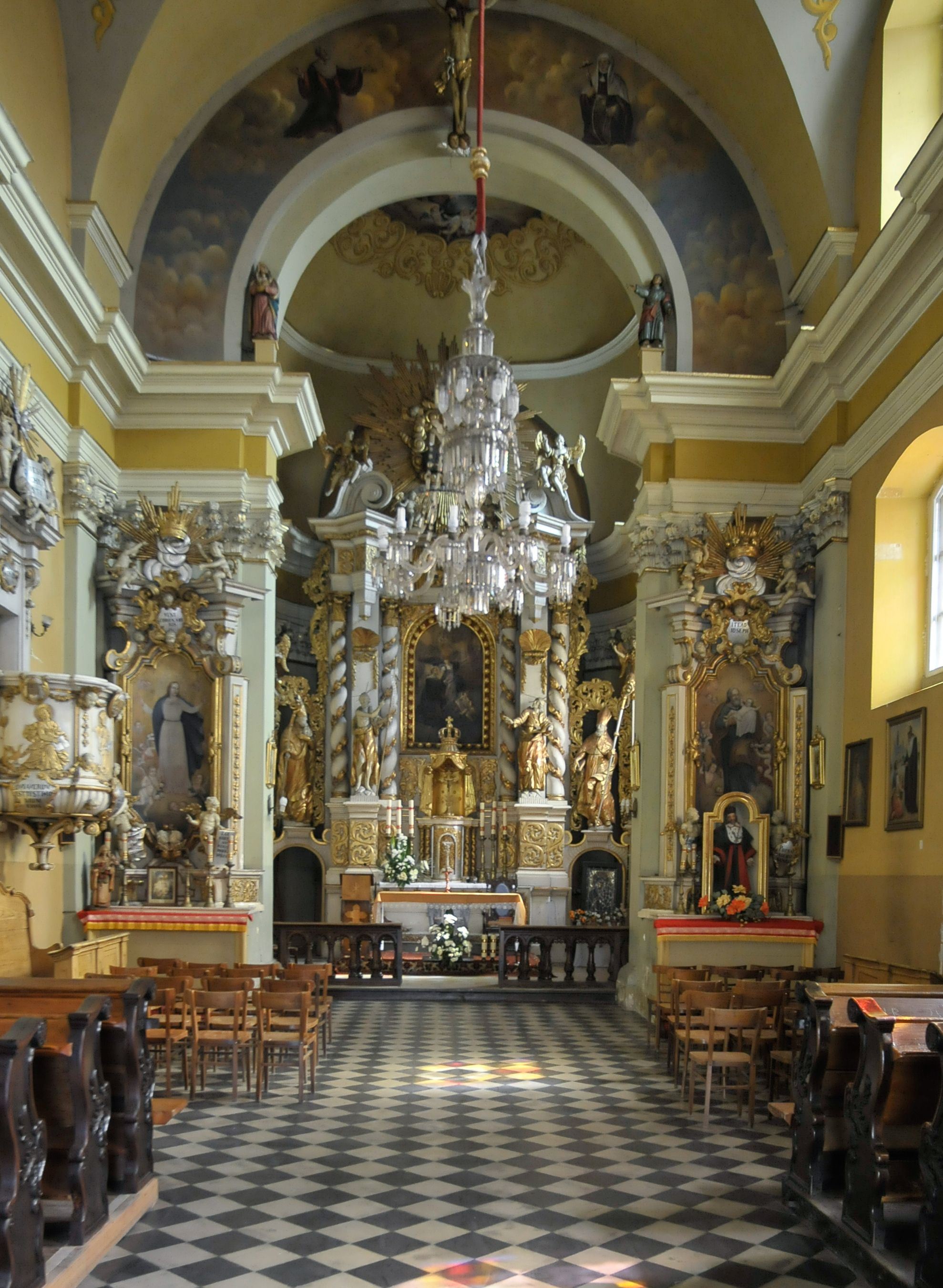 Kościół orientowany, jest budowlą murowaną z cegły i kamienia (grubość murów od 70 do 160 cm), na rzucie podłużnym (24 m długość, 8,5 m szerokość). Korpus jednonawowy, trójprzęsłowy, prezbiterium jednoprzęsłowe, zamknięte półkolistą absydą, z dwukondygnacyjną przyległością od północy (zakrystia w przyziemiu). Nawę i prezbiterium przekrywa sklepienie kolebkowe z gurtami wspartymi na parach pilastrów dźwigających wydatne, obiegające wnętrze belkowanie. Nawę od prezbiterium oddziela półkolista arkada łuku tęczowego. Wnętrze doświetlają dwa rzędy okien zamkniętych łukami odcinkowymi. Artykulację ścian na zewnątrz stanowią płyciny ujmujące pary okien. Trójosiową fasadę artykułują pary osadzonych na cokole pilastrów – po dwie po bokach i jedna w polu środkowym wspierające belkowanie. W osi środkowej jest umiejscowiony ujęty profilowanym obramieniem otwór wejściowy z dwuskrzydłowymi drzwiami. Wyżej jest płytka, prostokątna wnęka, u góry zaś okno zamknięte łukiem odcinkowym. W osiach bocznych na cokole fasady osadzona para niszy z rzeźbami św. Piotra po lewej stronie i św. Pawła po prawej. Kapitele pilastrów zdobione motywami festonów owocowo-kwiatowych.