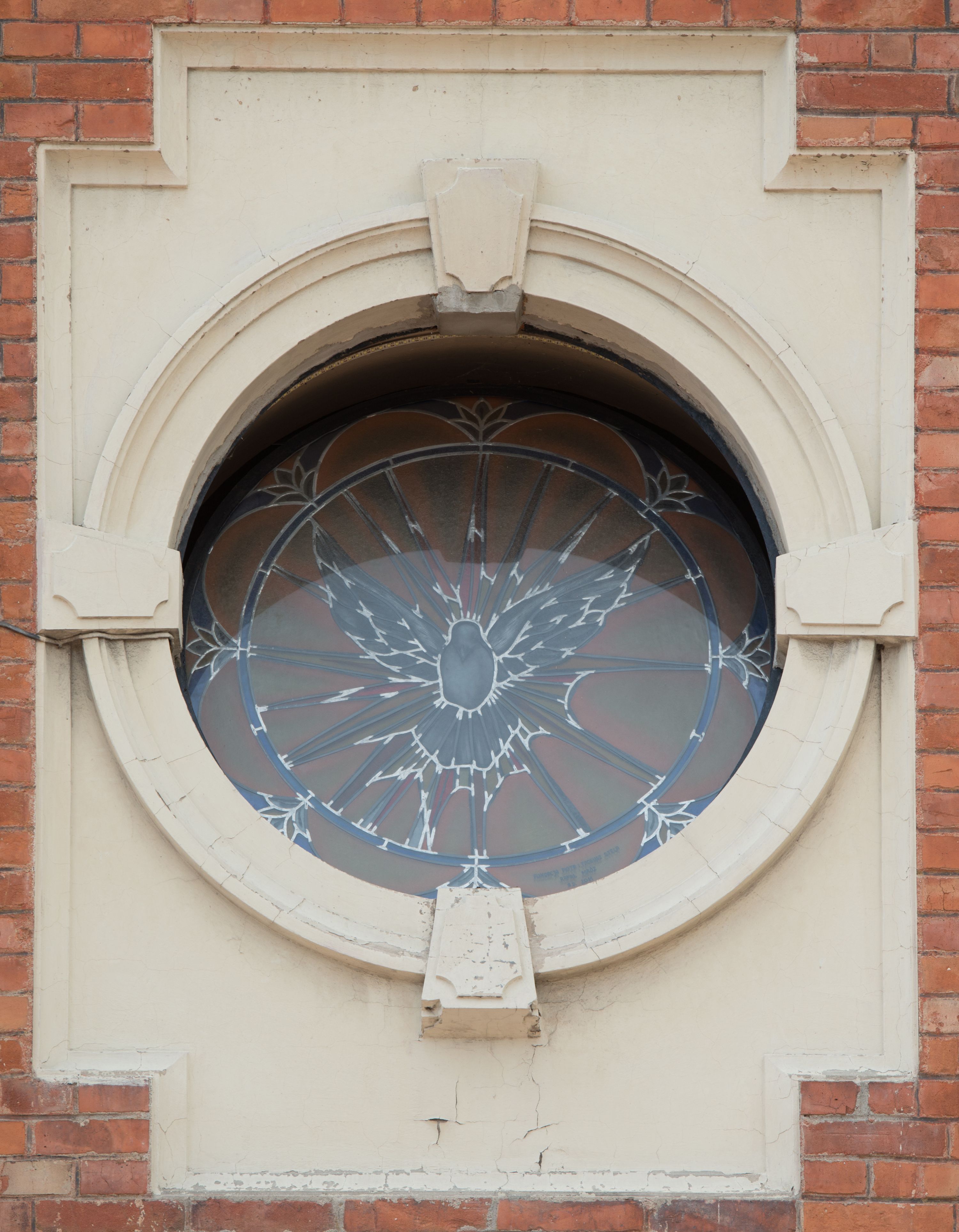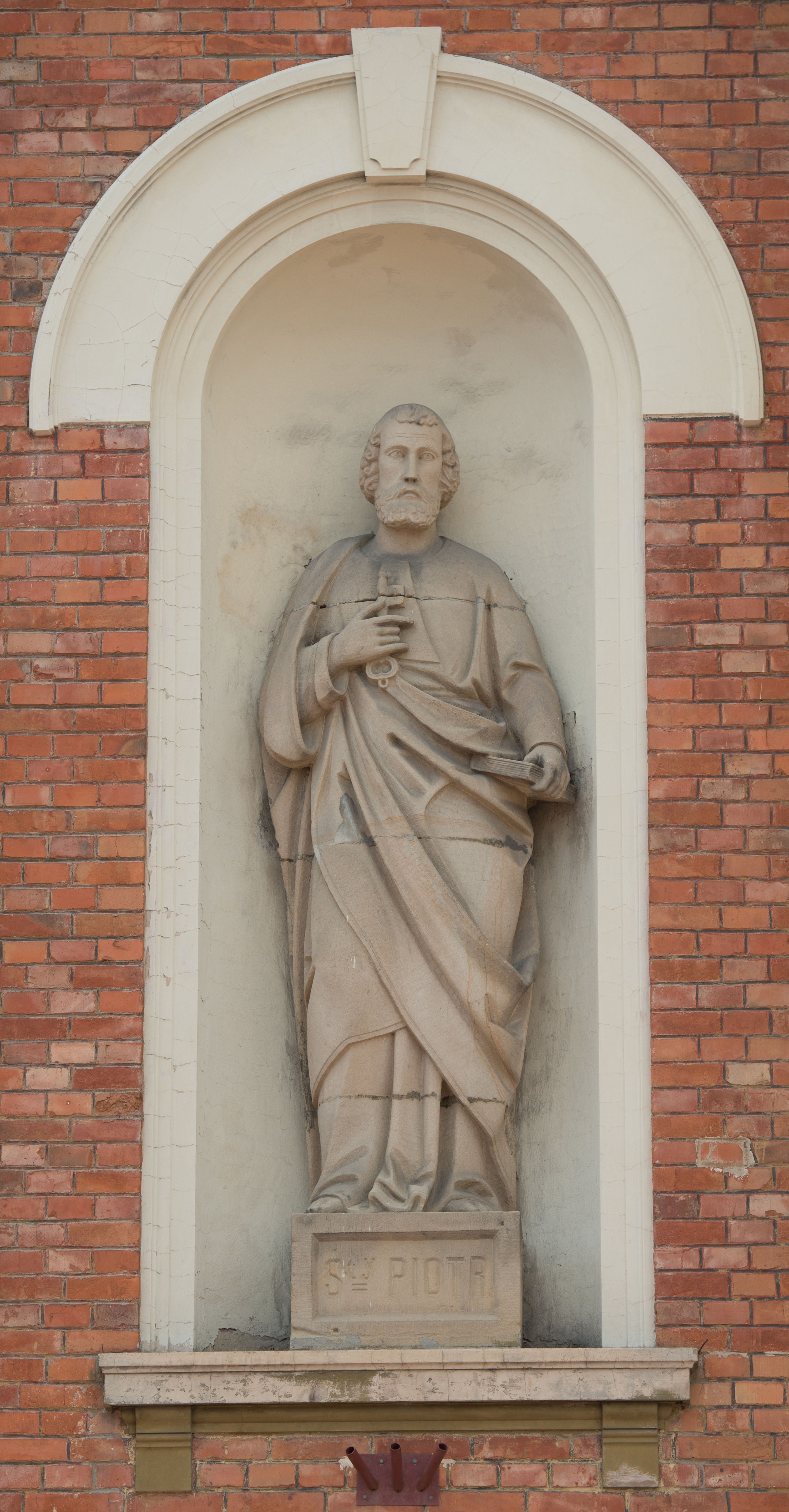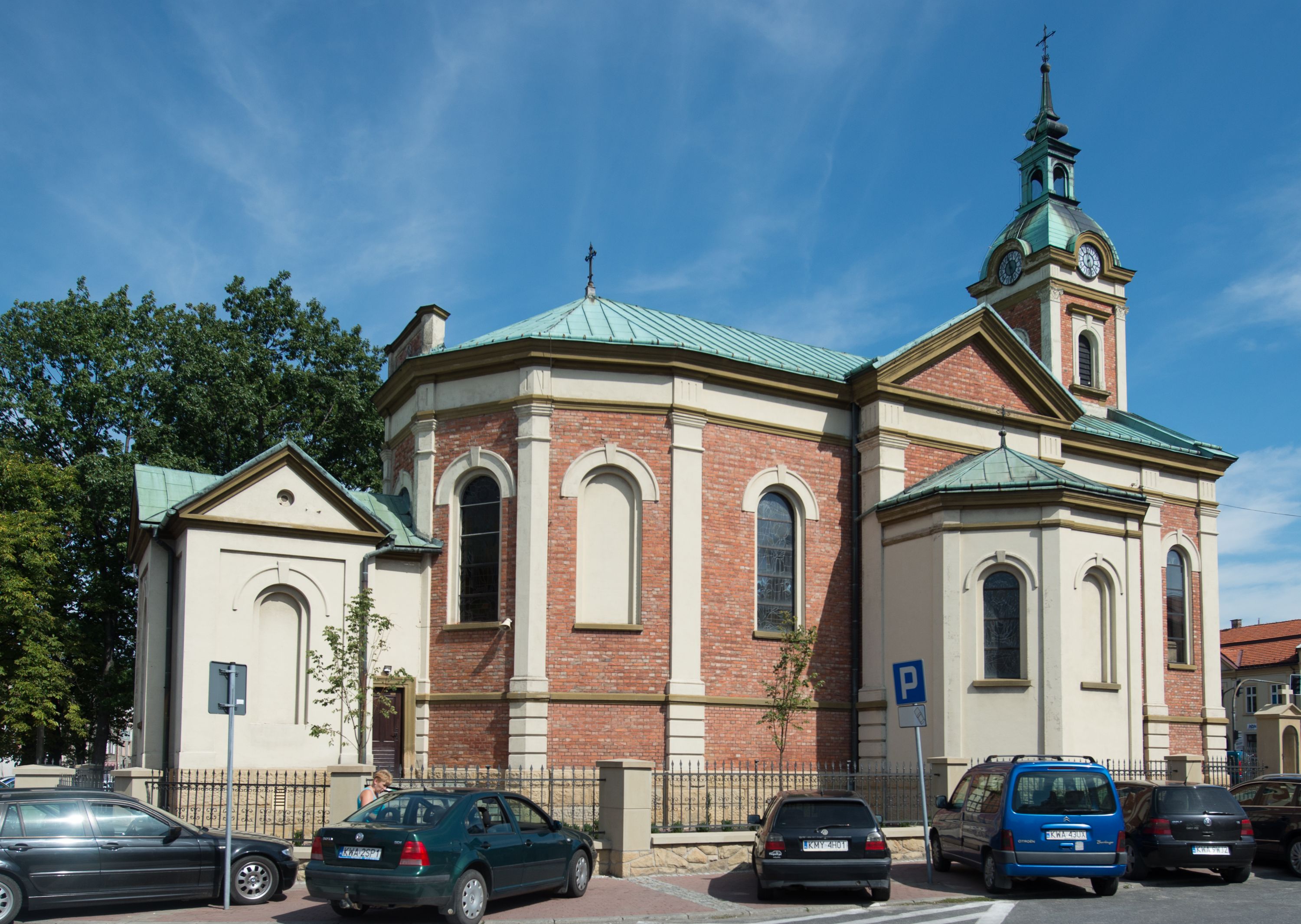 Kościół murowany, jednonawowy, z węższym prezbiterium zamkniętym trójbocznie oraz z wieżą wbudowaną w zachodnią fasadę. Do prezbiterium od północy przylega zakrystia, do nawy dwie kaplice leżące po przeciwległych stronach, zamknięte trójbocznie, od zachodu chór wsparty na dwóch filarach, z trójczęściową balustradą wychodzącą do przodu. Korpus trójprzęsłowy, przęsła oddzielone opilastrowanymi filarami podtrzymującymi arkady sklepienia. Nad kaplicami i prezbiterium fragmenty sklepienia gwiaździstego, nad nawą żaglaste. Wielobarwna polichromia ścian i sklepień wypełnia podziały wyznaczone przez elementy architektoniczne, opiera się na motywach geometrycznych, stylizowanych floralnych, zoomorficznych i postaciach aniołów i świętych . Wszystkie okna w kształcie stojącego prostokąta zamkniętego półkoliście, w większości witraże, dwa w prezbiterium, po trzy z każdej strony nawy, po dwa w kaplicach, dwa na wysokości chóru, cztery w kondygnacji wieży; wyjątek stanowi okulus w fasadzie. Główne wejście przez fasadę, kolejne do zakrystii. Fasada dwukondygnacyjna, trójosiowa, na cokole, z wieżą. Osie wydzielone pilastrami, z których środkowa mieści drzwi o wykroju prostokąta i okulus w czworobocznej płycinie, a boczne zamknięte konchowo nisze w figurami św. Piotra po lewej i św. Pawła po prawej stronie. Kondygnacja zamknięta zdwojonym przyczółkiem. Wewnętrzny przerwany na kartusz herbowy i okrągłą plakietę z krzyżem, zewnętrzny na kondygnację wieży. Wieża z każdej strony przepruta oknem zwieńczonym fragmentem gzymsu, na narożach ujęta pilastrami podtrzymującymi belkowanie z linią gzymsu wyoblającą się w środku i ujmującą tarczę zegara. Pozostałe elewacje na kamiennym cokole, nawa i prezbiterium z nietynkowanej cegły, kaplice i zakrystia otynkowane. Kontynuują podziały pilastrami, artykulację podkreślają okna. Dach nad nawą główną dwuspadowy, nad kaplicami i prezbiterium wieloboczne, wieża przekryta hełmem z latarnią, zwieńczona ostrosłupem z krzyżem.