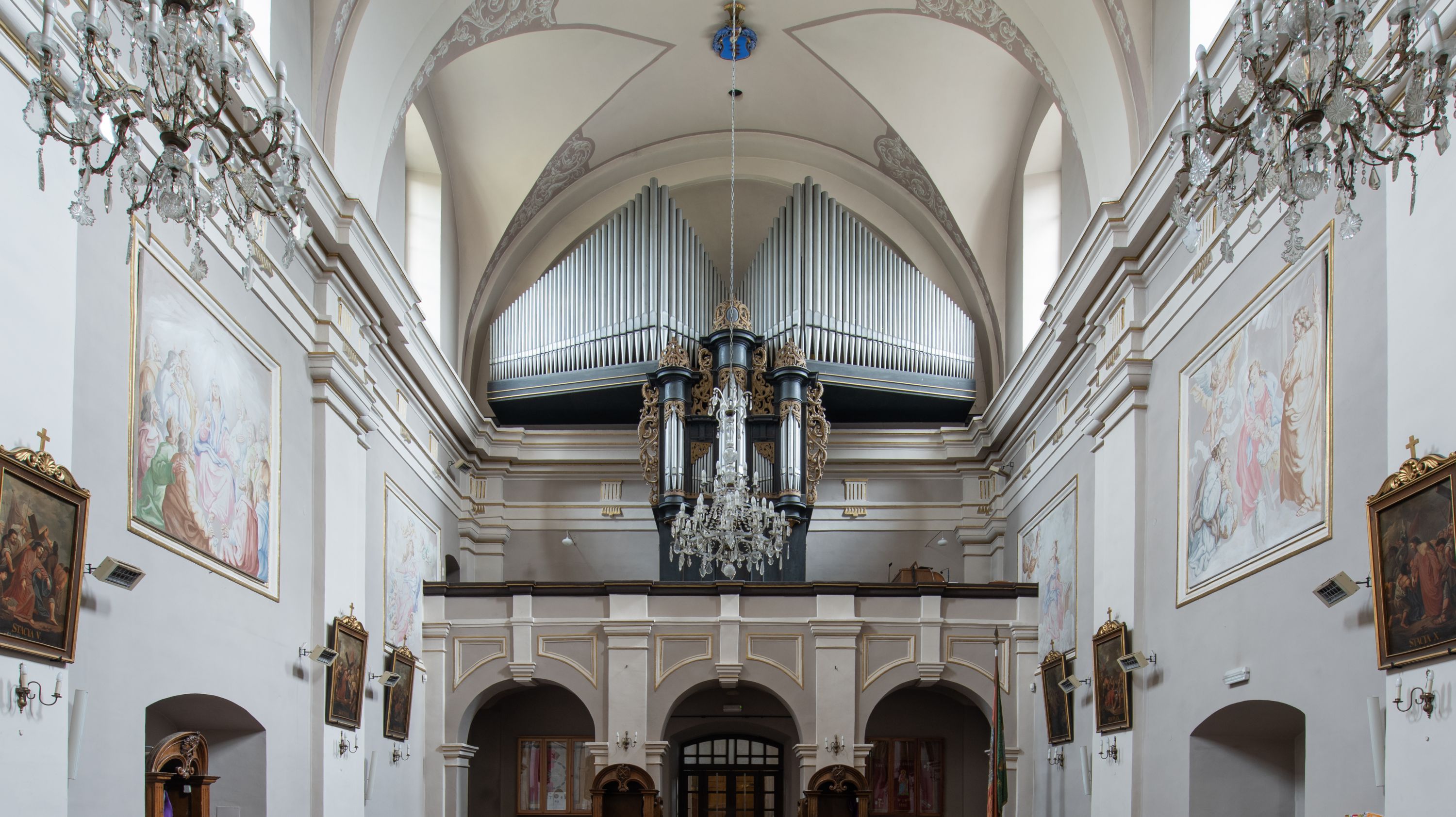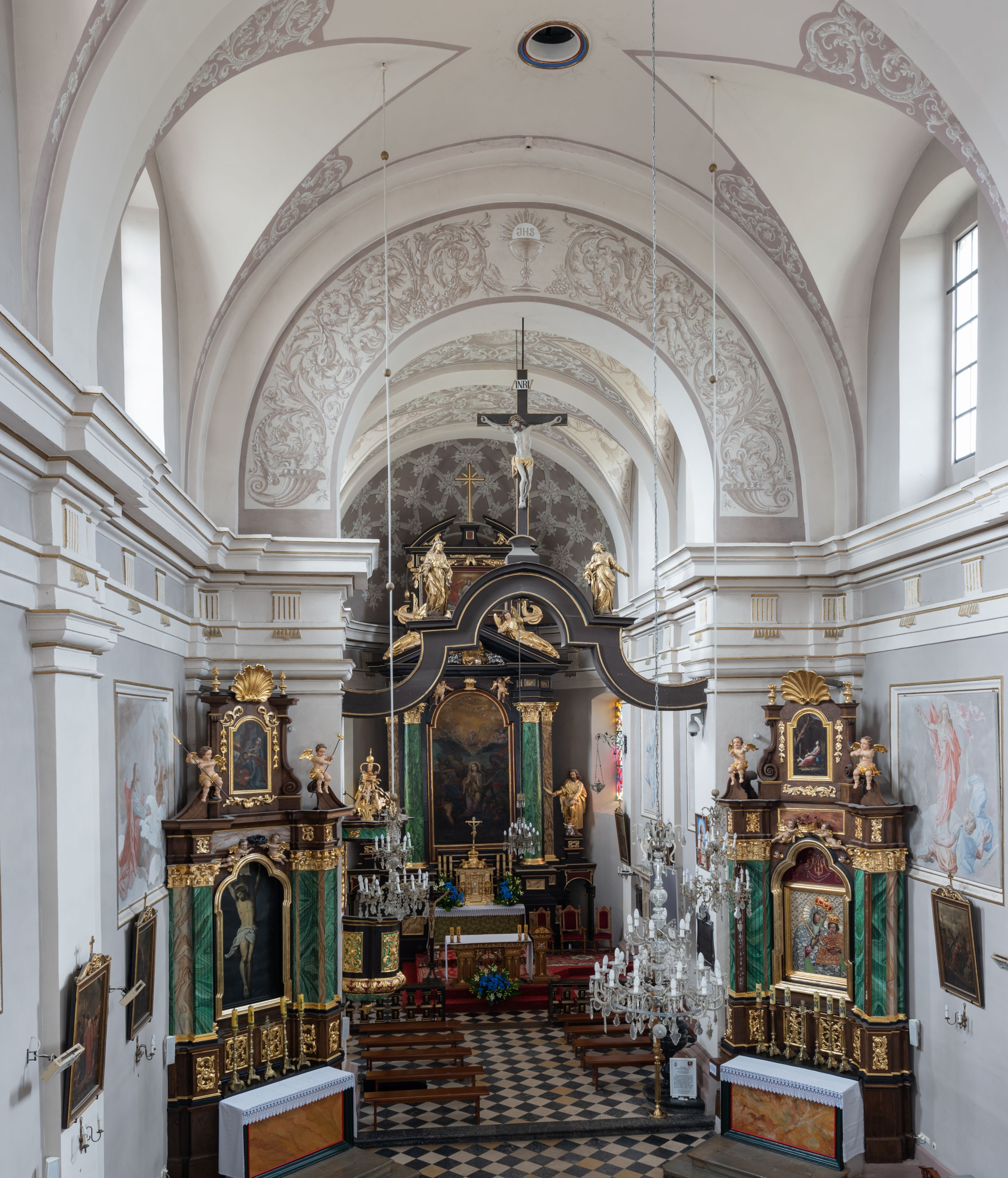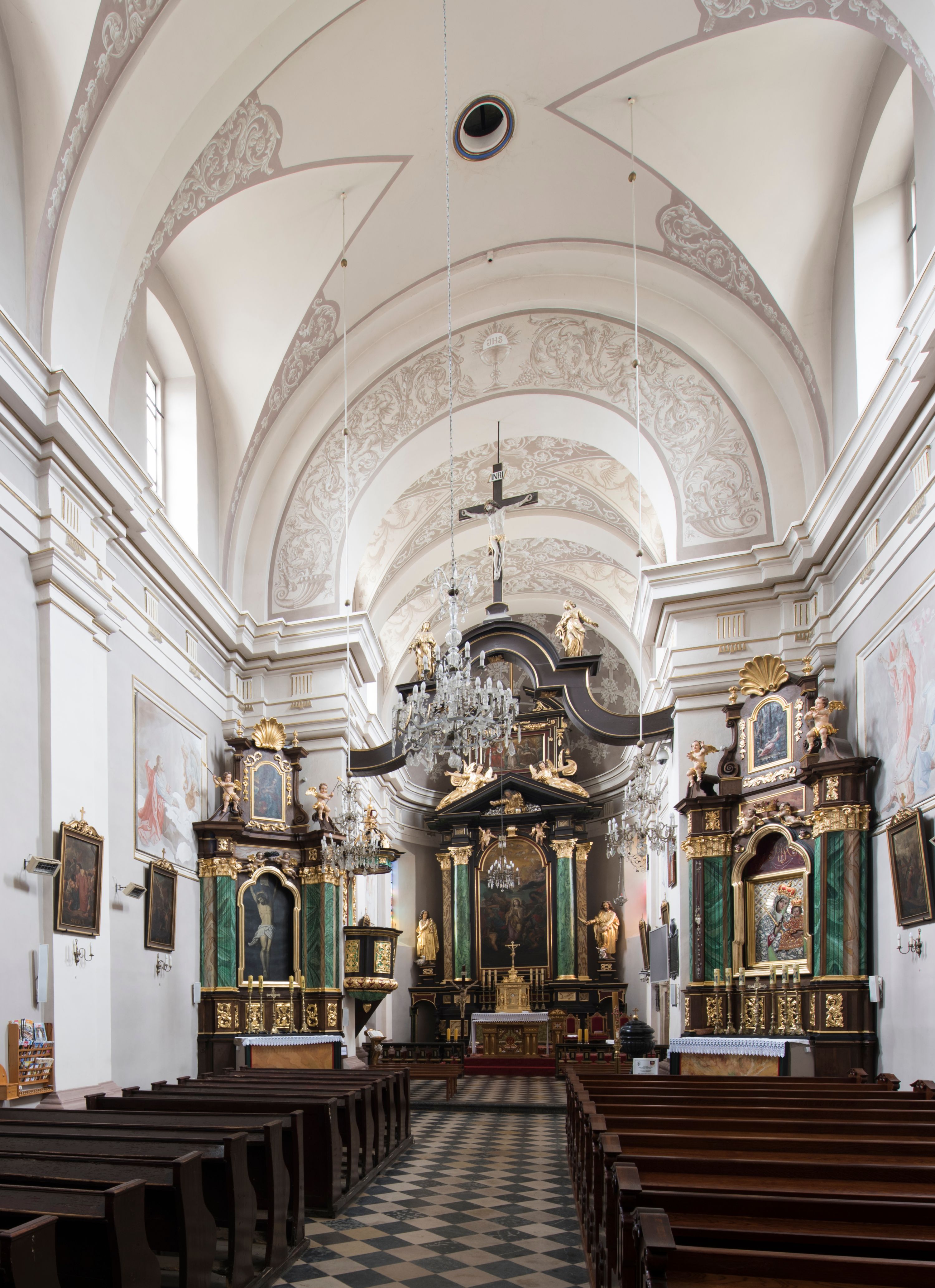 Artykulacja ścian jest przeprowadzona za pomocą zdwojonych pilastrów toskańskich stojących na wysokich postumentach i podtrzymujących wydatne, przełamujące się, pełne belkowanie z fryzem tryglifowym oraz wysuniętym gzymsem, obiegającym całe wnętrze świątyni. Wnętrze nakrywa sklepienie kolebkowe na gurtach z lunetami; w kluczach sklepienia znajdują się tarcze herbowe, Złota Pilawa oraz Ostoja. W lunetach umieszczone są okna prostokątne zamknięte łukiem odcinkowym; takie same okna znajdują się w apsydzie prezbiterium, poniżej belkowania. W kaplicy znajdują się dwa prostokątne okna zamknięte odcinkowo. Zakrystia jest jednoprzestrzenna, nakryta sklepieniem krzyżowym. Prowadzi do niej kamienny portal profilowany z uszakami, z podwieszonymi wolutami, zwieńczony wydatnym gzymsem. W partii fryzu umieszczono polichromowany kartusz z herbem Ostoja. W ścianach środkowego przęsła korpusu nawowego po obu stronach kościoła znajdują się głębokie, prostokątne nisze zamknięte łukami odcinkowymi. W niszy północnej umieszczono drzwi prowadzące do niewielkiej kruchty przykrytej stropem, z dwoma małymi, okrągłymi oknami po bokach. Również po zachodniej stronie korpusu znajduje się wejście do kruchty. Ponadto na ścianach nawy oraz prezbiterium widnieją płyciny ujęte ramą profilowaną w tynku. W pierwszym od strony fasady przęśle znajduje się murowany chór muzyczny, trójarkadowy, wsparty na dwóch filarach opiętych pilastrami oraz dwóch półfilarach przylegających do ścian, sklepiony krzyżowo.