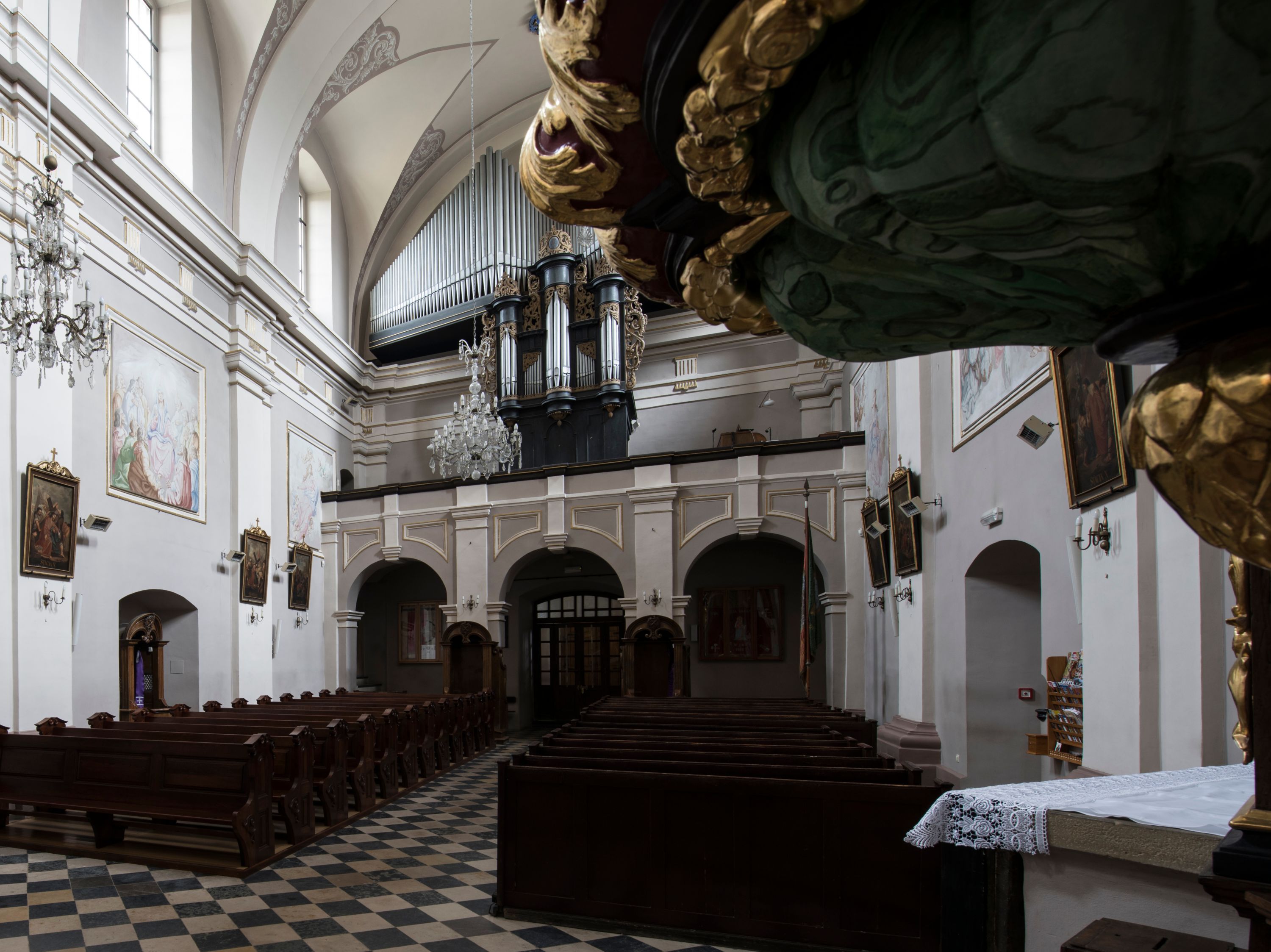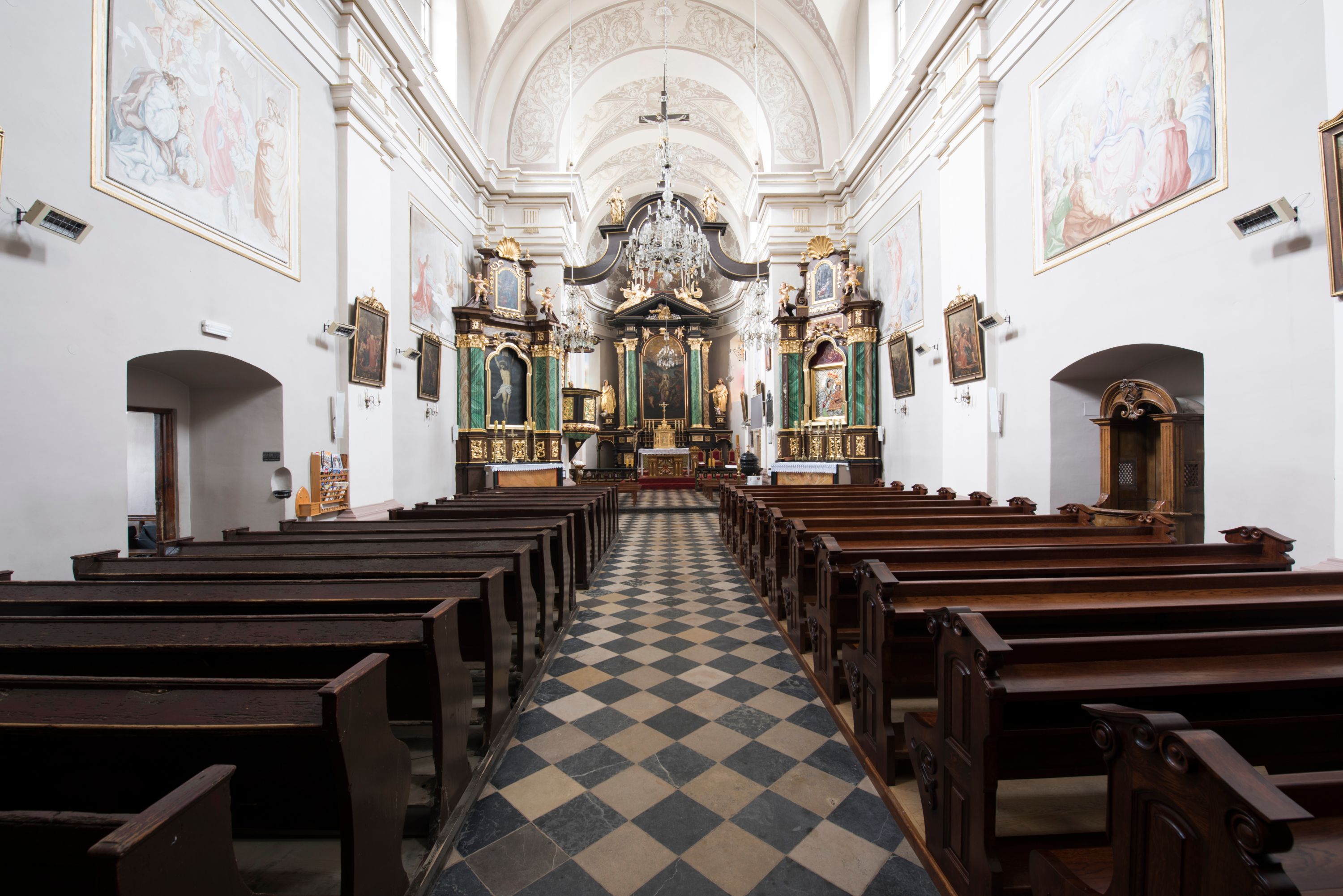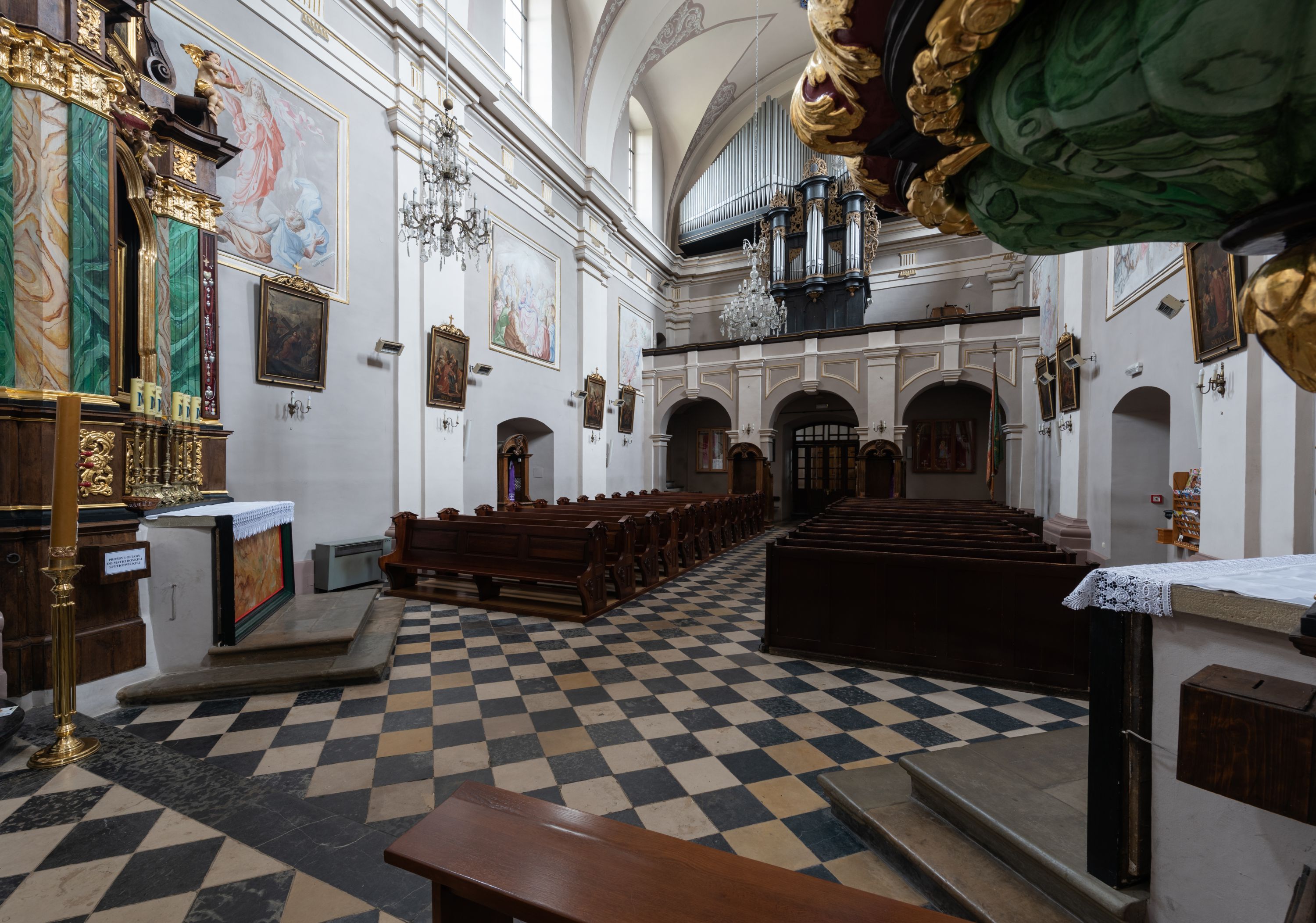 Artykulacja ścian jest przeprowadzona za pomocą zdwojonych pilastrów toskańskich stojących na wysokich postumentach i podtrzymujących wydatne, przełamujące się, pełne belkowanie z fryzem tryglifowym oraz wysuniętym gzymsem, obiegającym całe wnętrze świątyni. Wnętrze nakrywa sklepienie kolebkowe na gurtach z lunetami; w kluczach sklepienia znajdują się tarcze herbowe, Złota Pilawa oraz Ostoja. W lunetach umieszczone są okna prostokątne zamknięte łukiem odcinkowym; takie same okna znajdują się w apsydzie prezbiterium, poniżej belkowania. W kaplicy znajdują się dwa prostokątne okna zamknięte odcinkowo. Zakrystia jest jednoprzestrzenna, nakryta sklepieniem krzyżowym. Prowadzi do niej kamienny portal profilowany z uszakami, z podwieszonymi wolutami, zwieńczony wydatnym gzymsem. W partii fryzu umieszczono polichromowany kartusz z herbem Ostoja. W ścianach środkowego przęsła korpusu nawowego po obu stronach kościoła znajdują się głębokie, prostokątne nisze zamknięte łukami odcinkowymi. W niszy północnej umieszczono drzwi prowadzące do niewielkiej kruchty przykrytej stropem, z dwoma małymi, okrągłymi oknami po bokach. Również po zachodniej stronie korpusu znajduje się wejście do kruchty. Ponadto na ścianach nawy oraz prezbiterium widnieją płyciny ujęte ramą profilowaną w tynku. W pierwszym od strony fasady przęśle znajduje się murowany chór muzyczny, trójarkadowy, wsparty na dwóch filarach opiętych pilastrami oraz dwóch półfilarach przylegających do ścian, sklepiony krzyżowo.