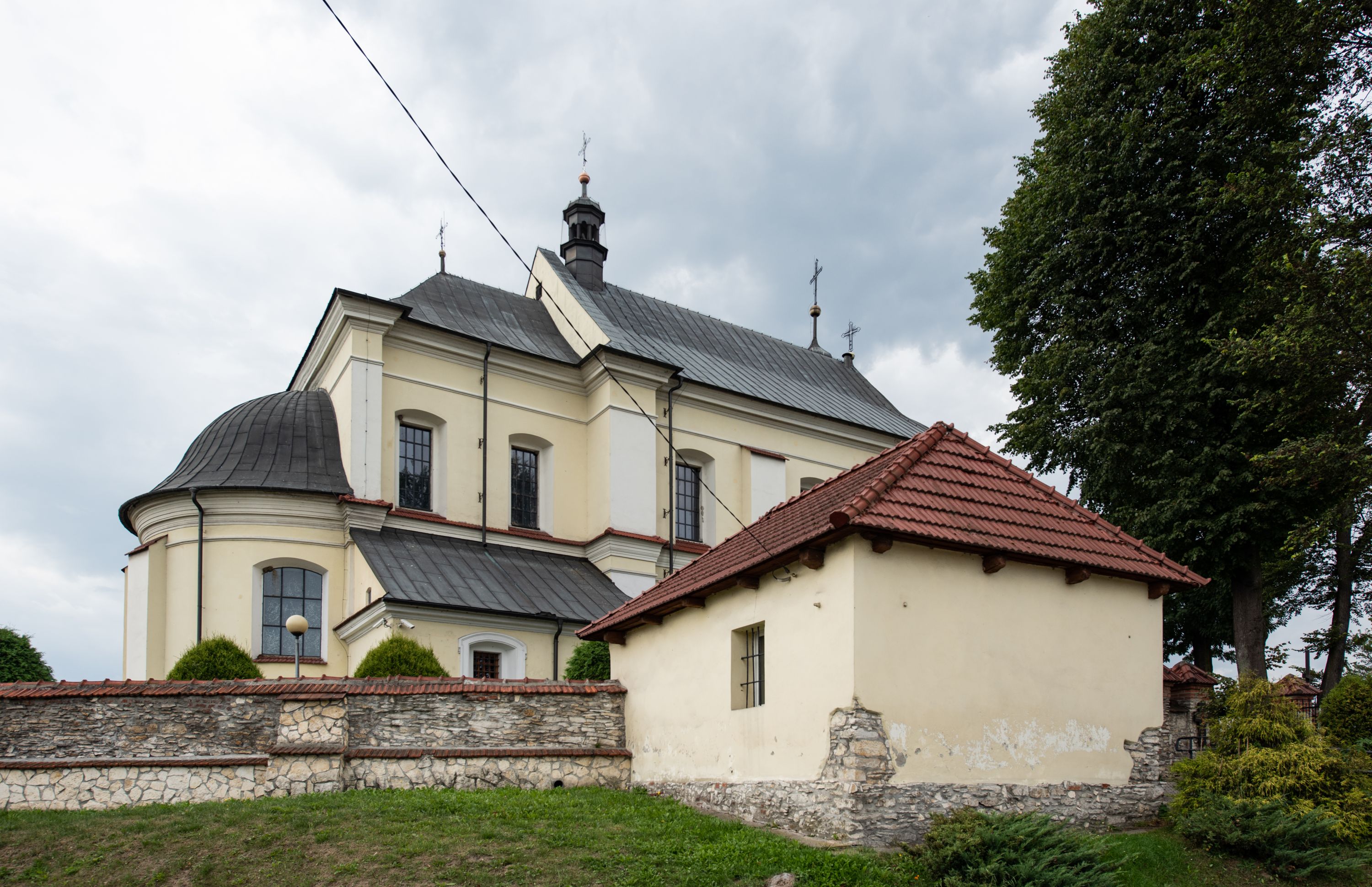 Fasada kościoła jest płaska, zakończona gzymsem, z czterokondygnacyjną wieżą, nakrytą cebulastym hełmem z krzyżem. Boczne elewacje ujęte uskokowymi przyporami, zakończone gzymsem. Dachy dwuspadowe nad nawą i kruchtami, trójspadowe nad prezbiterium, półsferyczne nad apsydą, pulpitowe nad kaplicą i zakrystią, kryte blachą. Nad granicy nawy i prezbiterium wieloboczna wieżyczka na sygnaturkę z prześwitami, zakończona kopułą, sterczyną i kulą z krzyżem.