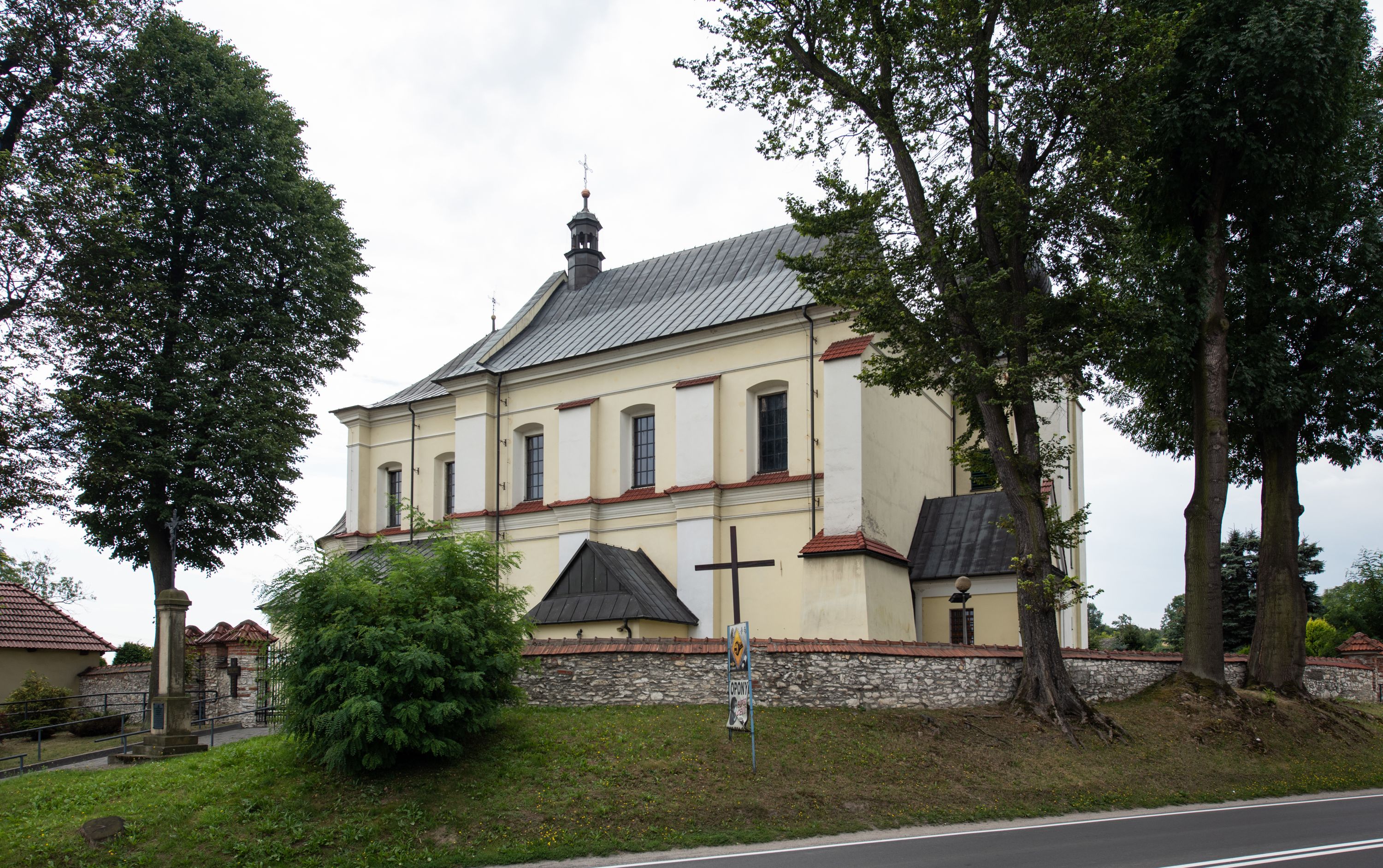 Kościół jest położony w centrum wsi, na wschód od głównej drogi, na placu otoczonym kamiennym murem przykrytym dachówką, z kilkoma drzewami. Wejście na plac przykościelny prowadzi przez szerokie schody i bramę od zachodu i bramkę od północy. Kościół jest budowlą założoną na planie prostokąta, jednonawowy, trójprzęsłowy z węższym, dwuprzęsłowym prezbiterium z apsydą. Do nawy przylegają od zachodu i północy dwie kruchty na planie kwadratu i wieża w narożu południowo-zachodnim fasady. Do prezbiterium od północy jest dostawiona kaplica na rzucie prostokąta otwierająca się półkolistymi arkadami, a od południa zakrystia.