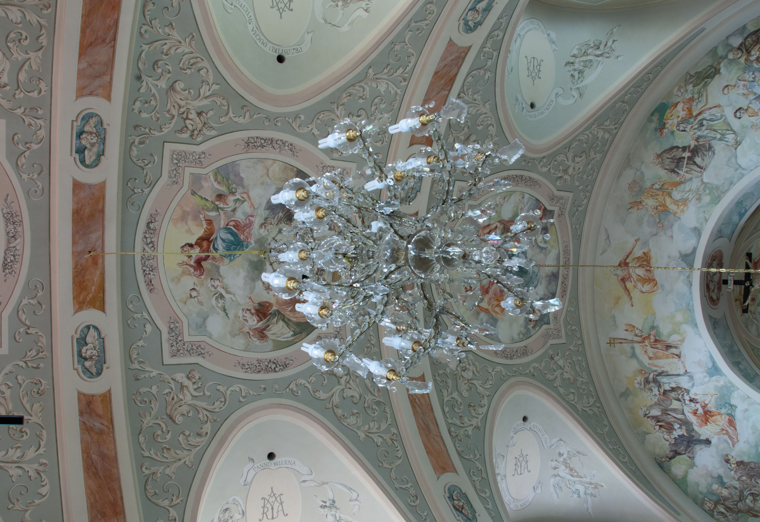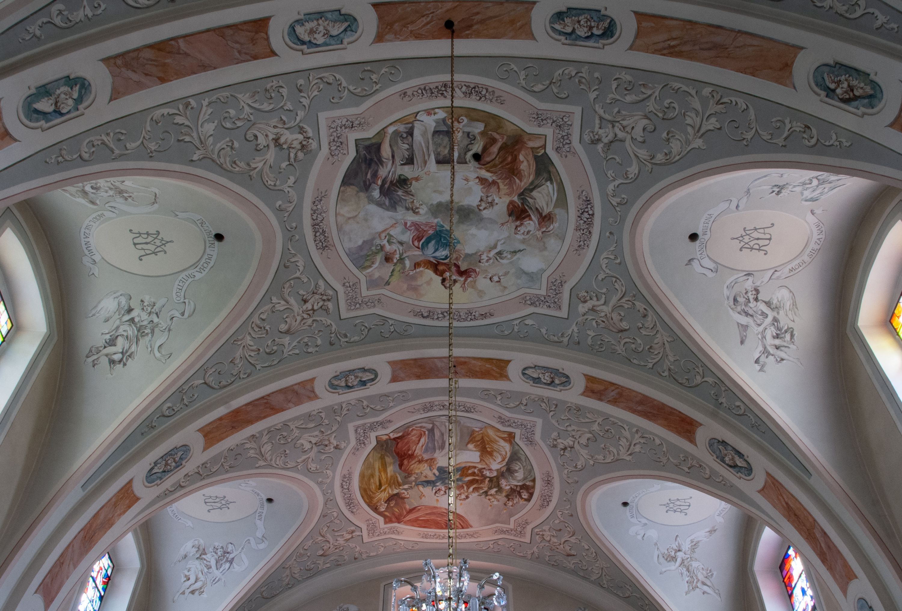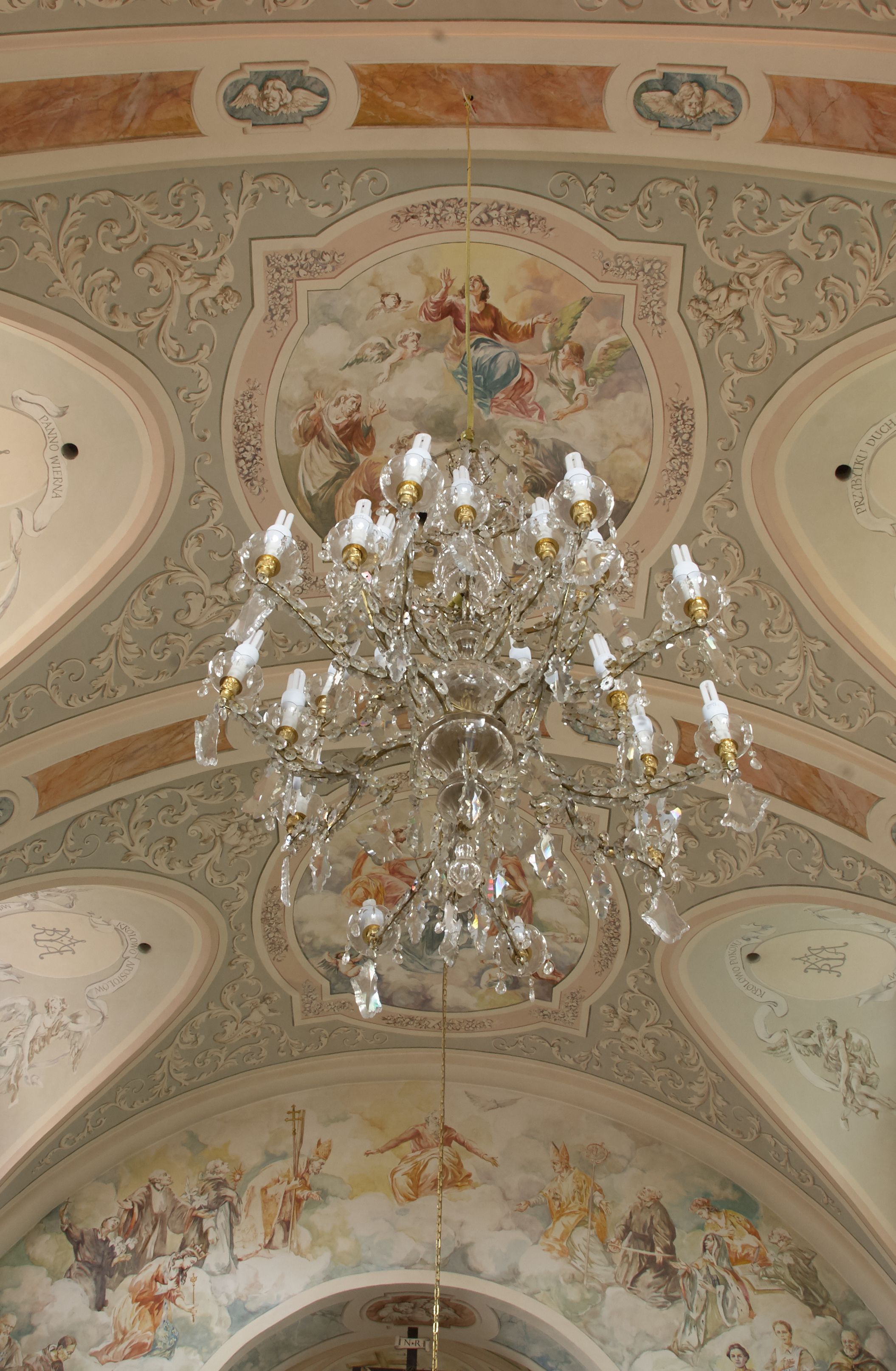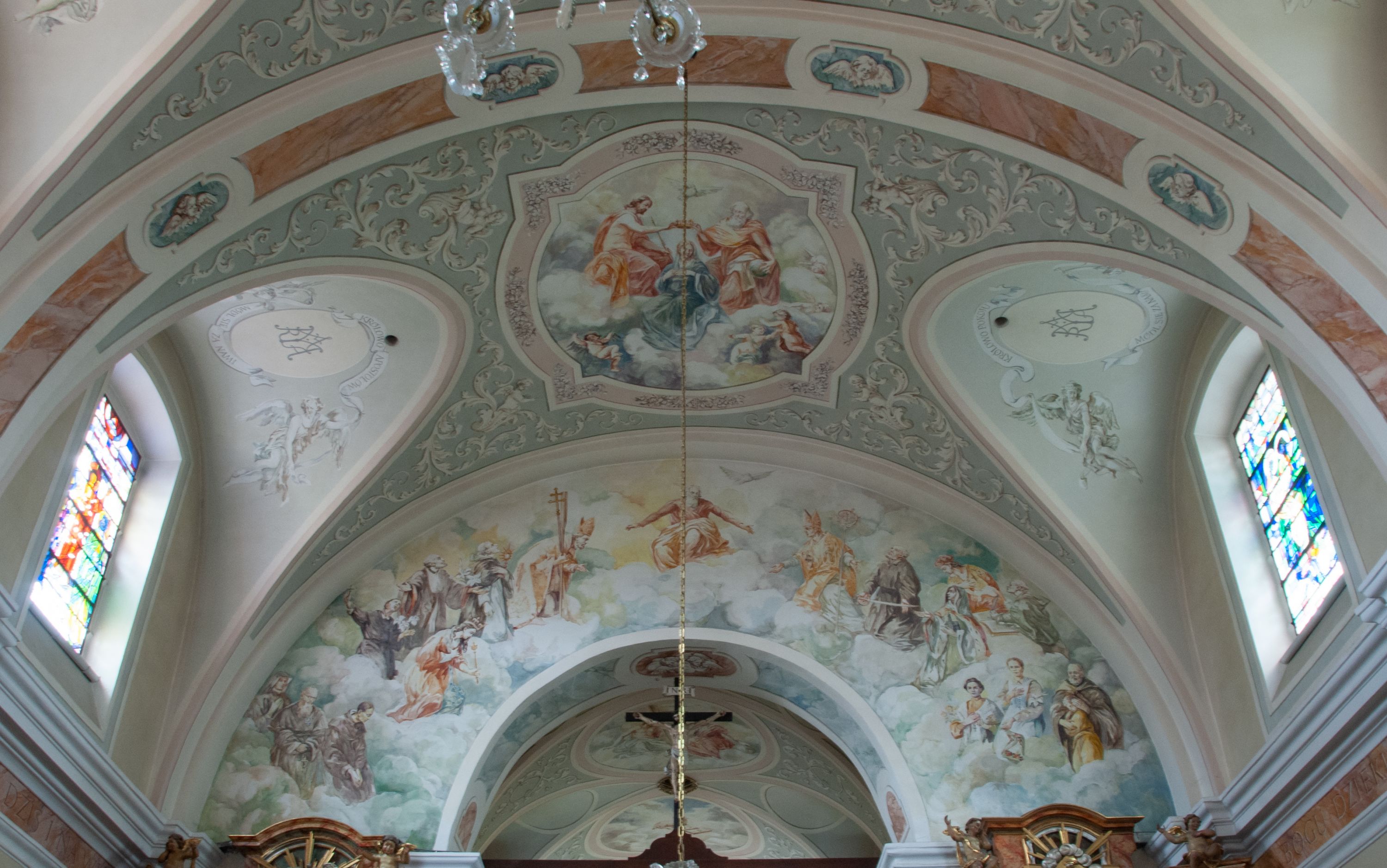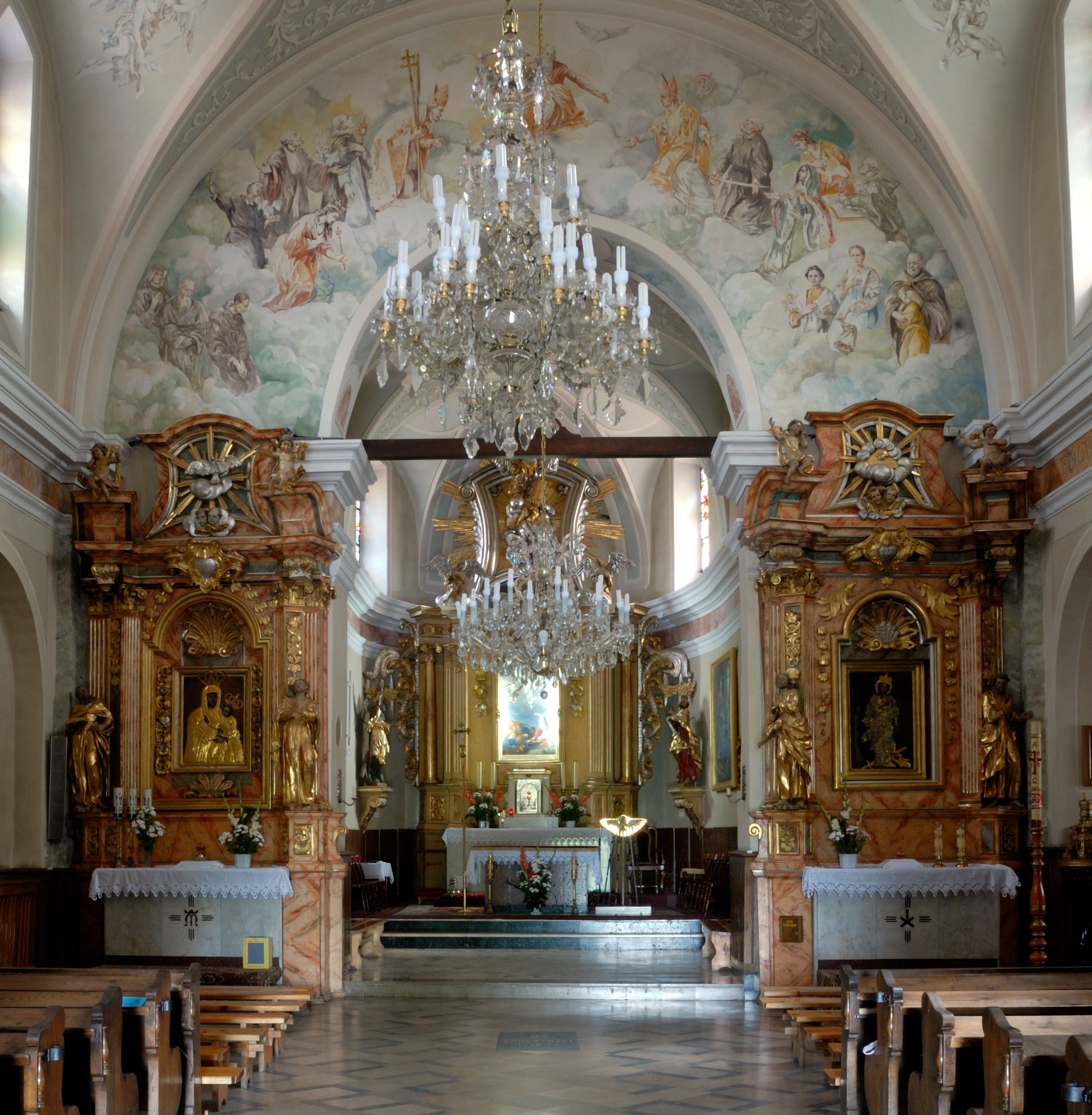 Nawa szersza od prezbiterium, prostokątna, trójprzęsłowa, ze sklepieniem kolebkowym z lunetami na gurtach. Od zachodu chór muzyczny wsparty na kolumnach. Ściany nawy podzielone zdwojonymi pilastrami, między którymi nisze arkadowe, od południa półokrągłe arkady łączące nawę główną z nawą boczną. Partię ścian od sklepienia oddziela pełne belkowanie wyłamane na osi pilastrów, które jest kontynuowane w przekrytym sklepieniem kolebkowym z lunetami prezbiterium.