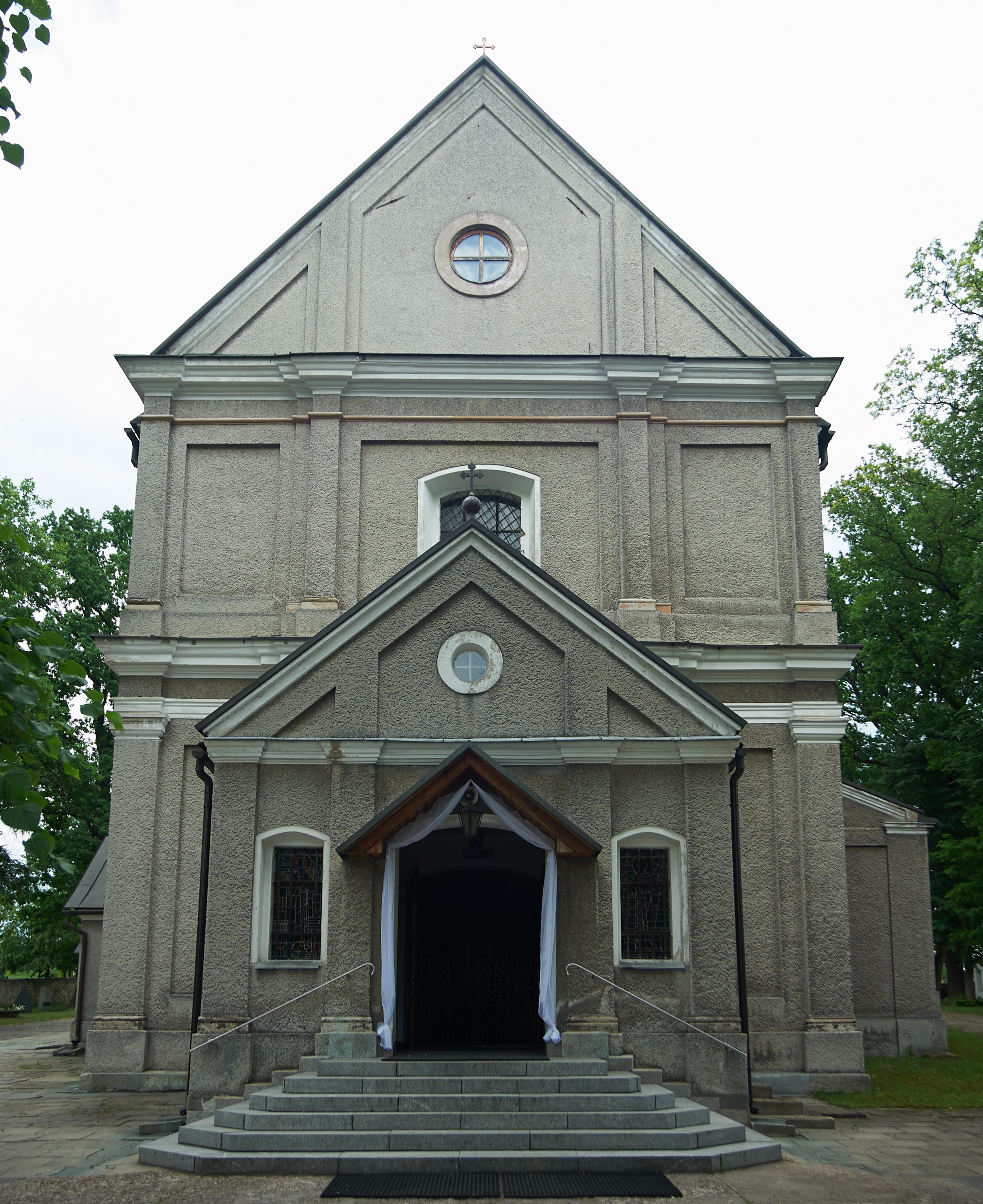 Fasada trójosiowa, dwukondygnacyjna, zwieńczona trójkątnym przyczółkiem, poprzedzona jednokondygnacyjną kruchtą, do której wchodzi się po sześciostopniowych schodach. Osie rozdzielone są pojedynczymi lub zdwojonymi pilastrami, kondygnacje dzieli bogato profilowane belkowanie. W kruchcie drzwi o wykroju prostokąta zamknięte łukiem odcinkowym, okna w osiach bocznych o identycznym jak drzwi wykroju; okulus w szczycie. W osi środkowej drugiej kondygnacji fasady okno prostokątne, zamknięte łukiem odcinkowym, a u szczytu okulus.