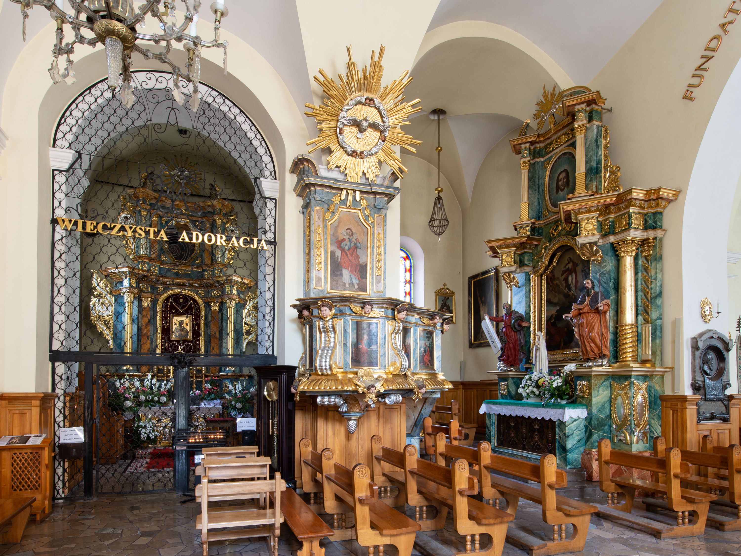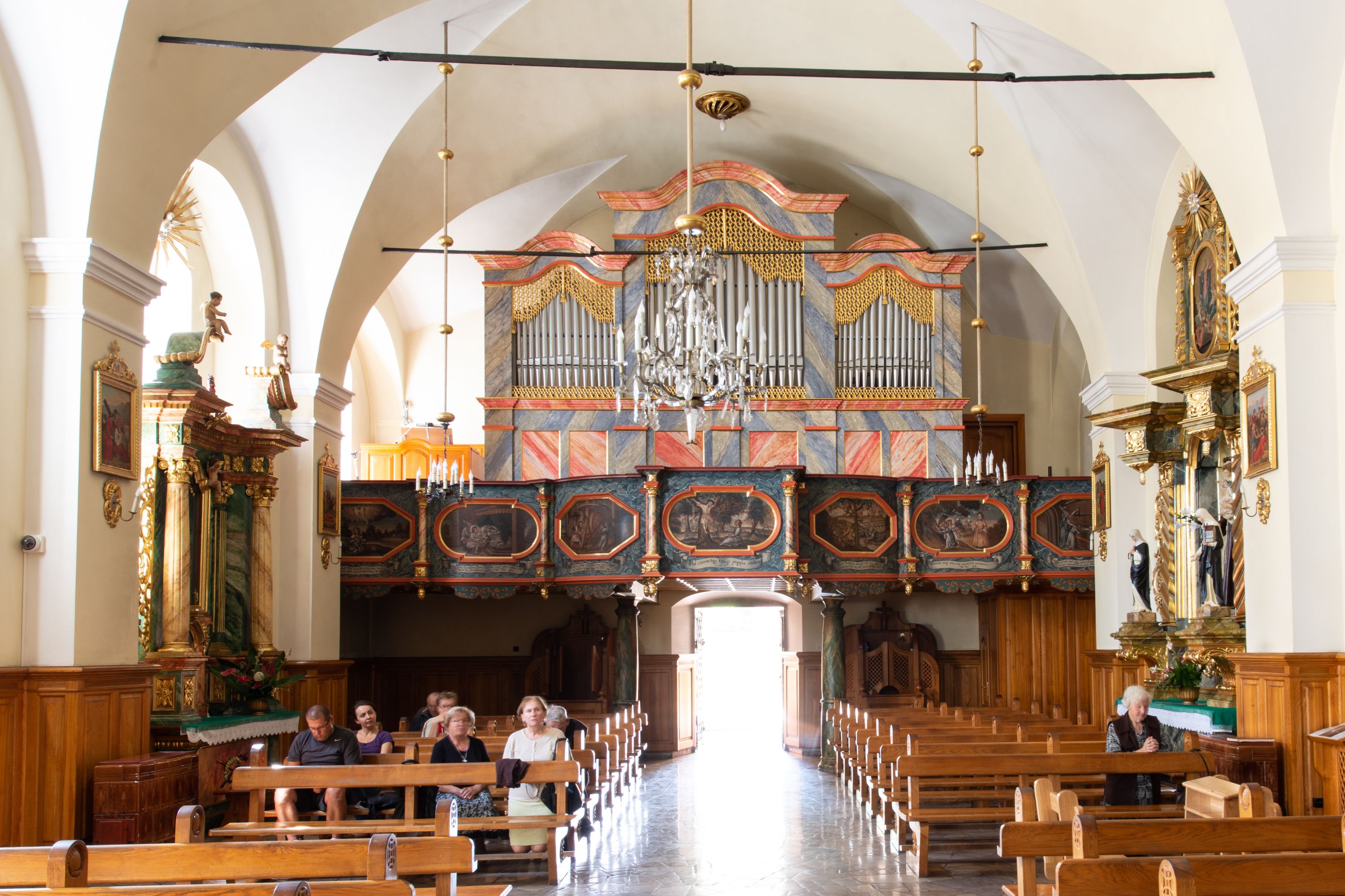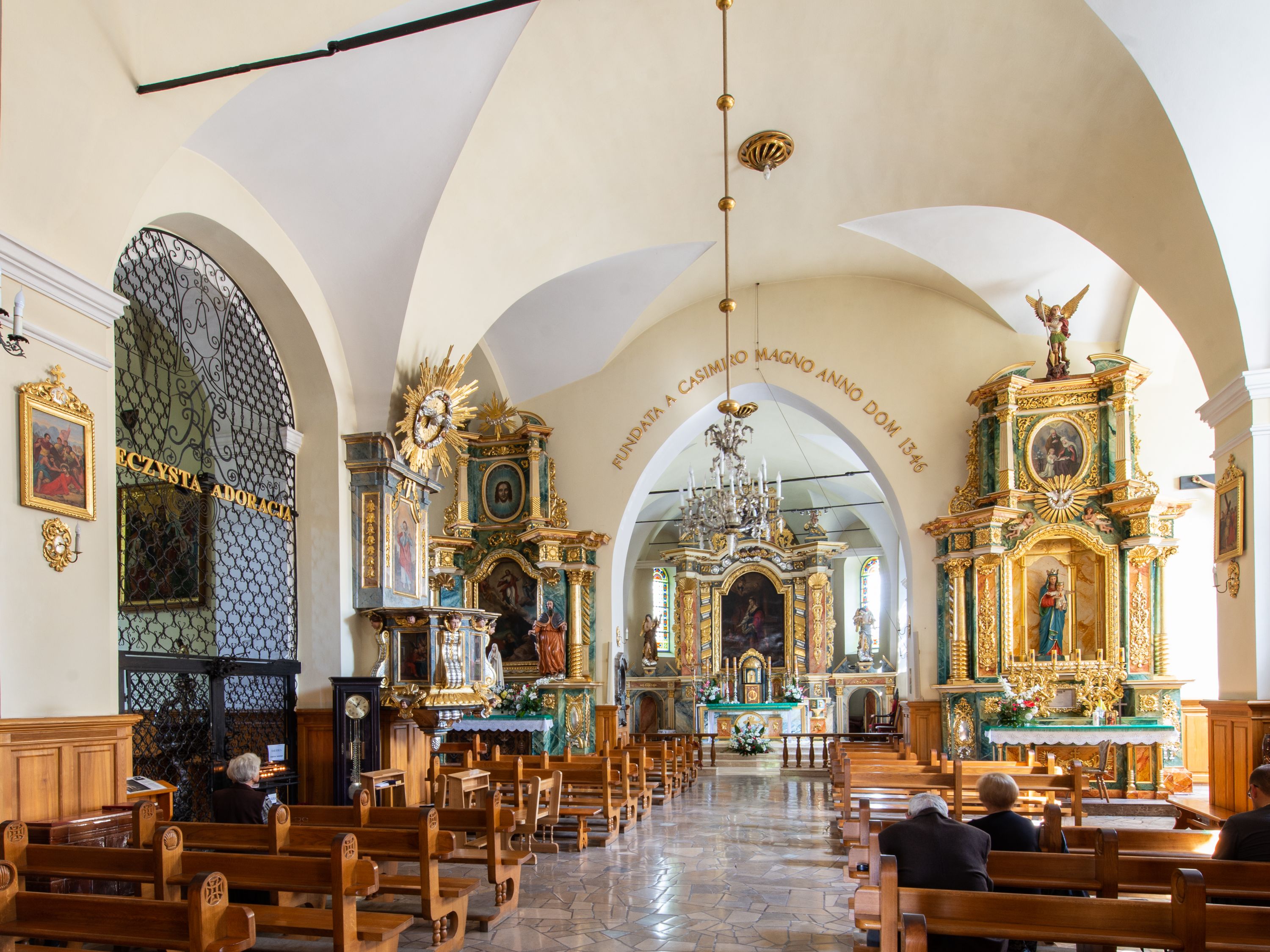 Artykulacja ścian jest przeprowadzona za pomocą pilastrów toskańskich podtrzymujących sklepienie kolebkowe z lunetami. Ramiona transeptu, kaplica Matki Boskiej Różańcowej oraz kruchta są sklepione krzyżowo. Otwory okienne: w prezbiterium cztery, w nawie cztery od południa, wszystkie zamknięte łukami półkolistymi. Zakrystia piętrowa z jednym oknem na parterze i dwoma na piętrze; od strony północnej kaplica Matki Boskiej Różańcowej z dwoma oknami i jedną, zamurowaną wnęką; obok mała zakrystia. Z prezbiterium do zakrystii prowadzi portal kamienny z inicjałami, herbem i portretem księdza Sawickiego. Na arkadzie tęczowej od strony nawy nowy napis: „FUNDATA A CASIMIRO MAGNO ANNO DOM[INI] 1346”. W pierwszym od strony fasady przęśle znajduje się drewniany chór muzyczny, wsparty na dwóch filarach.