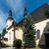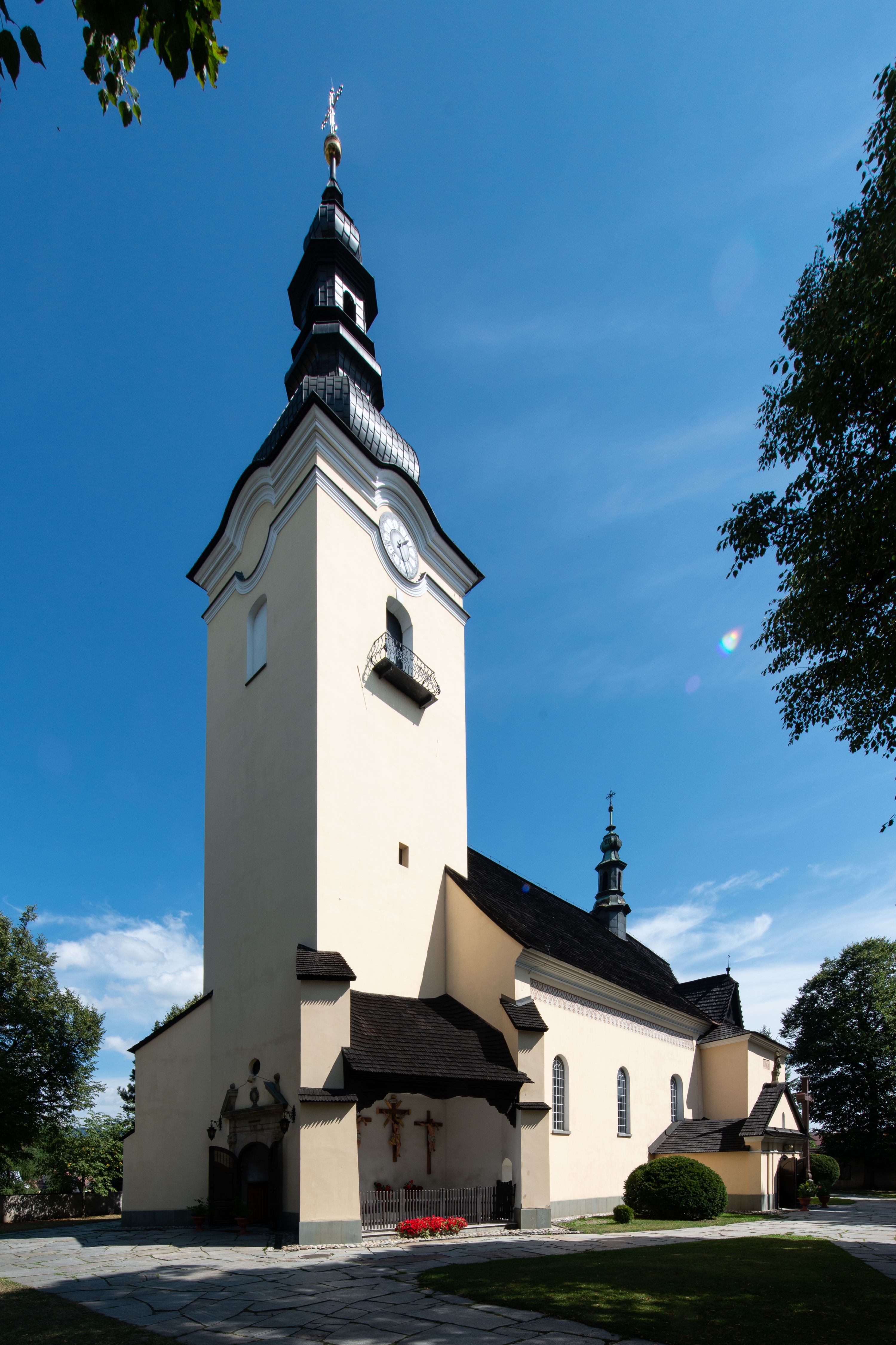 Fasada zachodnia kościoła jest płaska z wieżą, nakryta kopułą z latarnią. Na narożnikach zewnętrznych wieży i naw oraz przy absydzie szkarpy, kryte daszkiem gontowym. Na frontowej ścianie wieży kamienny portal, nad nim sygle „I(osephus) S(awicki) / 1765” oraz herb Nowina. Od strony zachodniej wieża, ozdobiona półkolistymi blendami. Od strony południowej balkonik otoczony żelazną kratą z napisem „1343-1943”. Nad balkonikiem umieszczona jest tarcza zegara, taka sama widnieje od strony północnej, a od zachodniej i wschodniej odpowiadają im tarcze w murze. Przy wieży, od strony północnej wieżyczka w kształcie walca, ścięta od połowy, nakryta daszkiem stożkowym. Przy południowej ścianie wieży między dwiema szkarpami znajduje się kapliczka Ukrzyżowania z figurami Chrystusa Ukrzyżowanego i dwóch łotrów na krzyżach. Dach kościoła siodłowy, kryty gontem.