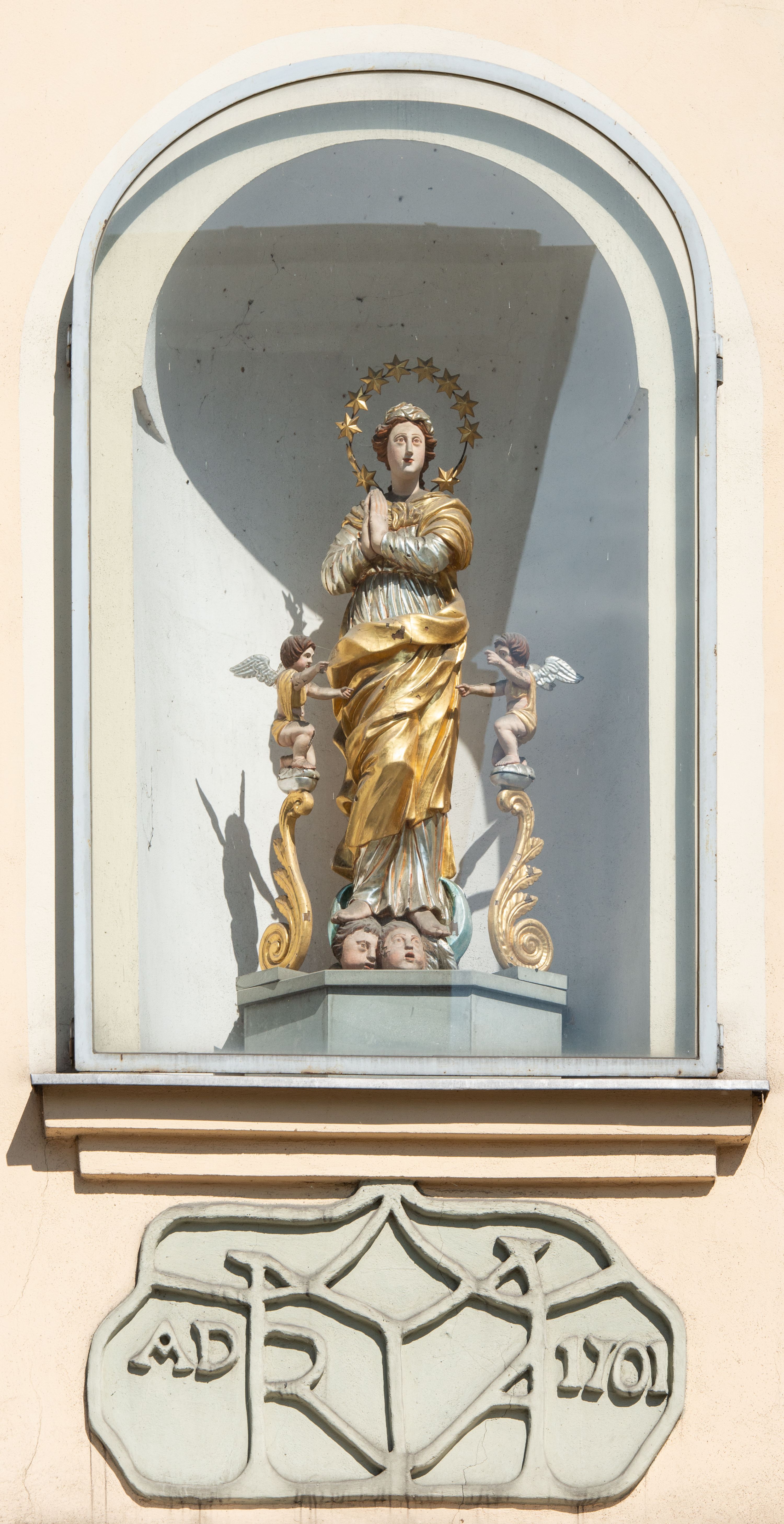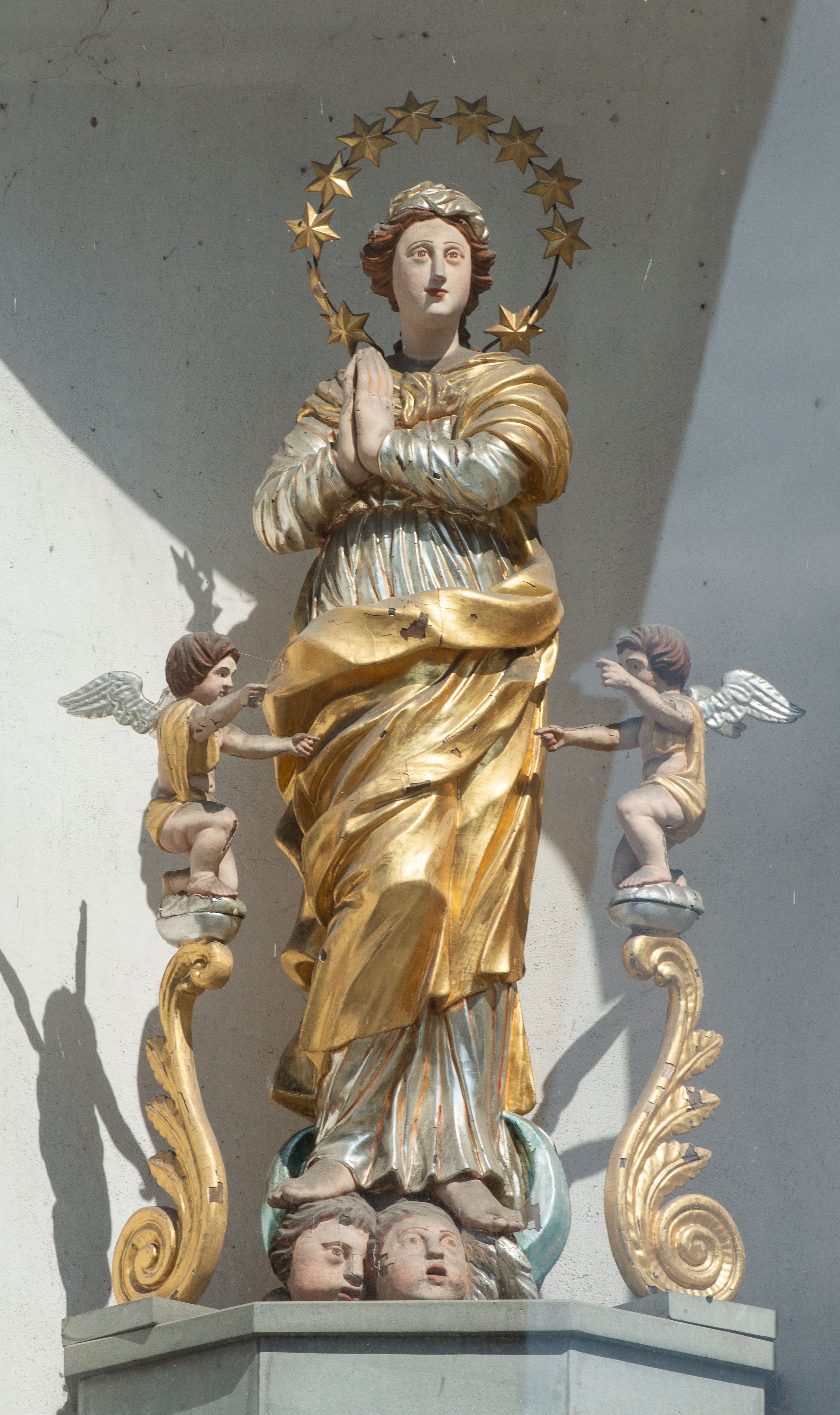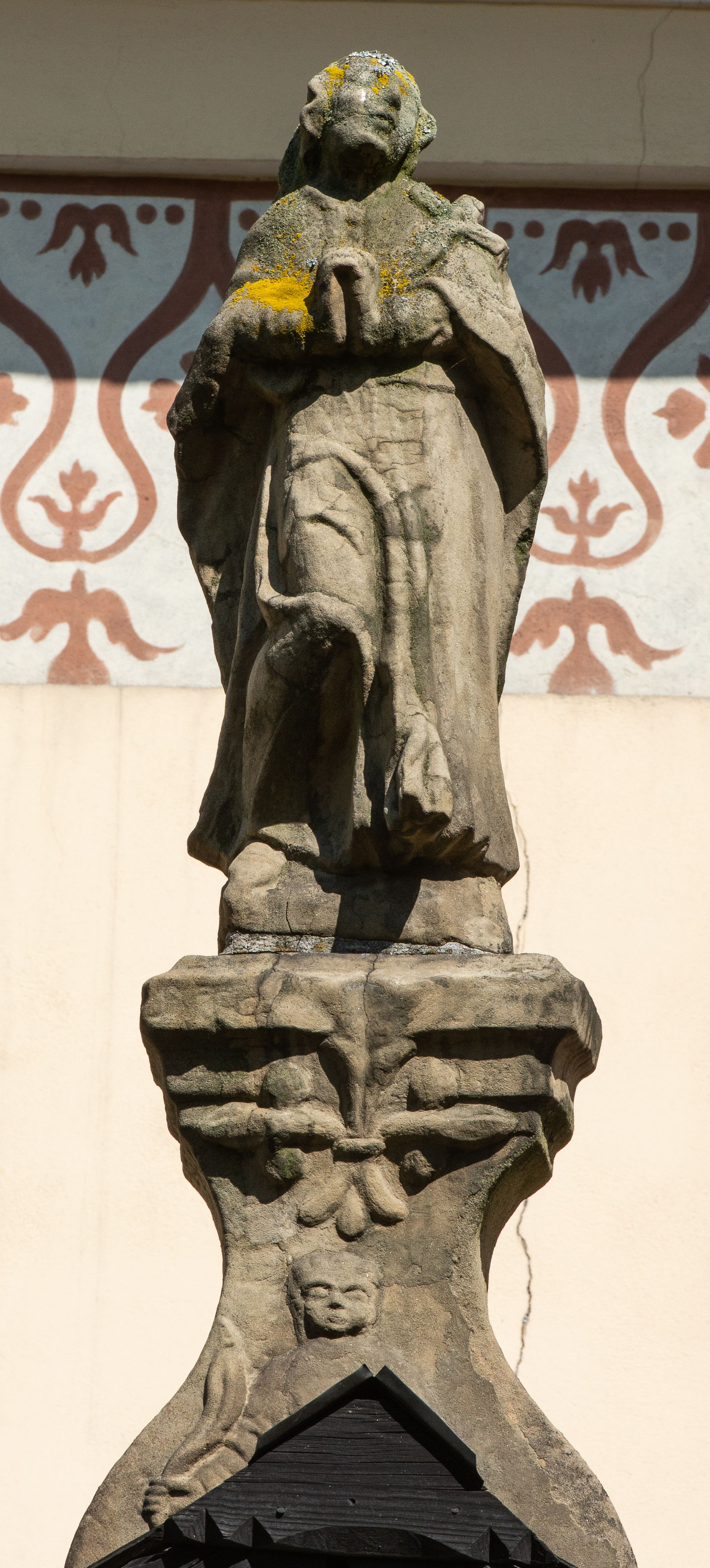 Na zewnętrznej, południowej ścianie napis: „AEDIFICATA H(A)EC EC[C]LESIA / A[NNO] D[OMINI] / 1606 / PETRVS CZARNY MVLARS”. Niżej wmurowana w półokrągłą wnękę z piaskowca figura Matki Boskiej Niepokalanie Poczętej. Po lewej stronie, u góry fragment fryzu dekoracyjnego, malowany w kolorze czerwonym o motywie zwisających esownic ze stylizowanymi kwiatami i liliami.