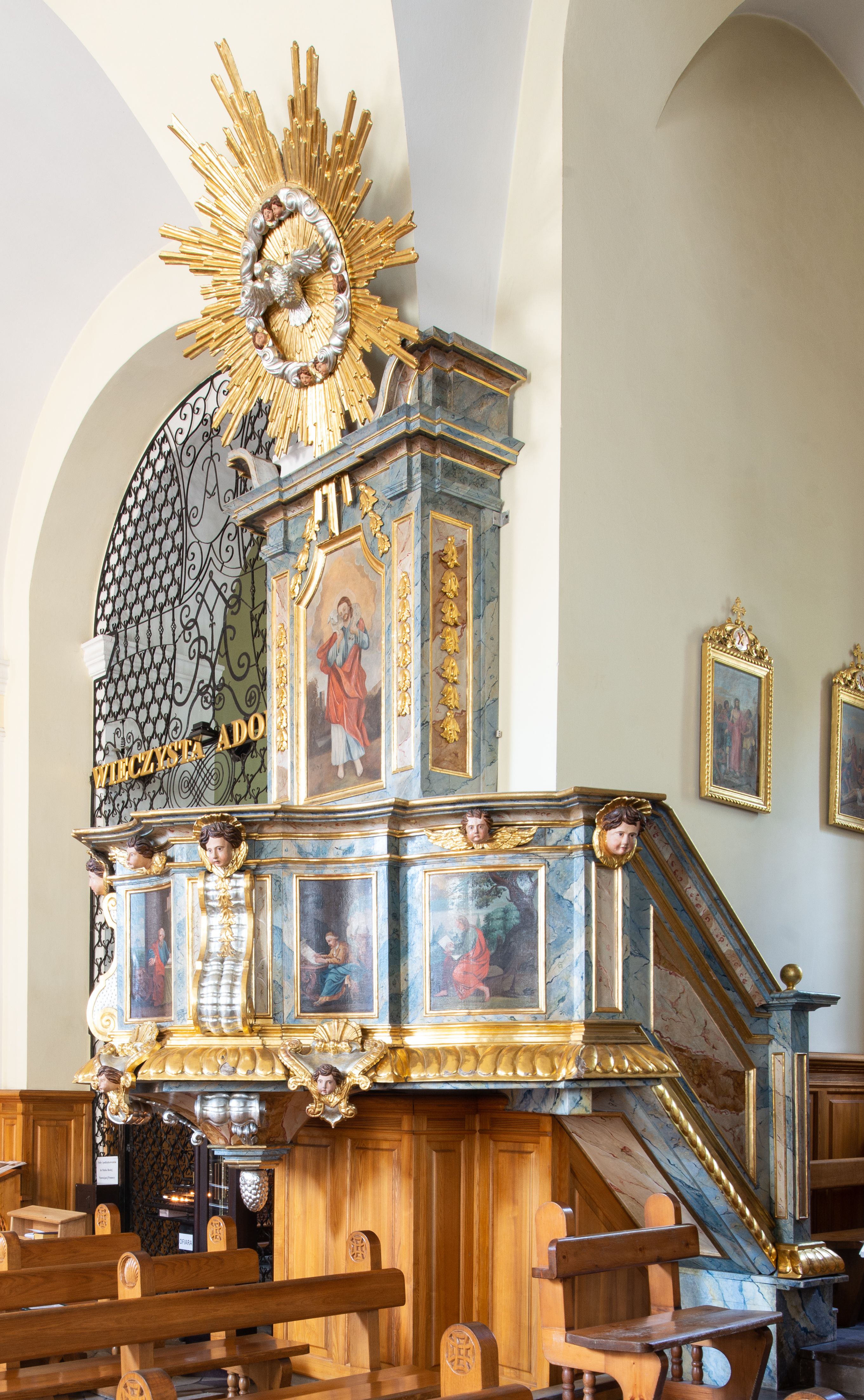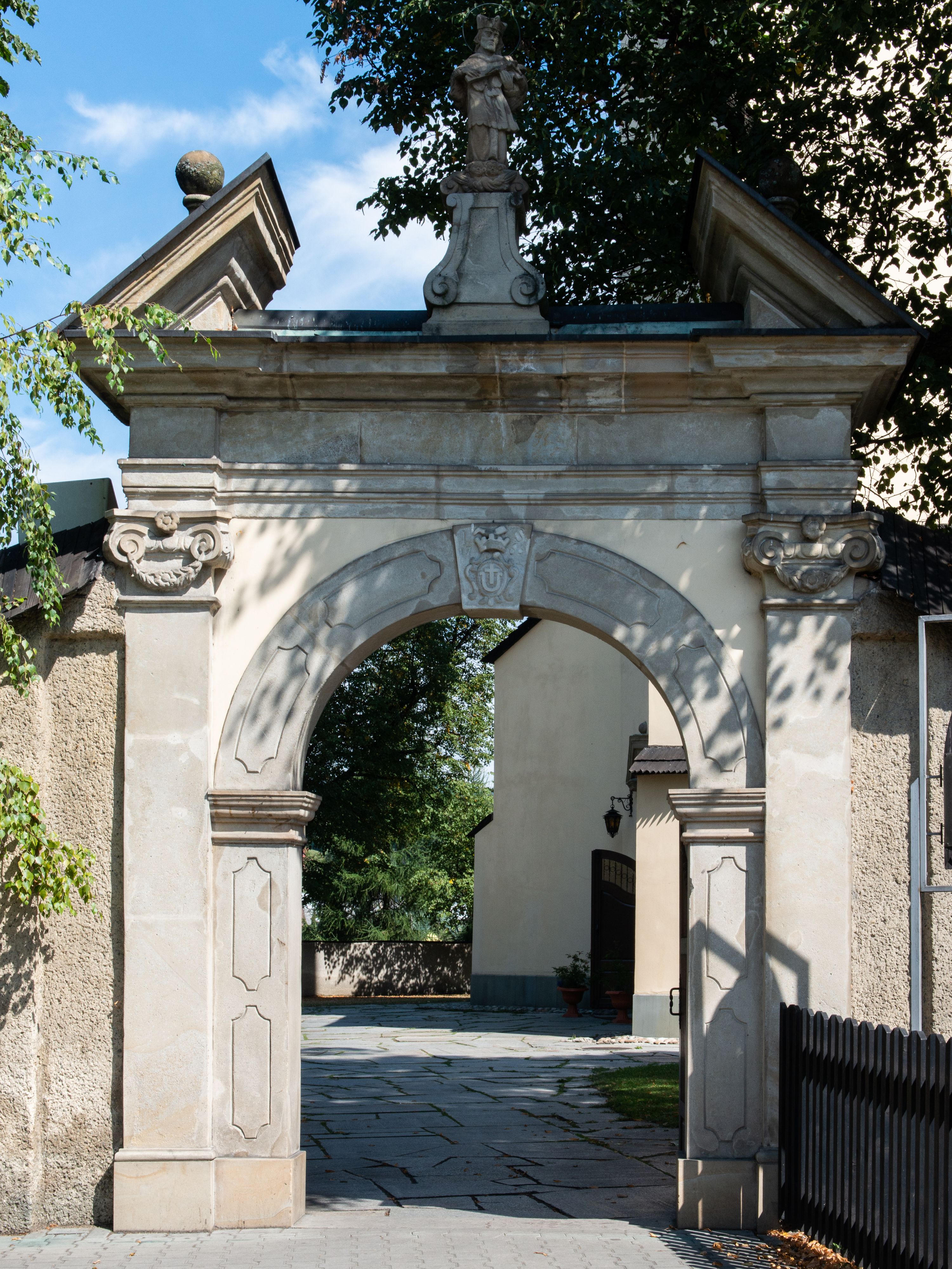 Świątynia otoczona jest murem kamiennym, tynkowanym, nakrytym daszkiem gontowym, jednospadowym. Wejścia znajdują się w murze od strony południowej. Pierwsze, prowadzące do głównych drzwi jest kamienną, późnobarokową bramką z herbem księdza Józefa Sawickiego, datą „1765” oraz figurą św. Jana Kantego. Drugie wejście prowadzi przez dzwonnicę. W murze, od strony wewnętrznej jest 14 wnęk po stacjach drogi krzyżowej. Teren wokół świątyni jest starym cmentarzem, bez zachowanych nagrobków.
