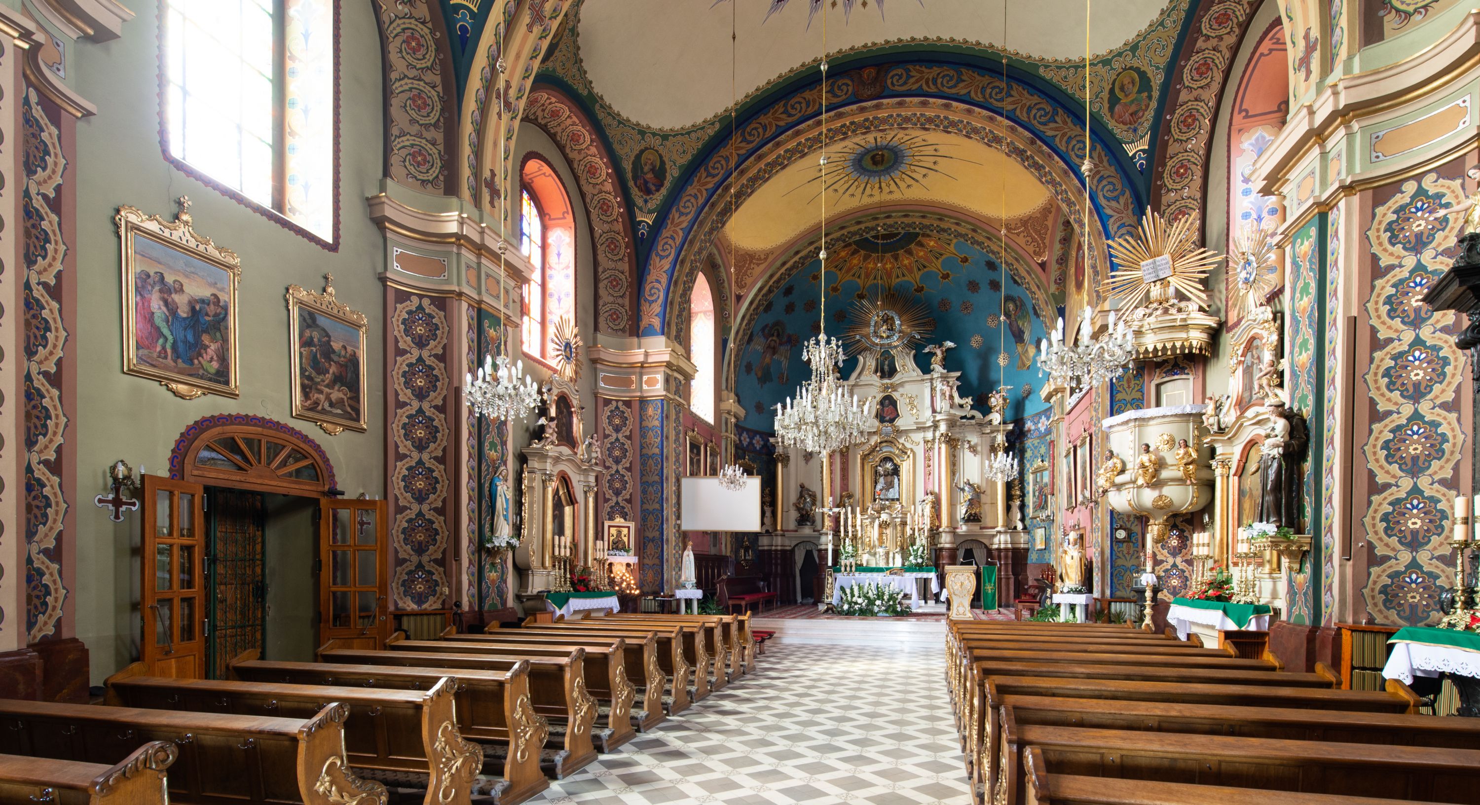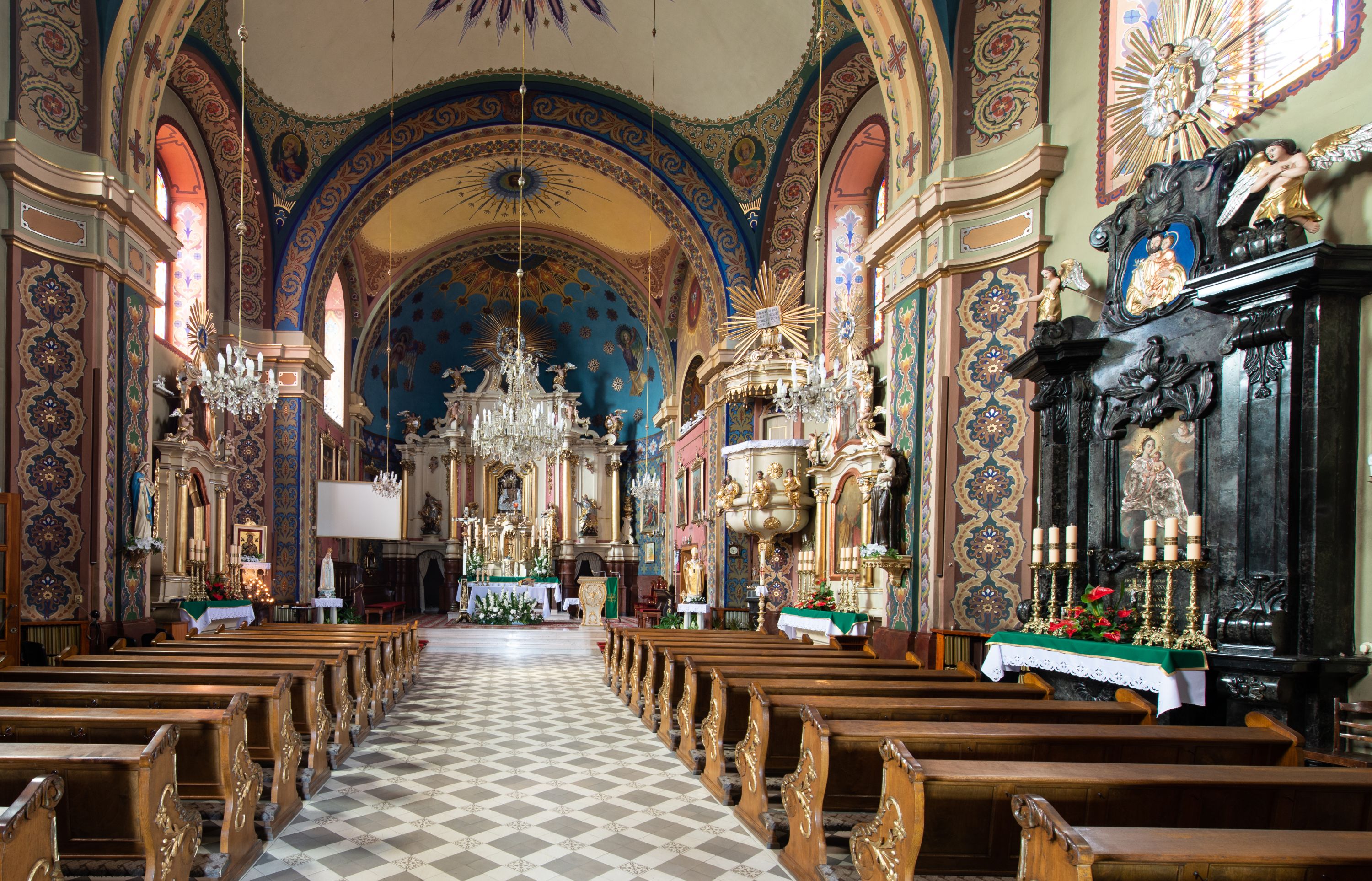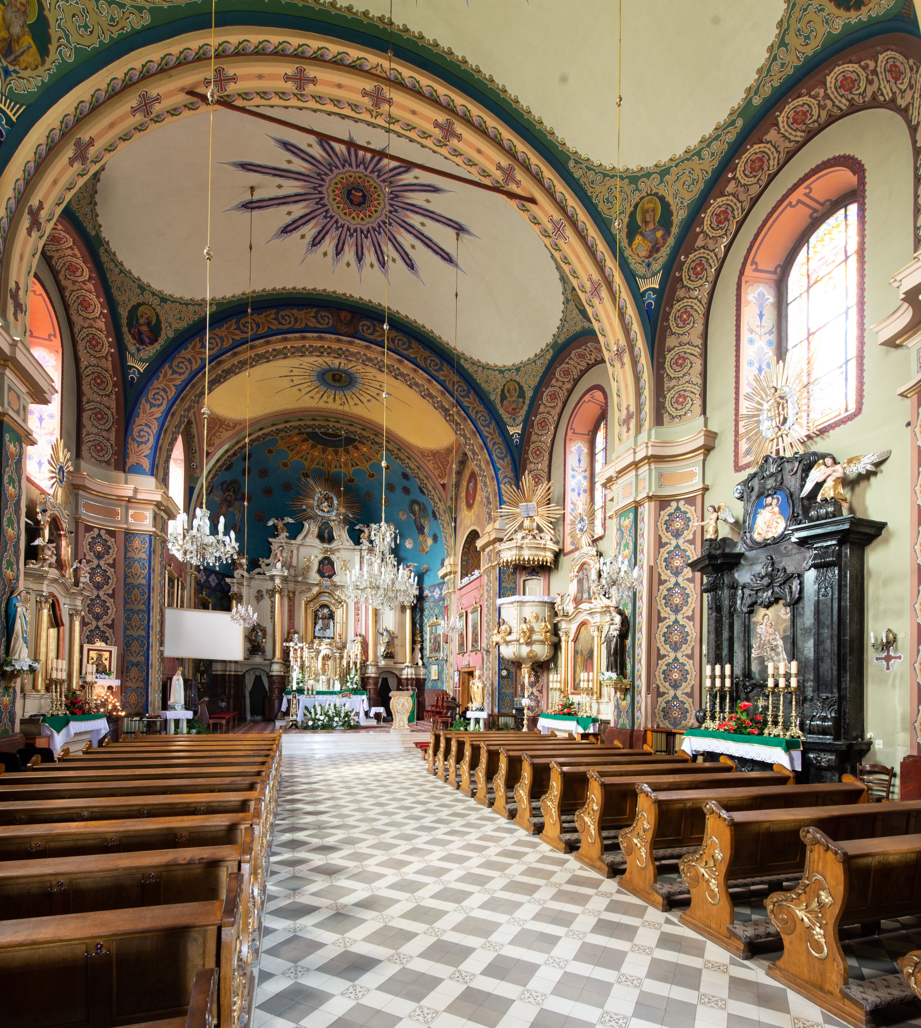 Z dokumentów z 1708 roku wiadomo, że w świątyni znajdował się ołtarz wielki, murowany, z obrazem Marii Niepokalanie Poczętej, w nawie głównej po prawej był ołtarz św. Mikołaja, po lewej retabulum z obrazem Matki Boskiej. W 1732 roku w lewym ołtarzu bocznym umieszczony był już wizerunek Chrystusa. Na łuku tęczowym znajdowała się ambona, a w zachodniej części nawy chór muzyczny z organem o siedmiu głosach.