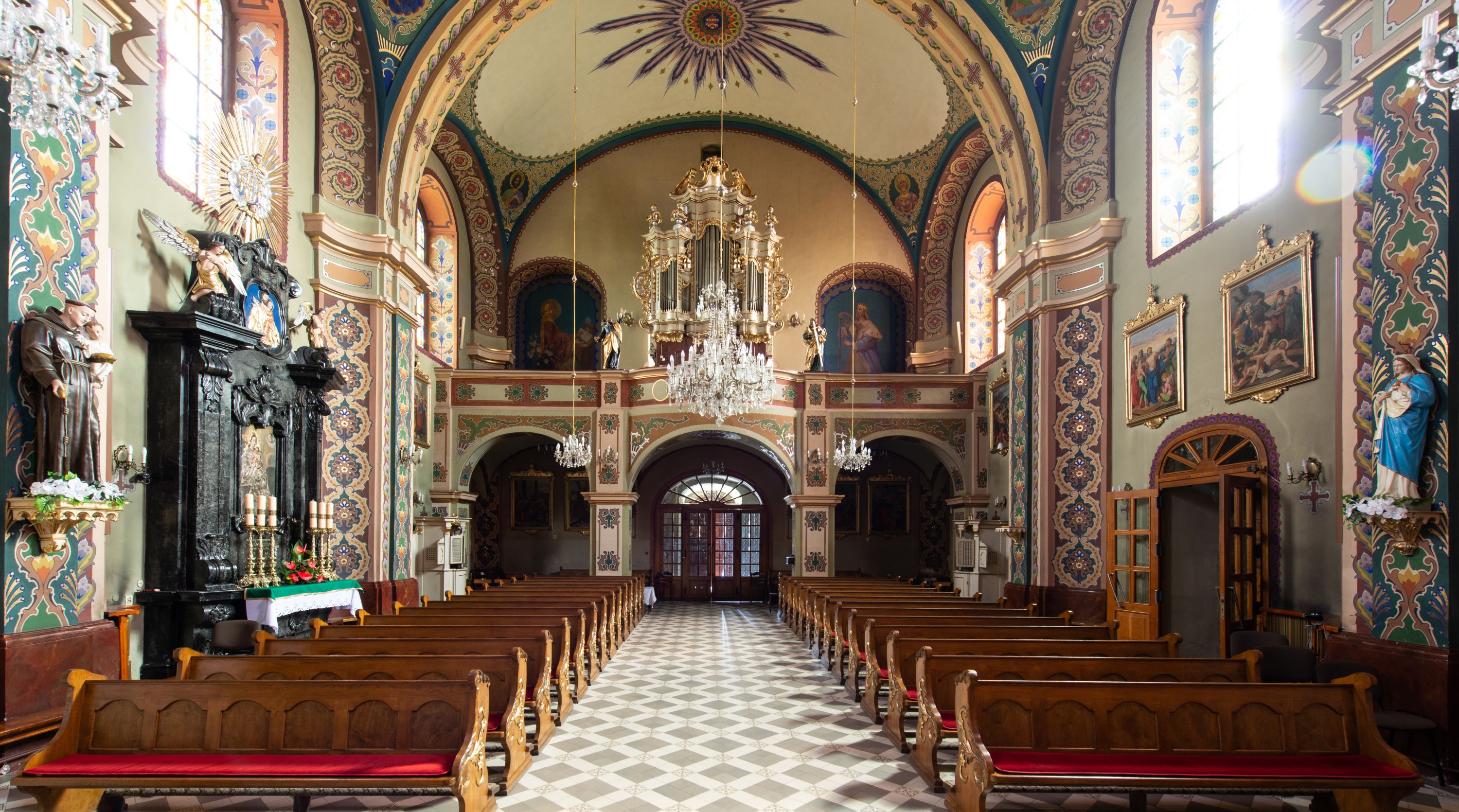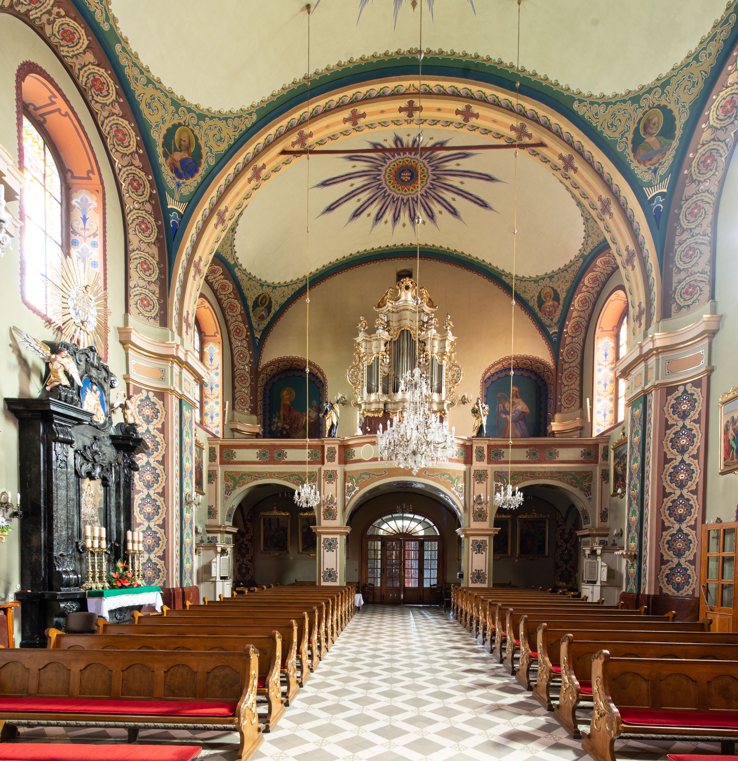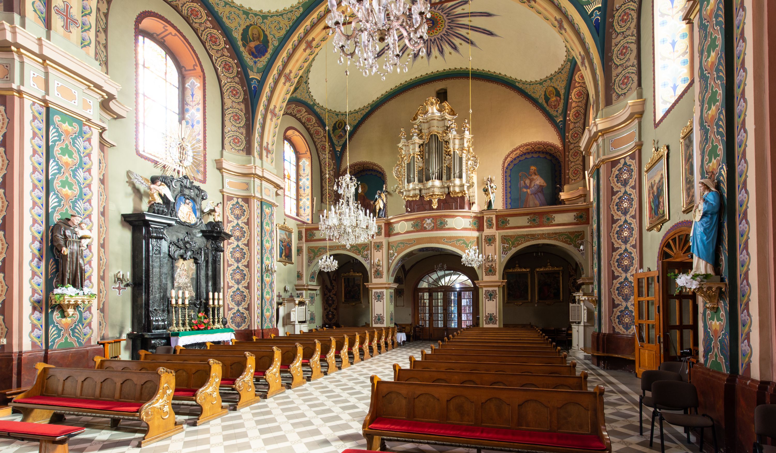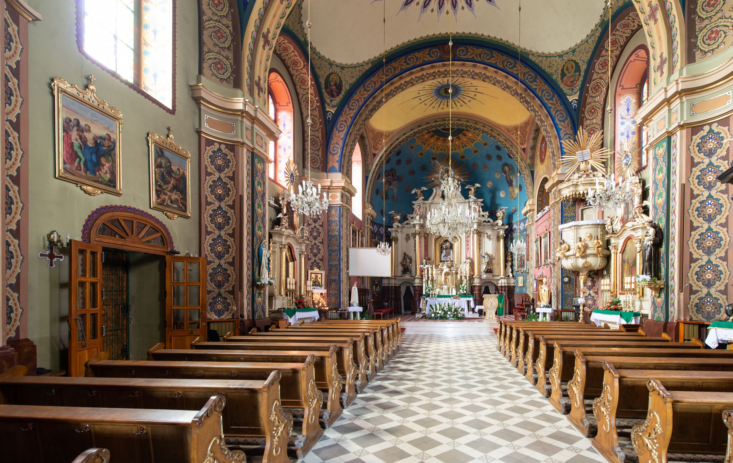 Z dokumentów z 1708 roku wiadomo, że w świątyni znajdował się ołtarz wielki, murowany, z obrazem Marii Niepokalanie Poczętej, w nawie głównej po prawej był ołtarz św. Mikołaja, po lewej retabulum z obrazem Matki Boskiej. W 1732 roku w lewym ołtarzu bocznym umieszczony był już wizerunek Chrystusa. Na łuku tęczowym znajdowała się ambona, a w zachodniej części nawy chór muzyczny z organem o siedmiu głosach.