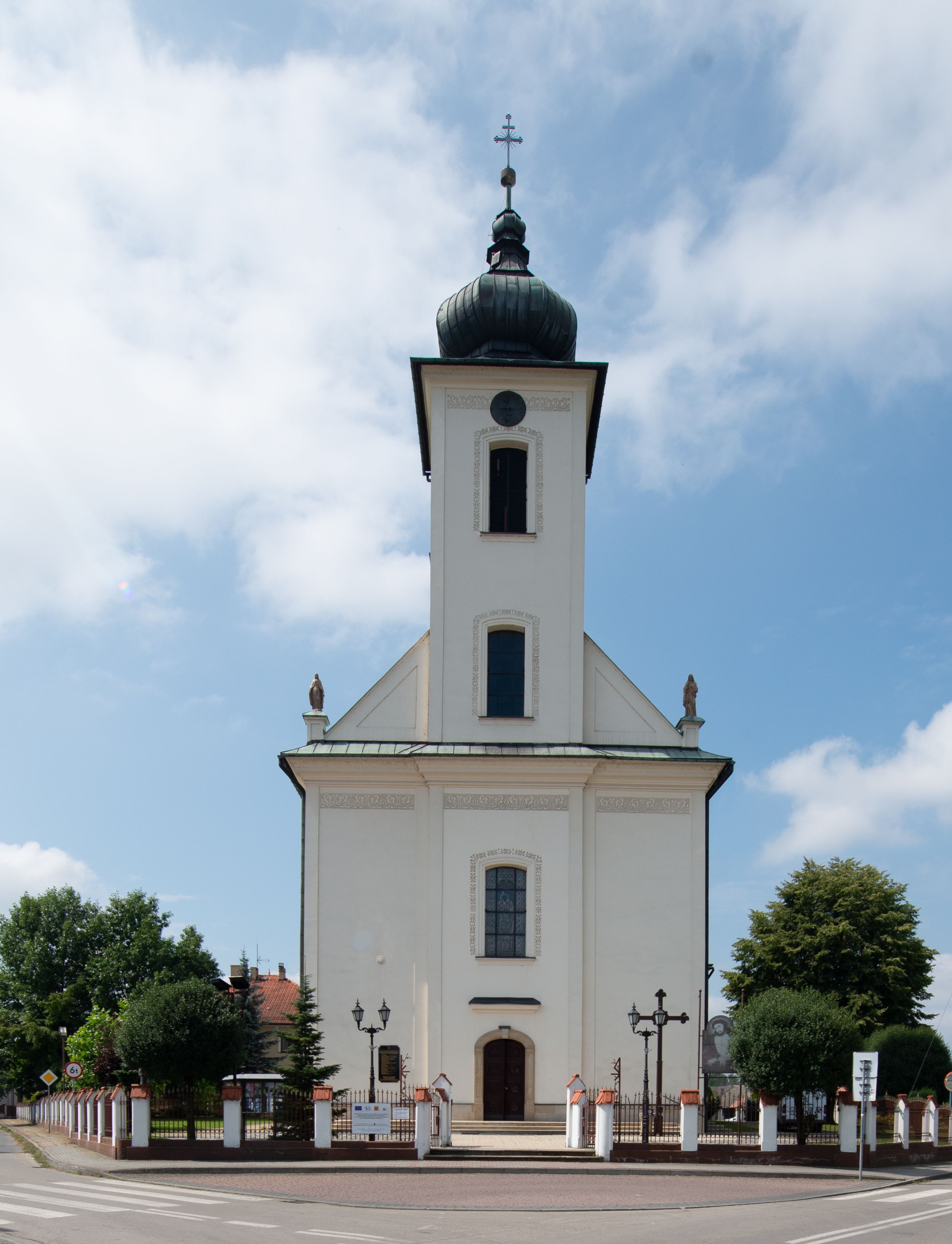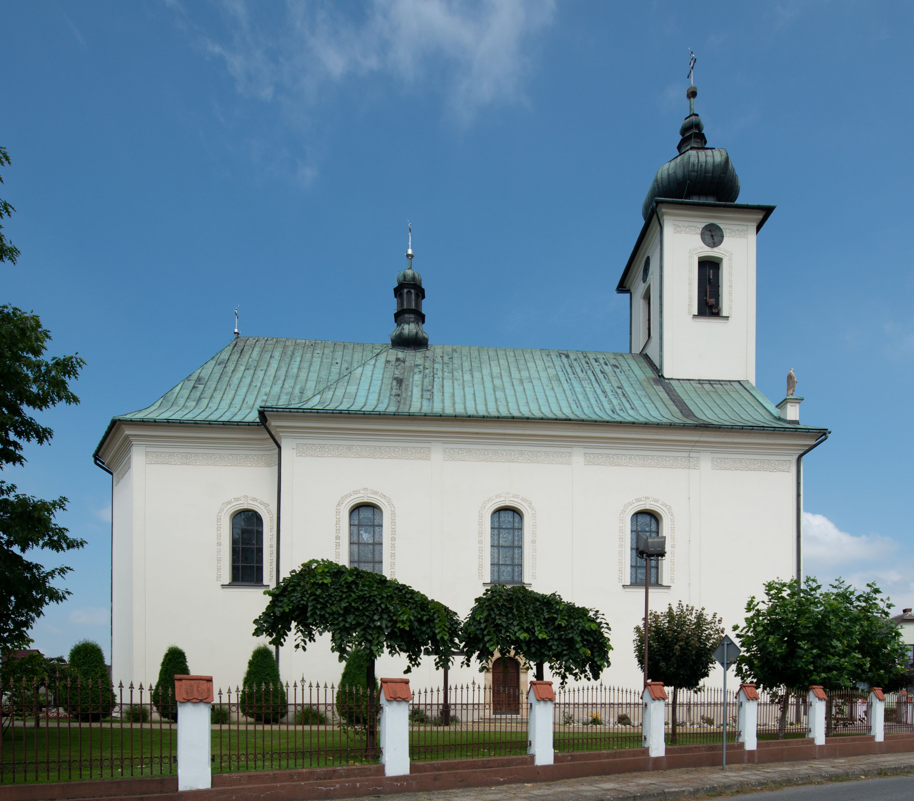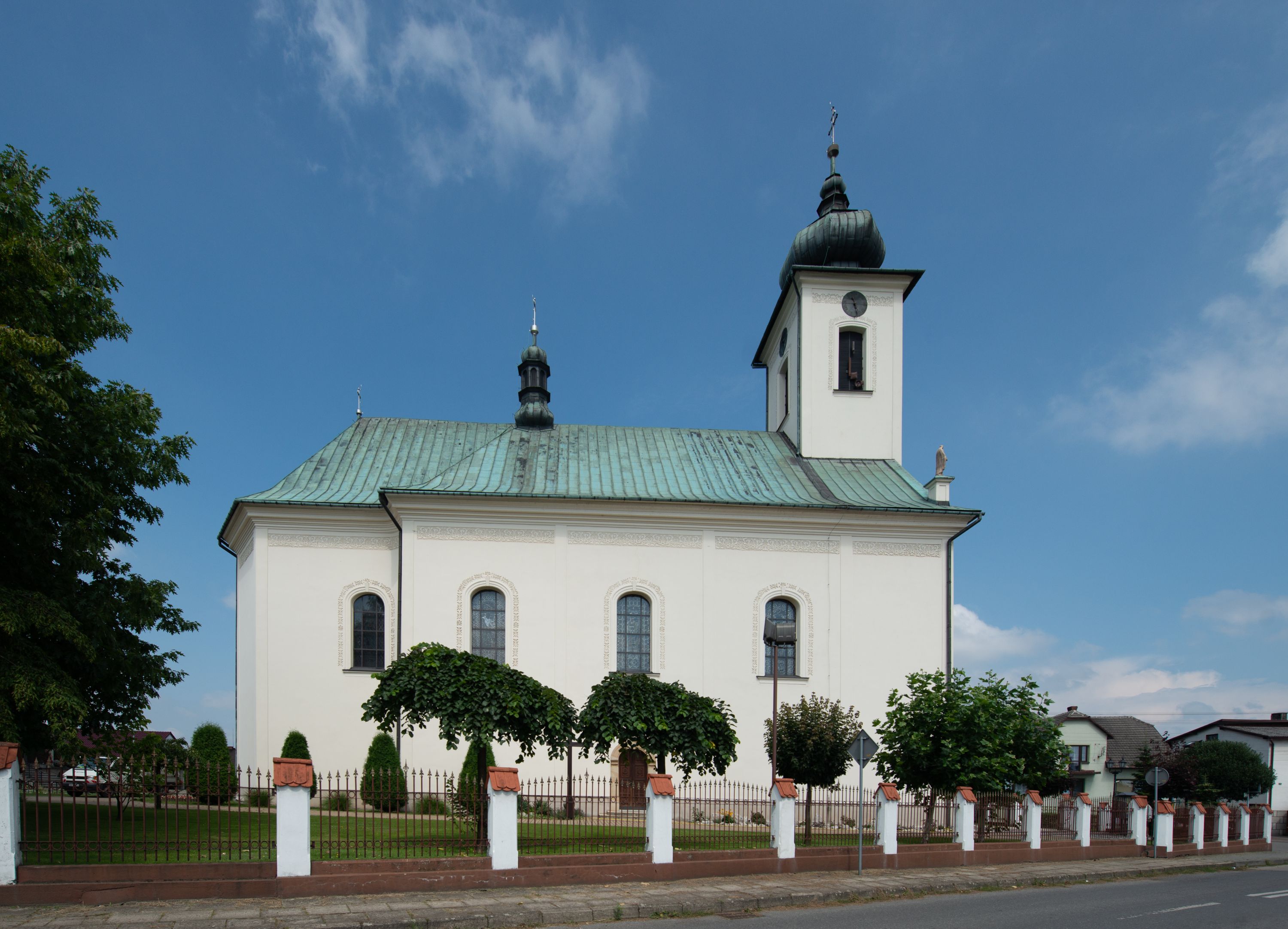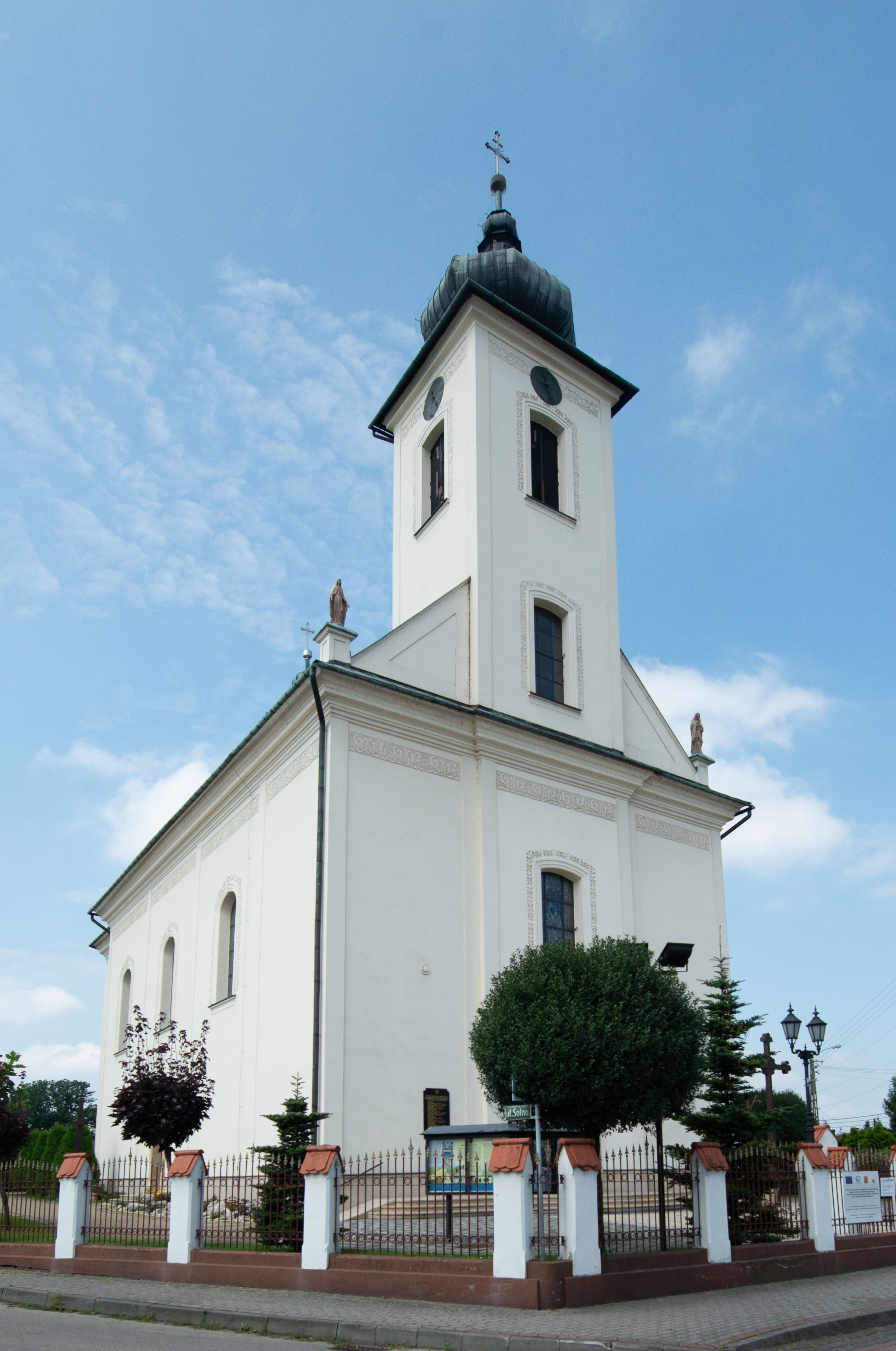 Kościół murowany, tynkowany, na kamiennym podmurowaniu, orientowany, jednonawowy. Prezbiterium prostokątne, krótkie, zamknięte trójbocznie, przy południowej ścianie prostokątna zakrystia z piętrem, z prostokątnym aneksem od zachodu. Nawa główna szersza od prezbiterium, na rzucie prostokąta, od zachodu przylega prostokątny przedsionek z wieżą na planie kwadratu. Wnętrze podzielone na cztery prostokątne przęsła i absydę, wydzielone arkadami, z gurtami spływającymi na zwielokrotnione pilastry. Każde przęsło nakryte sklepieniem o zaokrąglonych narożach. Łuk tęczowy półkolisty. W zachodniej części parapet chóru muzycznego wsparty na dwóch filarach i dwóch półfilarach, tworzących trzy arkady. Fasada trójosiowa, z wbudowaną wieżą, ujętą spłaszczonymi spływami zakończonymi cokołami z figurami. Osie wydzielone lizenami, podtrzymującymi profilowany gzyms, pod nim malowany fryz z dekoracją roślinną. Na osi portal w formie stojącego prostokąta zamkniętego łukiem odcinkowym, ujęty opaską tynkową, zakończoną kluczem. Drzwi drewniane, dwuskrzydłowe. Nad portalem fragment profilowanego gzymsu z daszkiem okapowym. Powyżej, na osi okno w formie stojącego prostokąta zamkniętego łukiem odcinkowym, w profilowanej opasce tynkowej, ujętej malowaną dekoracją geometryczną. Wieża dwukondygnacyjna, flankowana w narożach lizenami podtrzymującymi profilowany gzyms wieńczący. Na ścianie frontowej dwa okna na każdej kondygnacji, w formie stojącego prostokąta zamkniętego łukiem odcinkowym, w profilowanej opasce tynkowej, otoczonej malowaną dekoracją geometryczną, zwieńczone tarczą zegarową. Na pozostałych trzech ścianach wieży po jednym analogicznym oknie w drugiej kondygnacji i tarczy zegarowej. Elewacje północna i południowa artykułowane lizenami podtrzymującymi profilowany gzyms, z dekoracyjnym fryzem poniżej. Okna w formie stojącego prostokąta zamkniętego łukiem odcinkowym, w profilowanej opasce tynkowej z kluczem, ujętej malowaną dekoracją geometryczną: cztery w północnej i trzy w południowej. W zakrystii jedno prostokątne okno od południa i dwa w każdej kondygnacji od wschodu. Nawa główna i prezbiterium nakryte osobnymi dachami dwuspadowymi. Na ich połączeniu wieżyczka na sygnaturkę z latarnią, zwieńczona hełmem baniastym z krzyżem. Wieża nakryta hełmem baniastym zakończonym kulą z krzyżem. Zakrystia przykryta dachem trójspadowym, a aneks czterospadowym.