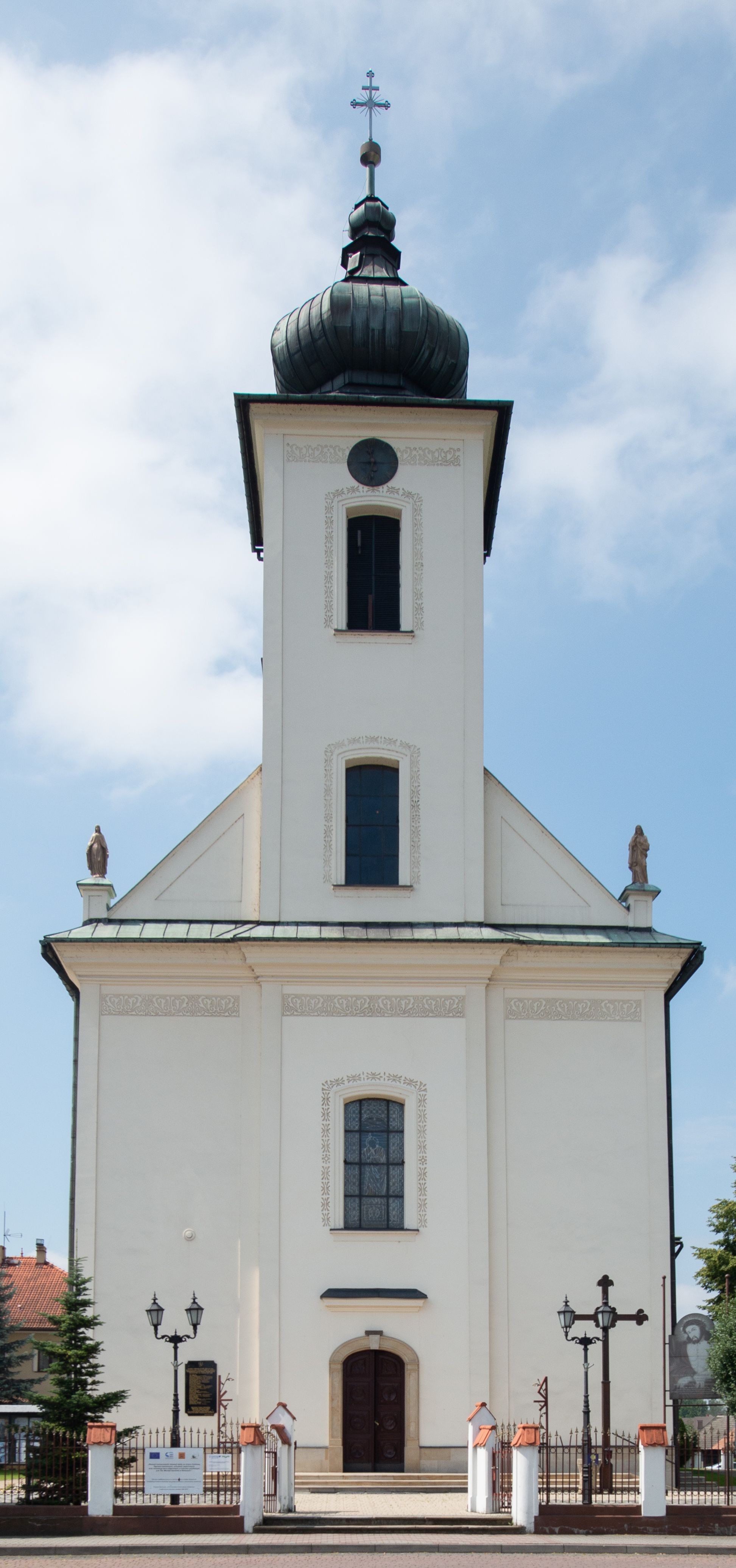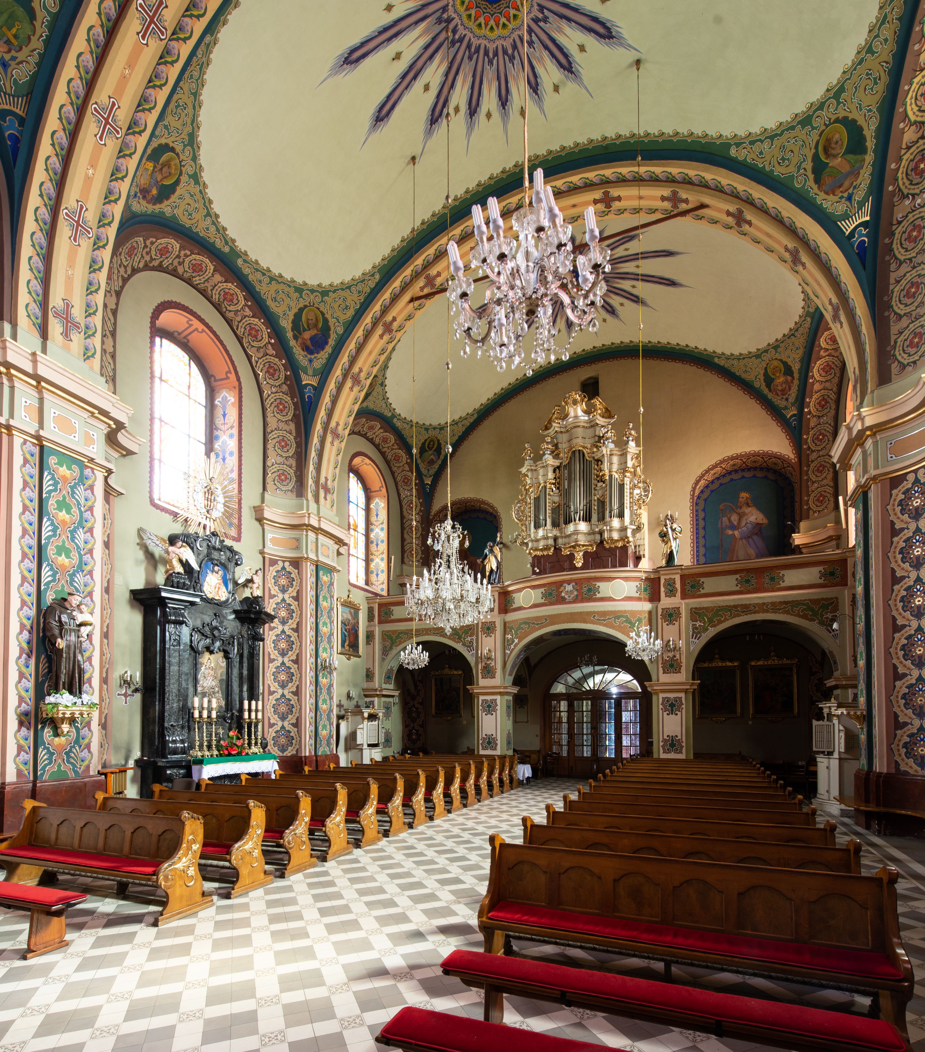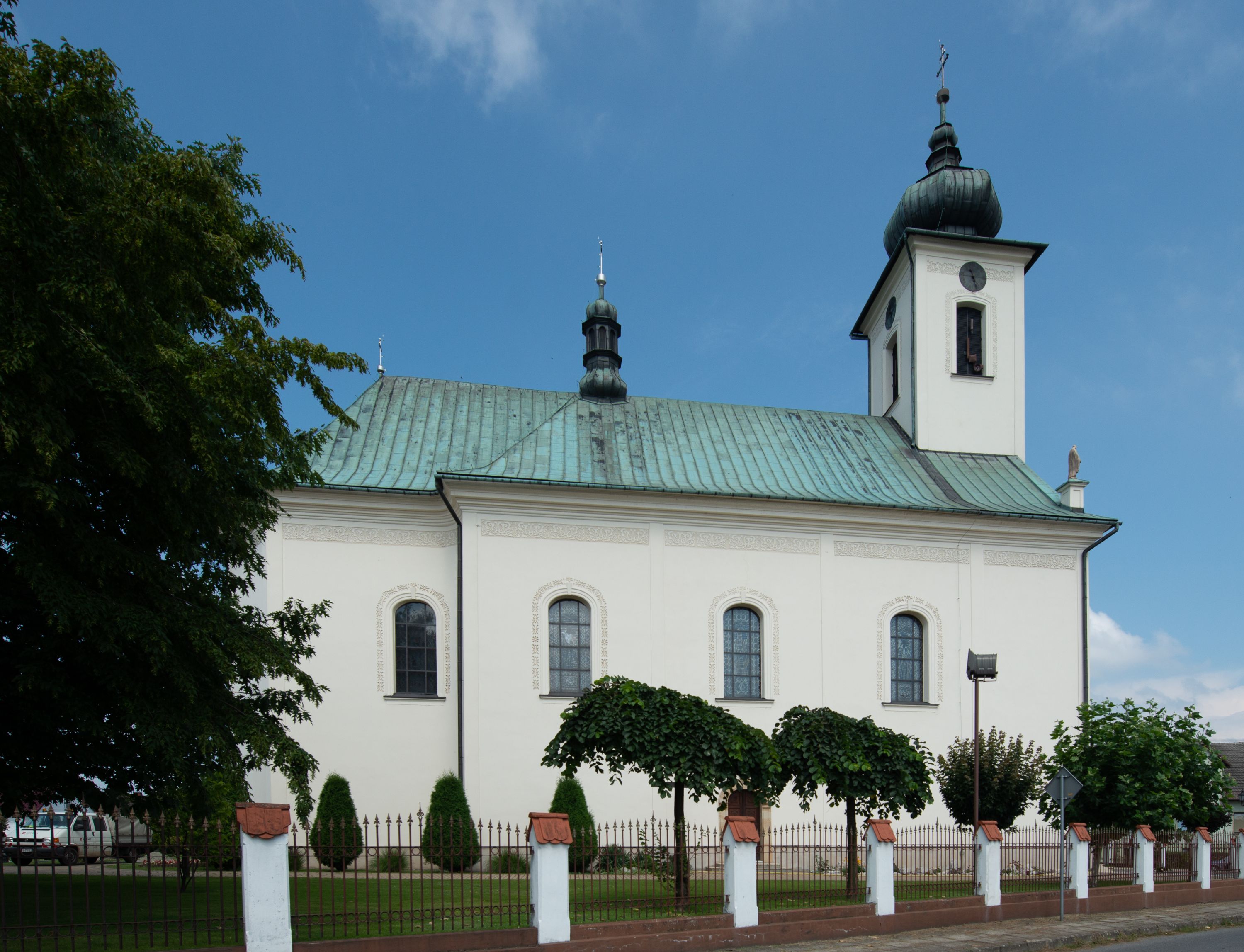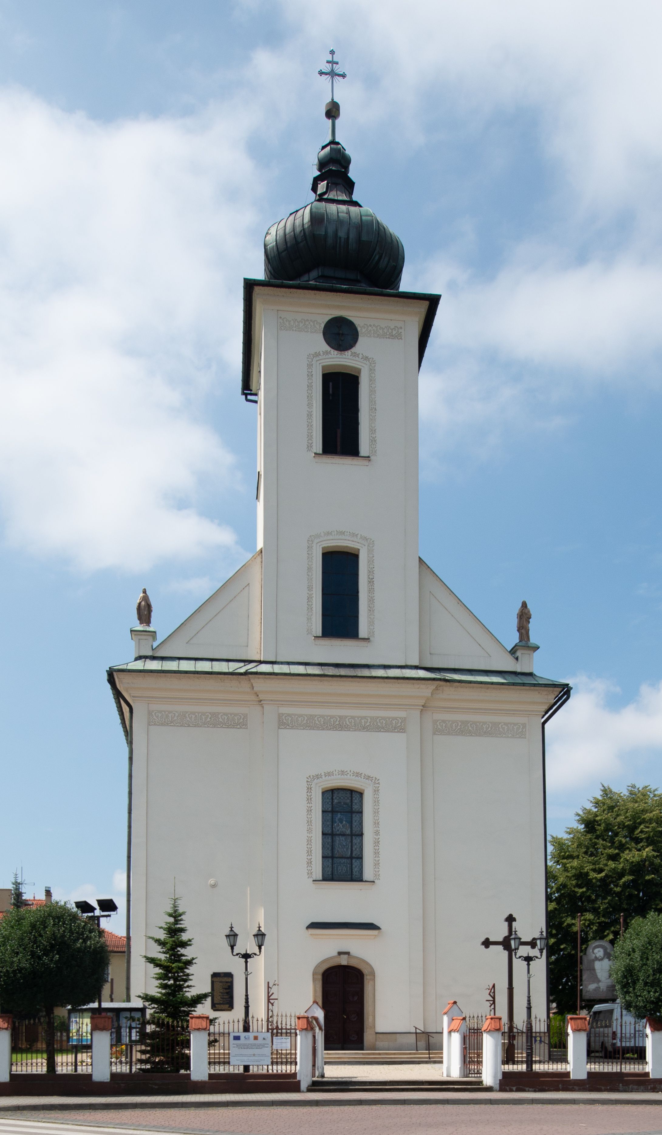 Kościół murowany, tynkowany, na kamiennym podmurowaniu, orientowany, jednonawowy. Prezbiterium prostokątne, krótkie, zamknięte trójbocznie, przy południowej ścianie prostokątna zakrystia z piętrem, z prostokątnym aneksem od zachodu. Nawa główna szersza od prezbiterium, na rzucie prostokąta, od zachodu przylega prostokątny przedsionek z wieżą na planie kwadratu. Wnętrze podzielone na cztery prostokątne przęsła i absydę, wydzielone arkadami, z gurtami spływającymi na zwielokrotnione pilastry. Każde przęsło nakryte sklepieniem o zaokrąglonych narożach. Łuk tęczowy półkolisty. W zachodniej części parapet chóru muzycznego wsparty na dwóch filarach i dwóch półfilarach, tworzących trzy arkady. Fasada trójosiowa, z wbudowaną wieżą, ujętą spłaszczonymi spływami zakończonymi cokołami z figurami. Osie wydzielone lizenami, podtrzymującymi profilowany gzyms, pod nim malowany fryz z dekoracją roślinną. Na osi portal w formie stojącego prostokąta zamkniętego łukiem odcinkowym, ujęty opaską tynkową, zakończoną kluczem. Drzwi drewniane, dwuskrzydłowe. Nad portalem fragment profilowanego gzymsu z daszkiem okapowym. Powyżej, na osi okno w formie stojącego prostokąta zamkniętego łukiem odcinkowym, w profilowanej opasce tynkowej, ujętej malowaną dekoracją geometryczną. Wieża dwukondygnacyjna, flankowana w narożach lizenami podtrzymującymi profilowany gzyms wieńczący. Na ścianie frontowej dwa okna na każdej kondygnacji, w formie stojącego prostokąta zamkniętego łukiem odcinkowym, w profilowanej opasce tynkowej, otoczonej malowaną dekoracją geometryczną, zwieńczone tarczą zegarową. Na pozostałych trzech ścianach wieży po jednym analogicznym oknie w drugiej kondygnacji i tarczy zegarowej. Elewacje północna i południowa artykułowane lizenami podtrzymującymi profilowany gzyms, z dekoracyjnym fryzem poniżej. Okna w formie stojącego prostokąta zamkniętego łukiem odcinkowym, w profilowanej opasce tynkowej z kluczem, ujętej malowaną dekoracją geometryczną: cztery w północnej i trzy w południowej. W zakrystii jedno prostokątne okno od południa i dwa w każdej kondygnacji od wschodu. Nawa główna i prezbiterium nakryte osobnymi dachami dwuspadowymi. Na ich połączeniu wieżyczka na sygnaturkę z latarnią, zwieńczona hełmem baniastym z krzyżem. Wieża nakryta hełmem baniastym zakończonym kulą z krzyżem. Zakrystia przykryta dachem trójspadowym, a aneks czterospadowym.