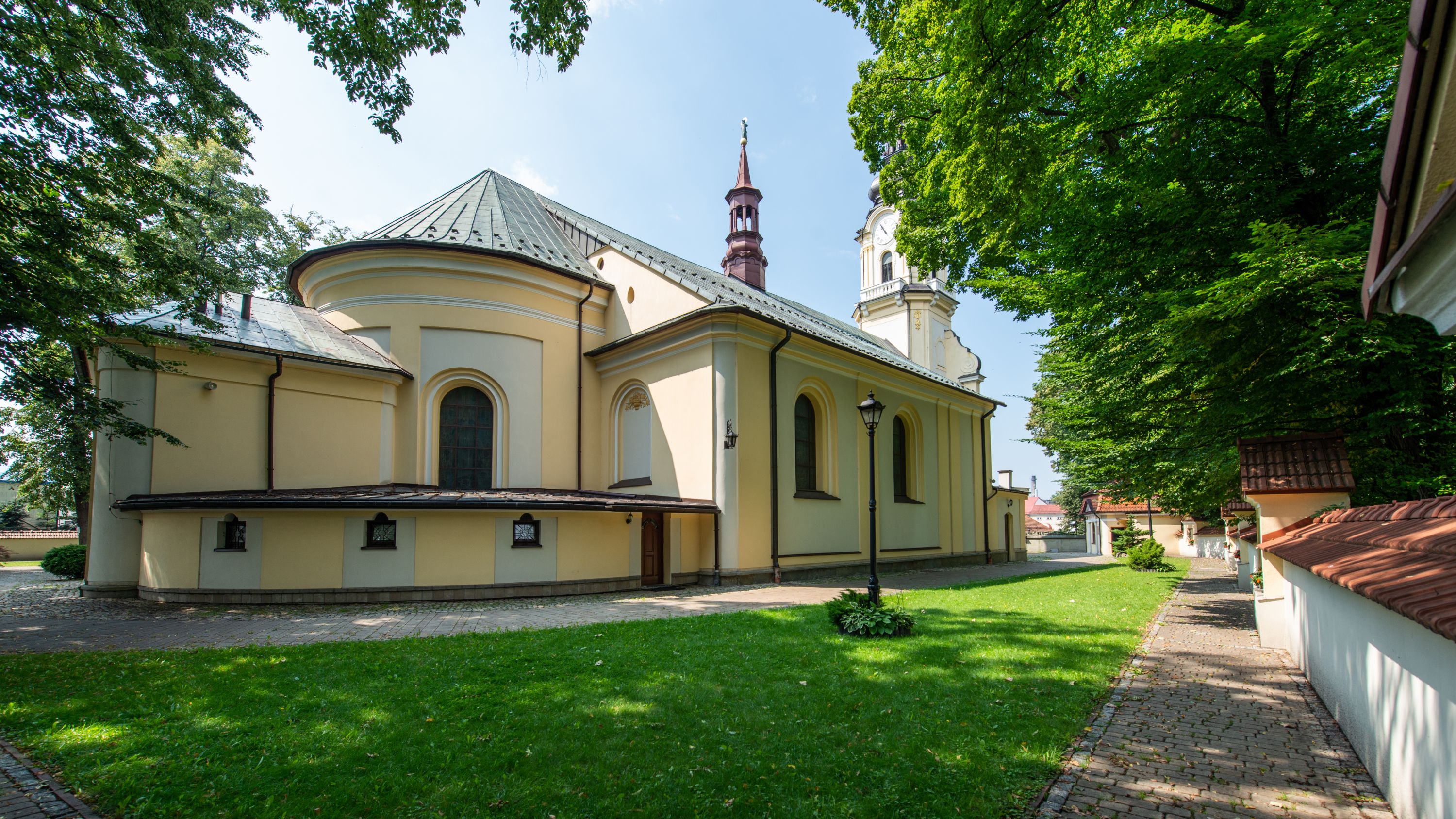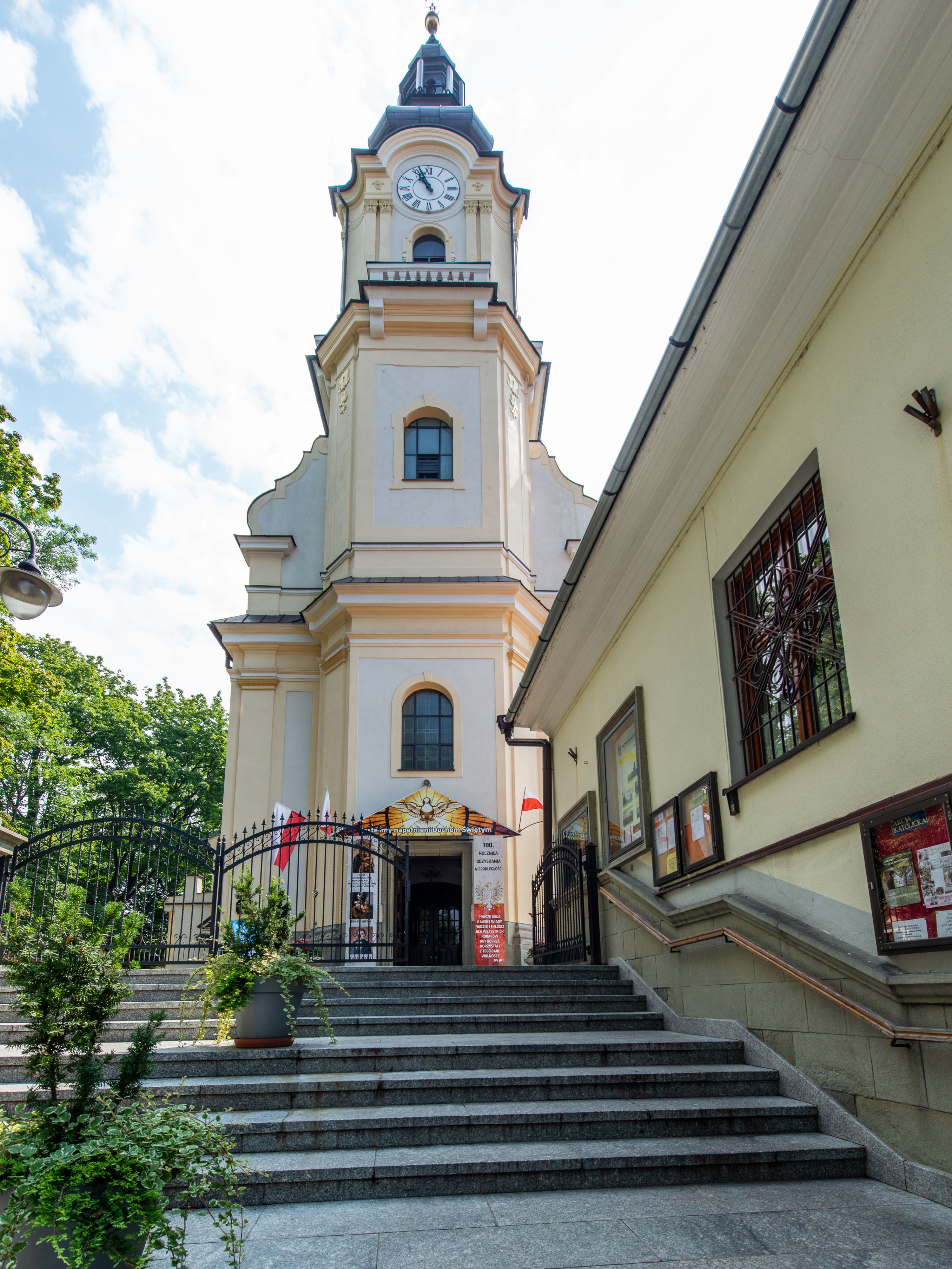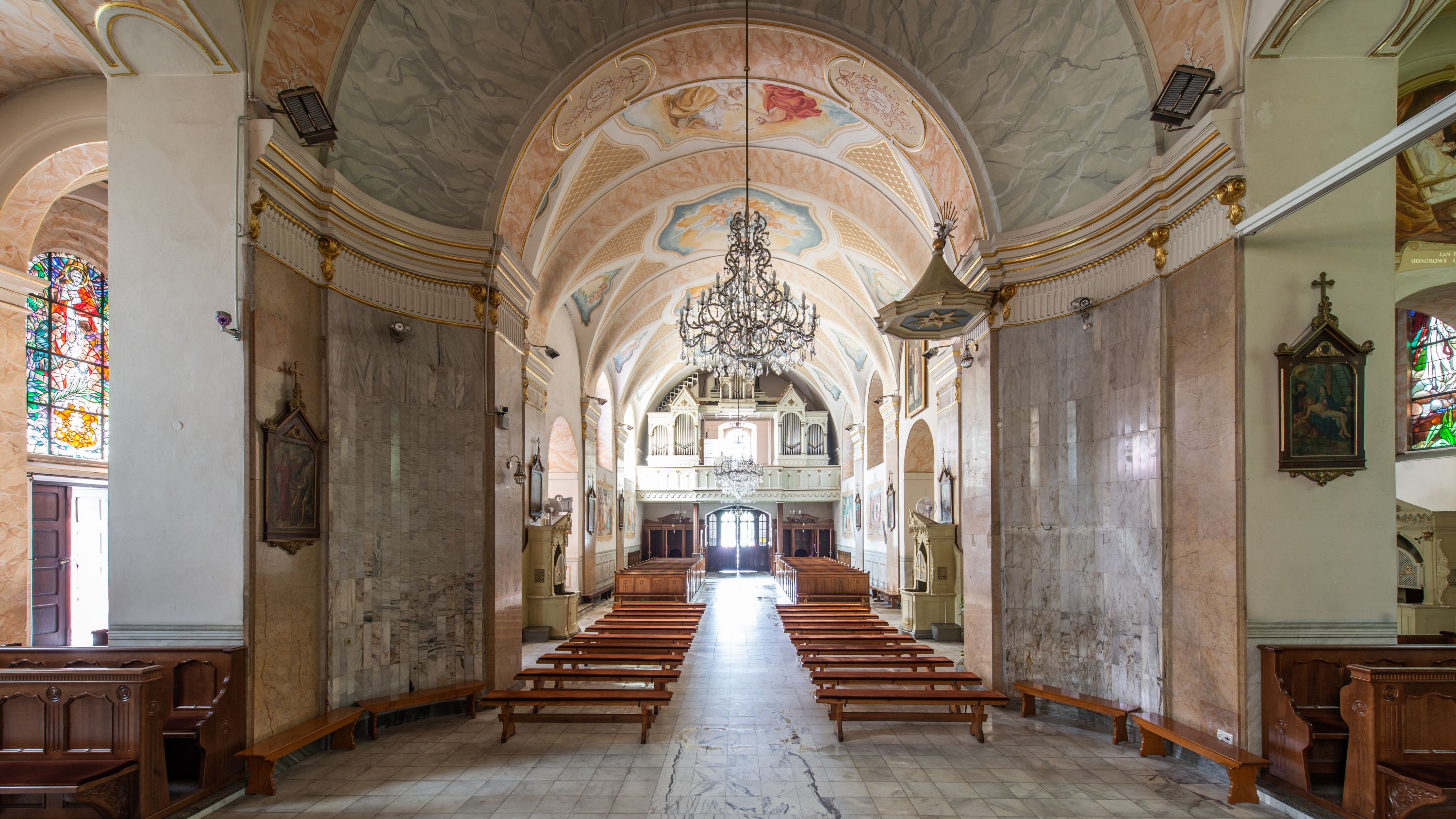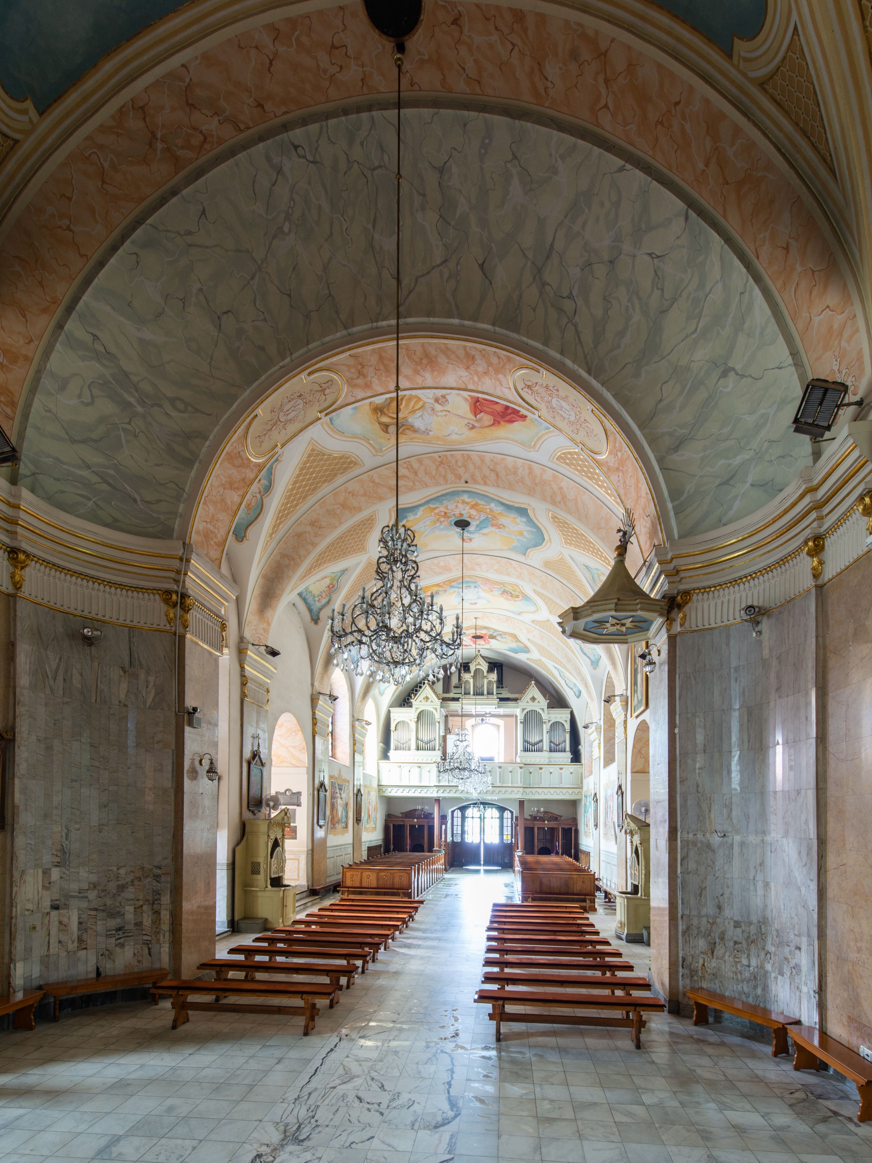Po kilkukrotnych przekształceniach kościół składa się z prostokątnej, czteroprzęsłowej nawy głównej, dwóch, dwuprzęsłowych naw bocznych, przerobionych z dawnych kaplic i jednoprzęsłowego prezbiterium zamkniętego od wschodu apsydą. Na przedłużeniu apsydy otoczonej półkolistym aneksem wzniesiono czworoboczną, piętrową zakrystią. Od zachodu do nawy przylega wysunięta do przodu czworoboczna wieża o ściętych narożach z urządzoną w przyziemiu kruchtą. Wieża uzyskała trzy kondygnacje wyznaczone za pomocą profilowanych gzymsów. Środkowe piętro wieży połączono z bocznymi częściami fasady za pomocą wolut. Na dwóch pierwszych kondygnacjach ścięte naroża artykułowano za pomocą pilastrów o prostych głowicach. Pilastry drugiej kondygnacji ozdobiono krótkimi zwisami kampanul. Kondygnacja trzecia także została wzniesiona na rzucie czworoboku ale o wklęsłych narożach. Jej ściany flankują pary pilastrów o korynckich głowicach podtrzymujące imposty wspierające półkoliście wyłamane na osi belkowanie wspierające baniasty hełm z latarnią zwieńczony krzyżem z koroną. Pomiędzy impostami pod wyłamanym belkowaniem umieszczono tarcze zegarowe. Na trzeciej kondygnacji ponad belkowaniem od zachodu nadwieszono czworoboczny balkon z tralkową balustradą. Sześcioboczną sygnaturkę z latarnią zwieńczoną stożkowym hełmem z ustawioną na szczycie figurką Matki Boskiej Niepokalanie Poczętej zawieszono na siodłowym dachu kościoła w części wschodniej nawy głównej. Elewacje boczne kościoła rozczłonkowano za pomocą podziałów ramowych lub lizenowych. Wnętrze świątyni nakryto sklepieniem kolebkowym wspartym na gurtach, przechodzących na przyścienne pilastry podtrzymujące odcinki przerwanego belkowania. W ostanim zachodnim przęśle urządzono chór muzyczny wsparty na dwóch filarach z wypukłym na osi parapetem, artykułowanym za pomocą pilastrów i par arkadek. W prezbiterium ustawiono ołtarz główny oraz ambonę, a w nawach ołtarze boczne.