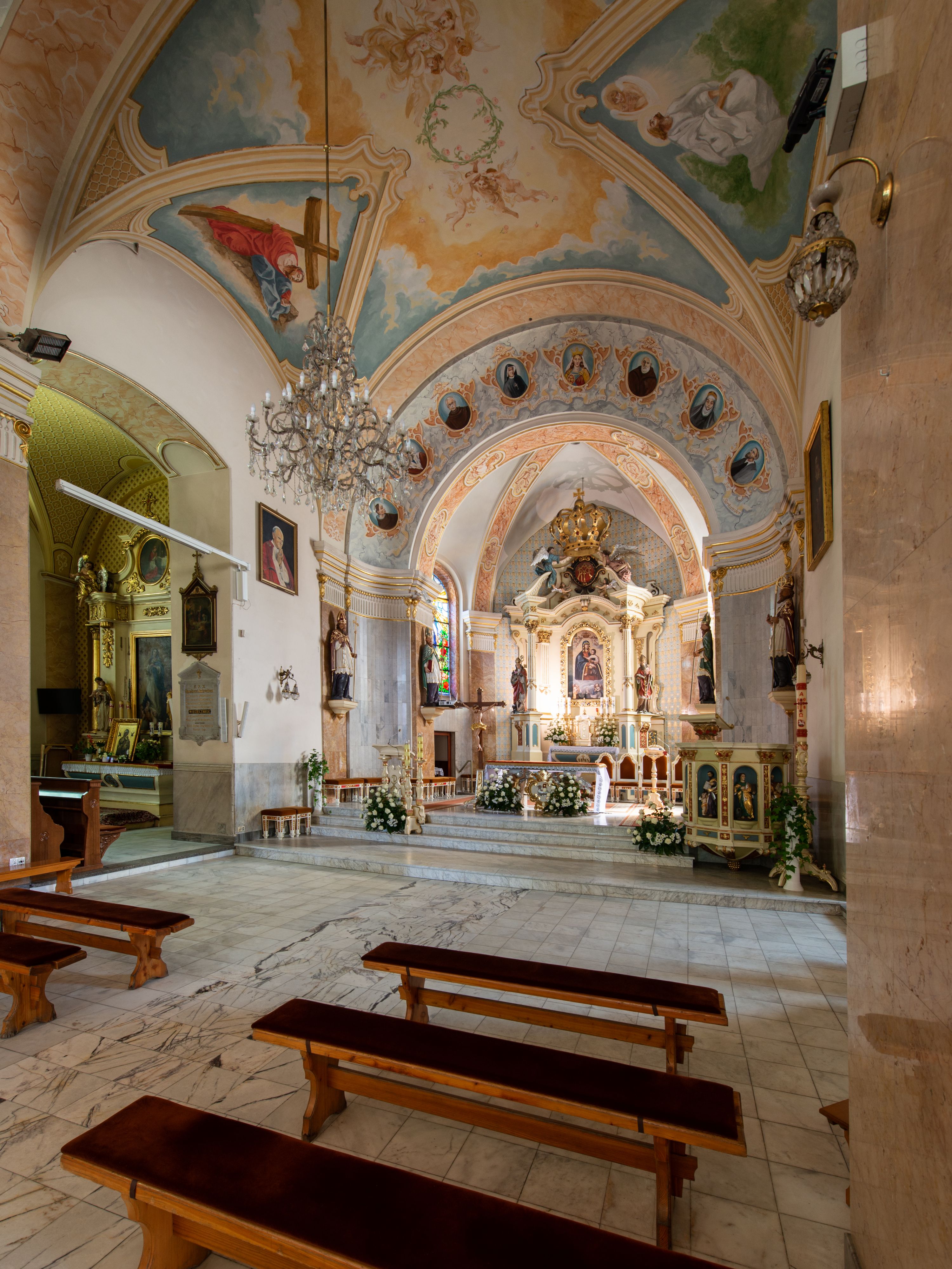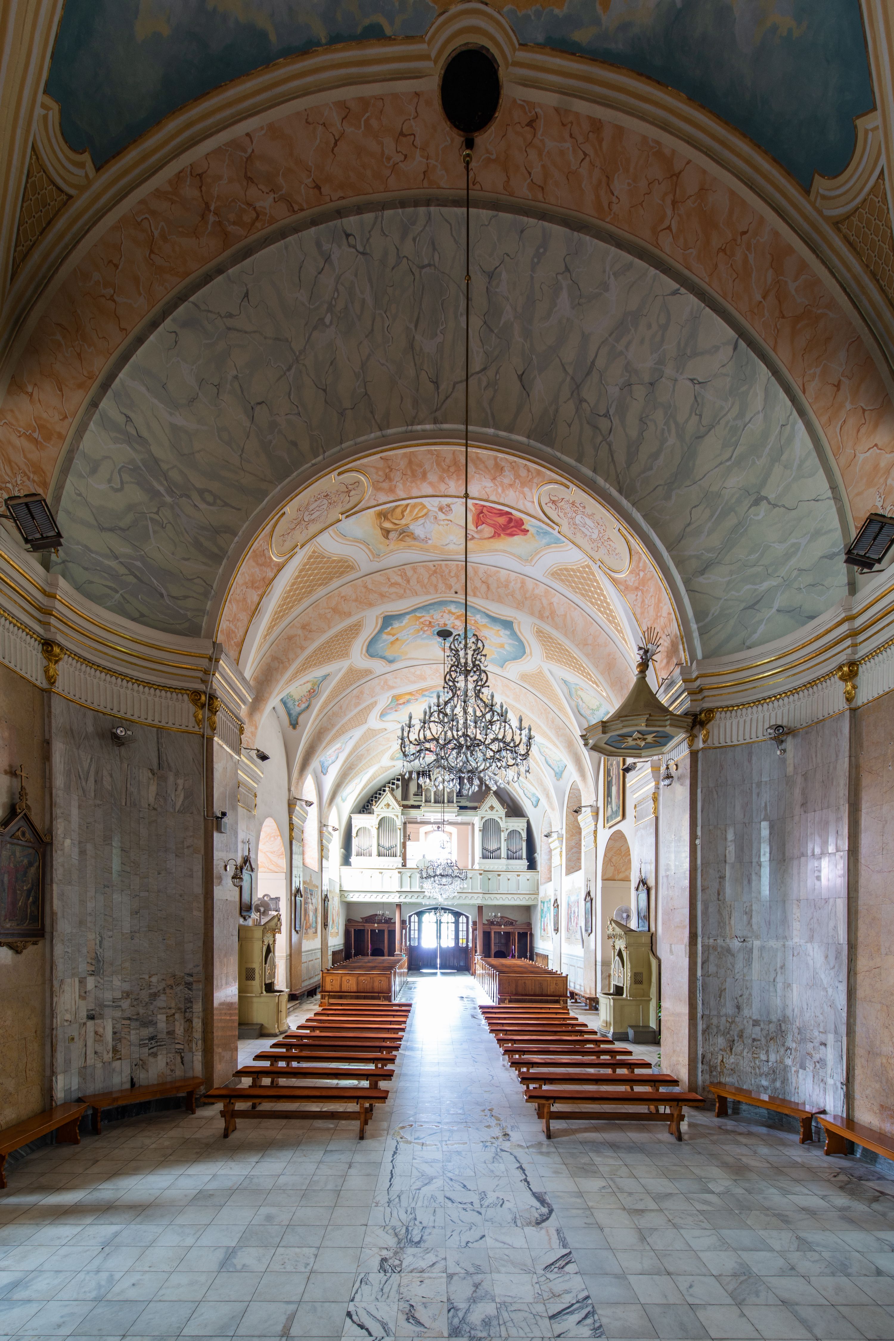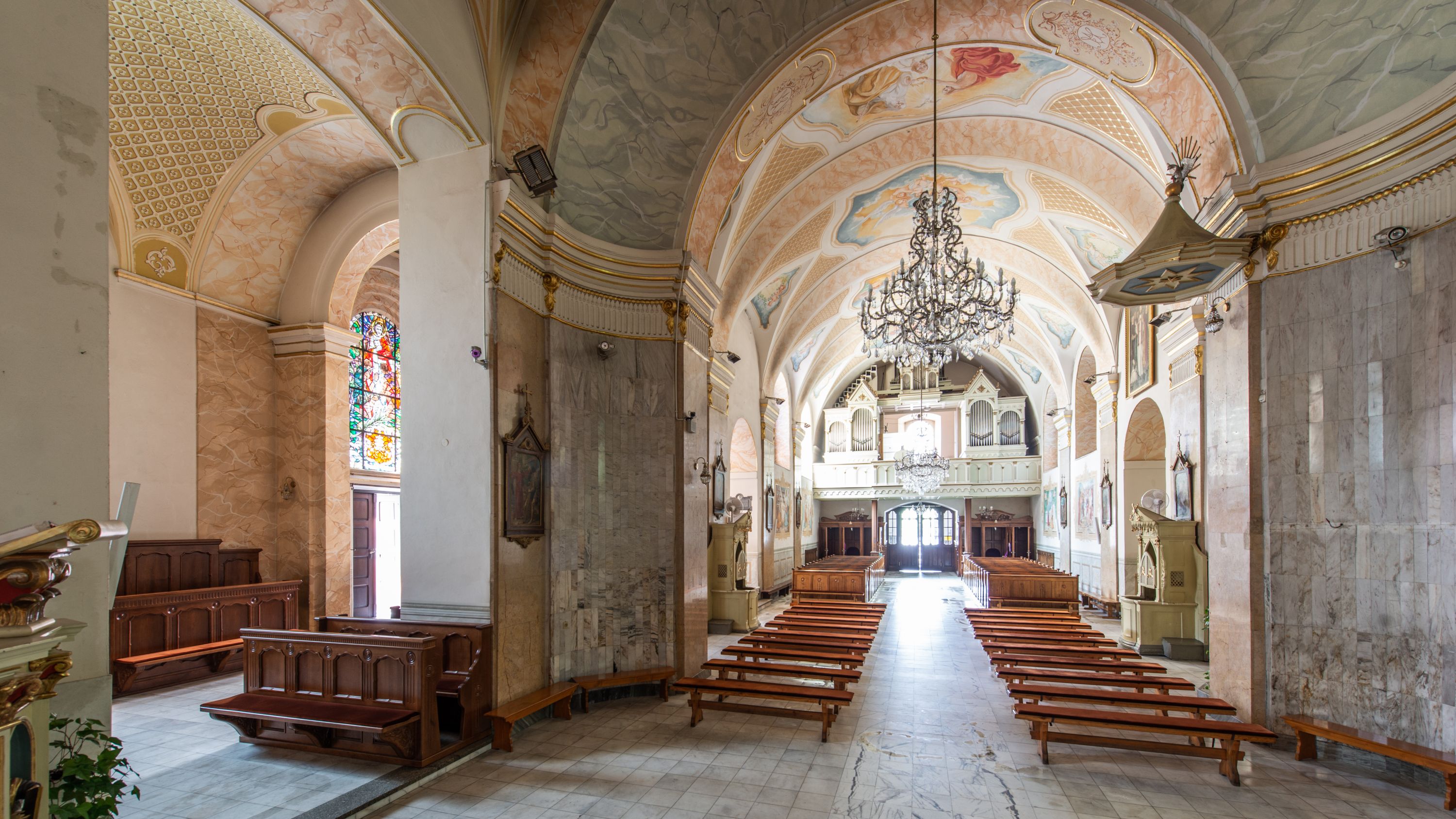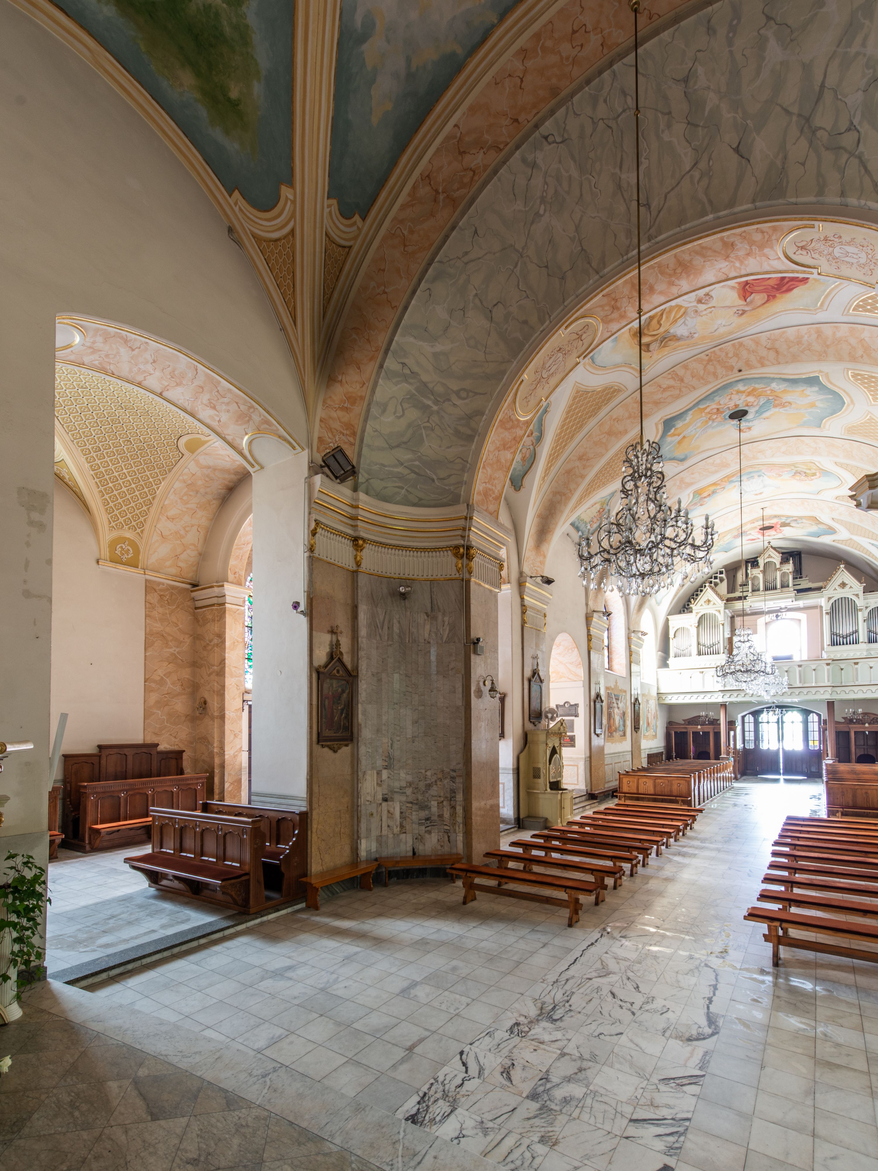 Po kilkukrotnych przekształceniach kościół składa się z prostokątnej, czteroprzęsłowej nawy głównej, dwóch, dwuprzęsłowych naw bocznych, przerobionych z dawnych kaplic i jednoprzęsłowego prezbiterium zamkniętego od wschodu apsydą. Na przedłużeniu apsydy otoczonej półkolistym aneksem wzniesiono czworoboczną, piętrową zakrystią. Od zachodu do nawy przylega wysunięta do przodu czworoboczna wieża o ściętych narożach z urządzoną w przyziemiu kruchtą. Wieża uzyskała trzy kondygnacje wyznaczone za pomocą profilowanych gzymsów. Środkowe piętro wieży połączono z bocznymi częściami fasady za pomocą wolut. Na dwóch pierwszych kondygnacjach ścięte naroża artykułowano za pomocą pilastrów o prostych głowicach. Pilastry drugiej kondygnacji ozdobiono krótkimi zwisami kampanul. Kondygnacja trzecia także została wzniesiona na rzucie czworoboku ale o wklęsłych narożach. Jej ściany flankują pary pilastrów o korynckich głowicach podtrzymujące imposty wspierające półkoliście wyłamane na osi belkowanie wspierające baniasty hełm z latarnią zwieńczony krzyżem z koroną. Pomiędzy impostami pod wyłamanym belkowaniem umieszczono tarcze zegarowe. Na trzeciej kondygnacji ponad belkowaniem od zachodu nadwieszono czworoboczny balkon z tralkową balustradą. Sześcioboczną sygnaturkę z latarnią zwieńczoną stożkowym hełmem z ustawioną na szczycie figurką Matki Boskiej Niepokalanie Poczętej zawieszono na siodłowym dachu kościoła w części wschodniej nawy głównej. Elewacje boczne kościoła rozczłonkowano za pomocą podziałów ramowych lub lizenowych. Wnętrze świątyni nakryto sklepieniem kolebkowym wspartym na gurtach, przechodzących na przyścienne pilastry podtrzymujące odcinki przerwanego belkowania. W ostanim zachodnim przęśle urządzono chór muzyczny wsparty na dwóch filarach z wypukłym na osi parapetem, artykułowanym za pomocą pilastrów i par arkadek. W prezbiterium ustawiono ołtarz główny oraz ambonę, a w nawach ołtarze boczne.