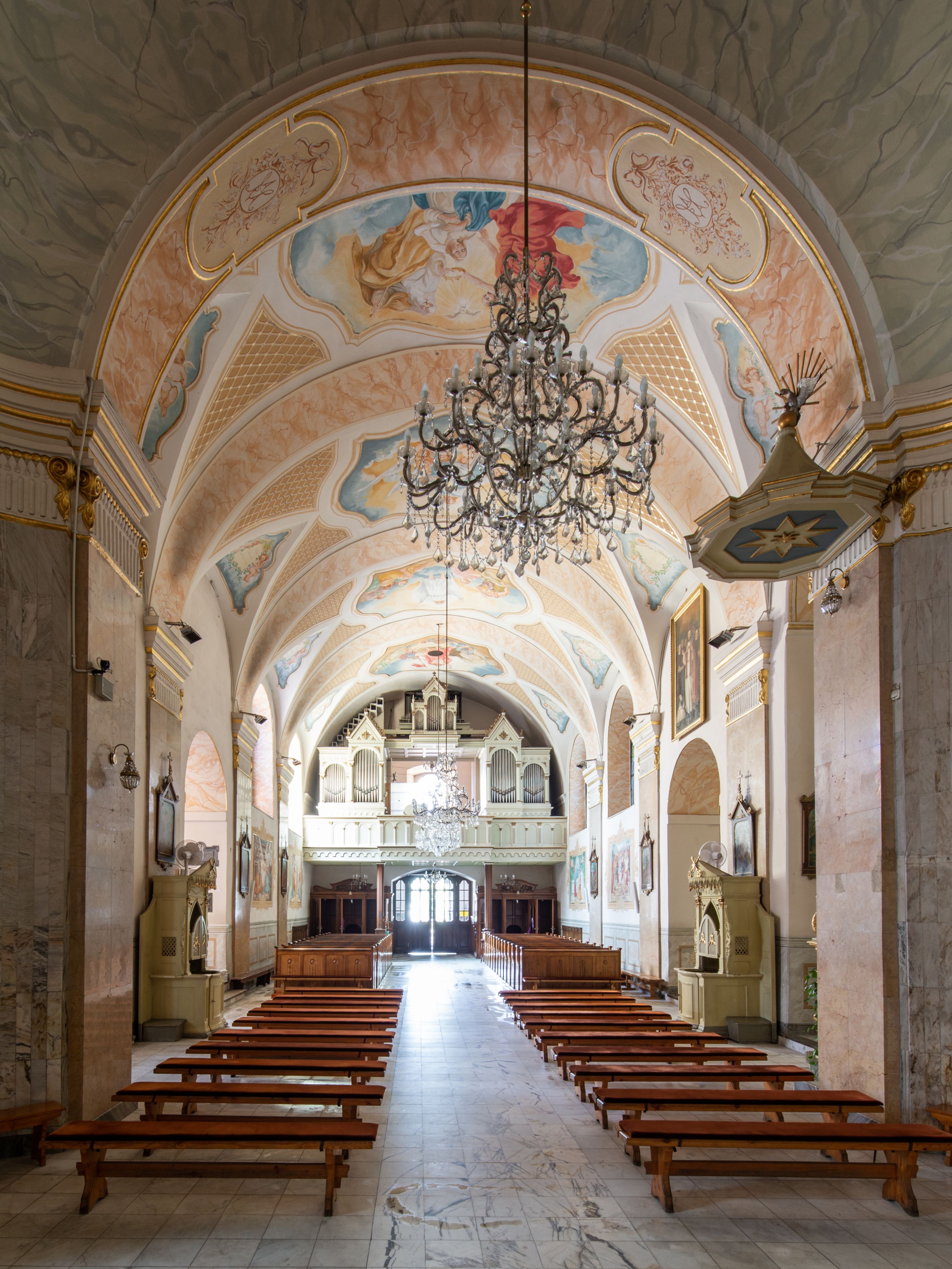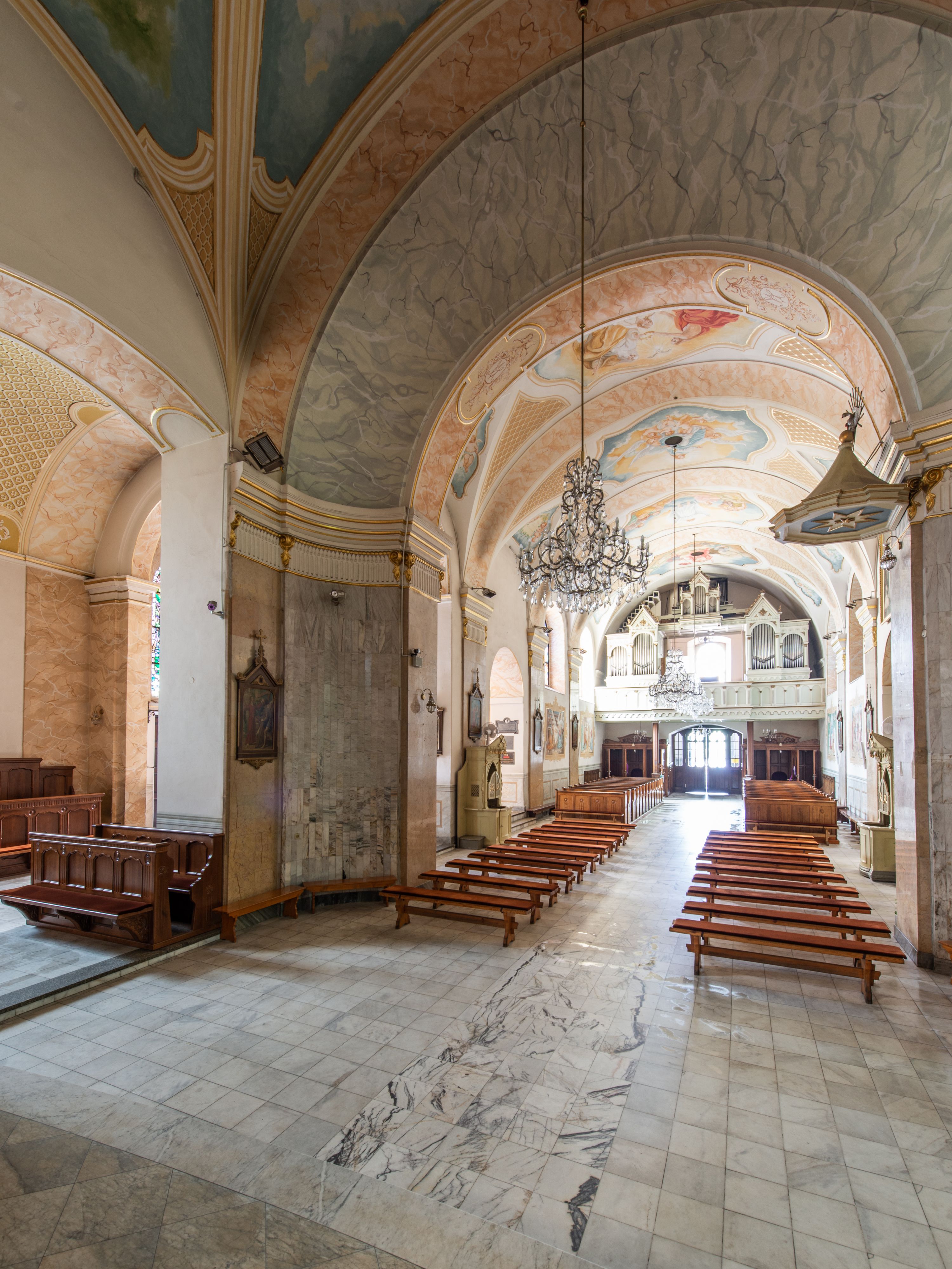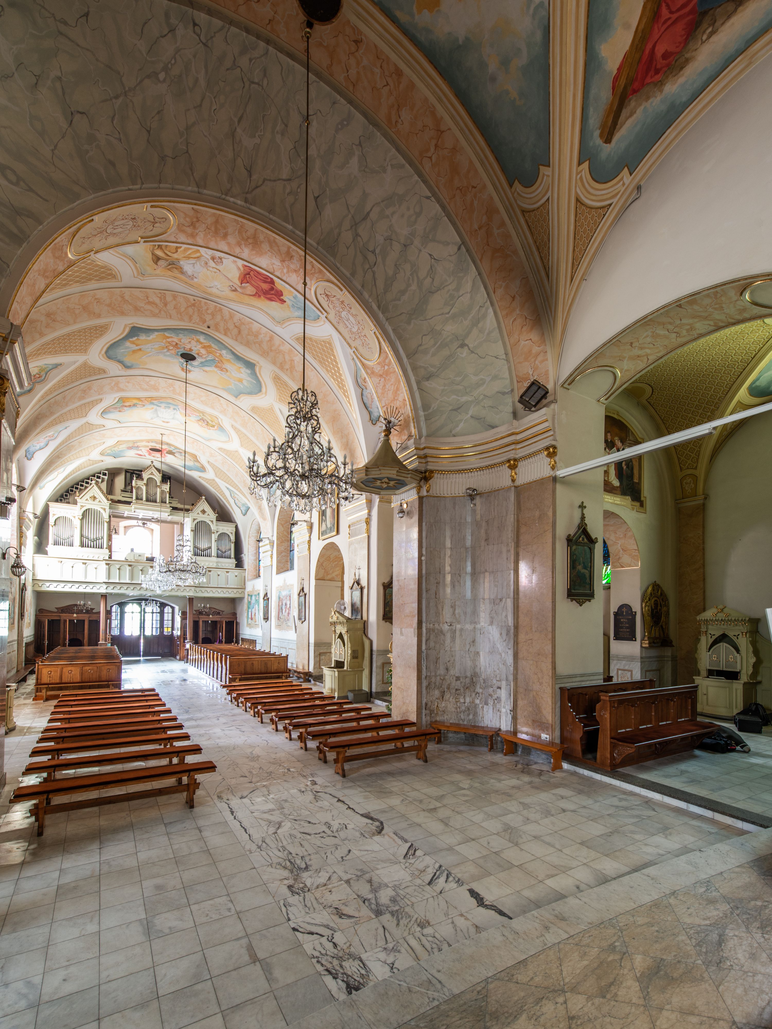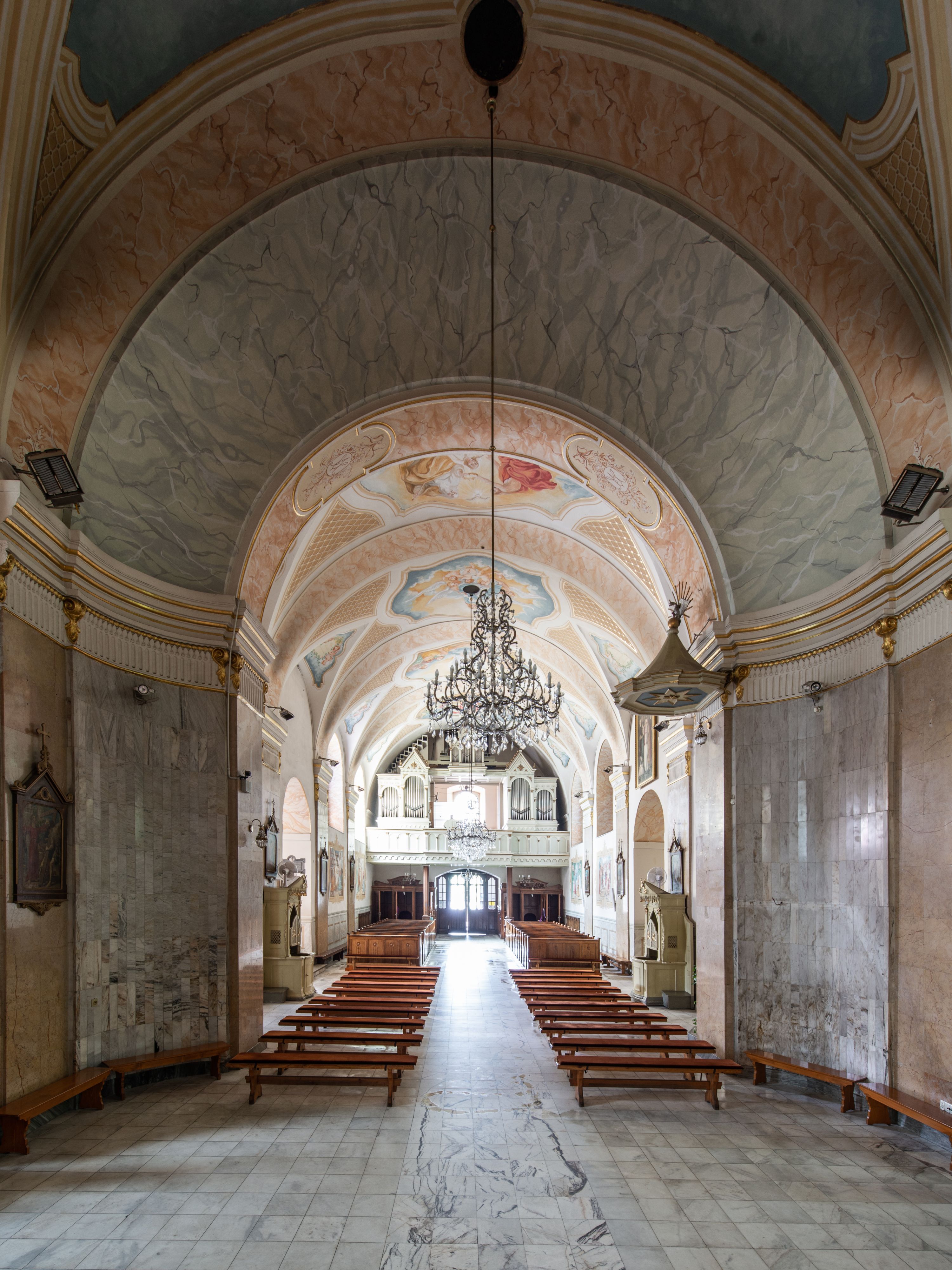 Po kilkukrotnych przekształceniach kościół składa się z prostokątnej, czteroprzęsłowej nawy głównej, dwóch, dwuprzęsłowych naw bocznych, przerobionych z dawnych kaplic i jednoprzęsłowego prezbiterium zamkniętego od wschodu apsydą. Na przedłużeniu apsydy otoczonej półkolistym aneksem wzniesiono czworoboczną, piętrową zakrystią. Od zachodu do nawy przylega wysunięta do przodu czworoboczna wieża o ściętych narożach z urządzoną w przyziemiu kruchtą. Wieża uzyskała trzy kondygnacje wyznaczone za pomocą profilowanych gzymsów. Środkowe piętro wieży połączono z bocznymi częściami fasady za pomocą wolut. Na dwóch pierwszych kondygnacjach ścięte naroża artykułowano za pomocą pilastrów o prostych głowicach. Pilastry drugiej kondygnacji ozdobiono krótkimi zwisami kampanul. Kondygnacja trzecia także została wzniesiona na rzucie czworoboku ale o wklęsłych narożach. Jej ściany flankują pary pilastrów o korynckich głowicach podtrzymujące imposty wspierające półkoliście wyłamane na osi belkowanie wspierające baniasty hełm z latarnią zwieńczony krzyżem z koroną. Pomiędzy impostami pod wyłamanym belkowaniem umieszczono tarcze zegarowe. Na trzeciej kondygnacji ponad belkowaniem od zachodu nadwieszono czworoboczny balkon z tralkową balustradą. Sześcioboczną sygnaturkę z latarnią zwieńczoną stożkowym hełmem z ustawioną na szczycie figurką Matki Boskiej Niepokalanie Poczętej zawieszono na siodłowym dachu kościoła w części wschodniej nawy głównej. Elewacje boczne kościoła rozczłonkowano za pomocą podziałów ramowych lub lizenowych. Wnętrze świątyni nakryto sklepieniem kolebkowym wspartym na gurtach, przechodzących na przyścienne pilastry podtrzymujące odcinki przerwanego belkowania. W ostanim zachodnim przęśle urządzono chór muzyczny wsparty na dwóch filarach z wypukłym na osi parapetem, artykułowanym za pomocą pilastrów i par arkadek. W prezbiterium ustawiono ołtarz główny oraz ambonę, a w nawach ołtarze boczne.