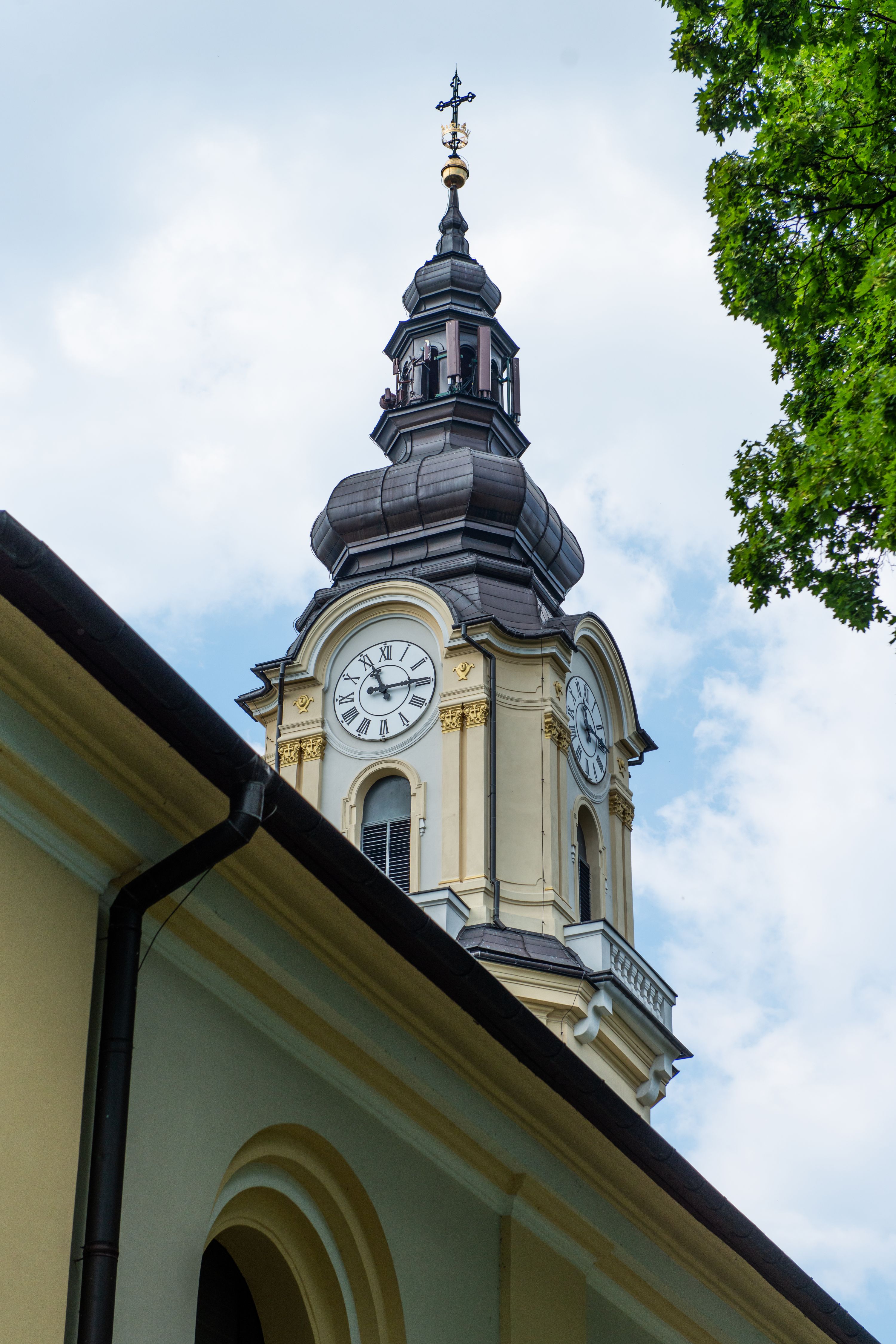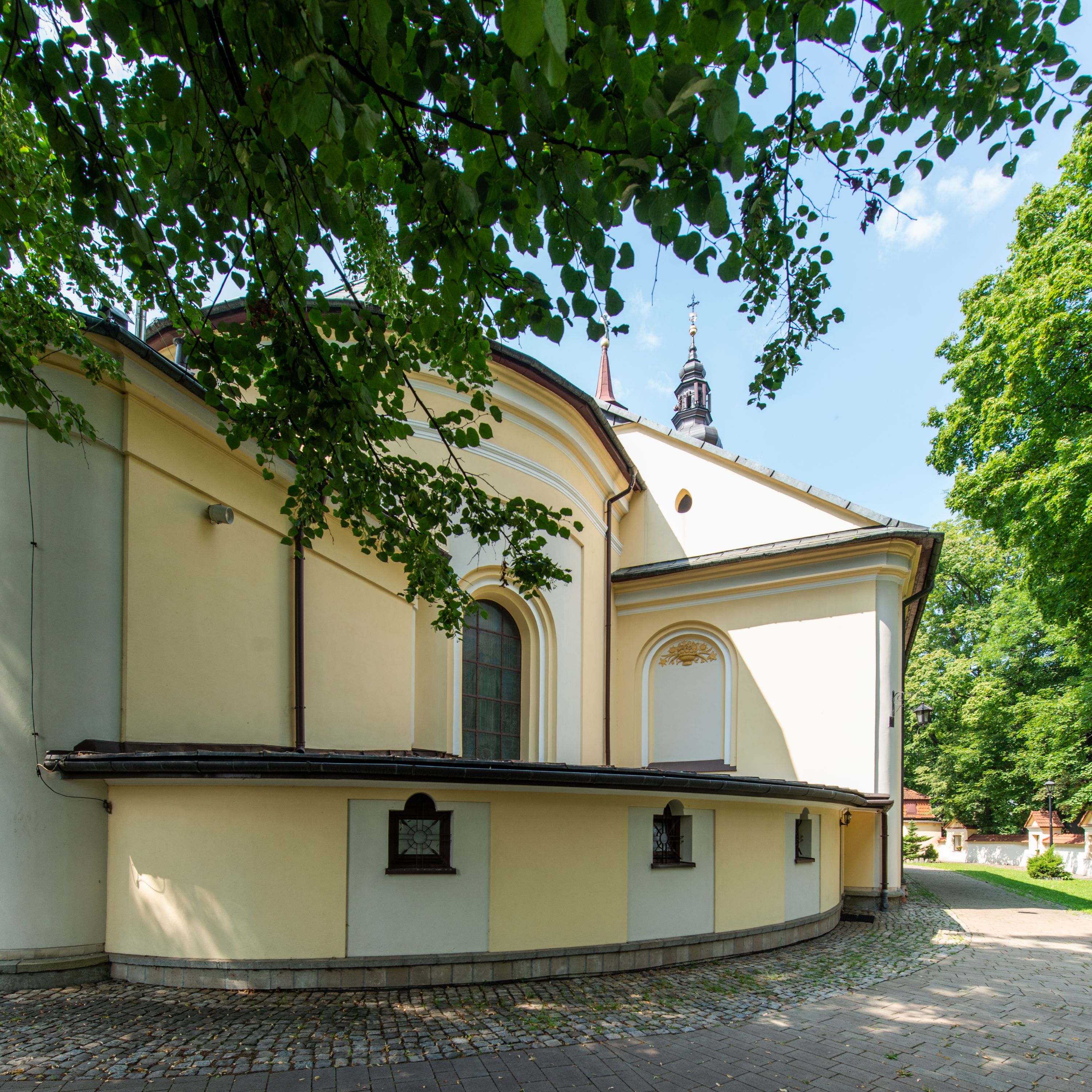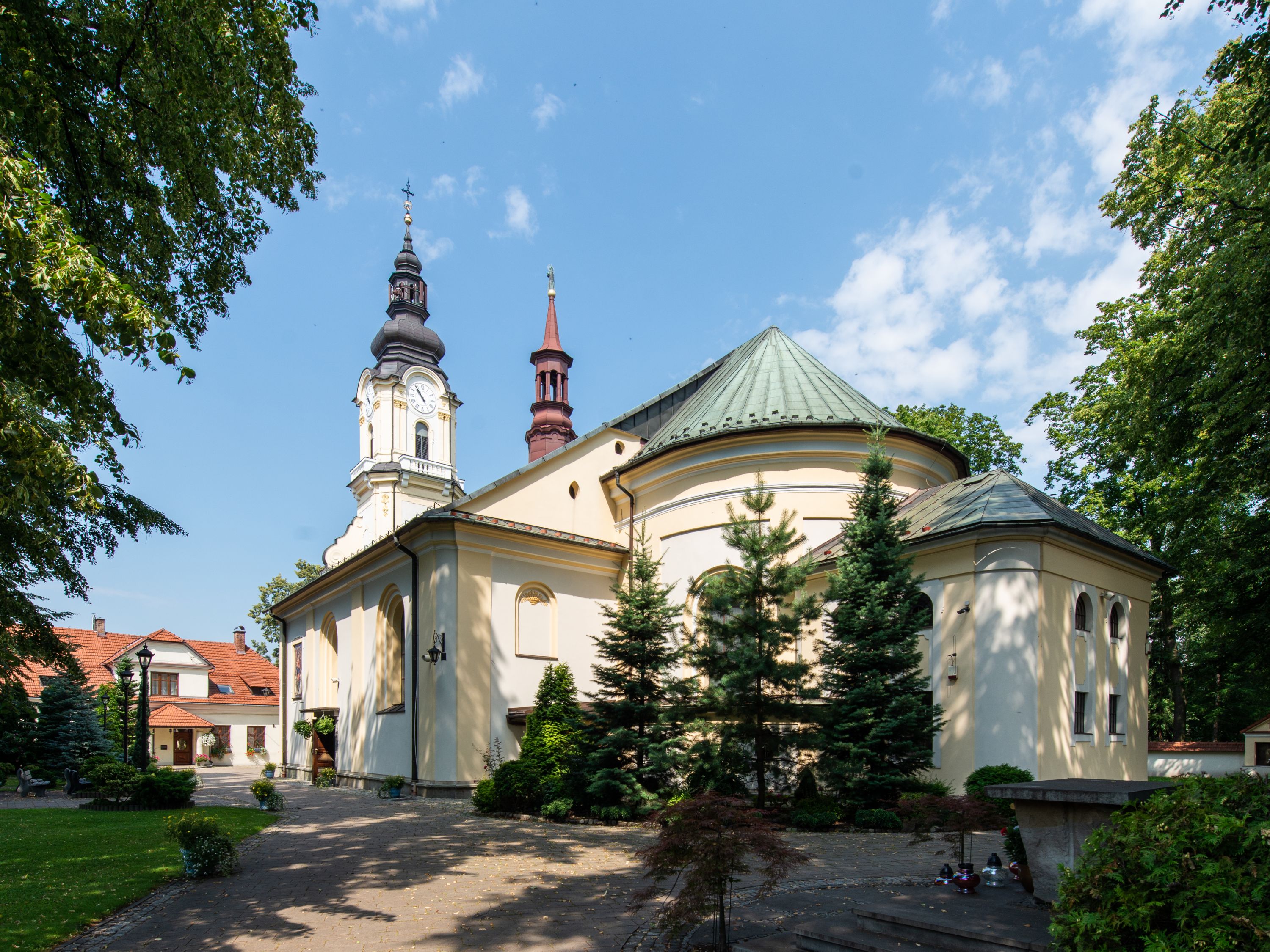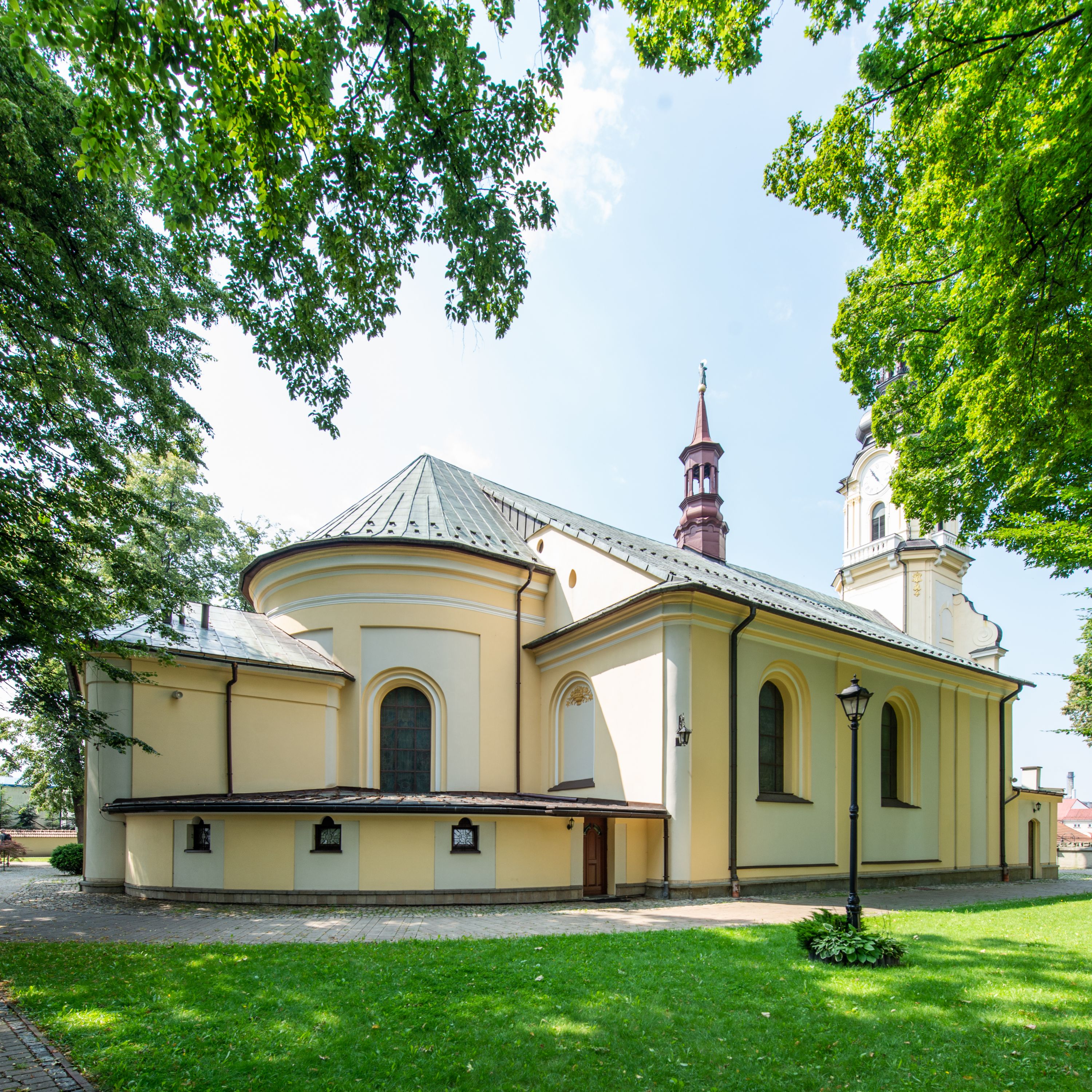 Kilkakrotnie przekształcana bryła kościoła w Andrychowie ostatecznie uzyskała kształt późnobarokowych świątyń wpisujących się w nurt tak zwanych założeń józefińskich w typie Musternkirchen w wariancie dla 1300 osób. Ścięto-wklęsłe naroża wieży, flankujące ją spływy wolutowe, charakterystyczny baniasty hełm z latarnią, zbliżony w kształcie do hełmu kościoła parafialnego w niedalekiem Wieprzu, jak również ramowo-lizenowe podziały elewacji, czynią z kościoła andrychowskiego typową budowlę dla terenów będących pod berłem Habsburgów.