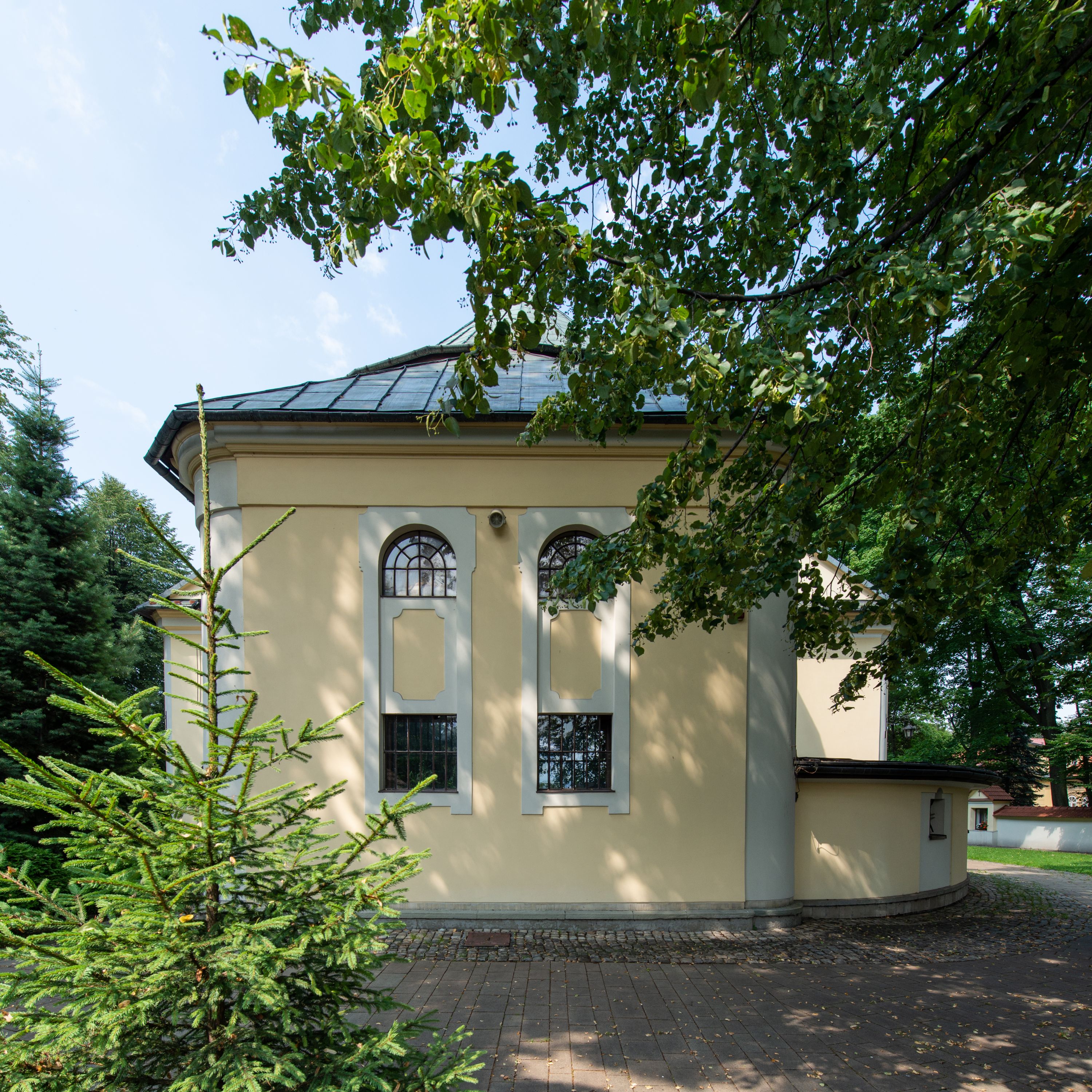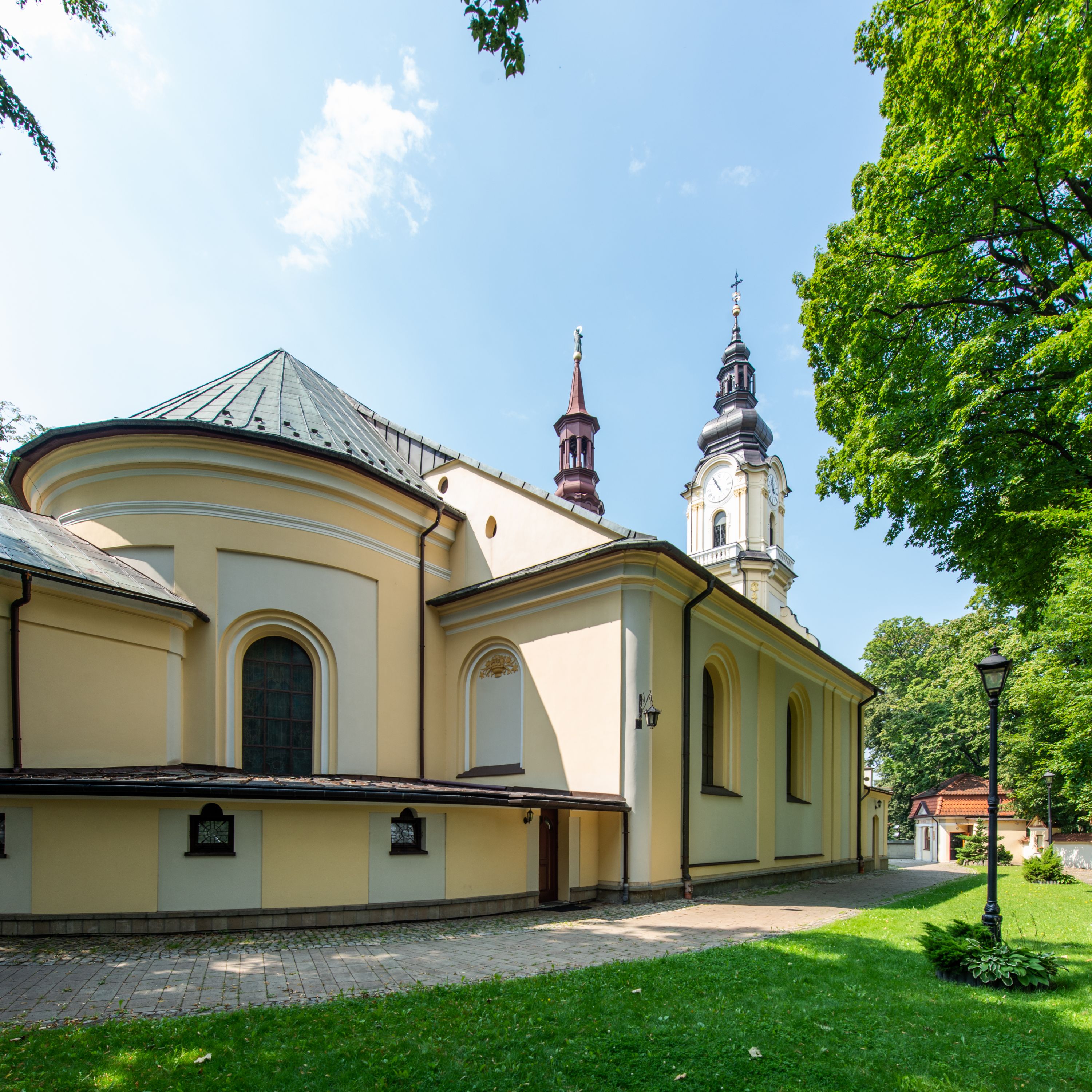 Obecny kościół wzniesiono na miejscu wcześniejszej, murowanej kaplicy z 1639 roku. Świątynię konsekrowano 21 września 1721 roku. Przed 1723 rokiem dobudowano do nawy kaplicę Matki Boskiej Różańcowej, a w połowie XVIII wieku od zachodu dostawiono wieżę z aneksami bocznymi. Wschodnie przęsła naw bocznych oraz tak zwany babiniec wybudowano w 1838 roku. Natomiast obejście dookoła apsydy i górne piętro wieży hełmem wzniesiono w latach 1924-1929.