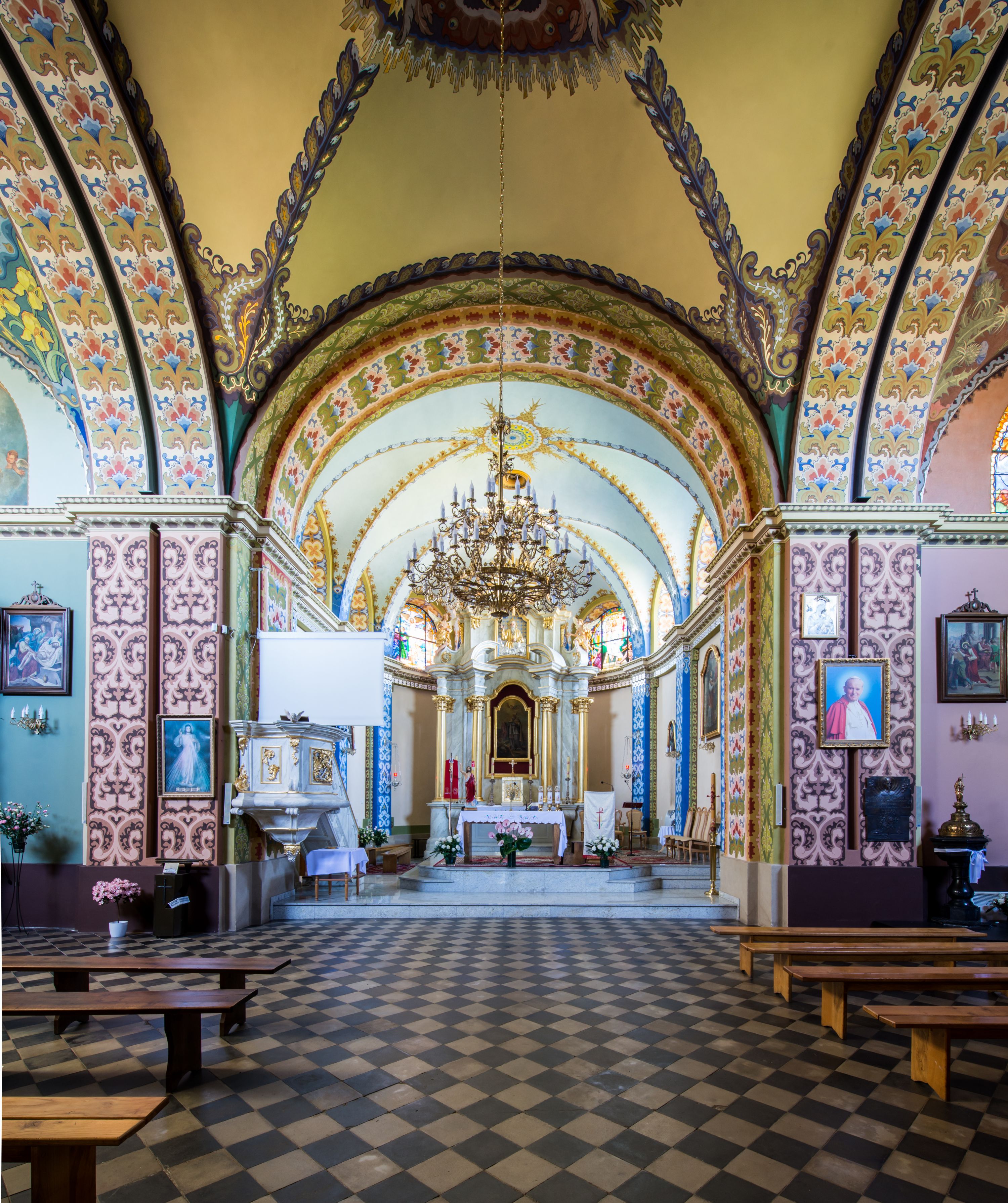 Kościół murowany, jednonawowy, z wieżą częściowo wtopioną w elewację zachodnią składający się z nawy, transeptu, zakrystii od północy z mieszczącym się na piętrze skarbcem i przystawionej od wschodu wieżyczki klatki schodowej oraz kruchty od południa. Prezbiterium dwuprzęsłowe, zamknięte trójbocznie. Nawa główna podzielona masywnymi opilastrowanymi filarami. Sklepienie prezbiterium i nawy kolebkowe z lunetami, skrzyżowania z transeptem. Od południa chór muzyczny mieszczący się między pierwszymi filarami i powyżej kruchty wejściowej. W prezbiterium okna w każdym przęśle, po każdej stronie nawy po dwa, w transepcie po trzy, w kruchcie dwa. Główne wejście od zachodu, kolejne do zakrystii i od południa. Ściany i sklepienia kościoła pokrywa polichromia złożona z geometryzujących dekoracji floralnych.
