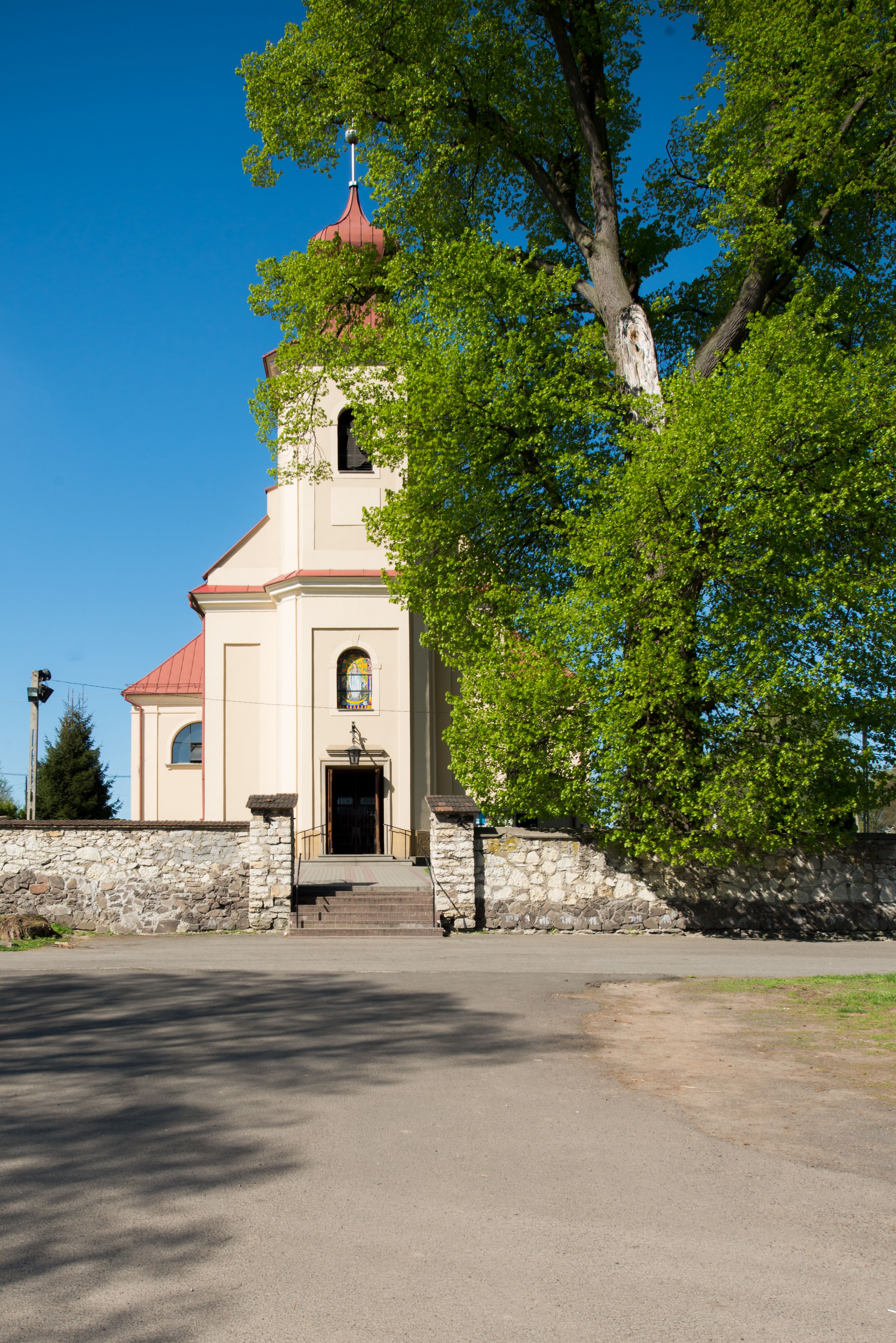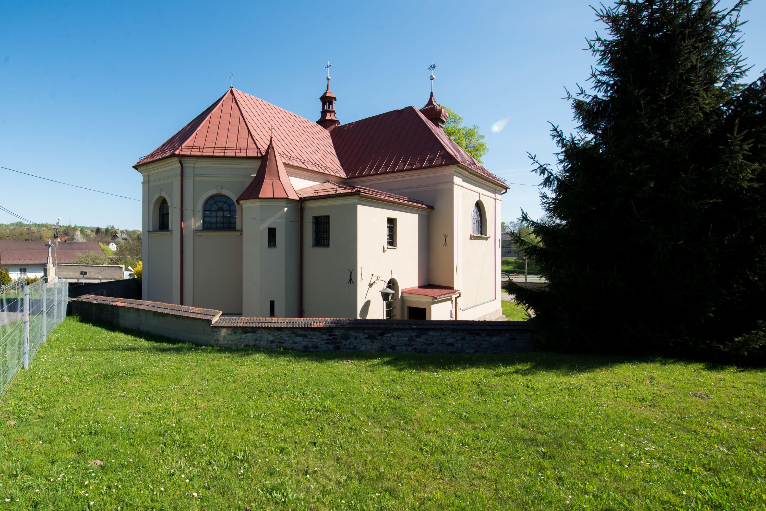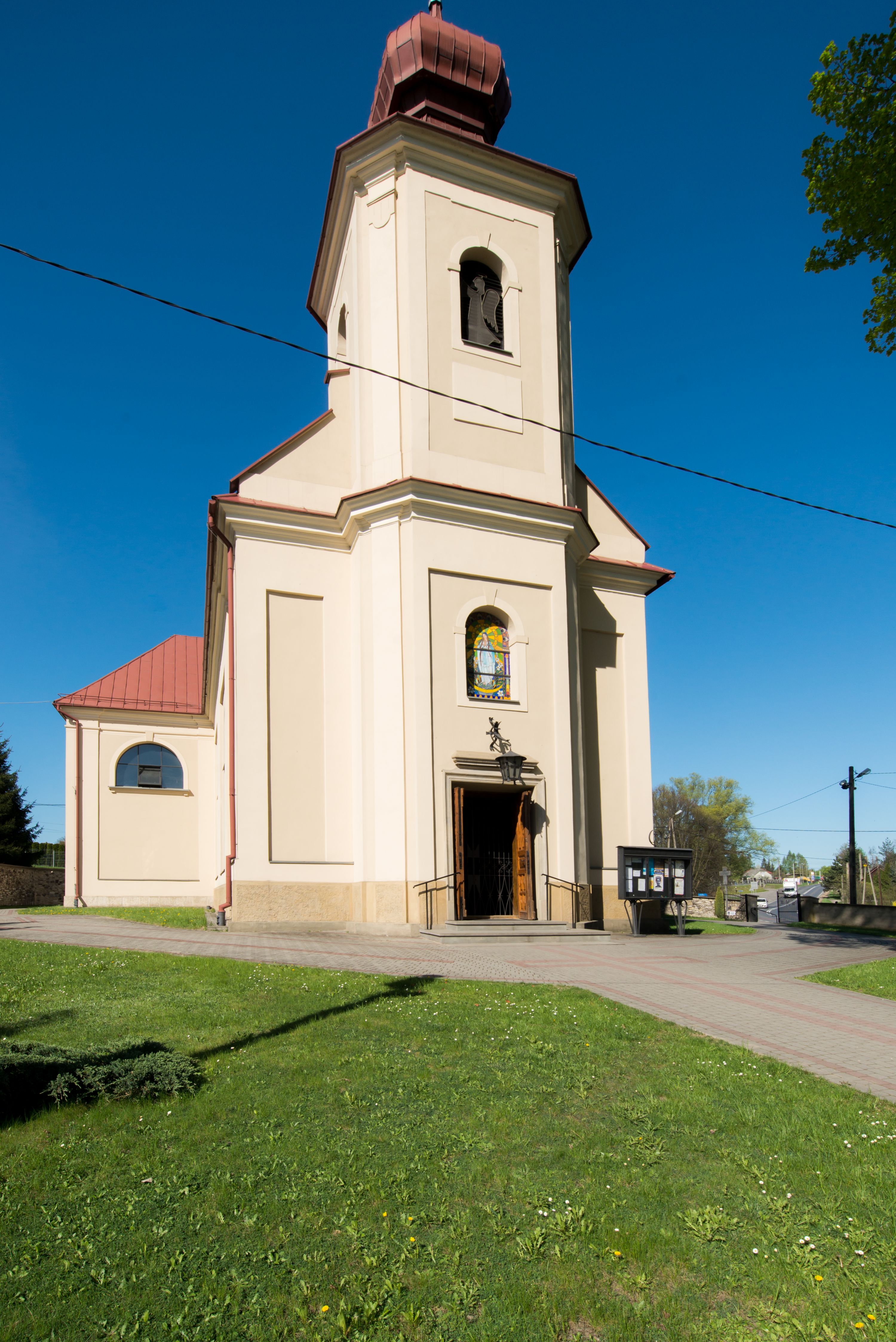 Wschodnią elewację frontową kościoła tworzy trójosiowa, wieżowa fasada. Oś kompozycji stanowi wysunięta ryzalitowo dwukondygnacyjna wieża ze ściętymi narożami, które zaakcentowane są poprzez pilastry. Ściana czołowa wieży wypełniona w pierwszej kondygnacji wklęsłą płyciną, z portalem o wykroju prostokątnym, z odcinkiem gzymsu w zwieńczeniu. Ponad nim prostokątne okno zakończone łukiem pełnym. Kondygnacje rozdzielone za pomocą masywnego gzymsu. Druga kondygnacja wieży wypełniona analogicznie prostokątną płyciną, w którą wkomponowany jest wypukły panel w kształcie leżącego prostokąta. Nad nim okno o obramieniu i wykroju identycznym jak w kondygnacji niższej. Całość zwieńczona za pomocą gzymsu podokapowego i baniastego hełmu wieżowego o ściętych narożach, na które nałożona jest kopułka w formie cebulastej. Osie boczne cofnięte w stosunku do wysuniętej wieży i zrytmizowane podziałem ramowym. Tak jak w osi głównej pierwsza kondygnacja wypełniona jest wklęsłą płyciną w formie wydłużonego, stojącego prostokąta. Nad gzymsem trójkątny spływ przysłonięty wieżą. Elewacje boczne i tylna ukształtowane jednorodnie. Zrytmizowane podziałem ramowym i przeprute oknami umieszczonymi w prostokątnych płycinach. Ramiona transeptu oraz prezbiterium zrytmizowane są za pomocą pilastrów załamanych na narożach. Od południa do korpusu przylega niska kruchta. Prowadzi do niej wejście o wykroju prostokątnym z profilowanym w tynku portalem i z odcinkiem gzymsu w zwieńczeniu. Od północy pomiędzy prezbiterium, a ramieniem transeptu wprowadzona została piętrowa przybudówka zakrystii. W elewacji tej partii kościoła brak jest znaczących podziałów. Okna i drzwi tam się znajdujące mają formę stojącego prostokąta i pozbawione są jakichkolwiek obramień. Kościół pokryty dwuspadowym, jednokalenicowym dachem, nad zakrystią i kruchtami umieszczono daszki dwuspadowe. Wieża nakryta jest hełmem cebulastym. Całość pokryta została malowaną blachą.