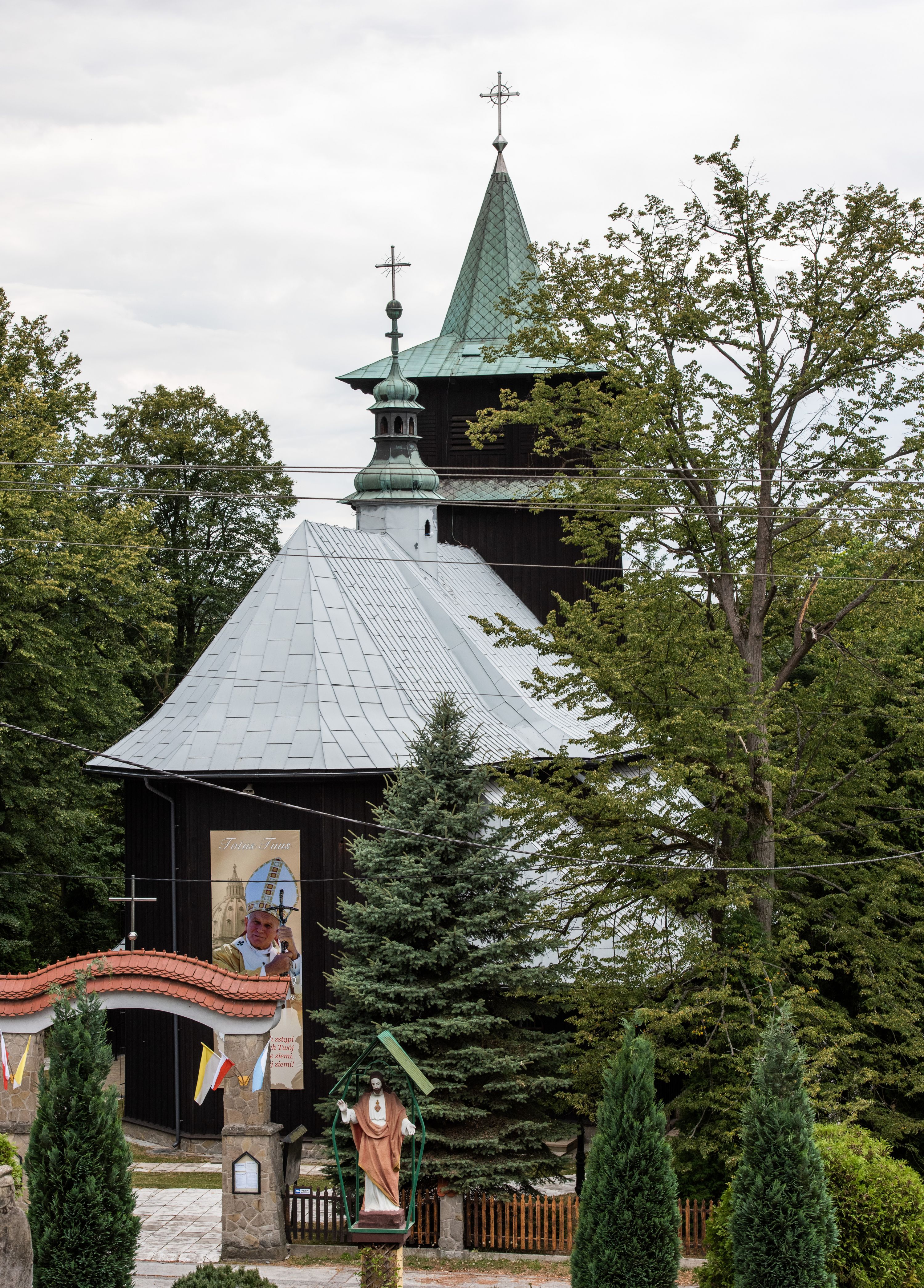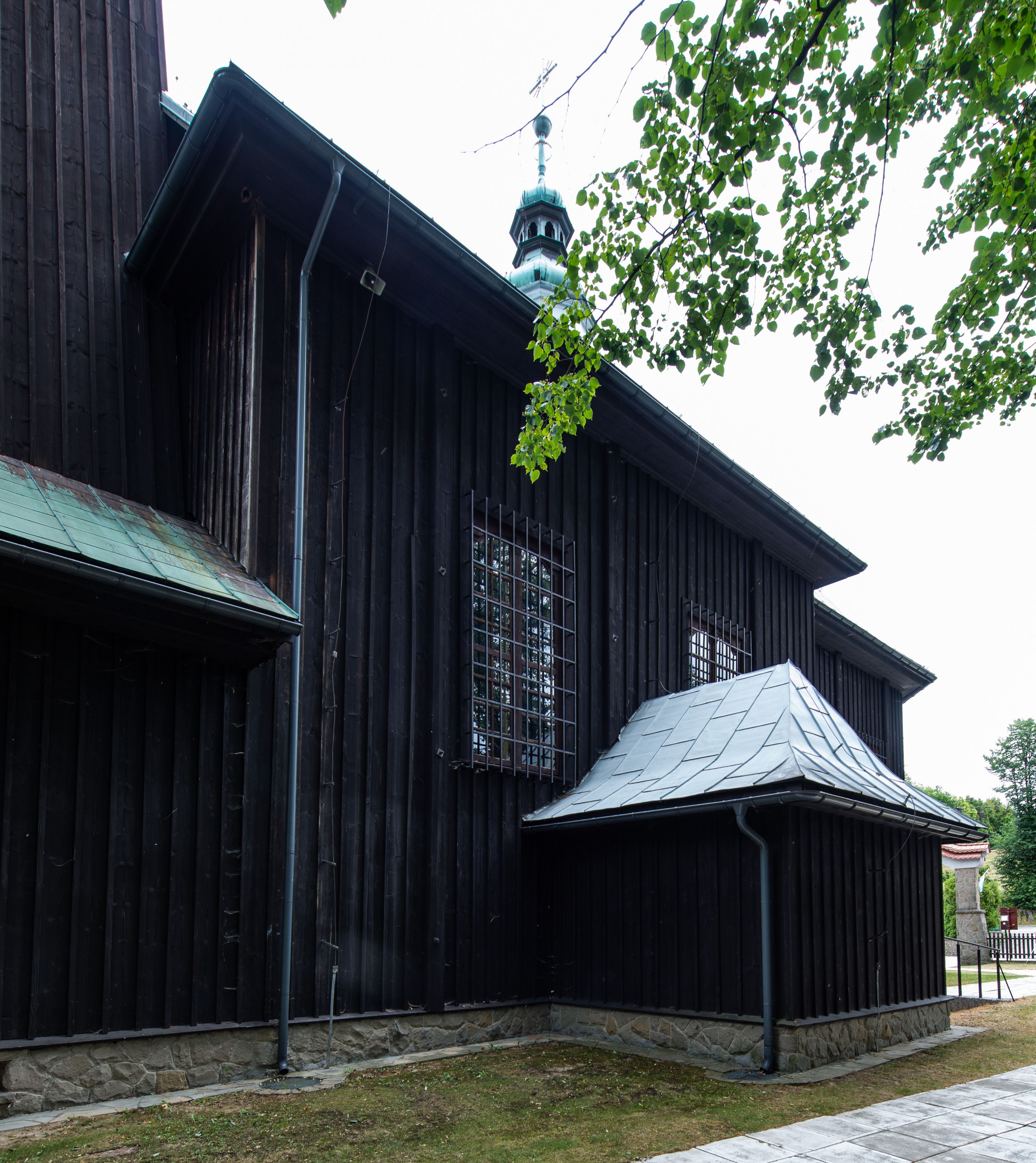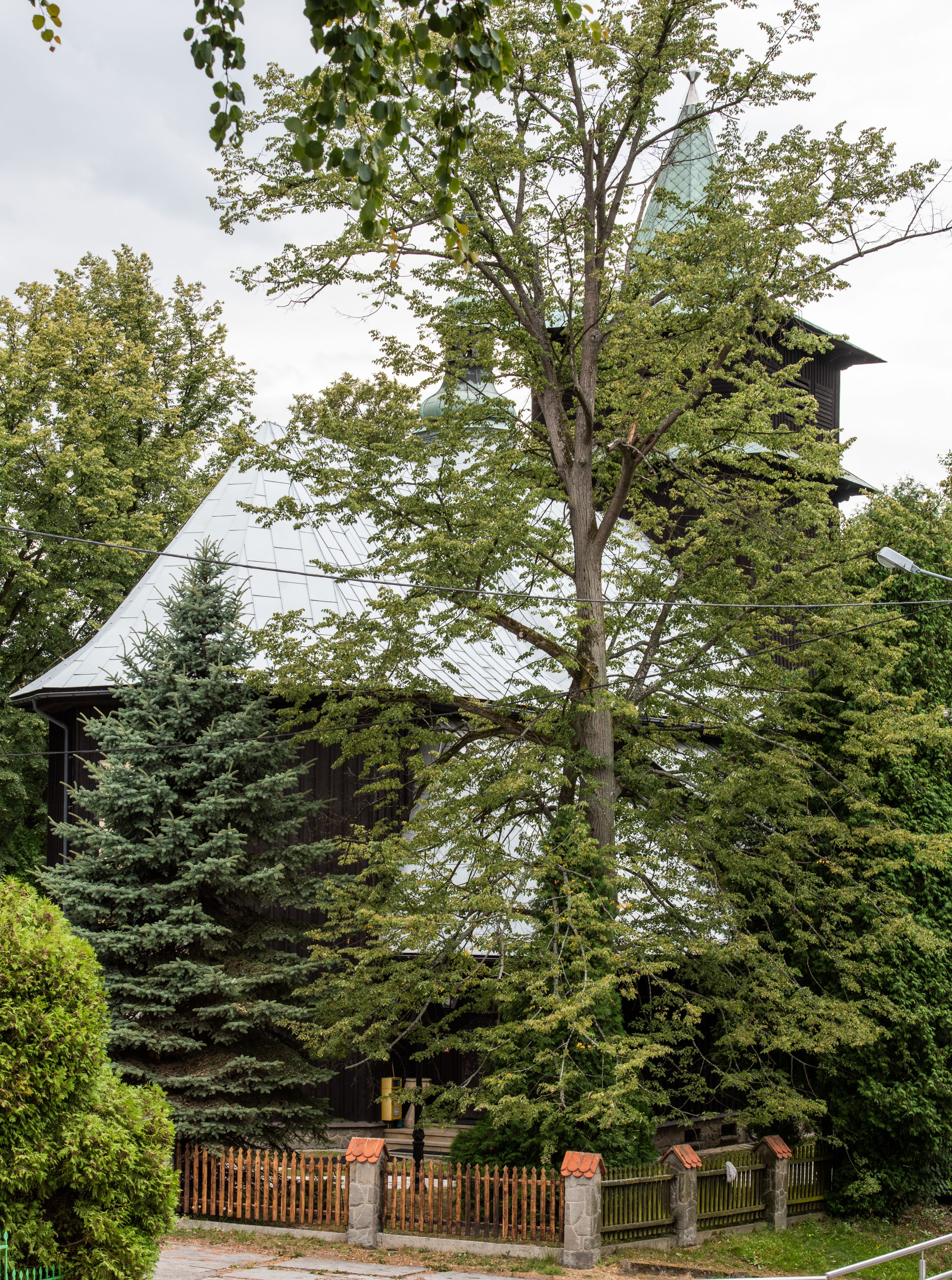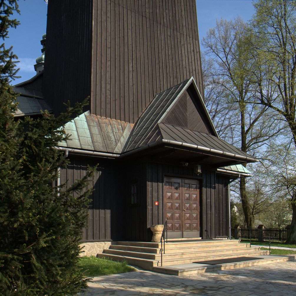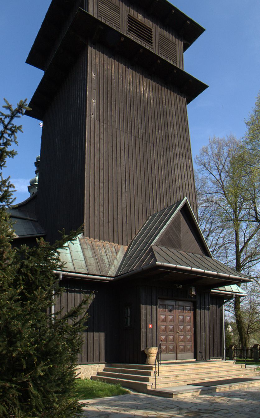 Kościół drewniany, orientowany, jednonawowy o konstrukcji zrębowej, oszalowany. Prezbiterium kwadratowe o wielobocznym zamknięciu z zakrystią od północy. Nawa szersza, prawie kwadratowa, przy niej od północy kaplica i składzik później dostawiony; od południa i od zachodu kruchty. Korpus nakryty dachem dwuspadowym, jednokalenicowym, z barokową wieżyczką na sygnaturkę na kalenicy; składzik nakryty dachem pulpitowym. Wewnątrz stropy kasetonowe. Otwór tęczy o profilowanym łuku półkolistym podwyższonym; belka profilowana, na niej grupa Ukrzyżowania. Chór muzyczny wsparty na dwóch słupach. Kaplica otwarta do nawy półkolistą arkadą. Troje drzwi o ozdobnych obramieniach uszatych, schodkowatych i uszato-schodkowatych, ze starymi okuciami. Wieża nowa, izbicowa o pochyłych ścianach, zwieńczona ostrosłupowym hełmem.