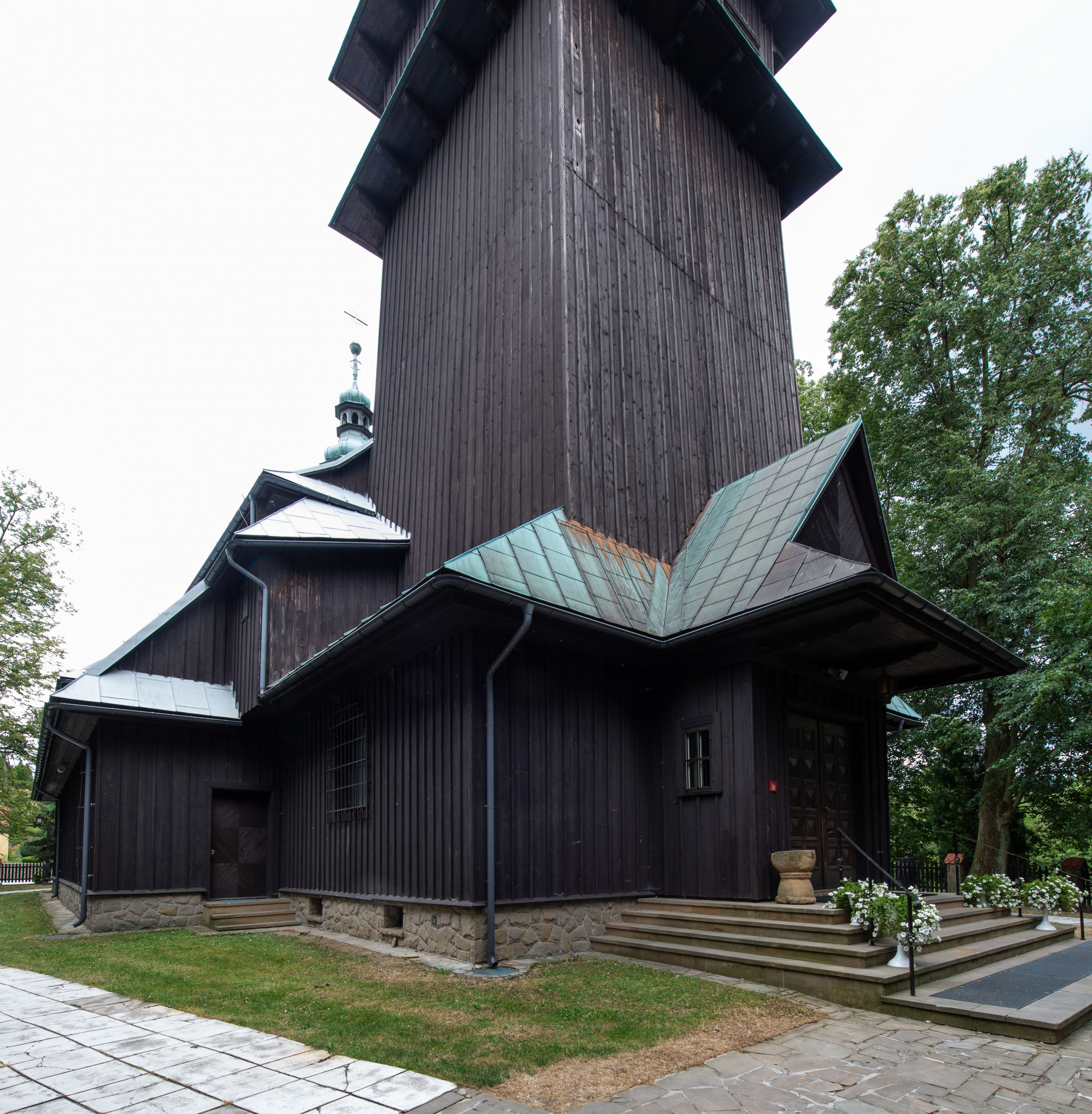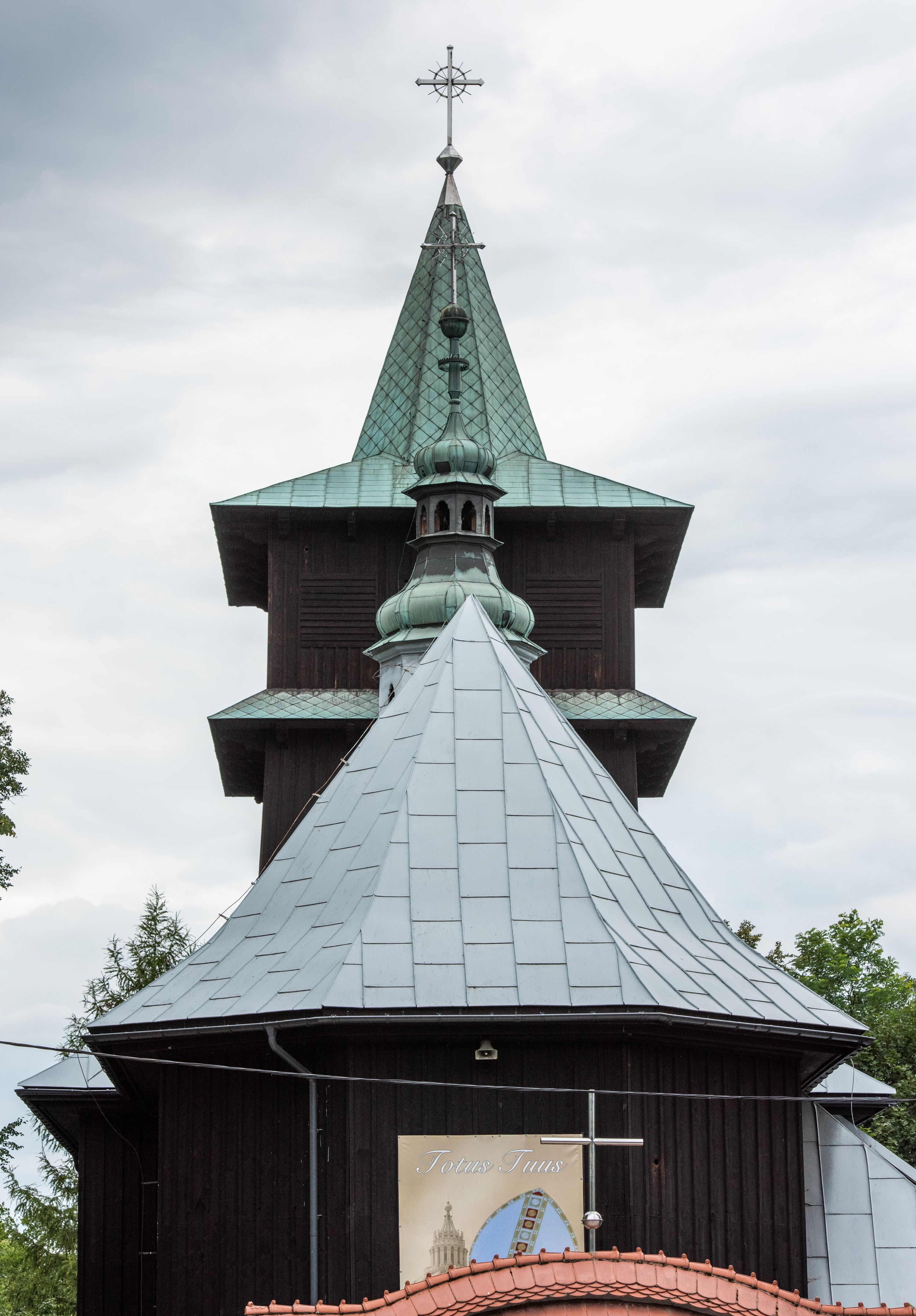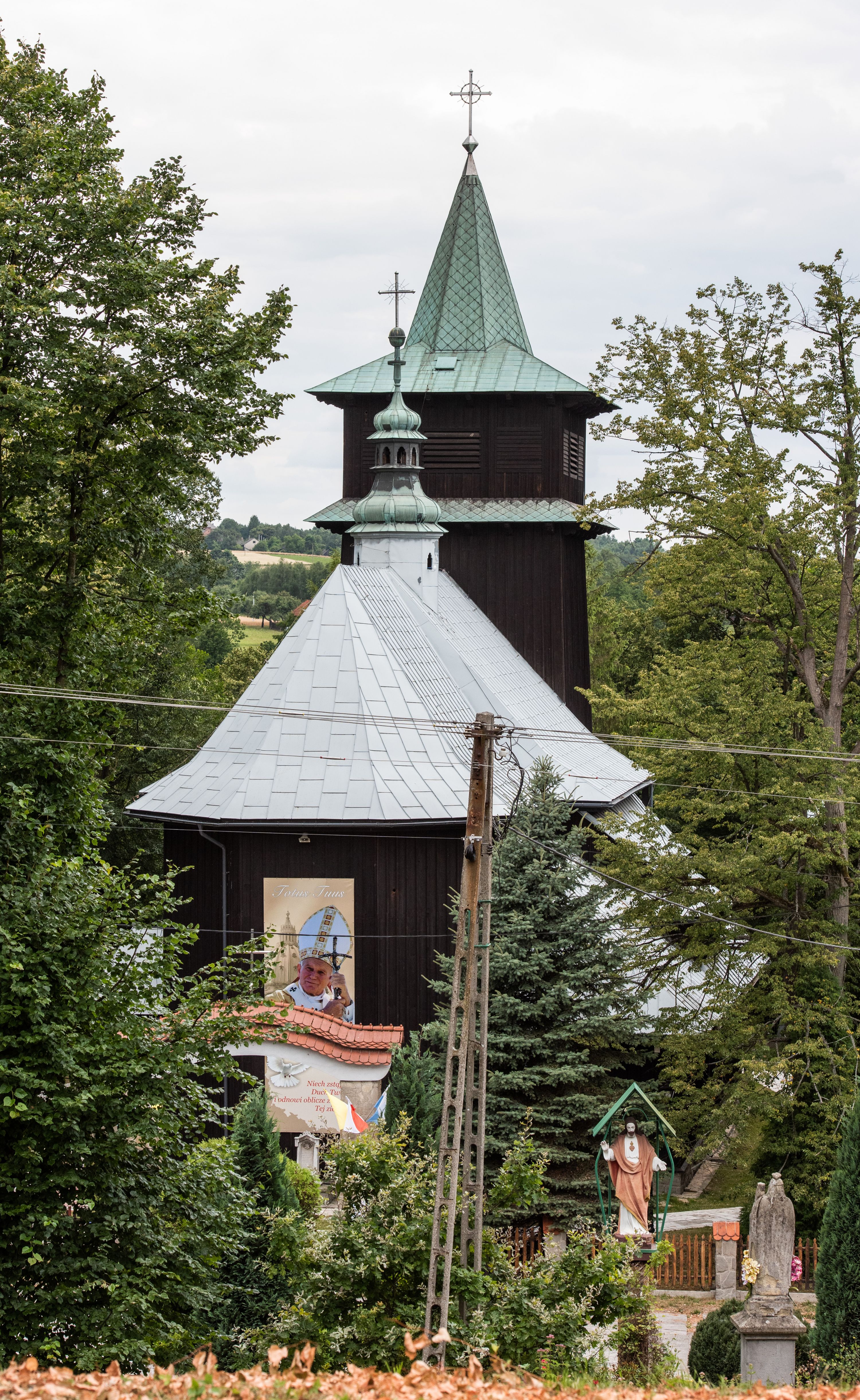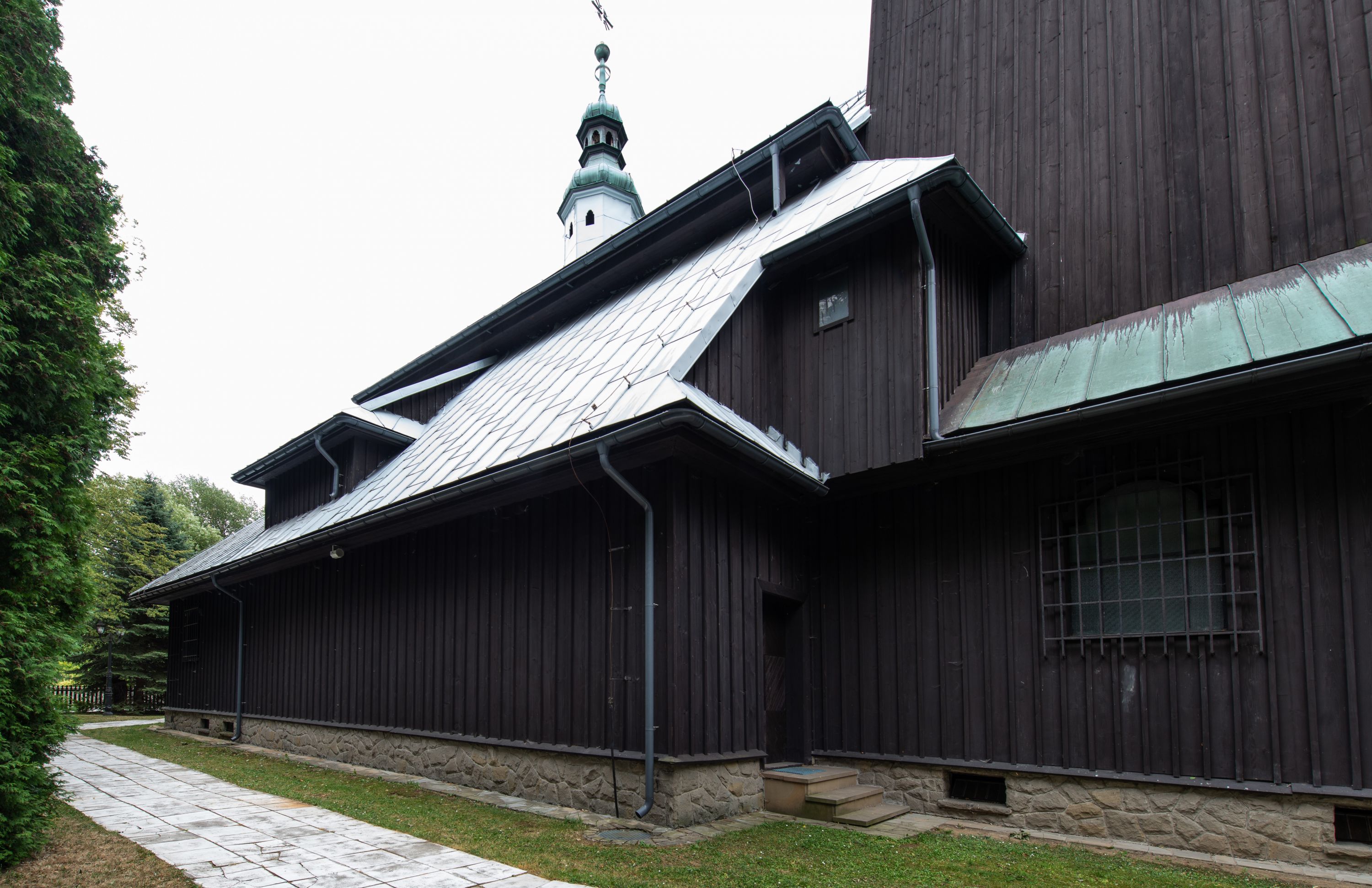 Kościół drewniany, orientowany, jednonawowy o konstrukcji zrębowej, oszalowany. Prezbiterium kwadratowe o wielobocznym zamknięciu z zakrystią od północy. Nawa szersza, prawie kwadratowa, przy niej od północy kaplica i składzik później dostawiony; od południa i od zachodu kruchty. Korpus nakryty dachem dwuspadowym, jednokalenicowym, z barokową wieżyczką na sygnaturkę na kalenicy; składzik nakryty dachem pulpitowym. Wewnątrz stropy kasetonowe. Otwór tęczy o profilowanym łuku półkolistym podwyższonym; belka profilowana, na niej grupa Ukrzyżowania. Chór muzyczny wsparty na dwóch słupach. Kaplica otwarta do nawy półkolistą arkadą. Troje drzwi o ozdobnych obramieniach uszatych, schodkowatych i uszato-schodkowatych, ze starymi okuciami. Wieża nowa, izbicowa o pochyłych ścianach, zwieńczona ostrosłupowym hełmem.