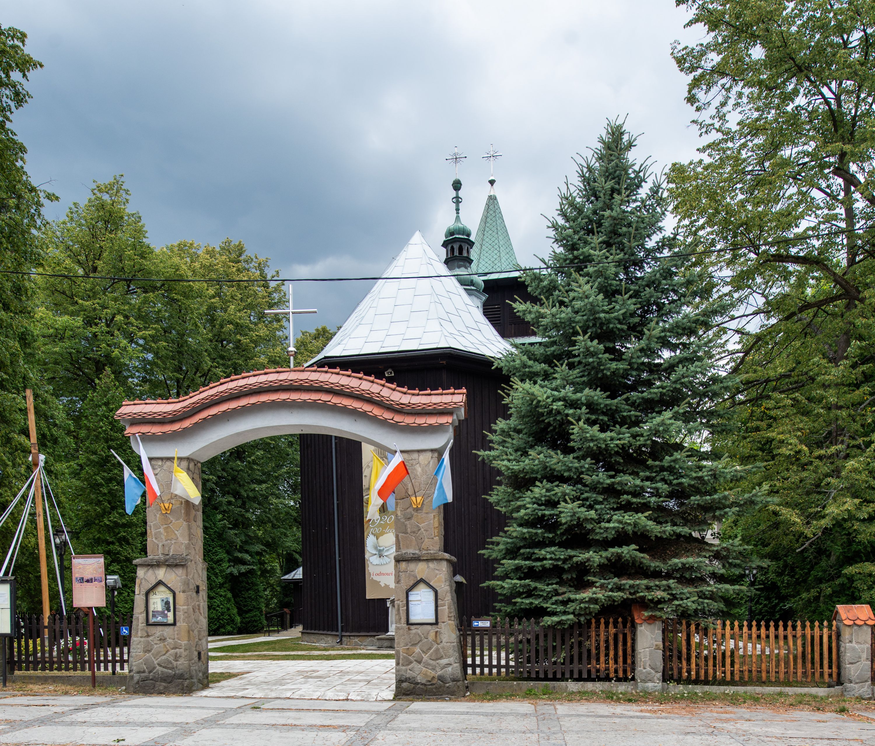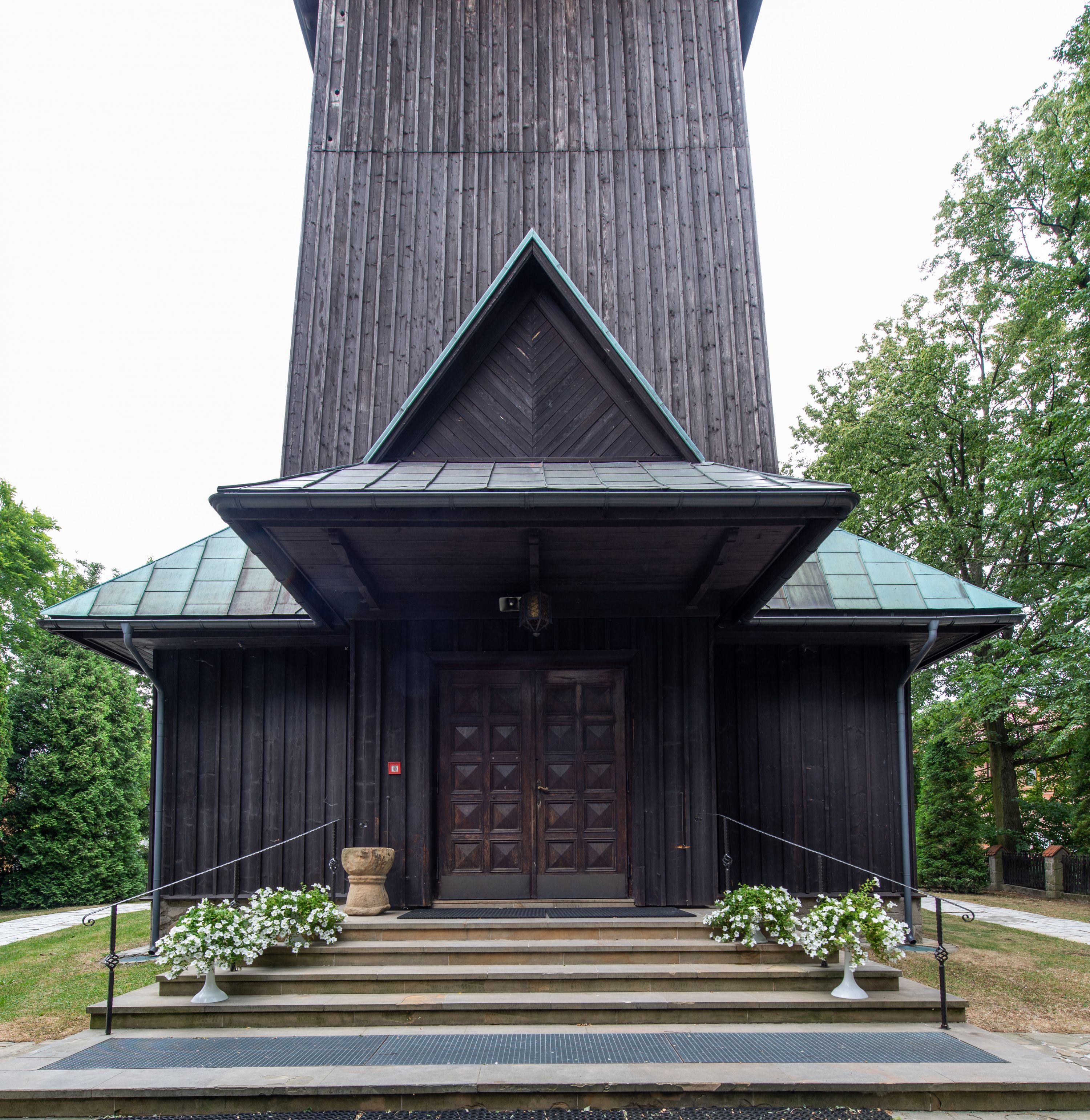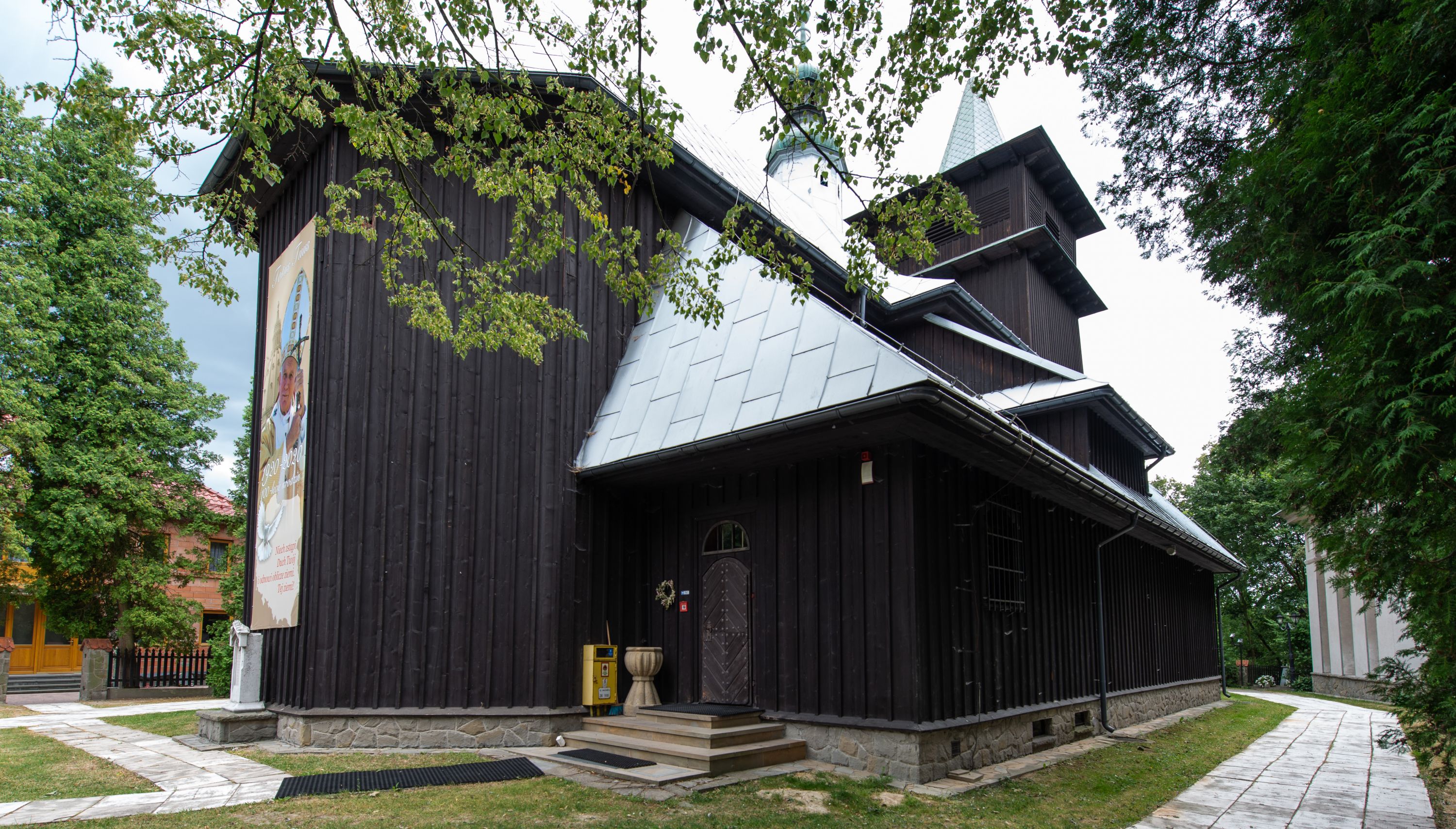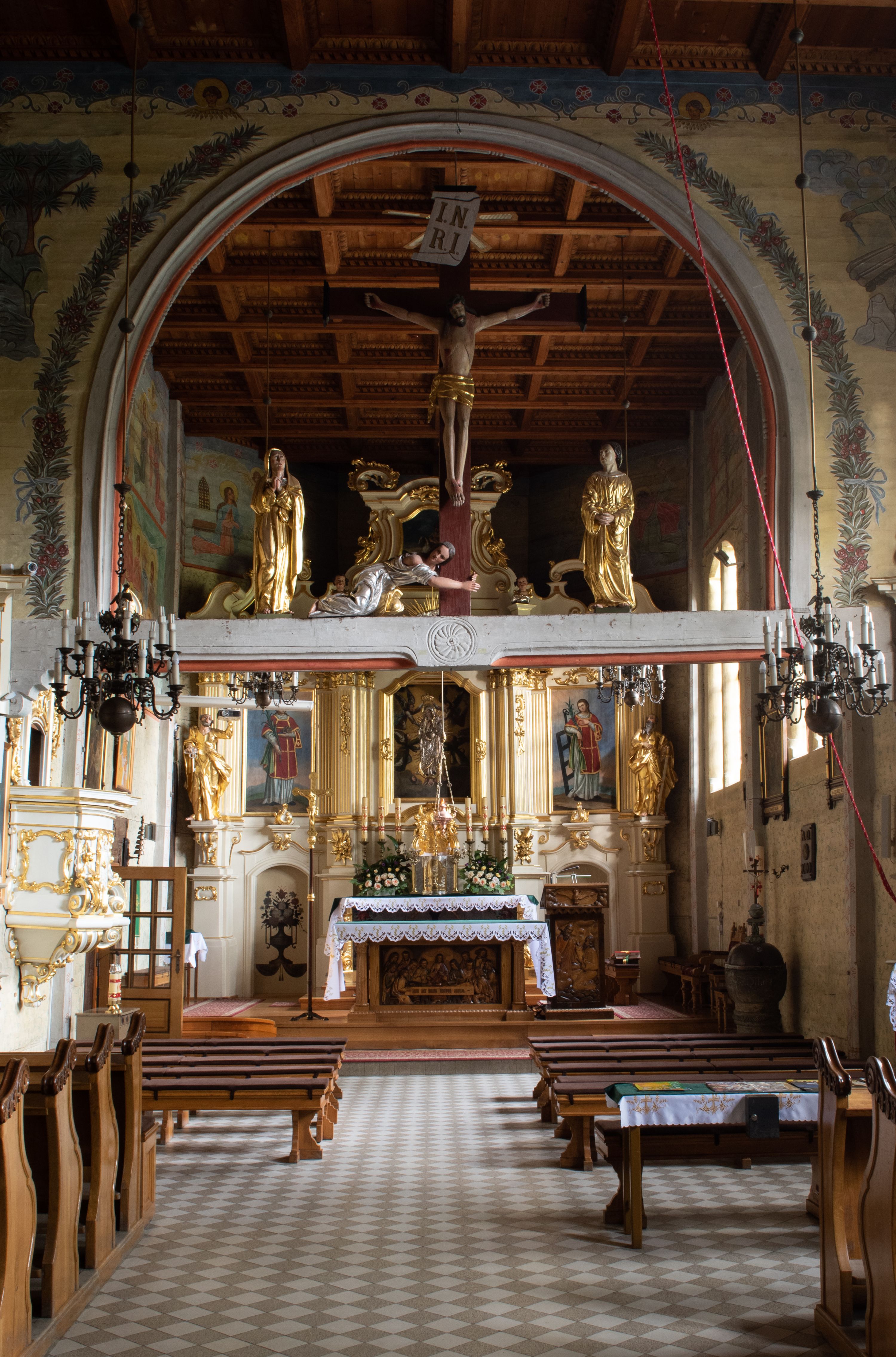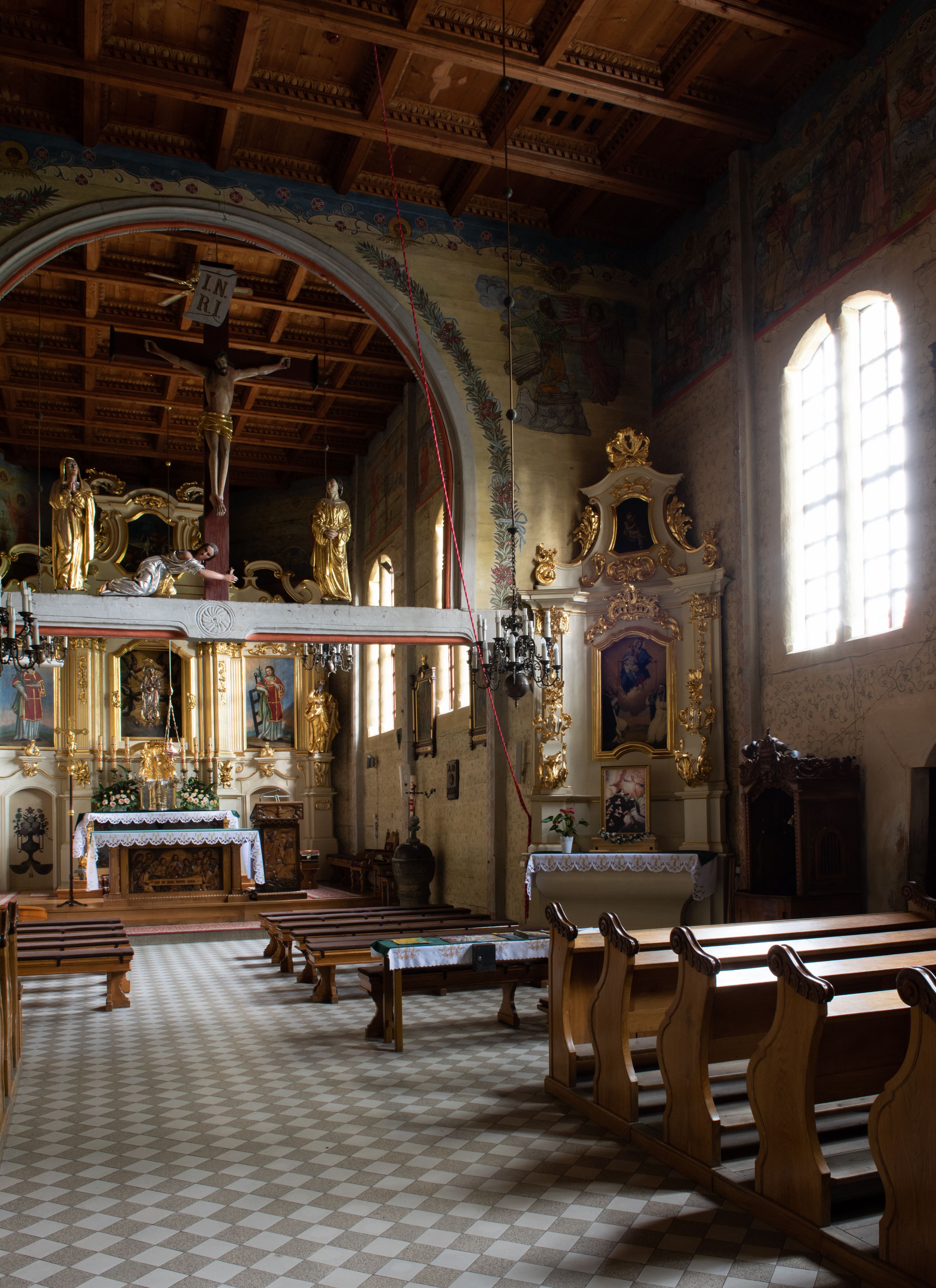 Kościół drewniany, orientowany, jednonawowy o konstrukcji zrębowej, oszalowany. Prezbiterium kwadratowe o wielobocznym zamknięciu z zakrystią od północy. Nawa szersza, prawie kwadratowa, przy niej od północy kaplica i składzik później dostawiony; od południa i od zachodu kruchty. Korpus nakryty dachem dwuspadowym, jednokalenicowym, z barokową wieżyczką na sygnaturkę na kalenicy; składzik nakryty dachem pulpitowym. Wewnątrz stropy kasetonowe. Otwór tęczy o profilowanym łuku półkolistym podwyższonym; belka profilowana, na niej grupa Ukrzyżowania. Chór muzyczny wsparty na dwóch słupach. Kaplica otwarta do nawy półkolistą arkadą. Troje drzwi o ozdobnych obramieniach uszatych, schodkowatych i uszato-schodkowatych, ze starymi okuciami. Wieża nowa, izbicowa o pochyłych ścianach, zwieńczona ostrosłupowym hełmem.