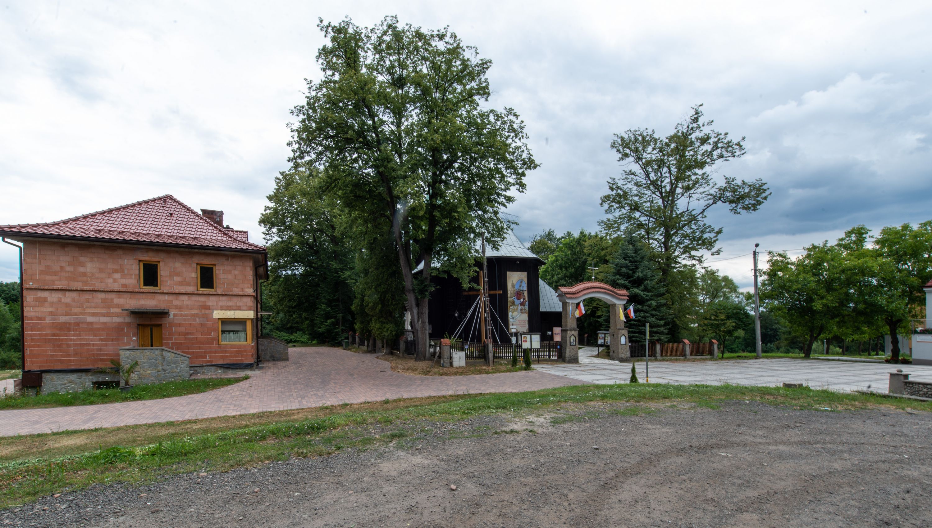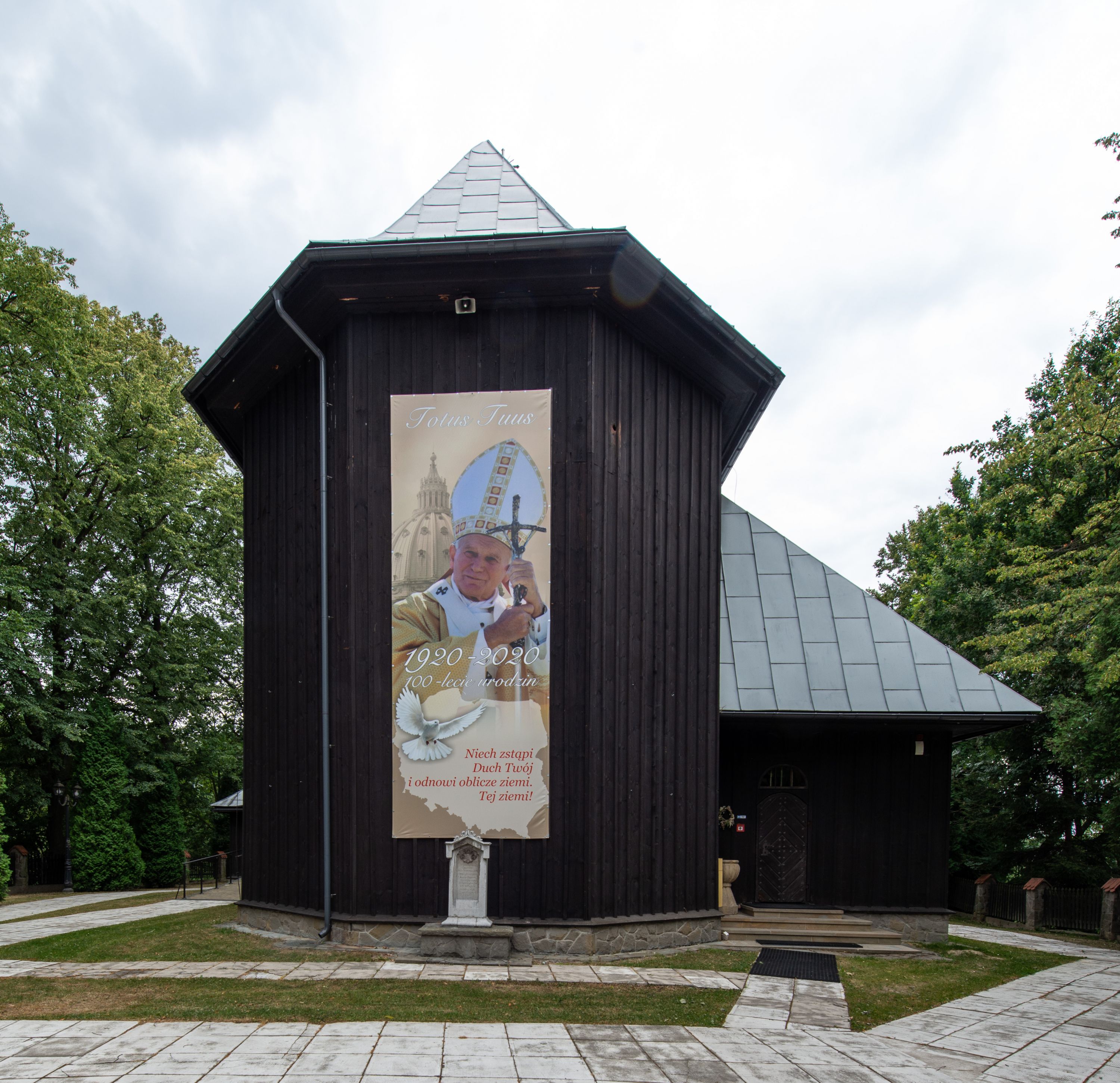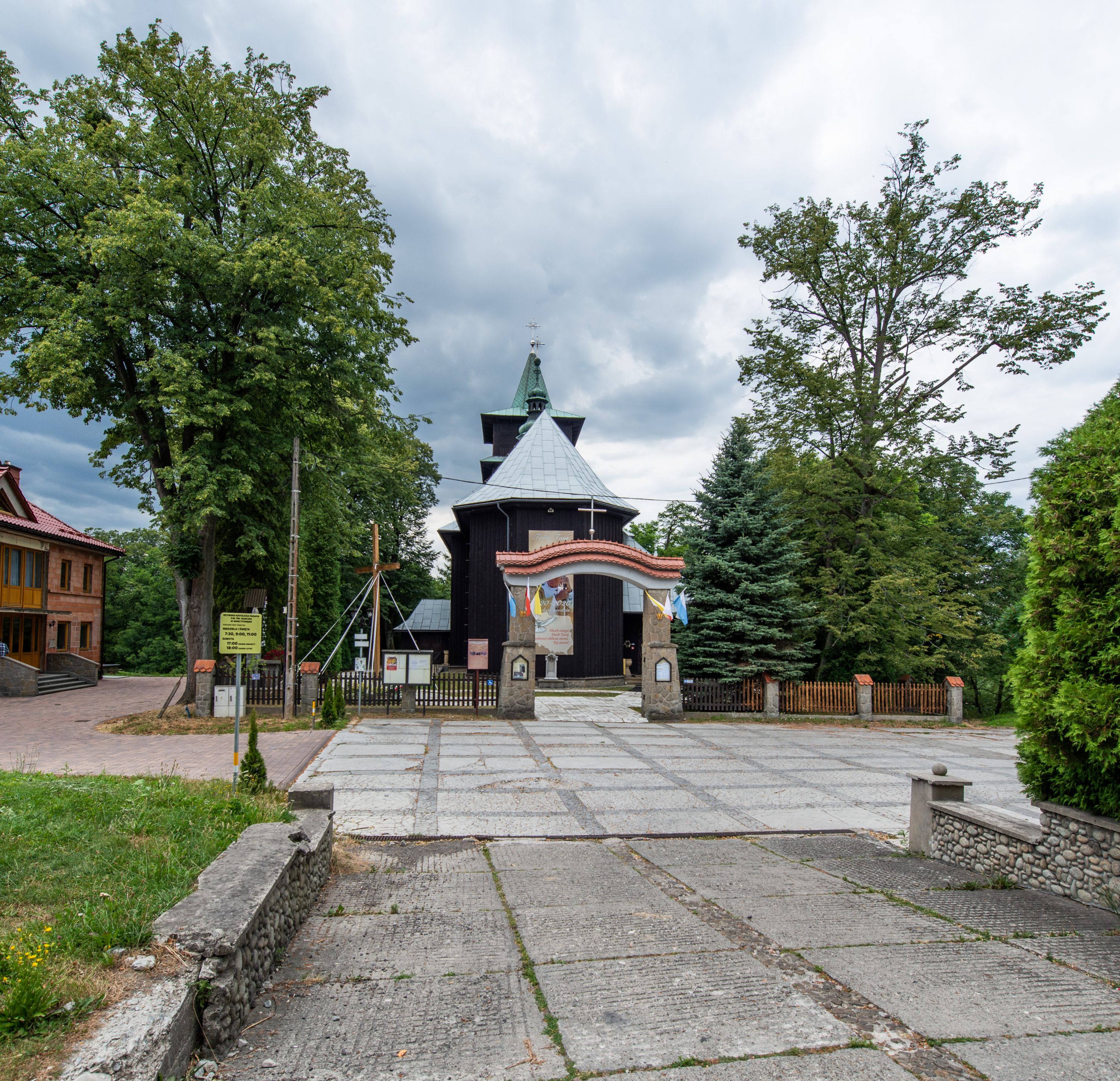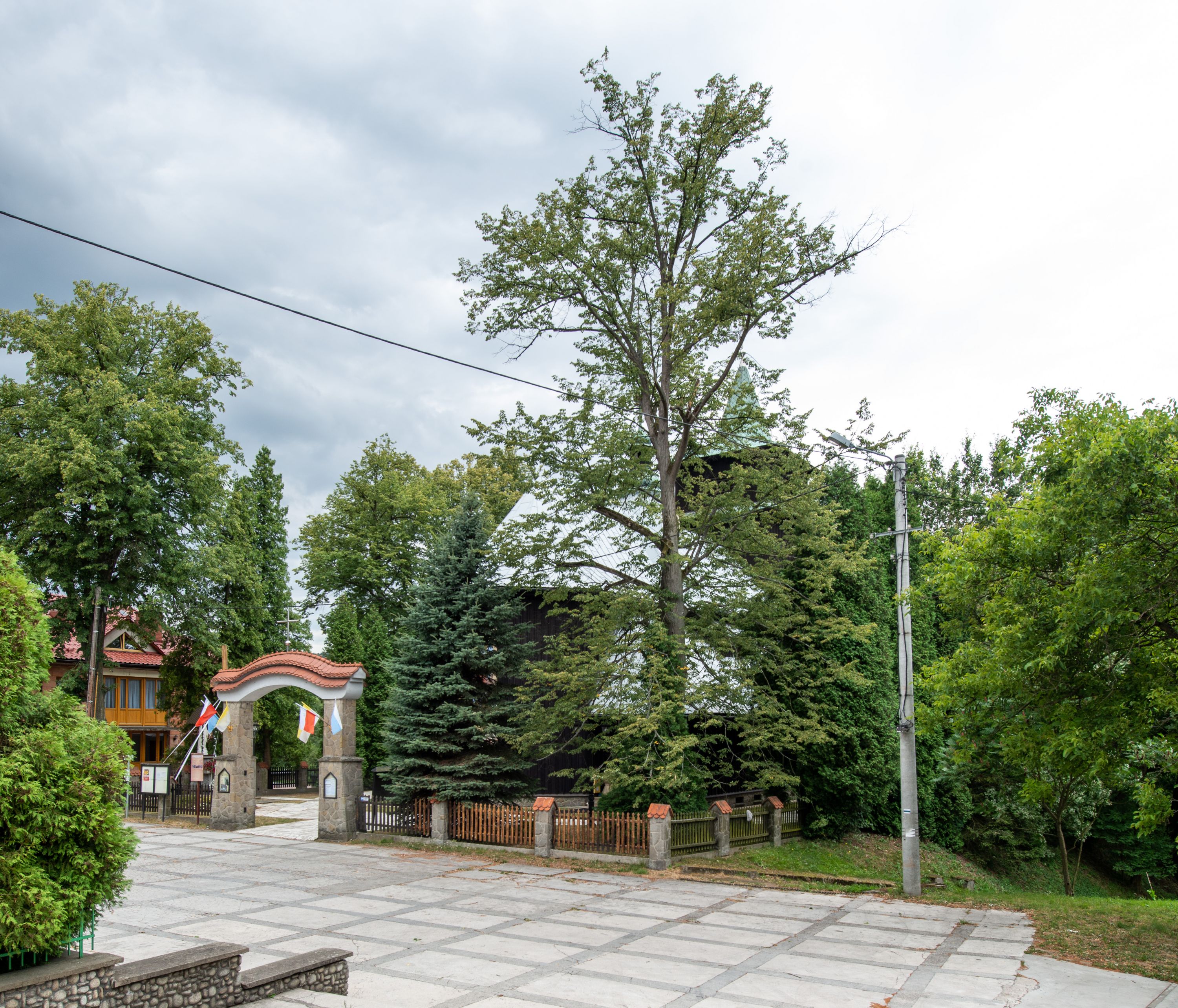 Kościół drewniany, orientowany, jednonawowy o konstrukcji zrębowej, oszalowany. Prezbiterium kwadratowe o wielobocznym zamknięciu z zakrystią od północy. Nawa szersza, prawie kwadratowa, przy niej od północy kaplica i składzik później dostawiony; od południa i od zachodu kruchty. Korpus nakryty dachem dwuspadowym, jednokalenicowym, z barokową wieżyczką na sygnaturkę na kalenicy; składzik nakryty dachem pulpitowym. Wewnątrz stropy kasetonowe. Otwór tęczy o profilowanym łuku półkolistym podwyższonym; belka profilowana, na niej grupa Ukrzyżowania. Chór muzyczny wsparty na dwóch słupach. Kaplica otwarta do nawy półkolistą arkadą. Troje drzwi o ozdobnych obramieniach uszatych, schodkowatych i uszato-schodkowatych, ze starymi okuciami. Wieża nowa, izbicowa o pochyłych ścianach, zwieńczona ostrosłupowym hełmem.