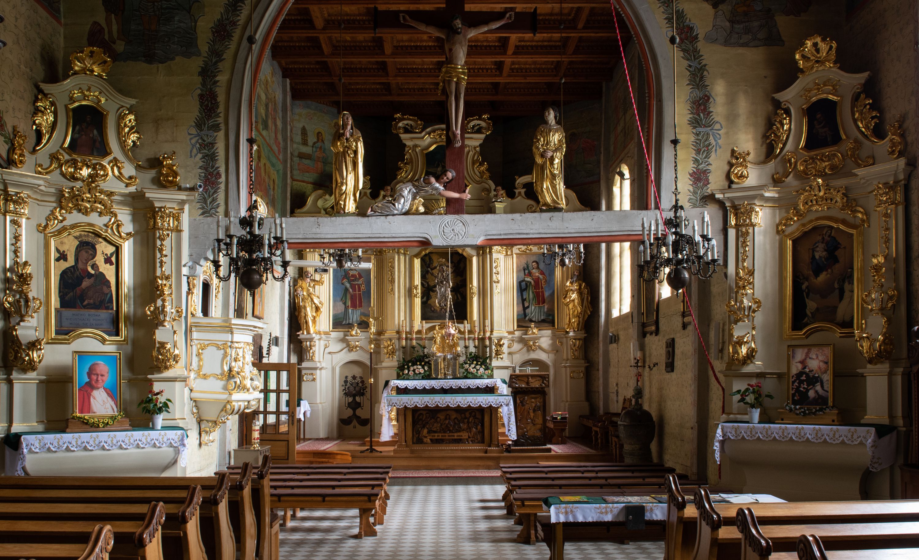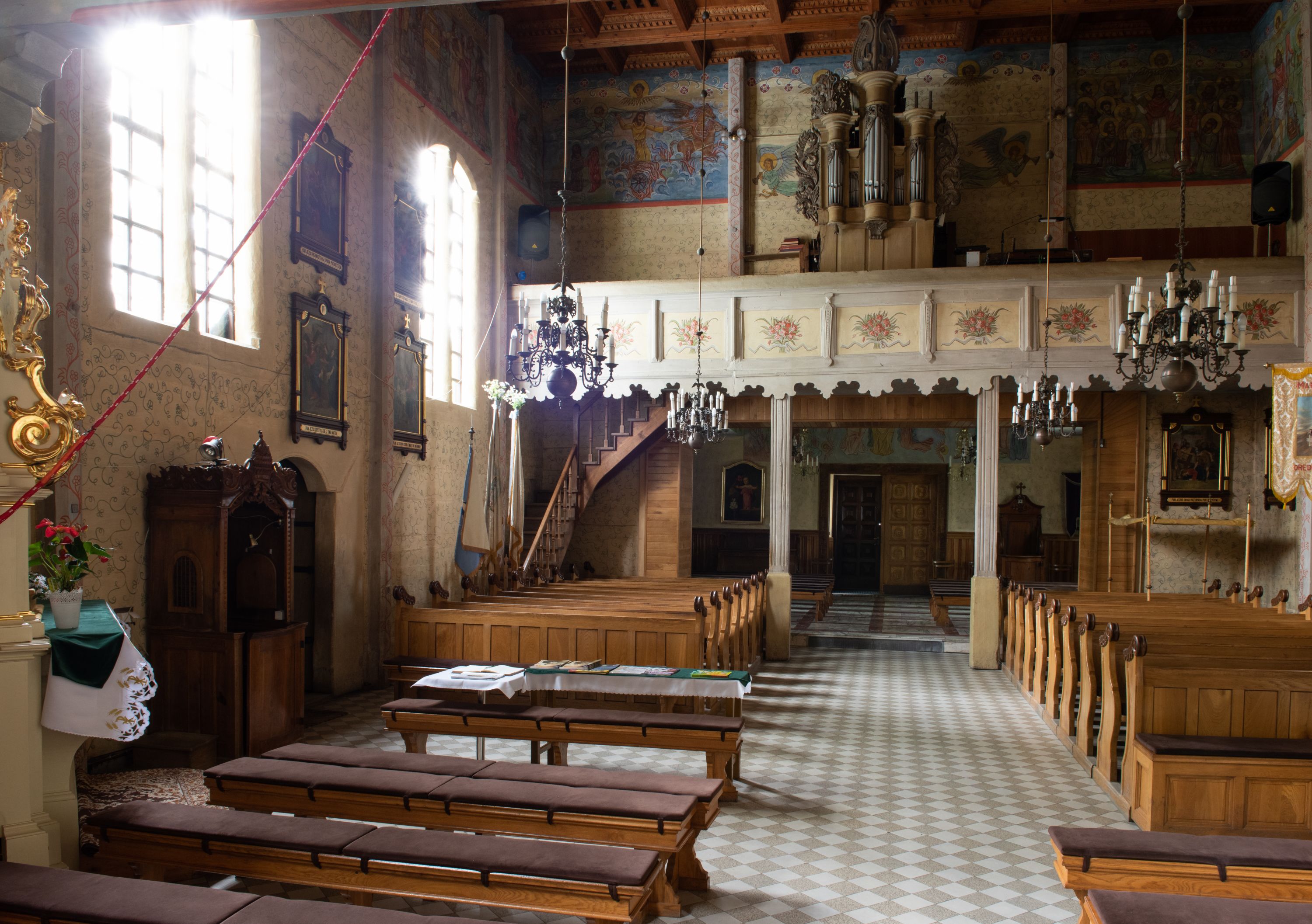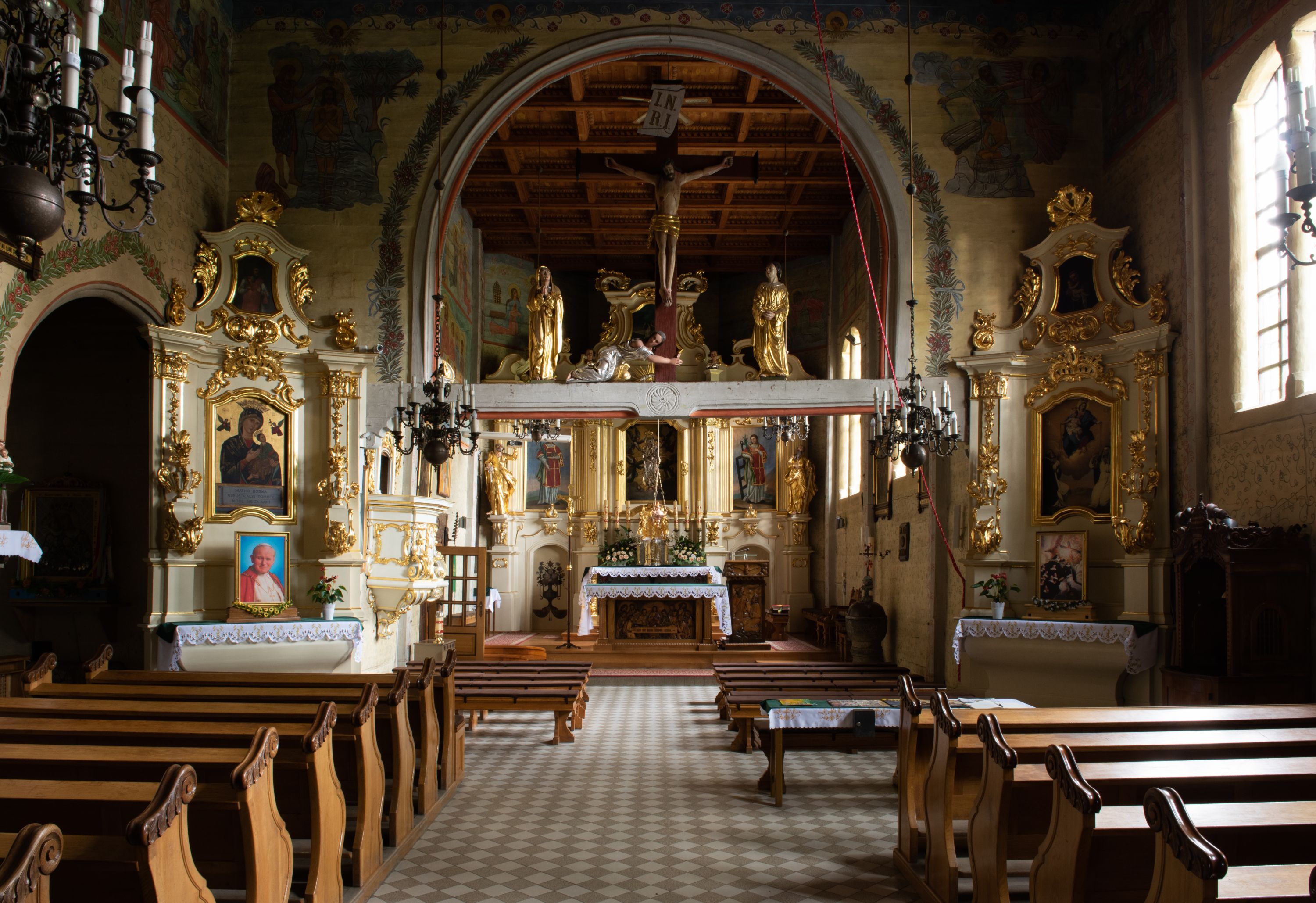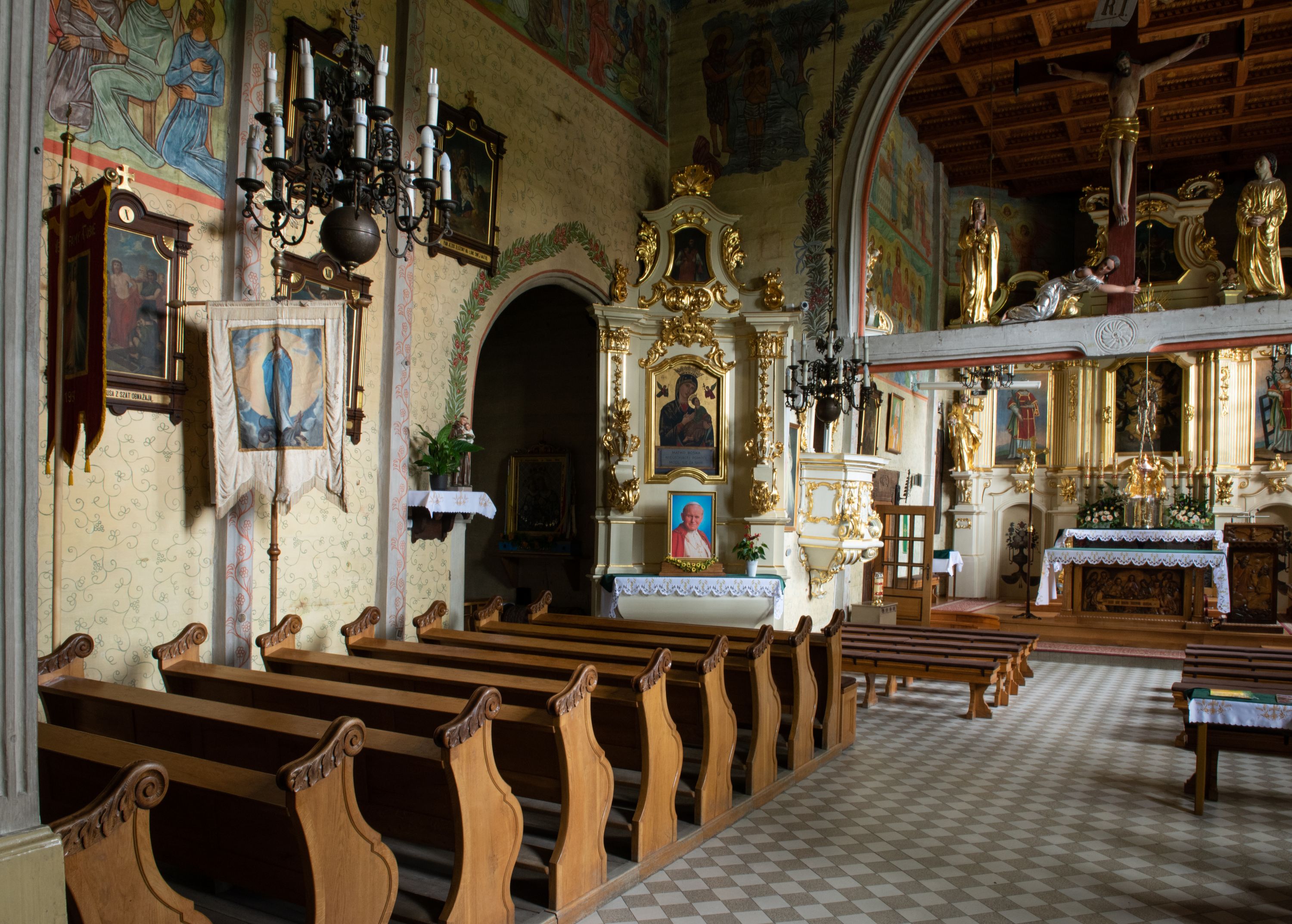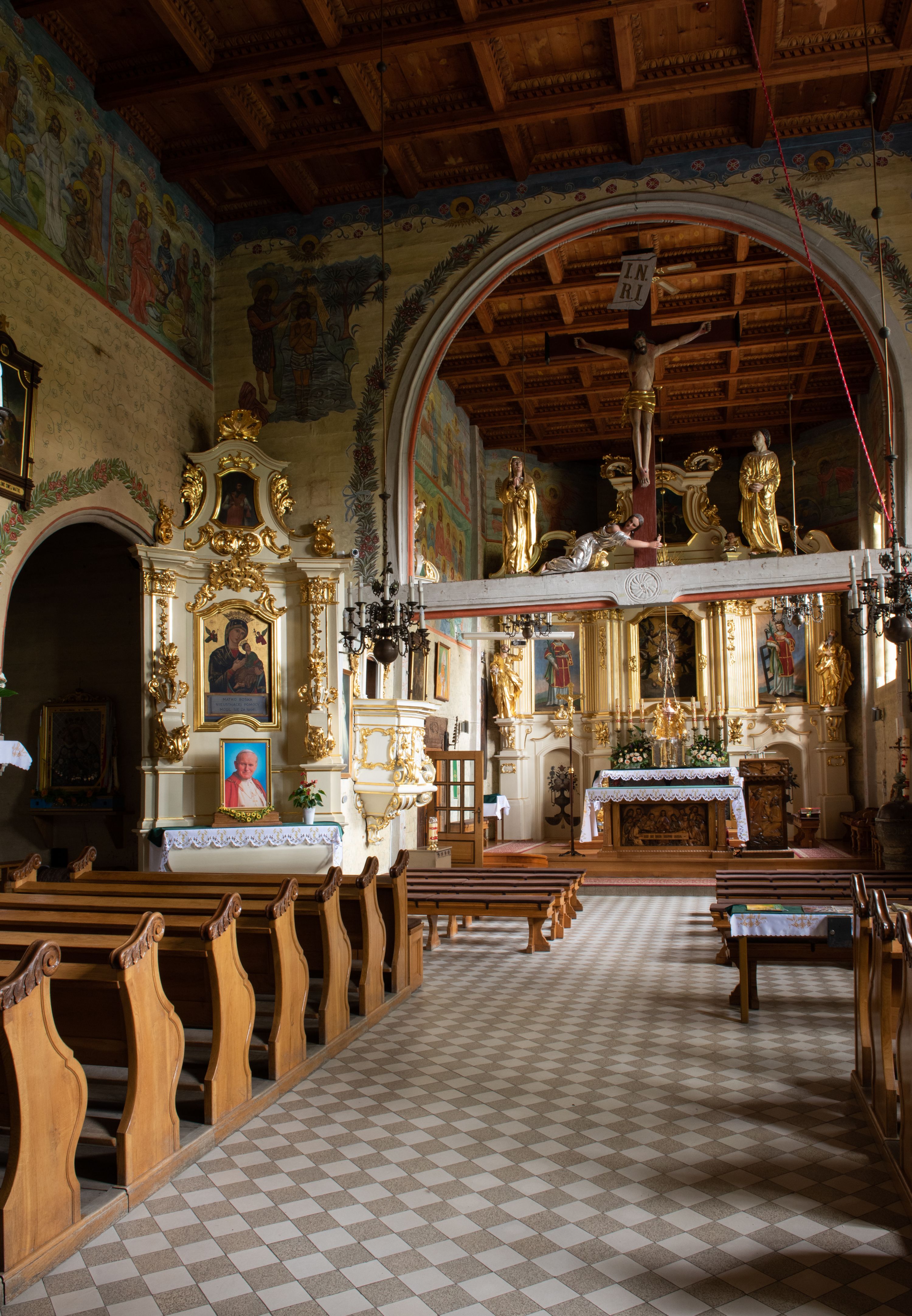 Kościół został wybudowany w 1670 roku, a więc w okresie, gdy występowała odnowa katolicyzmu w wyniku kontrreformacji, a po przejściu fali zniszczeń spowodowanych działaniami wojennymi wyraźnie ożywiło się budownictwo sakralne. Rzut poziomy pozostał tradycyjny z podziałem na kwadratową nawę i prezbiterium zamknięte wielobocznie. W świątyni zachowały się dwa cenne portale: manierystyczny, bogato zdobiony oraz odrzwia o typie „schodkowym” nawiązującym do portali „długoszowskich”. Ten interesujący detal ciesielski posiada jeszcze reminiscencje późnogotyckie, a jego forma została potraktowana reliefowo. Zastanawiające jest, że w świątyni z drugiej połowy XVII wieku niemal nie pojawił się jeszcze detal ciesielski w stylu barokowym.