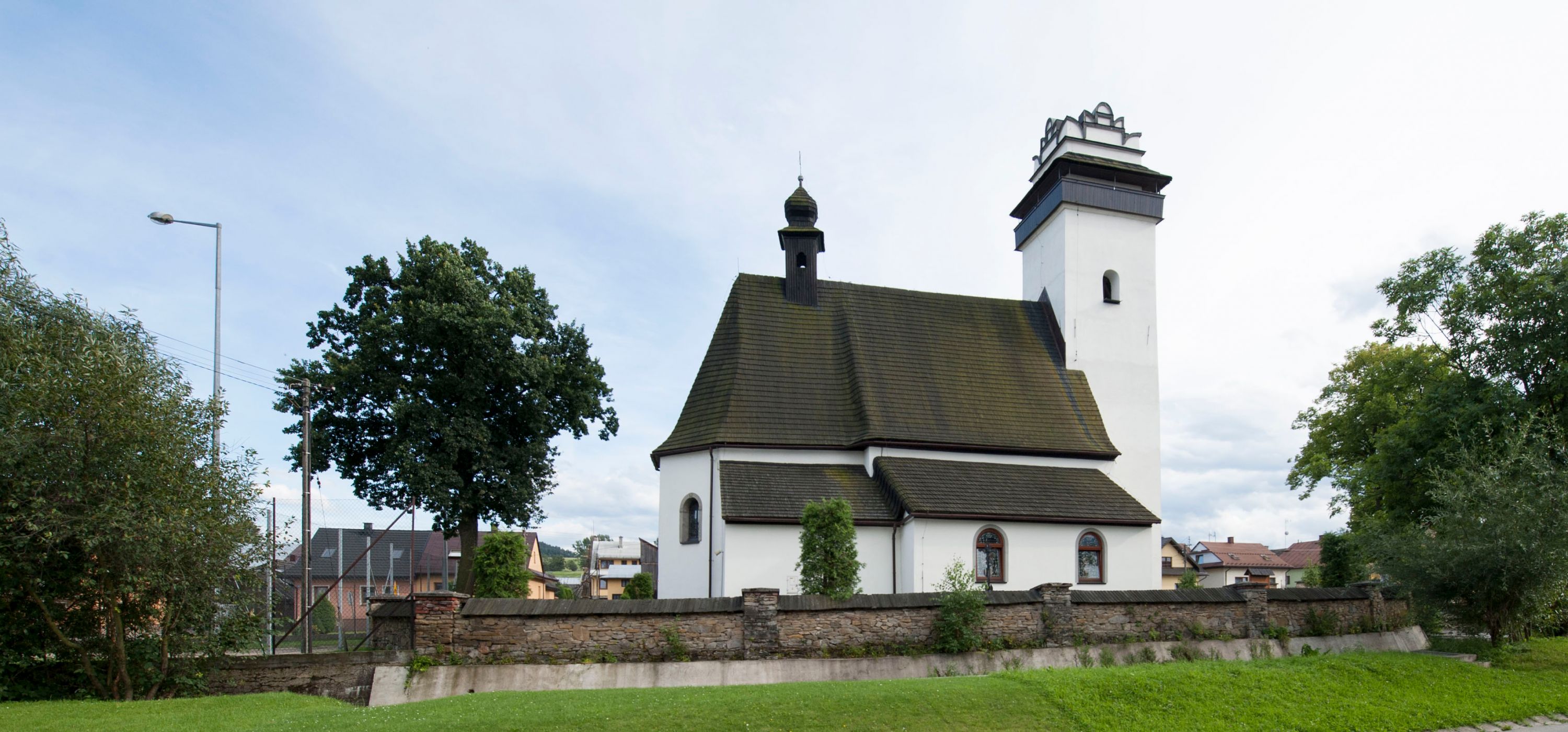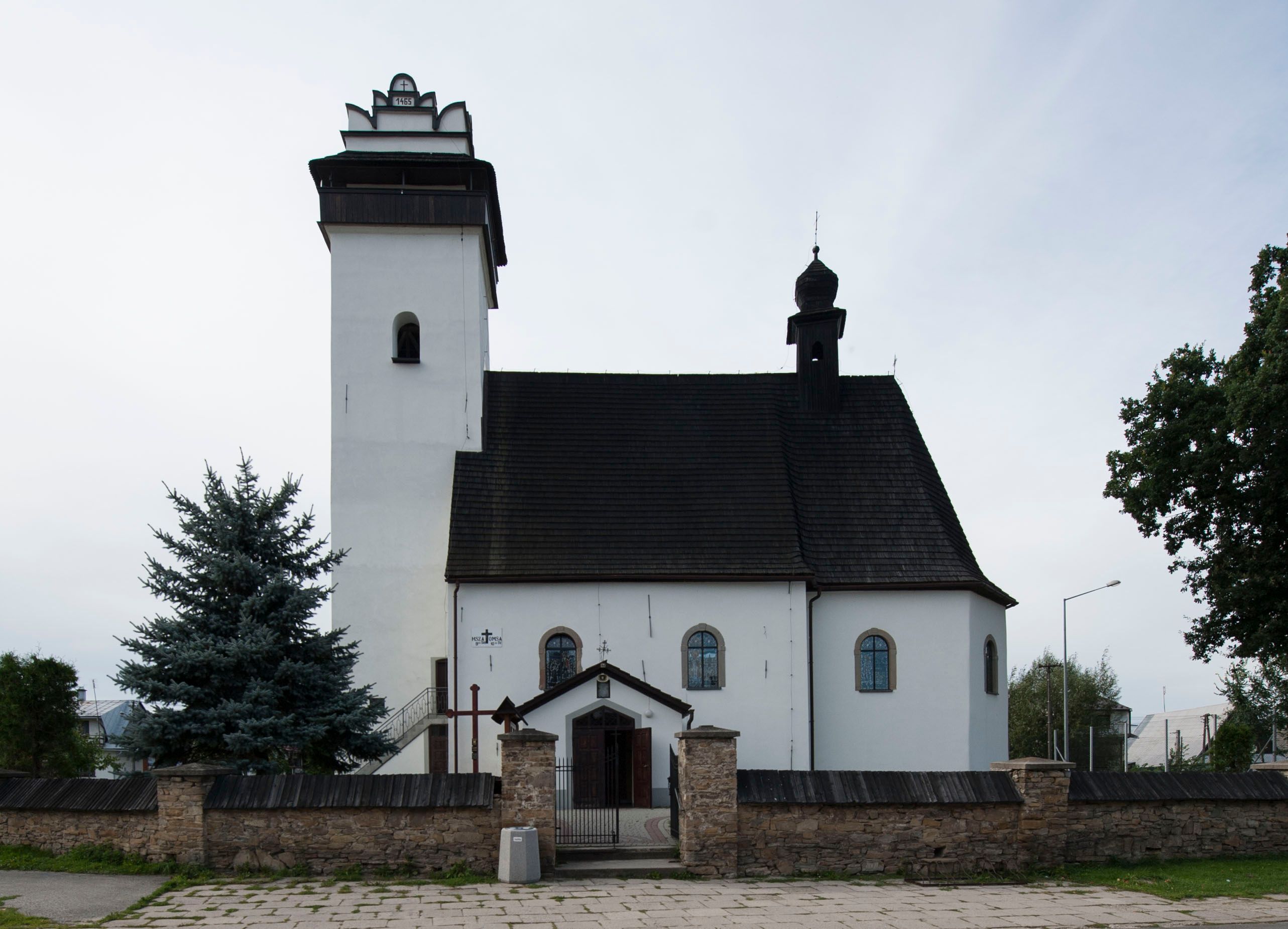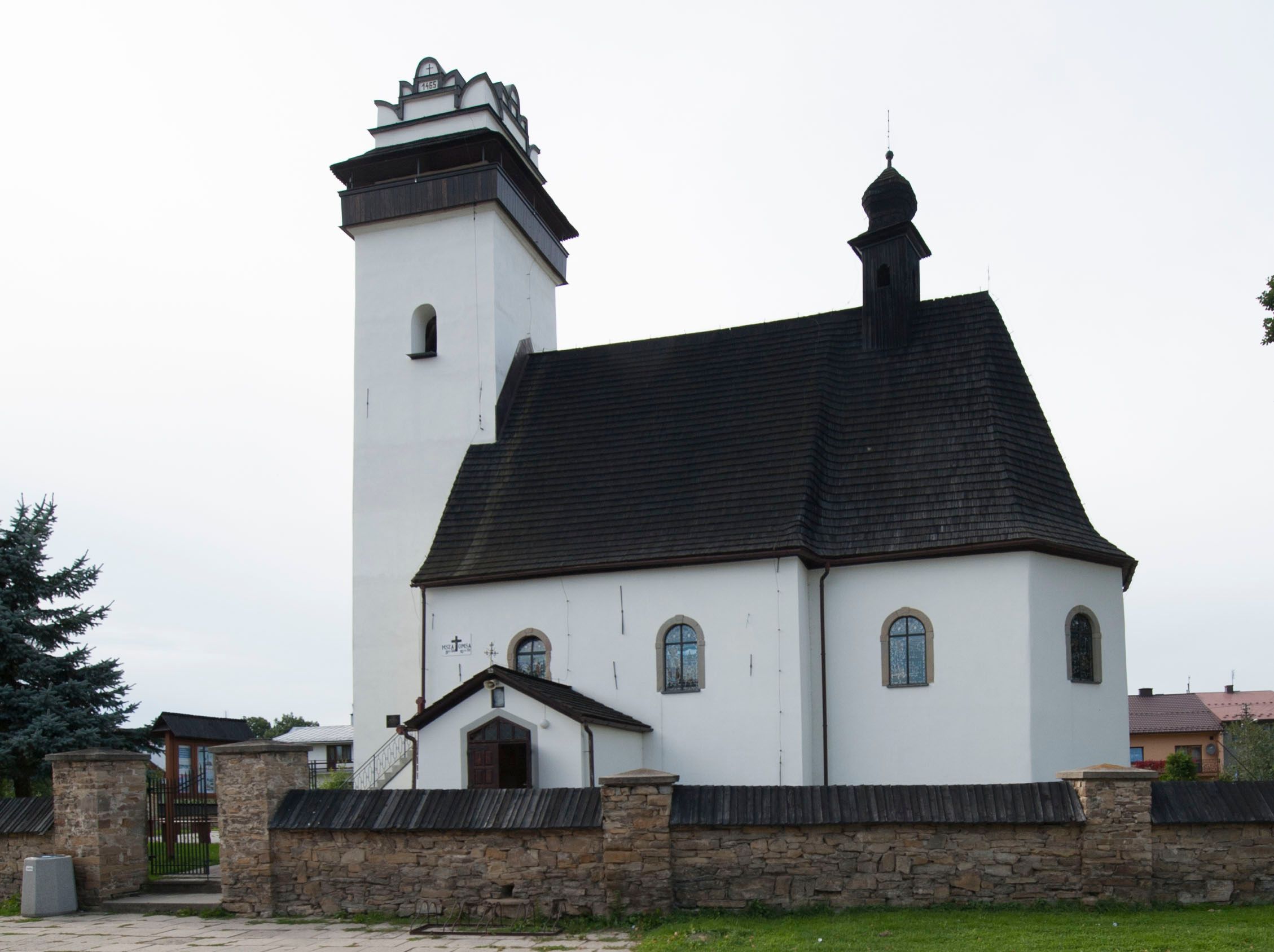 Zewnętrzne elewacje bez dekoracji, skromne, otynkowane. Prezbiterium węższe od nawy, nakryte jednym, gontowym, dwuspadowym dachem z nawą z wieżą na sygnaturkę nad prezbiterium. Do zachodniej fasady kościoła dostawiona jest wysoka założona na planie kwadratu wieża-dzwonnica. W dolnej kondygnacji na osi kościoła prostokątne wejście do kruchty, nakryte daszkiem. Wieża zakończona drewnianą hurdycją oraz murowaną attyką z napisem: „1465” o układzie schodkowym. Wejście na wieżę, od zewnątrz, schodami z prawej strony. Okna wieży w ostatniej kondygnacji, niewielkie, w kształcie stojących prostokątów, zamkniętych półkoliście.