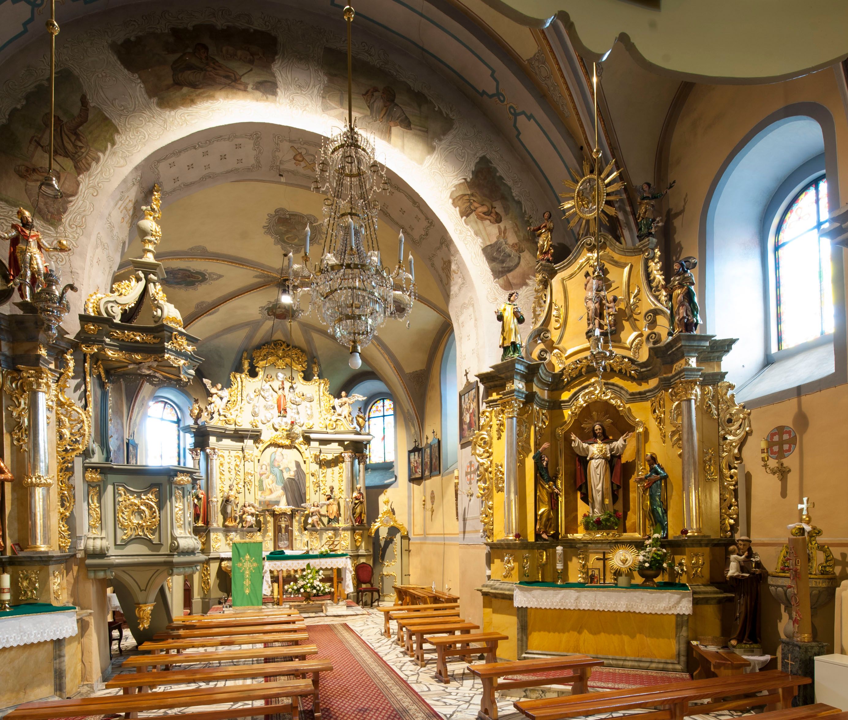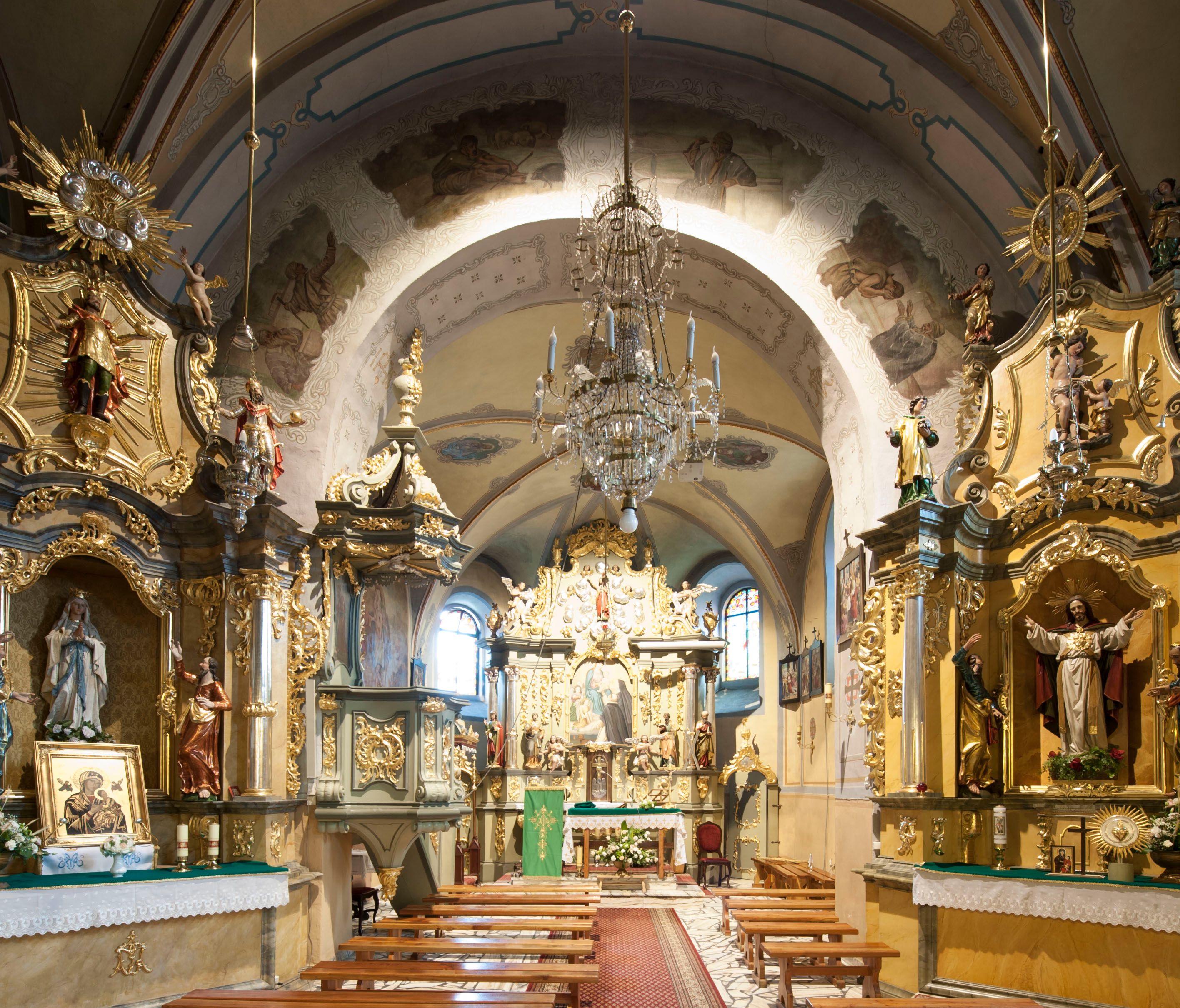Obecny kościół został wystawiony około połowy XVI wieku. Świątynia trzykrotnie zmieniała wezwanie. Początkowo była pod patronem św. Serwacego, następnie Wszystkich Świętych, a pod koniec XIX wieku – św. Marcina. W 1646 roku kościół został uszkodzony podczas pożaru. Szkody opisał wizytator w 1655 roku: „Kościół wzniesiony w tej parafii jest całkowicie spalony”. Według akt wizytacji z 1693 oraz 1700 roku w kościele znajdowały się cztery ołtarze: ołtarz główny św. Serwacego, ołtarz boczny Marii Panny, ołtarz boczny Męki Pańskiej oraz ołtarz boczny św. Mikołaja. W 1711 roku parafianie ufundowali kolejny ołtarz poświęcony św. Sebastianowi i św. Rozalii, jako dziękczynienie za wygaśnięcie epidemii dżumy. Wyposażenie to jednak w większości nie zachowało się do dzisiejszych czasów. Sklepienie nad ołtarzem głównym zostało ozdobione skromną dekoracją malarską w postaci medalionów w rocaille’owych ramach, które przedstawiają Najświętsze Serce Jezusa, św. Annę z Marią, św. Józefa z Dzieciątkiem oraz św. Alojzego Gonzagę. Na łuku ściany tęczowej została ukazana przypowieść o synu marnotrawnym, którą wykonano w drugiej połowie XVIII wieku. Z kolei ściany północne prezbiterium i nawy zostały ozdobione dopiero w latach siedemdziesiątych ubiegłego wieku. Ukazano na nich św. Marcina, który odcina połę swojego płaszcza i ofiarowuje żebrakowi oraz św. Cyryla i św. Metodego. Świątynię otacza kamienny mur, wystawiony w 1795 roku. W latach 2009-2010 wprawiono w okna witraże przedstawiające m.in. błogosławionego Jerzego Popiełuszkę, św. Andrzeja Bobolę, św. Józefa, św. Faustynę oraz św. Jana Pawła II. W okienku zakrystii umieszczono witraż z przedstawieniem św. Dominika Savio, patrona ministrantów oraz napis przypominający okoliczności powstania dzieł.